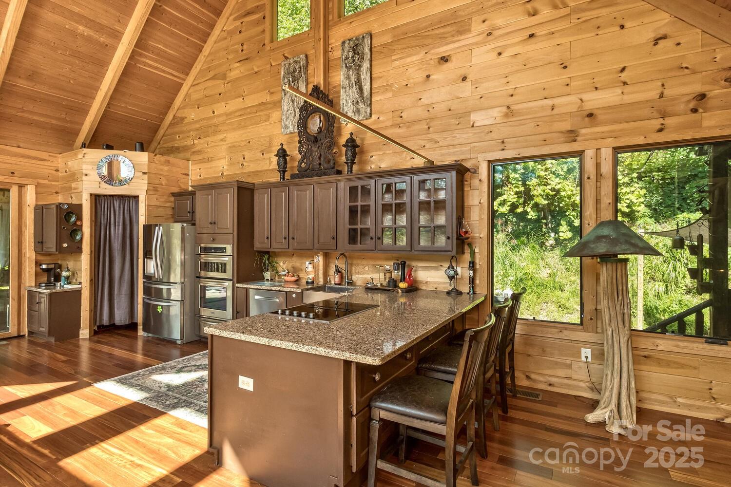 Welcome to Winterview, a stunning 3,300+ sq ft custom home with 3 bedrooms and 4.5 baths in highly desirable West Asheville. Thoughtfully named, Winterview boasts epic seasonal views of the Biltmore Estate, long-range mountains, and the valley below, while the balance of the year offers a lush forest backdrop and serene short-range vistas. Just minutes from the amazing restaurants and shops of downtown Asheville, and also minutes from the Blue Ridge Parkway, and the Bent Creek Recreation area, this retreat balances convenience with tranquility. Inside, the main-level primary suite features a private balcony and expansive ensuite bath. The great room wows with soaring 28’ cathedral ceilings and massive windows, flowing into an open floor plan designed for entertaining. Step into the adjoining massive screened-in patio, complete with a wood-fired oven, propane-connected outdoor kitchen, swing bed for afternoon naps, and a large mounted television for game day. A second screened lower patio, also has a catwalk which runs the width of the home, bringing you even closer to nature. This home is also extremely energy efficient, with the only paid utilities limited to electric and internet, while pristine water comes from a deep well. Surrounded by Pisgah National Forest, you’ll enjoy unmatched privacy, seclusion, and peace of mind. The speakeasy-style wine cellar offers the ultimate hangout with ambient lighting and a wine barrel table. Adding to the charm, a small fairytale cottage tucked among the trees features a wraparound deck — an enchanting meditation retreat or guest hideaway for full nature immersion. Winterview is more than a home — it’s a private mountain sanctuary just minutes from the heart of Asheville. Come experience this incredible property for yourself!