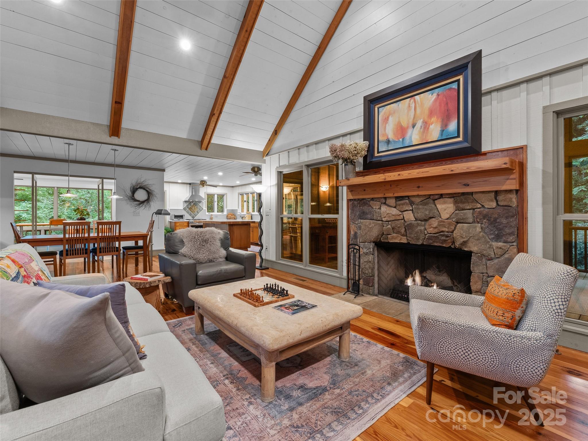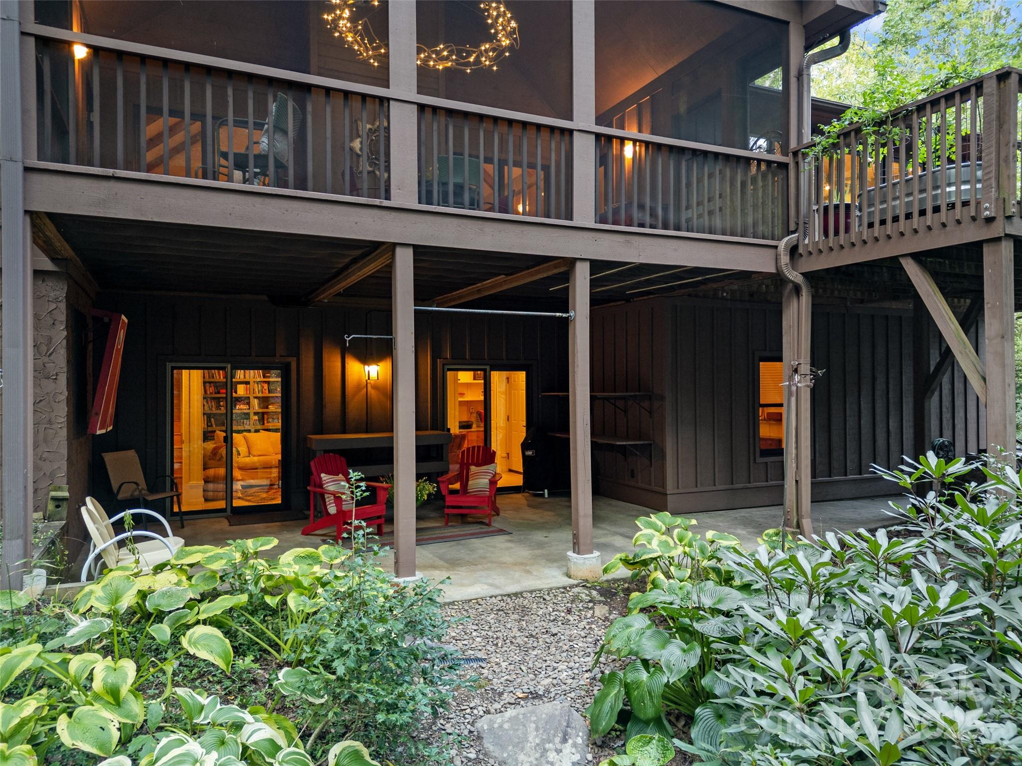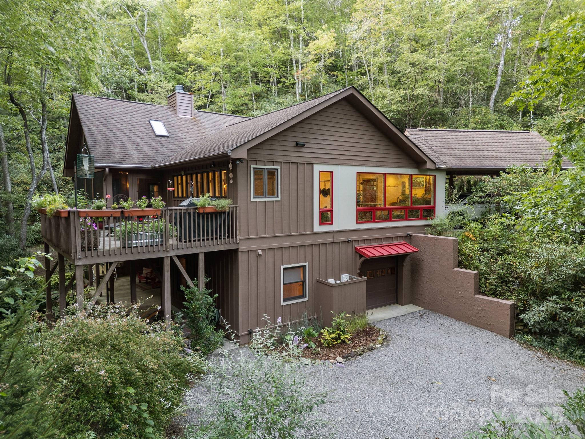 Perfectly positioned at the base of Timber Falls, this serene, park-like setting offers the ultimate retreat for those seeking to be surrounded by nature. This meticulously maintained 3-bedroom, 3.5-bath home is a beautiful blend of mountain charm and modern design. Step inside to discover a spacious open floor plan featuring vaulted ceilings and warm wood accents throughout. The chef’s kitchen is flooded with natural light and seamlessly connects to a large, screened-in, covered porch and elevated deck—the perfect places to relax and enjoy breathtaking views of the waterfall. The main-floor primary suite offers a private sanctuary with a generous sitting area, walk-in closet, and a spacious ensuite with a walk-in shower. Also on the main floor is a bright and versatile flex room—ideal for a home office, art studio or workout space. Downstairs, the walk-out lower level opens to a covered patio overlooking the falls and features two private guest suites, each with its own ensuite bathroom, plus a spacious bonus room perfect for entertaining or relaxing. The landscaped grounds have been lovingly cared for and include an artesian well-fed fountain, a private walking trail along the creek, a cozy fire pit area, and even a perfect spot to hang your hammock at the base of the falls. The natural sound of the waterfall provides a tranquil and relaxed setting. The owners have never had any issues with the creek rising out of it's bank even during Hurricane Helene. If you have been looking for a home with a bold stream where the sound of falling water can be heard year round be sure and schedule your showing today.
