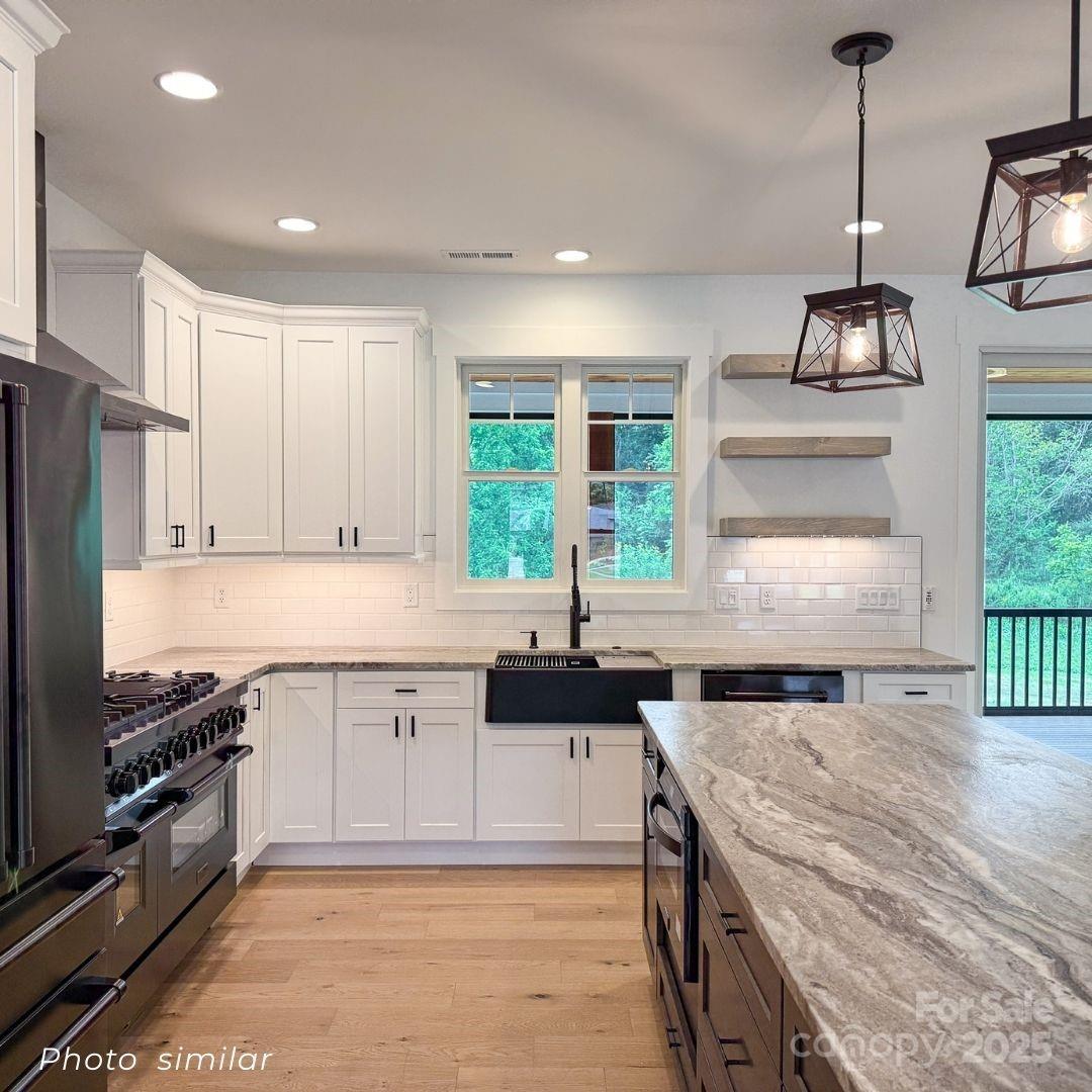 The Reserves at Roper Farm is a gated community that offers unrivaled Mills River views, luxury finishes, large lots, community pavilion, fire pit, dog park, & walking trails. One of just 3 homes left, "The Amber" boasts rich wood flooring, 10' ceilings & 8’ doors throughout the main floor, gourmet kitchen w/ stunning countertops, ZLine luxury appliances, 48” gas range, pot filler, beverage fridge, & 42” soft close cabinets. The open concept draws you to the living room w/ stone gas fireplaces & soaring beams w/ shiplap ceiling. Primary suite offers an en suite bathroom, soaking tub, spa-like tile shower, & oversized walk-in closet. Enjoy peaceful WNC outdoors on the screened tongue & groove composite deck w/ stone fireplace. Generac whole home generator, Anderson windows/doors & tankless recirculating water heaters are a small part of high quality construction & finishes raising the bar for these stunning homes. Close to shopping, dining, breweries, hiking, biking, healthcare & more!