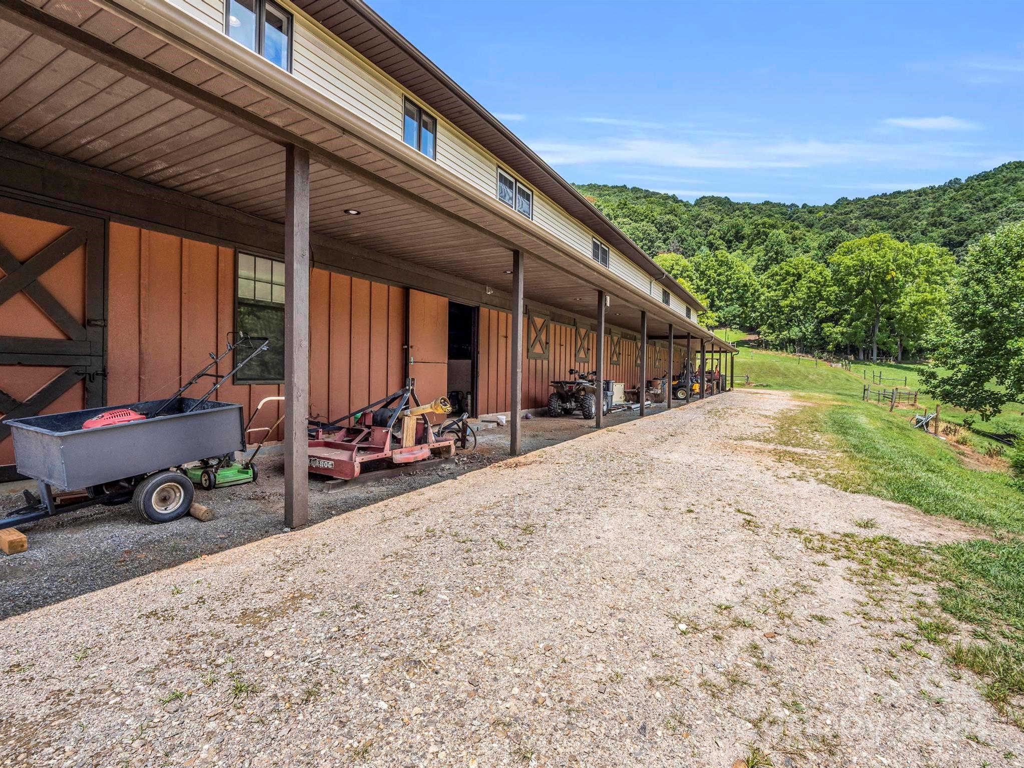 Flood Zone X (Minimal Flood Risk). Incredible 240 acre farm in Buncombe County with breathtaking mountain views for miles, including Mt. Pisgah! This meticulously maintained property has approximately 1.5 miles of paved driveways, 6+ miles of maintained trails for hiking/horseback riding/ATV use, a 17-stall barn with tack room, a 3-BR barn apartment, hay storage, a pond, a pole barn, a 3562 square foot main house, and a mix of cleared pastures and woods. The main house has an elevator, 2 fireplaces, large bedrooms, and some of the best views in Western North Carolina from the covered porch and main level rooms. The barn apartment has a 2-car garage, 1856 square feet of recently renovated living space, and amazing views from the deck. There are multiple building sites that will also have spectacular views. A rare offering for such a large tract so close to Asheville, this private estate is ideal for equestrian use, events, hunting, and more. Gated road for complete privacy and security.