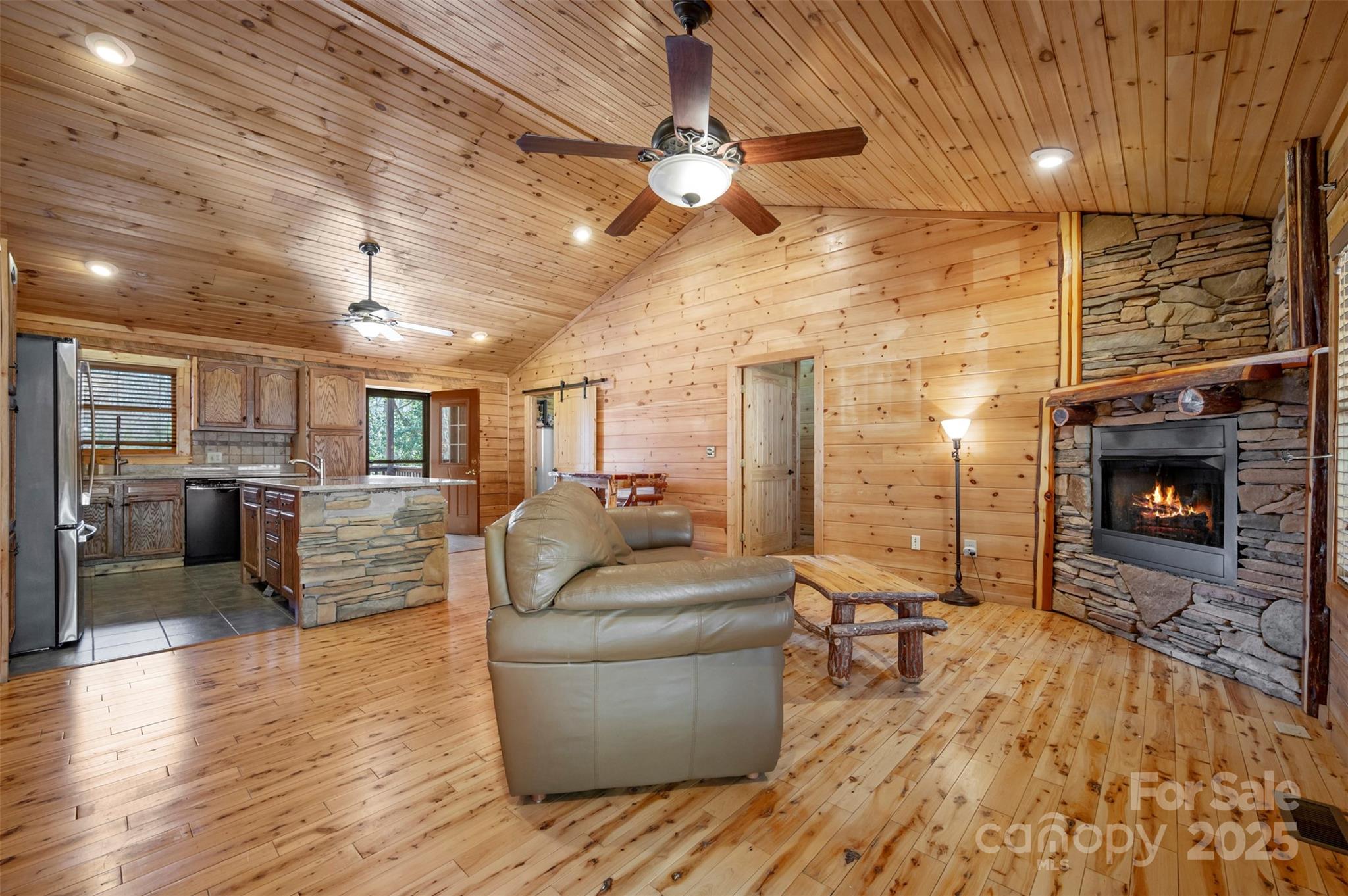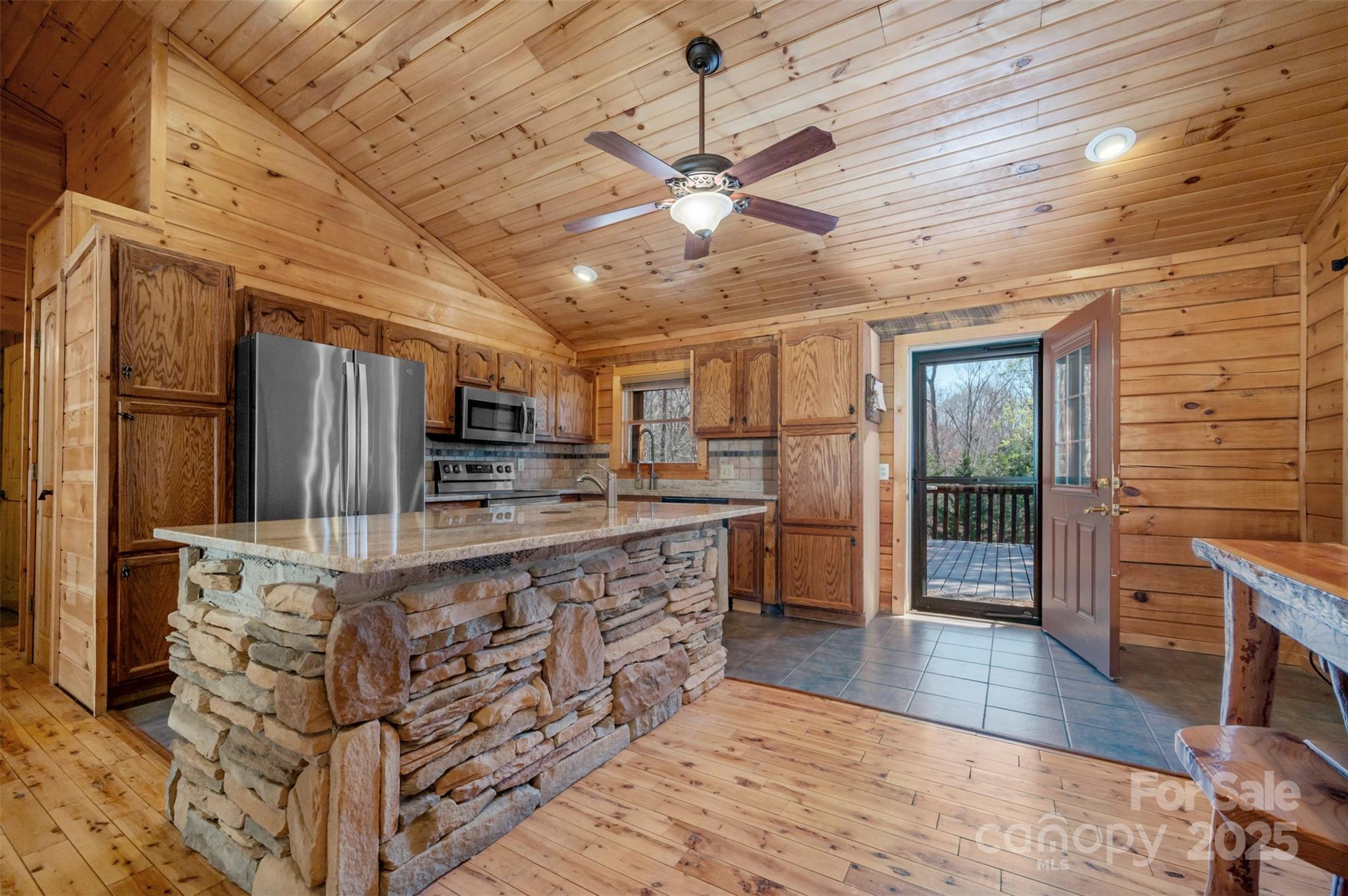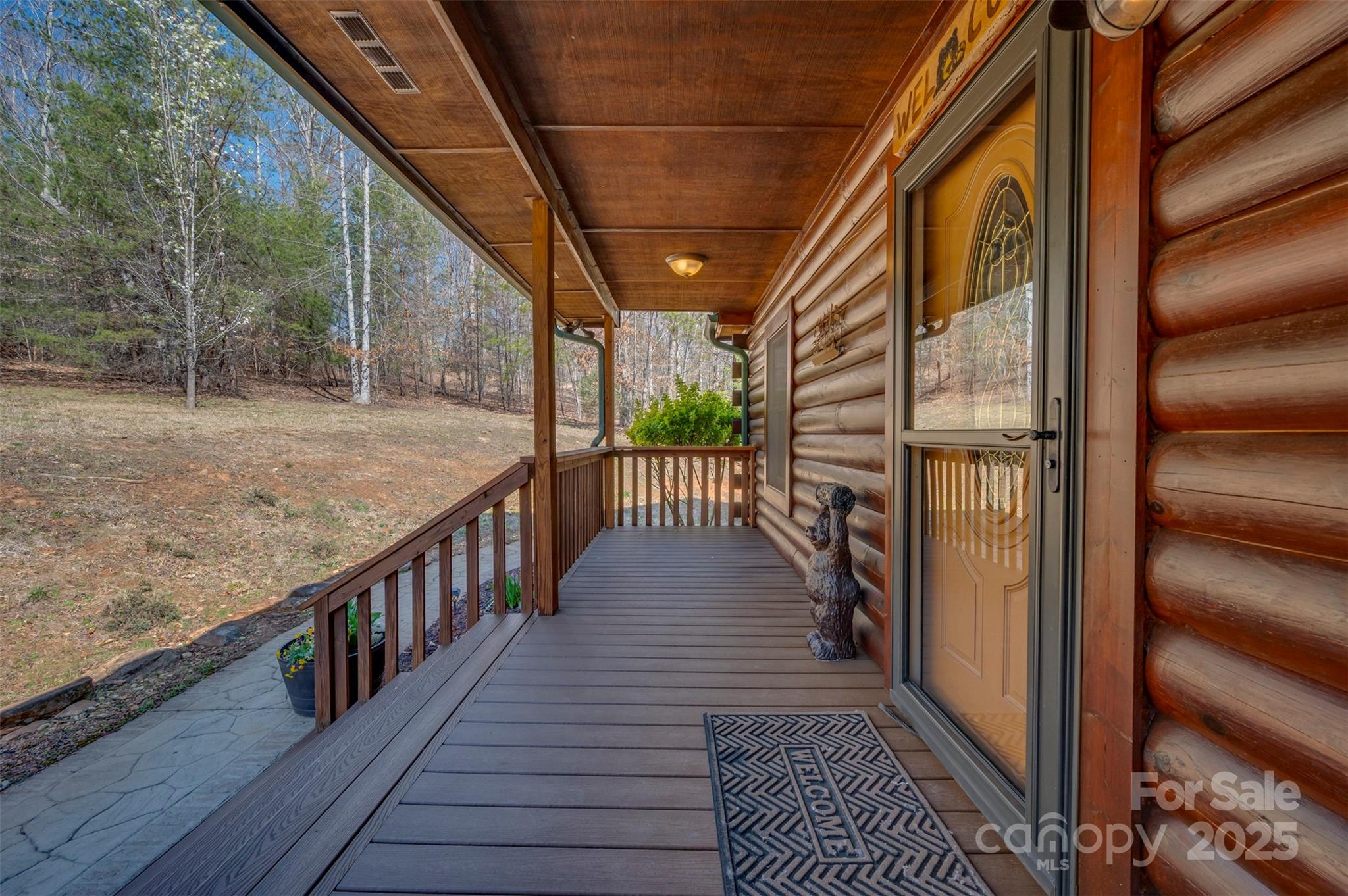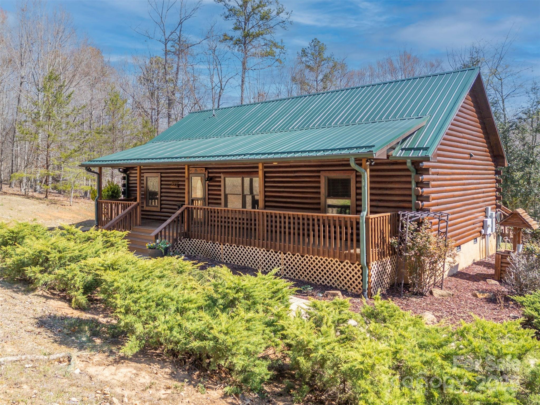 Clearwater Creek is a log home community located in the foothills of Western NC. It is gated and has a community park. In just a few minutes, you can access grocery stores, medical facilities, recreation, walking trails and much more. The lots are all large and this one is 2.78 acres with a CREEK at the back and is surrounded by trees for a private setting. The home is a 3 bedroom , 2 bath log home featuring covered front and back porches, a detached double garage and a 576 square foot studio that can be used as a guest house, recreation or hobby. The driveway is concrete. There is a new generator present in case of any power outage. The house, garage and studio all have new metal roofs and the HVAC unit was replaced in 2023. The interior of the house has wood floors and a gas log fireplace. The kitchen is open to the family room and has all the appliances. The large island with granite tops and rock finish is the focal point and a true gathering place.