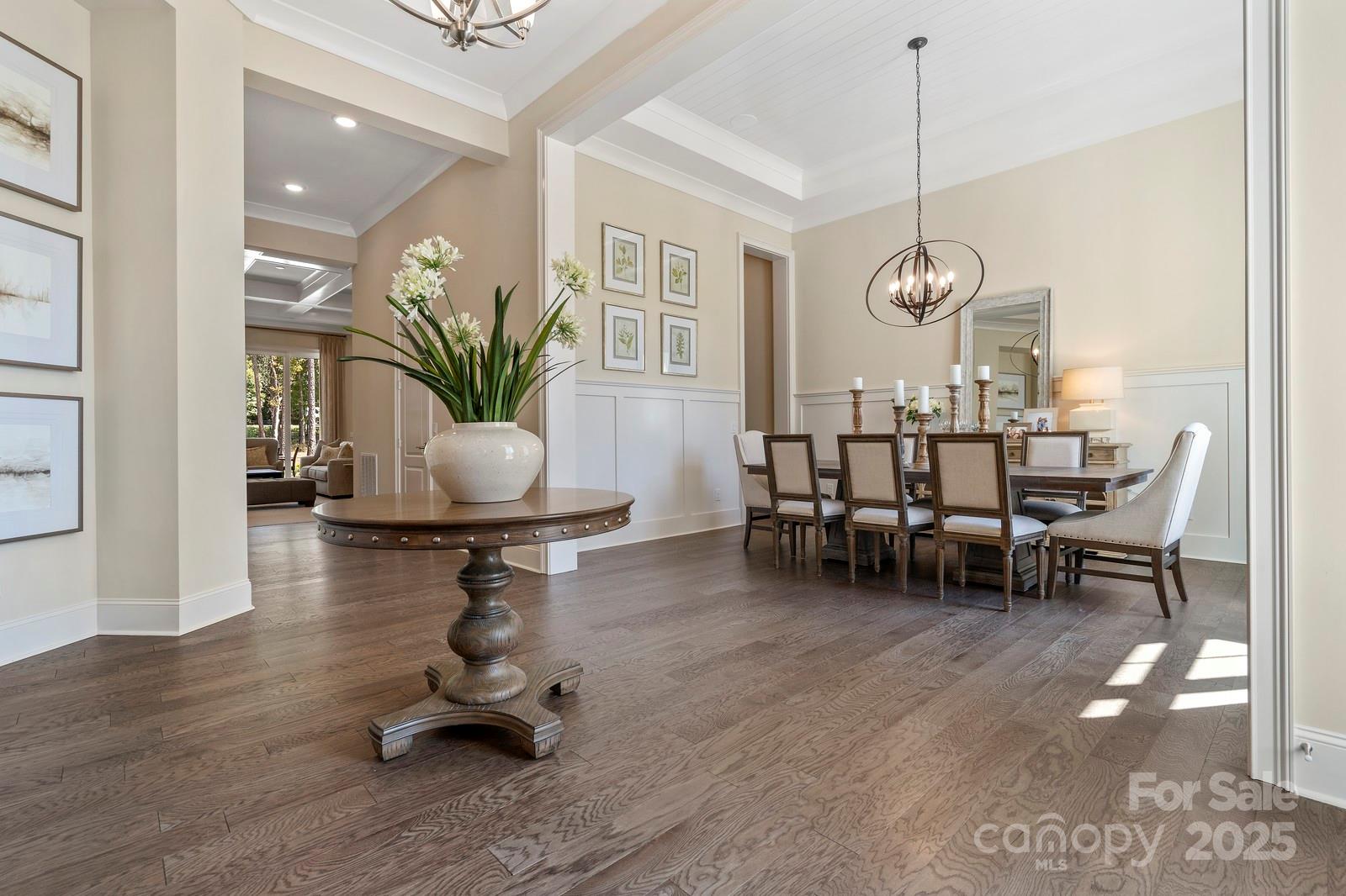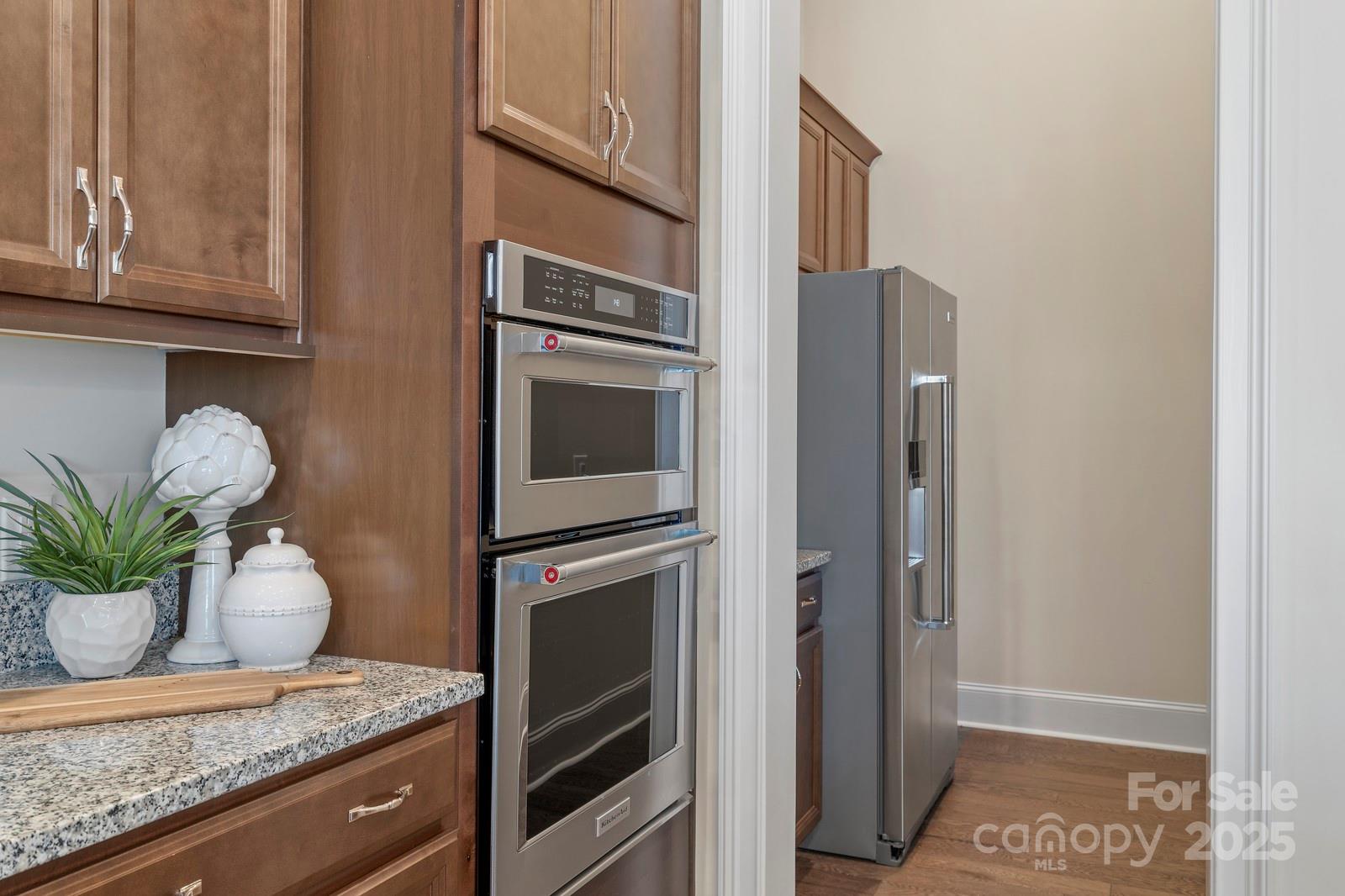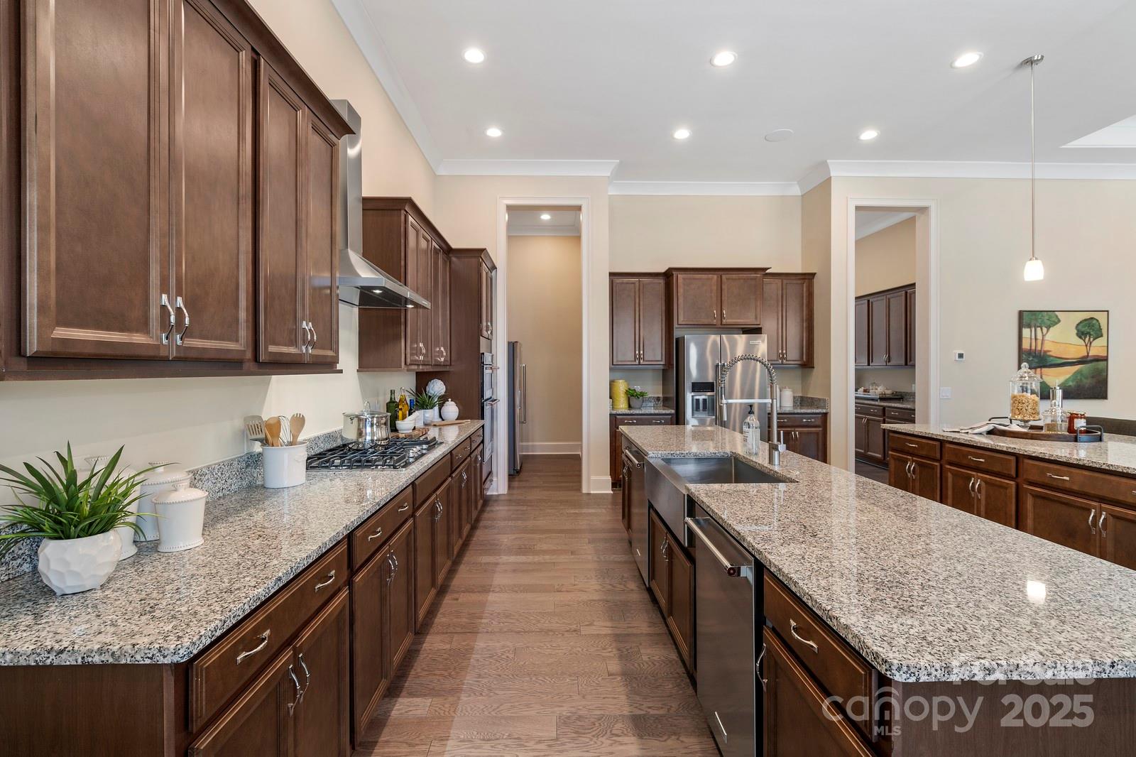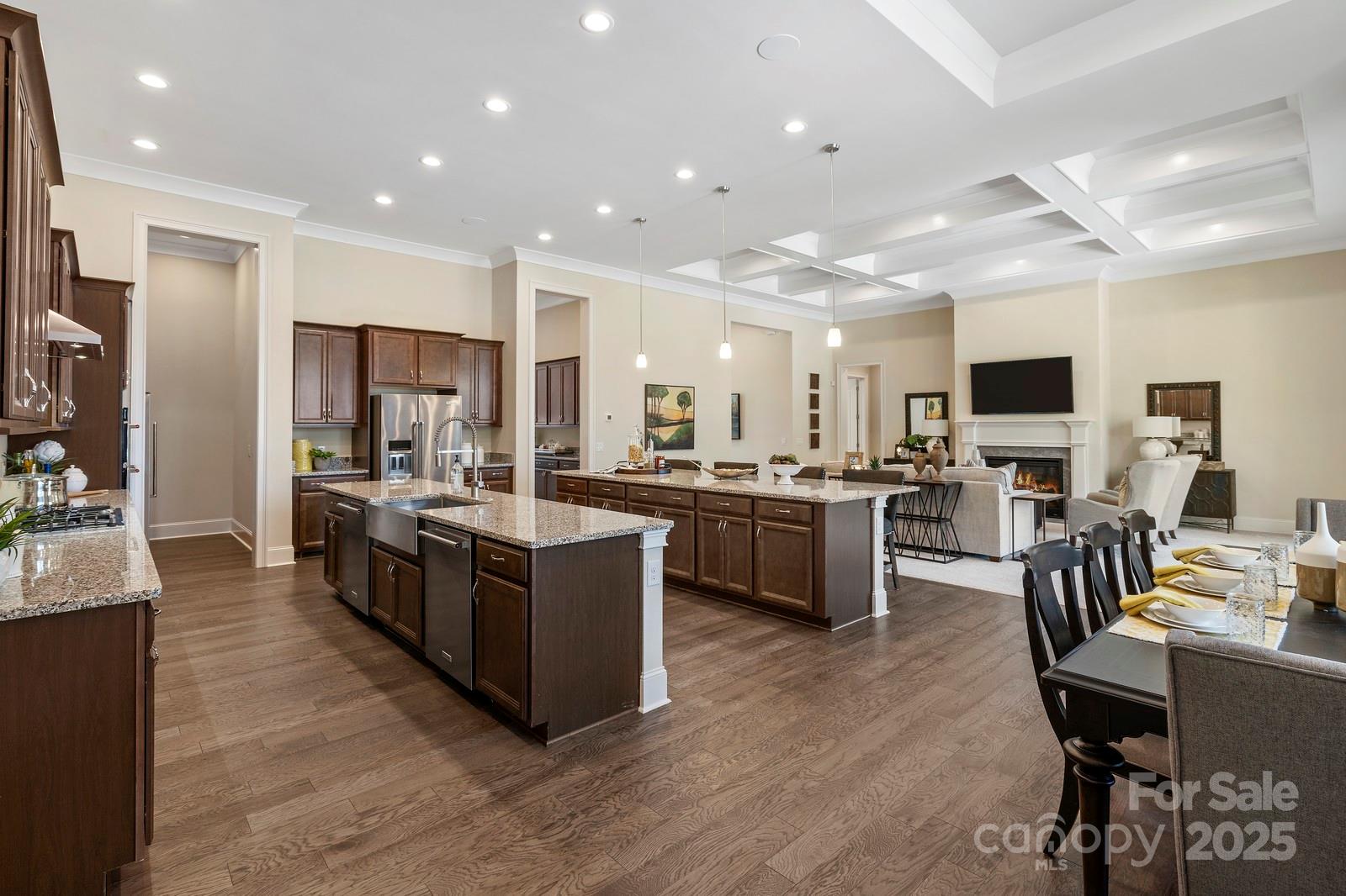 BACK ON MARKET at no fault of seller. Incredible former model home with signature design, cutting-edge technology & luxury upgrades throughout! This energy-efficient, full-brick beauty offers 5” engineered hardwoods, 10’ trey/coffered ceilings, designer trim, & solid wood interior doors. The gourmet kitchen features granite counters, farmhouse sink, wall oven/microwave, stainless appliances (two refrigerators & two dishwashers), & a walk-in pantry. The primary suite includes custom walk-in closets & a spa-like bath w/ a 6’ soaking tub. Granite in all baths, whole-home surround sound, a designer laundry room w/ washer/dryer/sink, & a tankless water heater. Outdoor living comes w/ a covered front porch, covered deck, extended patio w/ modern water fountain & firepit seating, & full yard irrigation. Dehumidifier installed in crawl. Community amenities include a resort-style pool and clubhouse. Compare this home to the cost of new construction. Great room picture is not updated: Hardwoods have been installed in place of carpet.