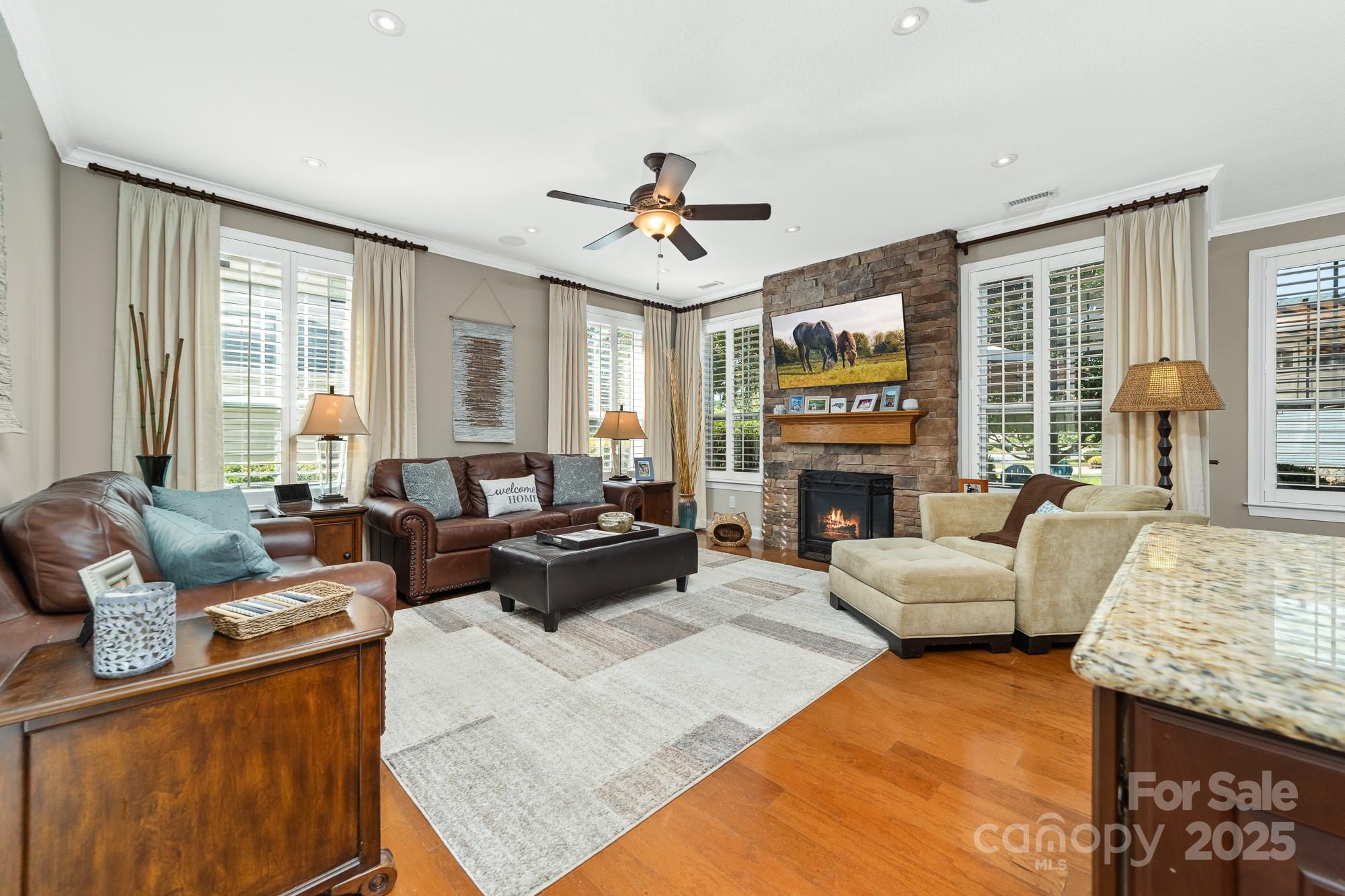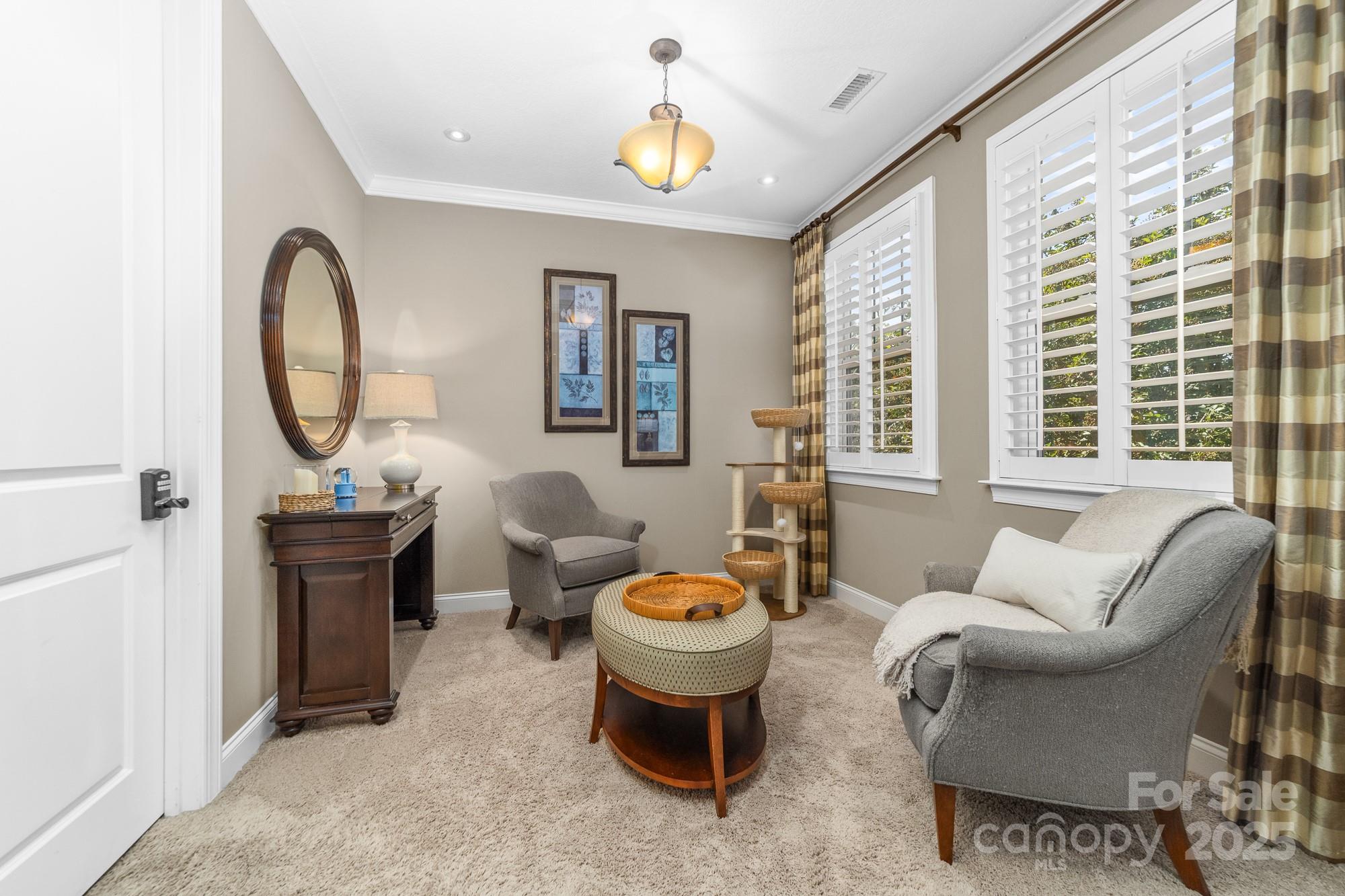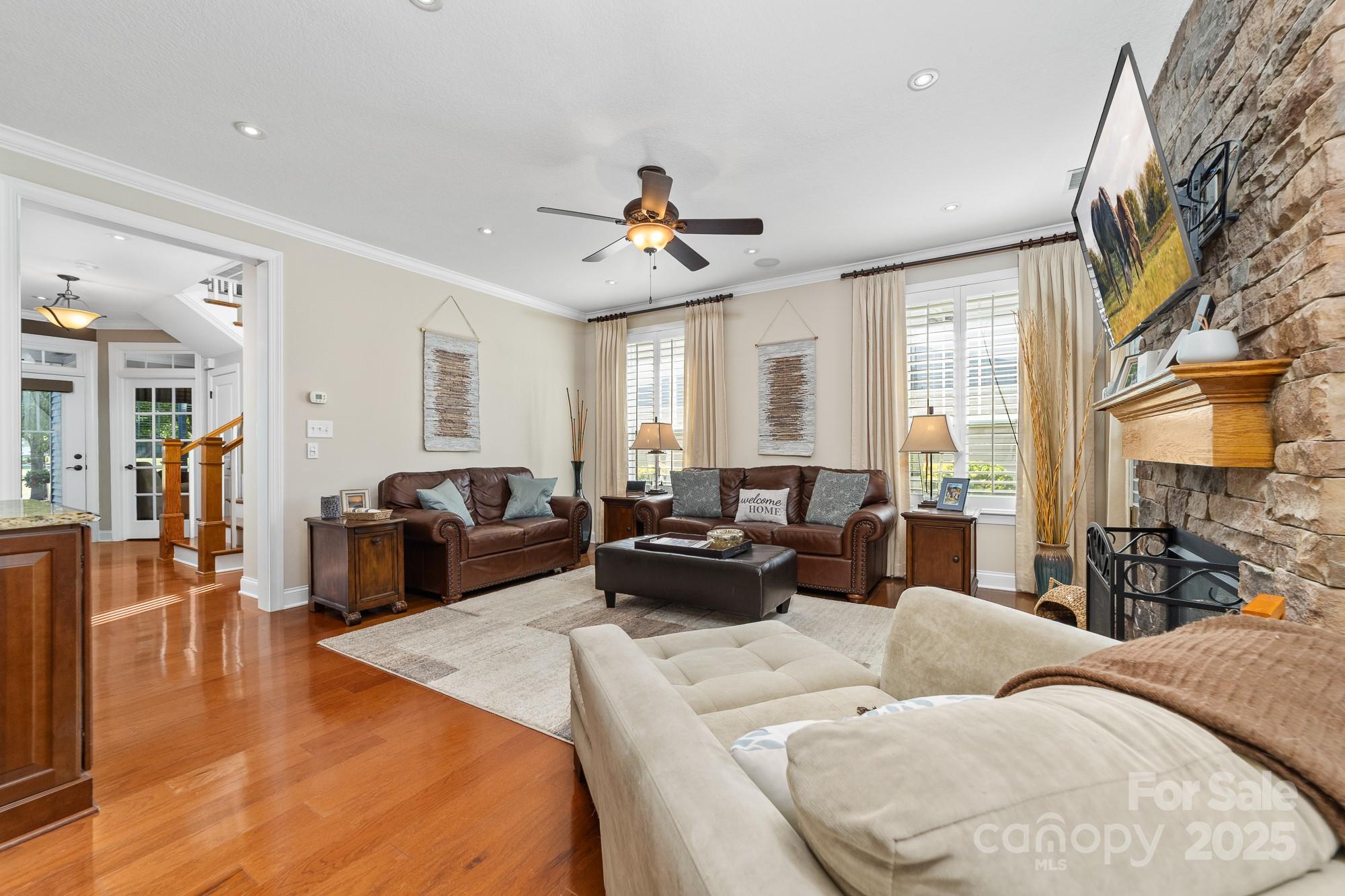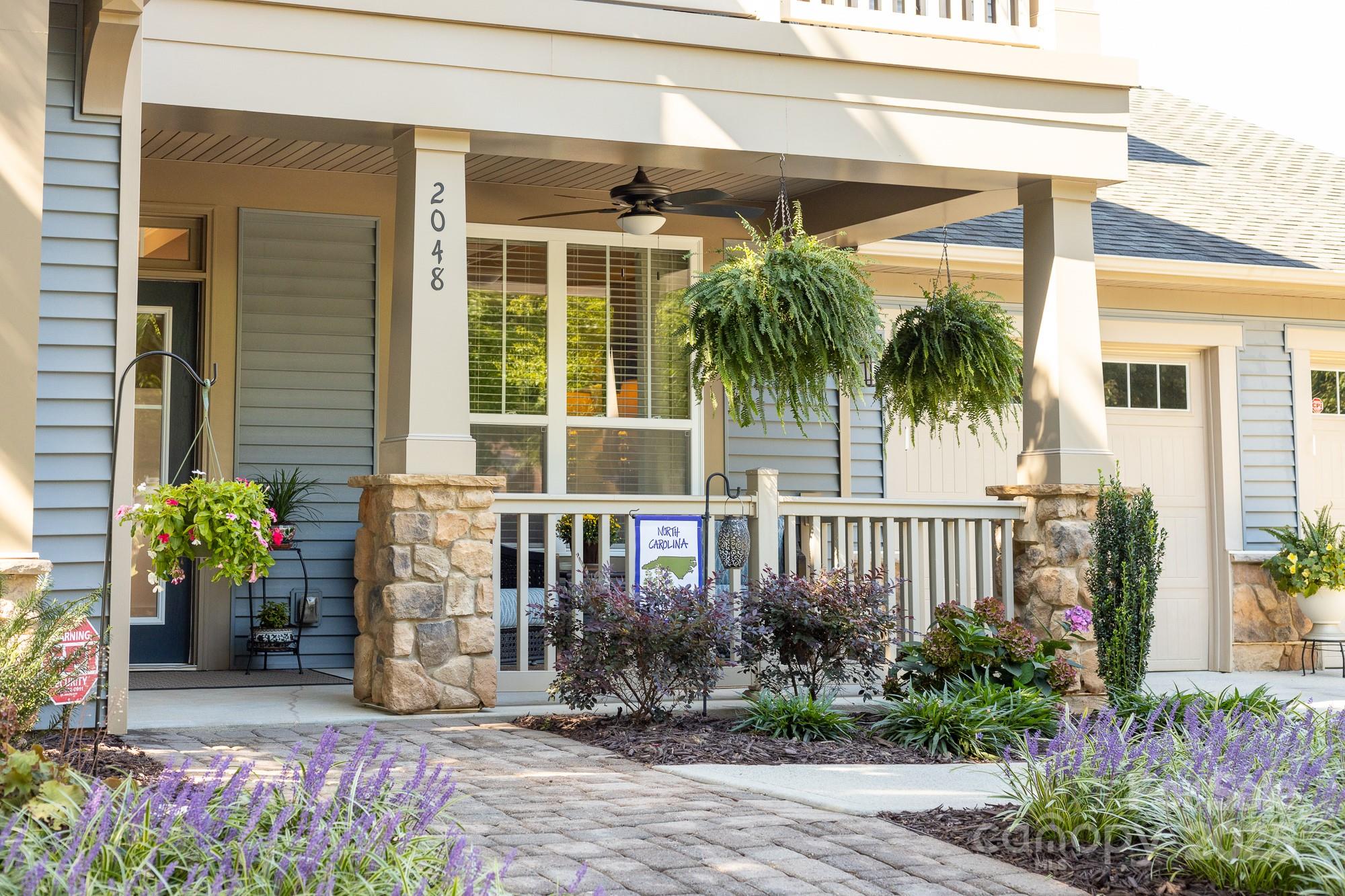 Welcome Home to 2048 Middleton Farm! This is a rare opportunity to purchase a former model home in the desirable South Point Village neighborhood of Belmont! Well maintained by the original owners, this home boasts many builder upgrades and additional improvements. Open concept kitchen features upgraded cabinets with accent lighting, stainless appliances, double oven, gas cooktop, and a butler's pantry. Beautiful windows with plantation shutters surround the living and breakfast areas with natural light. Stone fireplace with gas logs adds a cozy charm to the space. Elegant dining room with coffered ceiling and designer molding. French door allows privacy in the home office which features a dual built-in desk and window seat storage. Crown molding detail, high ceilings (9ft) and doorways (8ft) on both levels. Spacious primary ensuite is a relaxing retreat with a sitting area, tray ceiling, two custom walk-in closets, frameless glass shower, garden tub, and dual sink. Two additional bedrooms and a loft for flexible use space. Surround sound speaker system with individual volume control in living, office, primary bedroom, and loft. Don't miss the large storage closet under the stairs or the extra space in the garage perfect for a workshop, golf-cart, or even a third vehicle parked tandem. 240 volt outlet added to garage to accommodate EV chargers. Enjoy the outside on the upper or lower front porches, on the rear paver patio w/ pergola and firepit, or the greenspace just across the street. Sidewalks throughout the neighborhood lead to schools, Belmont Town Center w/ Harris Teeter, and even to downtown Belmont which is only one mile away. Public access to Lake Wylie is nearby. Only 15 minutes to the airport or 25 minutes to Uptown Charlotte.