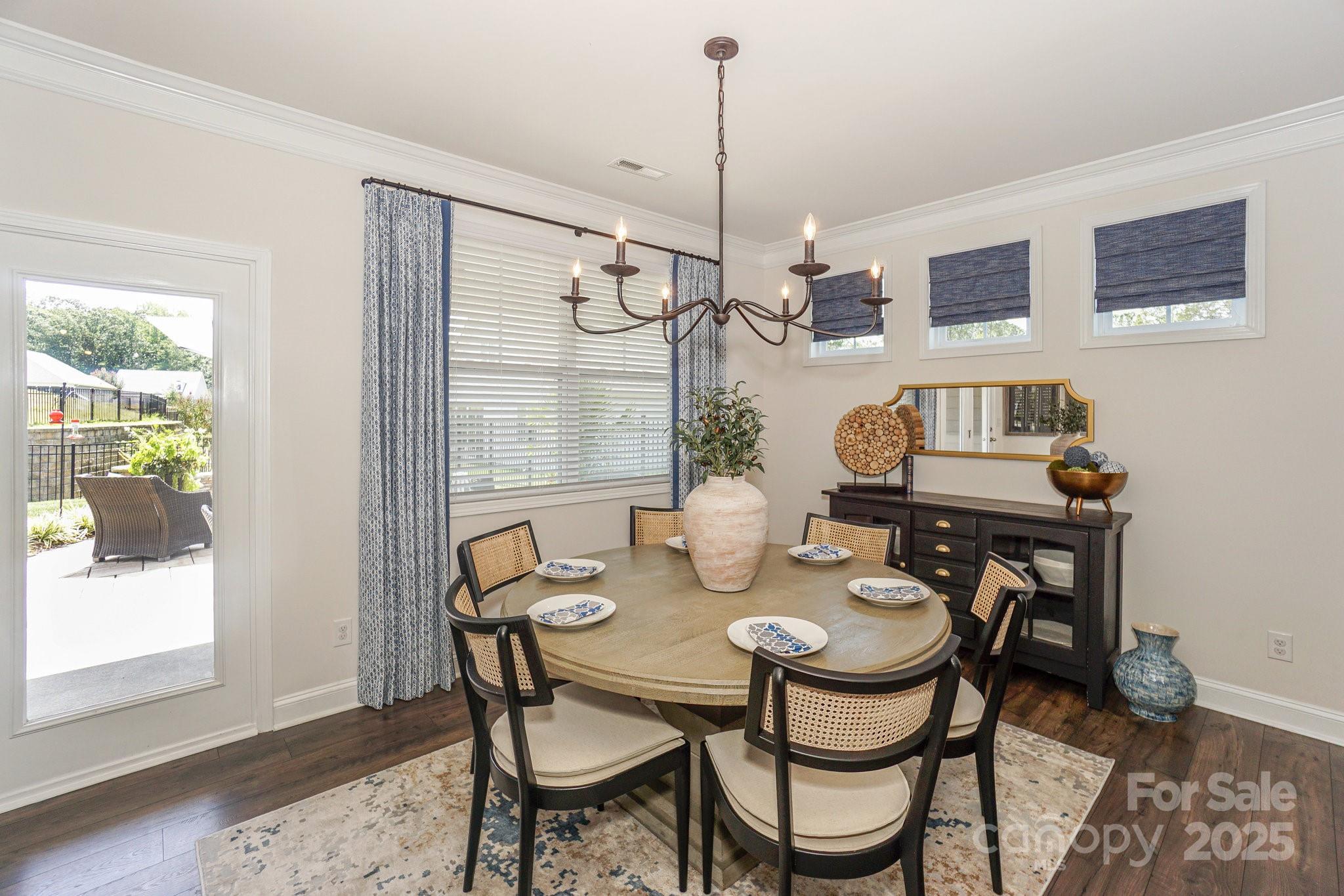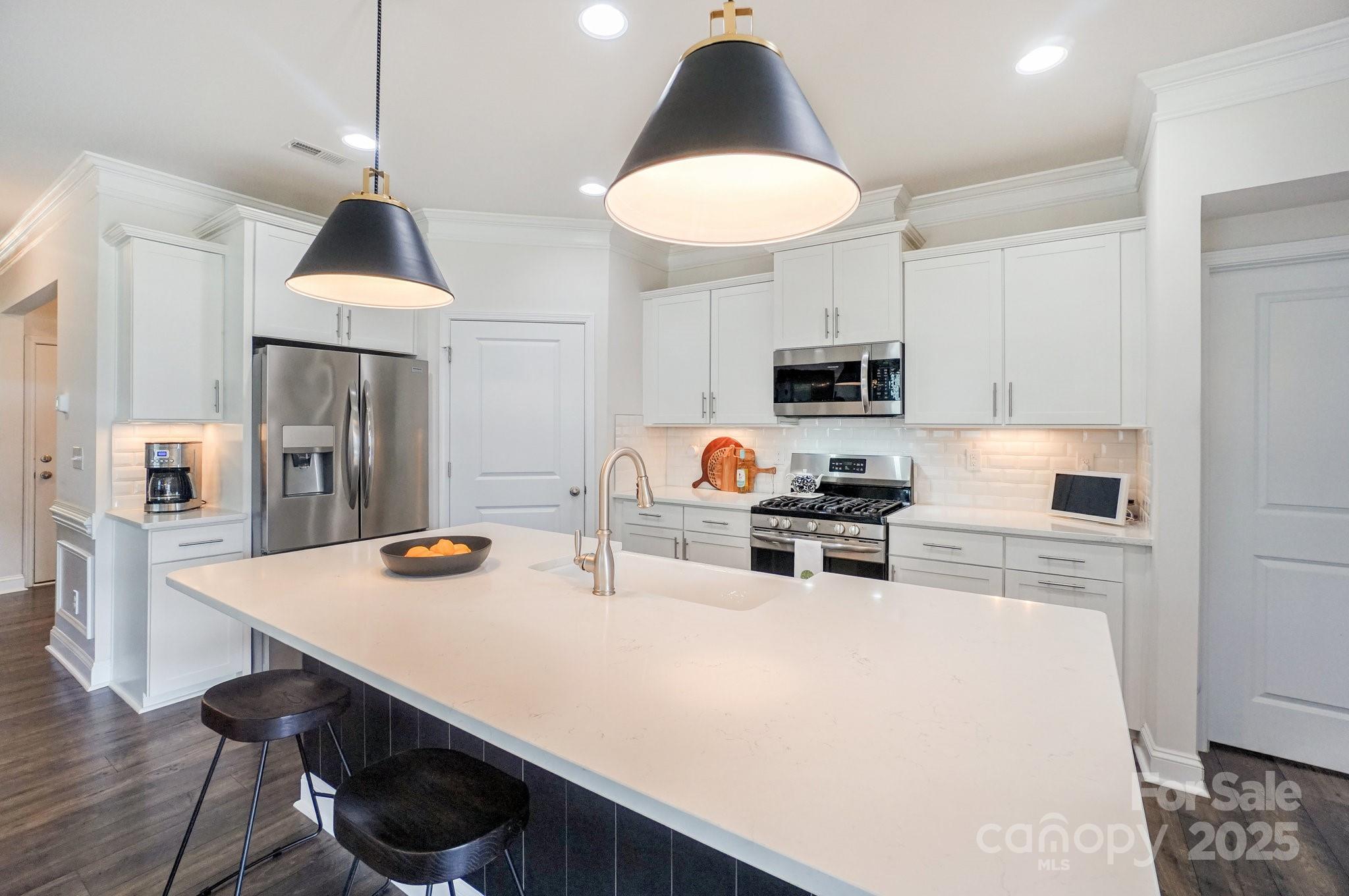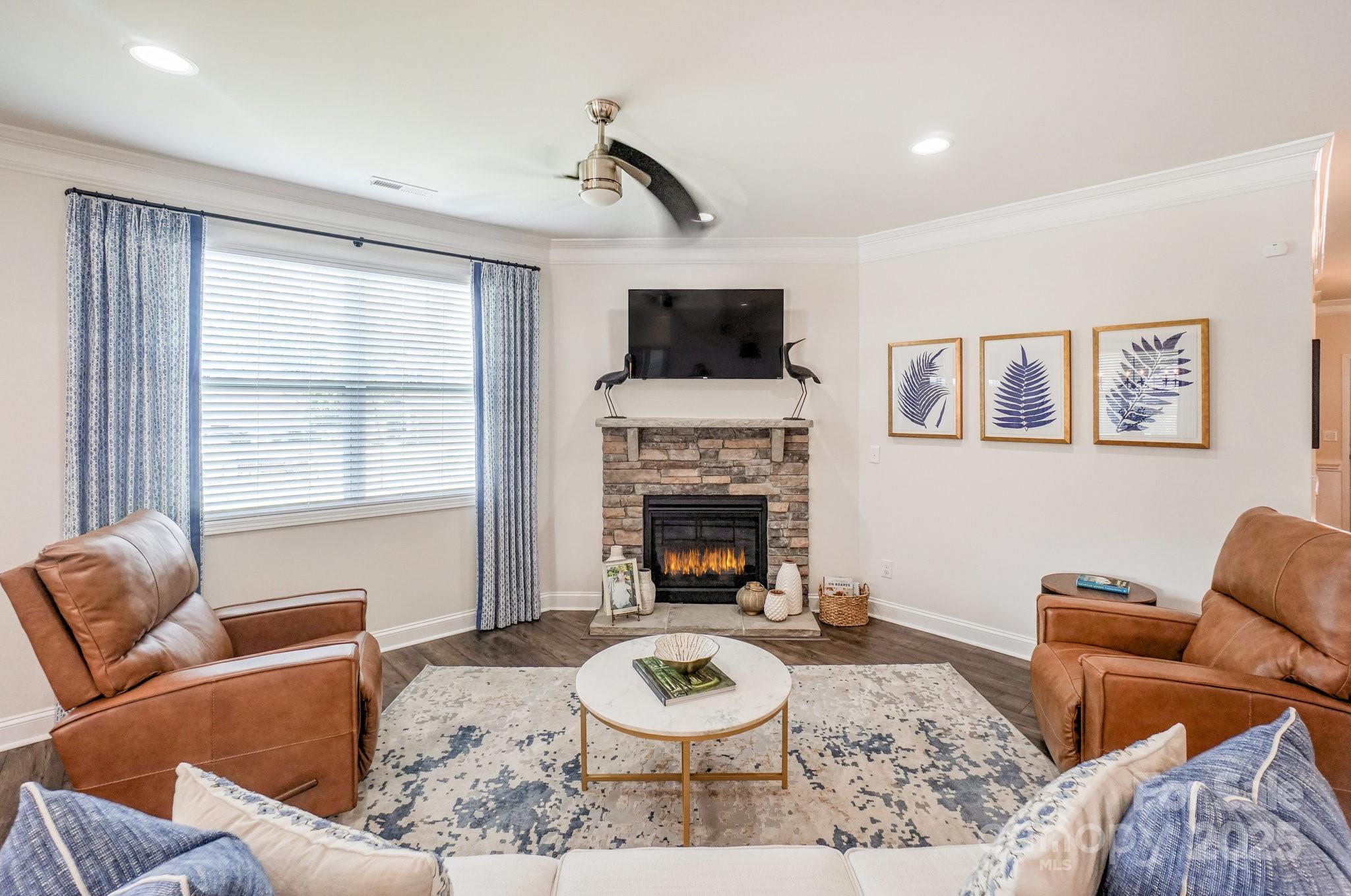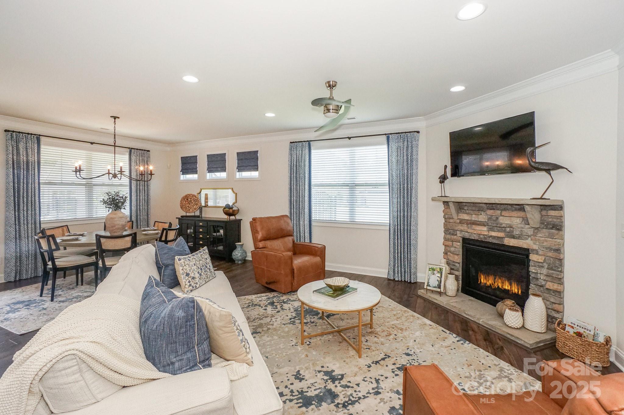 Welcome to Lakewalk living! This 3-bed, 3-bath home, built in 2020, offers 2,529 HLA of refined yet comfortable space plus a bonus loft and walk-in attic storage. Located on a quiet street, the property backs to HOA-maintained green space with benches and a walking trail, offering a sense of openness without the maintenance. Inside, the main level is designed for effortless living and entertaining. A gourmet kitchen anchors the open layout, featuring white shaker cabinetry, quartz counters, a black shiplap island with seating, bronze pendants and stainless steel appliances and gas range. The kitchen flows into a light-filled dining area and great room with crown molding, hardwood floors and a stone-faced gas fireplace. Nearby, an office/flex room with a beautiful accent wall provides a private workspace or guest space. A spacious walk-in pantry keeps essentials organized with custom shelving. The main-level primary suite is generously sized with hardwood floors and a tray ceiling. Its ensuite bath offers dual vanities, a tiled walk-in shower with bench and glass enclosure, and access to a custom-shelved closet. A second bedroom and full bath are on this level, while upstairs you’ll find another bedroom and bath plus a large loft/bonus room suitable for a gym, media room or playroom. The laundry room includes cabinetry and a sink for convenience, and a huge walk-in attic provides storage. Outdoor living is a highlight. French doors open to a covered veranda with a ceiling fan for year-round use. A custom paver patio features a curved stone bench and built-in fire pit under a cantilevered umbrella, making it perfect for gatherings. The fenced yard is professionally landscaped and borders community green space. The Lakewalk community offers resort-style amenities: pickleball courts, a clubhouse with a large pool and sun deck, playground, dog park and walking trails. Residents enjoy private lake access with a waterfront pavilion, grill and picnic area, stone steps to the water and kayak/canoe launch. Lawn maintenance is included in the HOA dues, freeing you to spend your weekends on the lake or at the pool. Just minutes to shopping, dining and I-77, this home combines luxury finishes, thoughtful design and an unparalleled lakeside lifestyle.