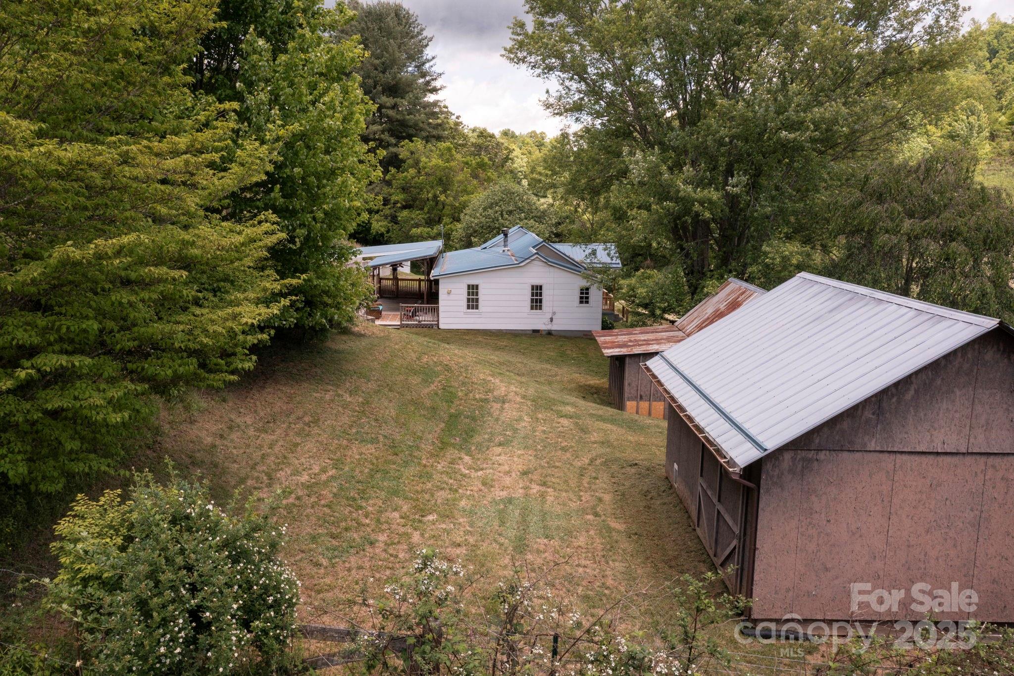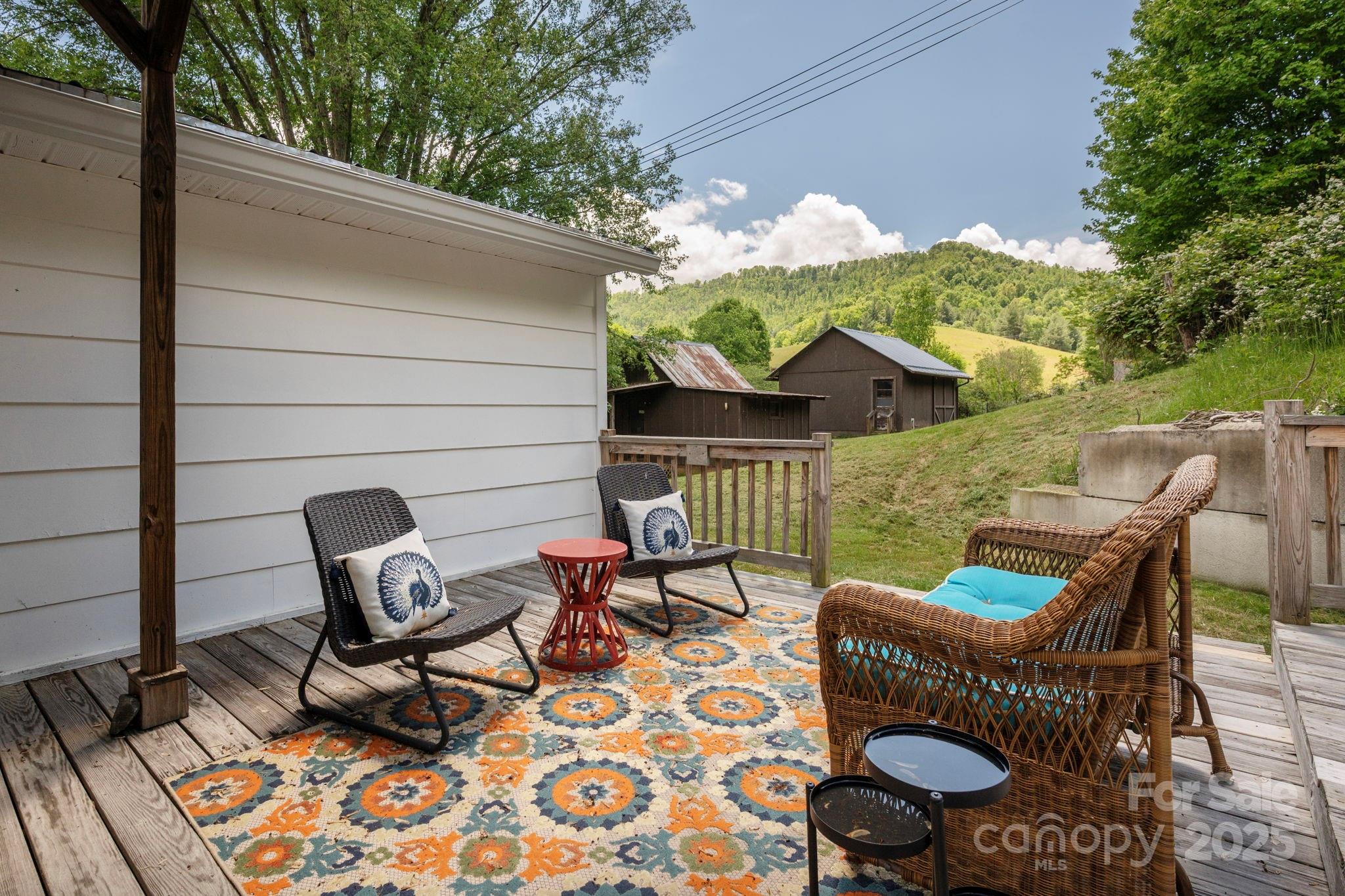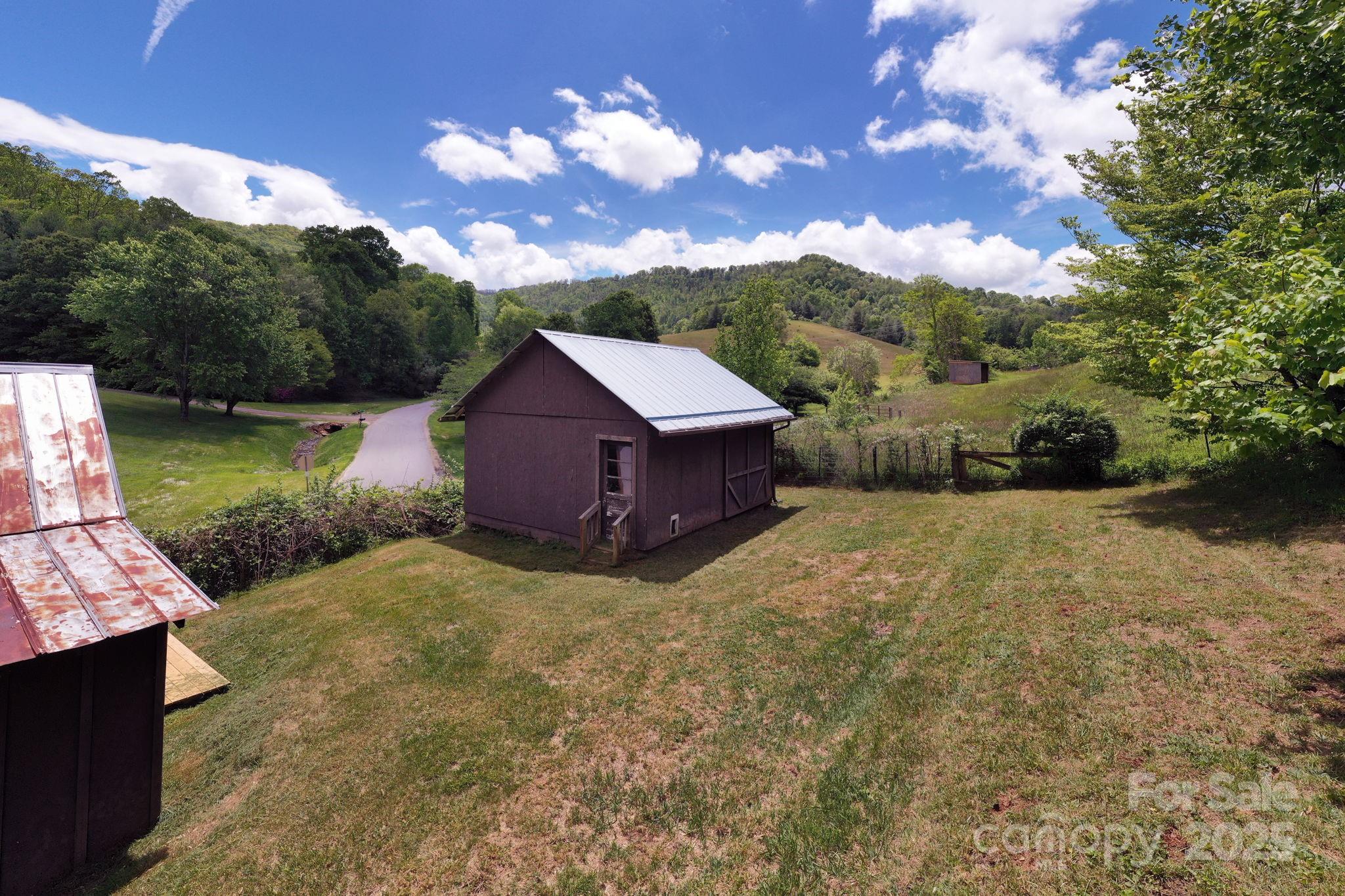 Cute cottage with two outbuildings great for artists ! Minutes Mountain Air Country Club, 5 min to Burnsville- 30 to Marshall and 35 min to downtown Asheville. Sunny quiet spot great for gardening and just enjoying the peace and quiet of mountain living. Enjoy picturesque rolling hills from this charming 3 bedroom 2 bath. Renovated kitchen with new appliances and quartz counter tops and fresh interior paint. One level living with open living/dining area with gorgeous stone fireplace. Spacious primary bedroom has clawfoot tub bathroom. Beautiful hardwood floors throughout. Beautiful antique vanity in second full bath. Tons of outdoor decking and covered area. Has carport and tons of room to park. Great for vacation home, first time home, second home or empty nest. Cute outbuilding makes great potential studio (water currently not hooked up). Second storage shed is a great workshop space. 2009 metal roof. Shared well. New Septic in process. Perfect homestead chickens and goats allowed.