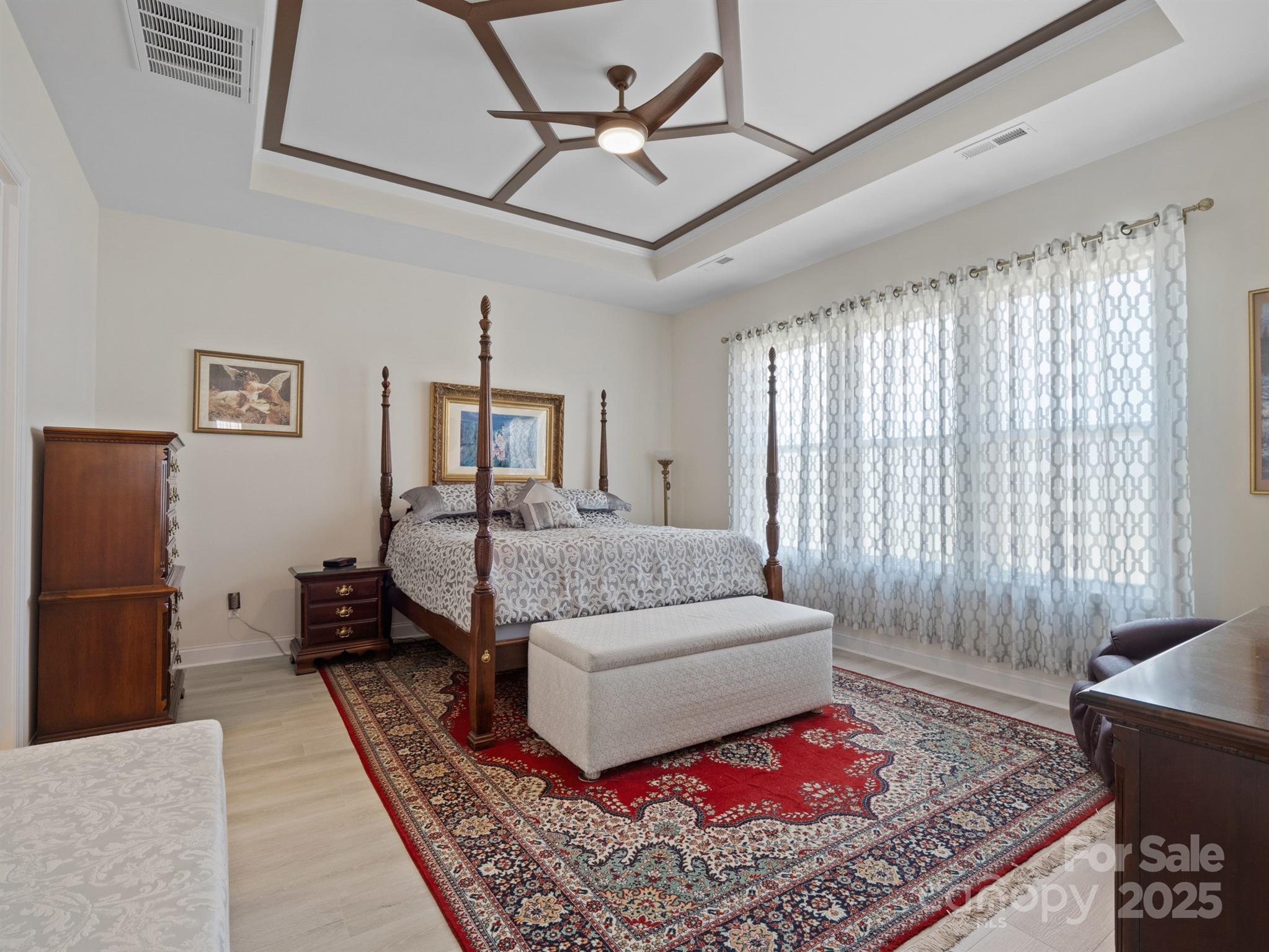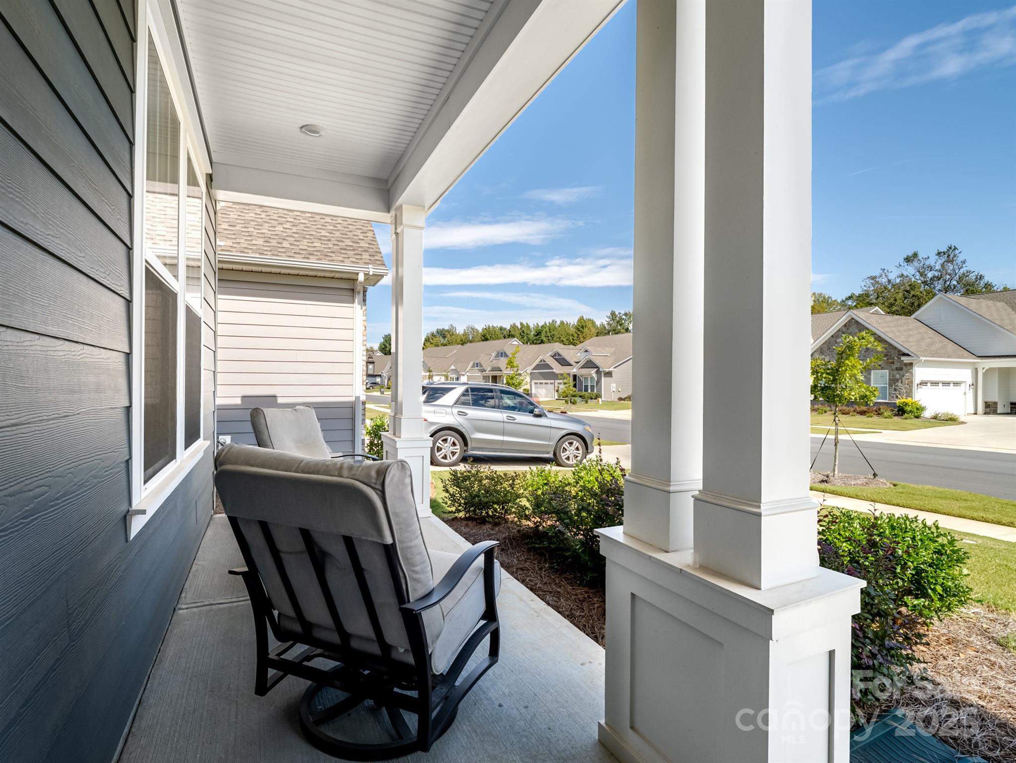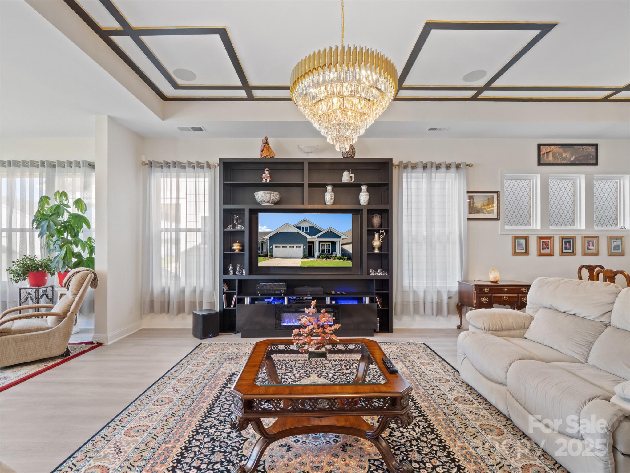 Beautiful and meticulously maintained, this stunning home offers designer finishes, spacious living areas, and access to resort-style amenities. A private office with elegant French doors provides the perfect space for working from home or quiet study. The chef’s kitchen is a true highlight, featuring a massive island with a one-bowl sink, 5-burner gas cooktop, wall oven, walk-in pantry, quartz countertops, and a porcelain marble backsplash—ideal for both everyday living and entertaining. Natural light pours into the sunroom, which extends off the living room to create a bright and airy space perfect for lounging or hosting guests. The primary bedroom suite is a peaceful retreat with dual vanities, a large tiled shower, and a custom closet organizer designed for optimal storage and convenience. Secondary bedrooms are spacious and thoughtfully designed. Bedroom 2 includes its own private bathroom, making it perfect for guests or as a mother-in-law suite. Bedroom 3 offers a generous walk-in closet, providing plenty of storage space. Throughout the home, stylish design elements such as tray ceiling accents, updated chandeliers, and 7.5 -inch luxury vinyl plank (LVP) flooring elevate the overall aesthetic. Large-format tile in wet areas adds both beauty and durability. The garage is equally impressive, featuring gleaming epoxy flooring and a utility sink for easy clean-up. This home is conveniently located near Village Commons, offering quick access to shopping, dining, and everyday essentials. As part of a vibrant community, residents can enjoy a full suite of resort-style amenities including a clubhouse, art studio, swimming pool, pickleball, bocce ball, and tennis courts. From its functional layout and thoughtful upgrades to its unbeatable location and lifestyle offerings, this home truly has it all. Don’t miss the opportunity to make it yours!