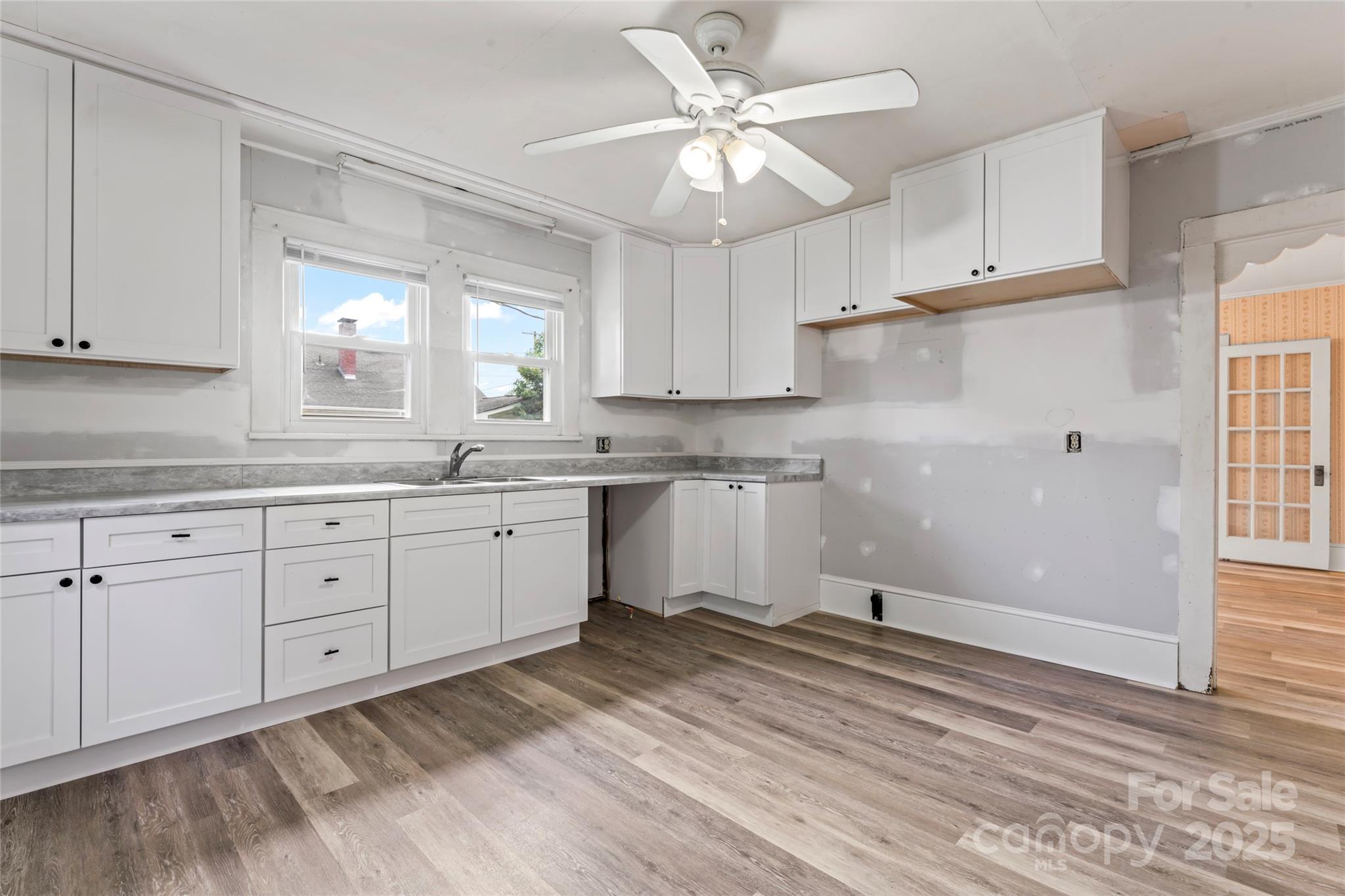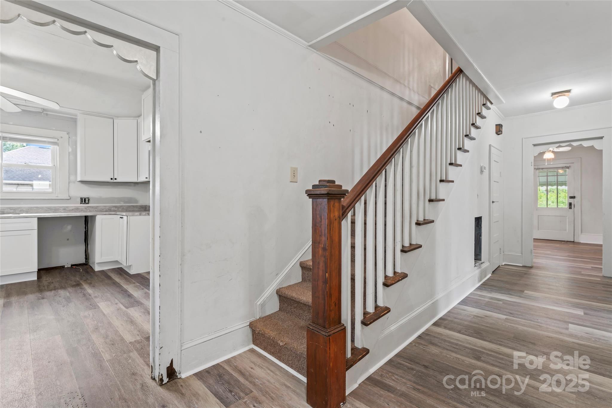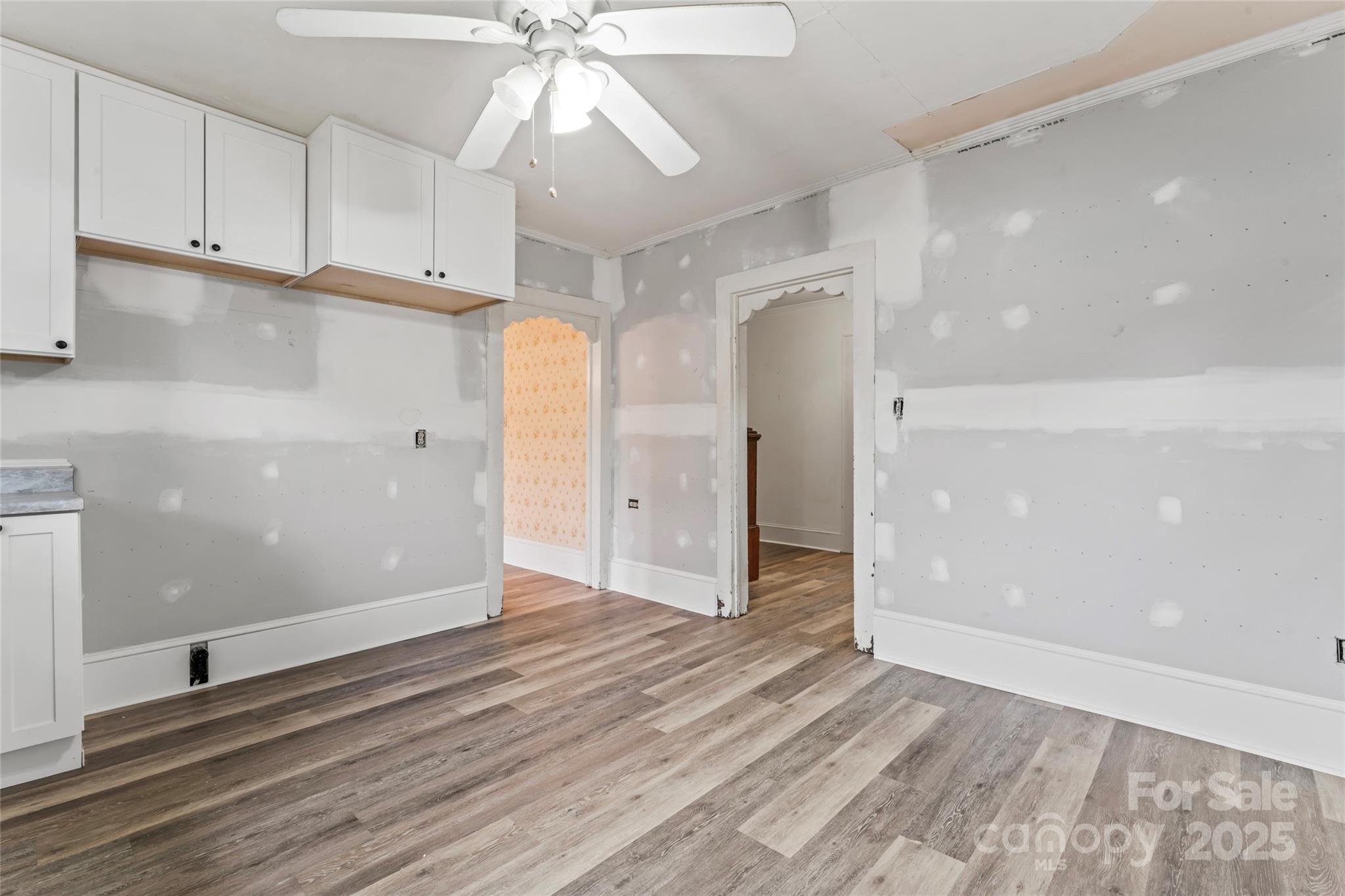 Full of vintage charm, this spacious home near downtown Kannapolis is a rare find! Loved for generations, it features original trim, a beautiful staircase, and French doors to a formal dining room. Main-level bedroom & tiled bath, plus a flex room that would be a great office. Updated kitchen with soft-close shaker cabinets needs your final touches New waterproof vinyl plank floors throughout downstairs. Upstairs has 3 bedrooms (large primary with walk-in closet, and bathroom with clawfoot tub), plus an office/playroom. Updates/renovations are needed but home is livable as-is...it won't take much to "glow-up" this beauty! Heat throughout; central HVAC downstairs with easy potential to add upstairs. Outside: deep ½ wrap porch with wrought iron rail & brick columns, rear deck with ramp, carport, oversized 2-car garage w/ workshop. Beautiful yard! 2.41-acre lot behind (MLS #4171174) can be neg with purchase!
