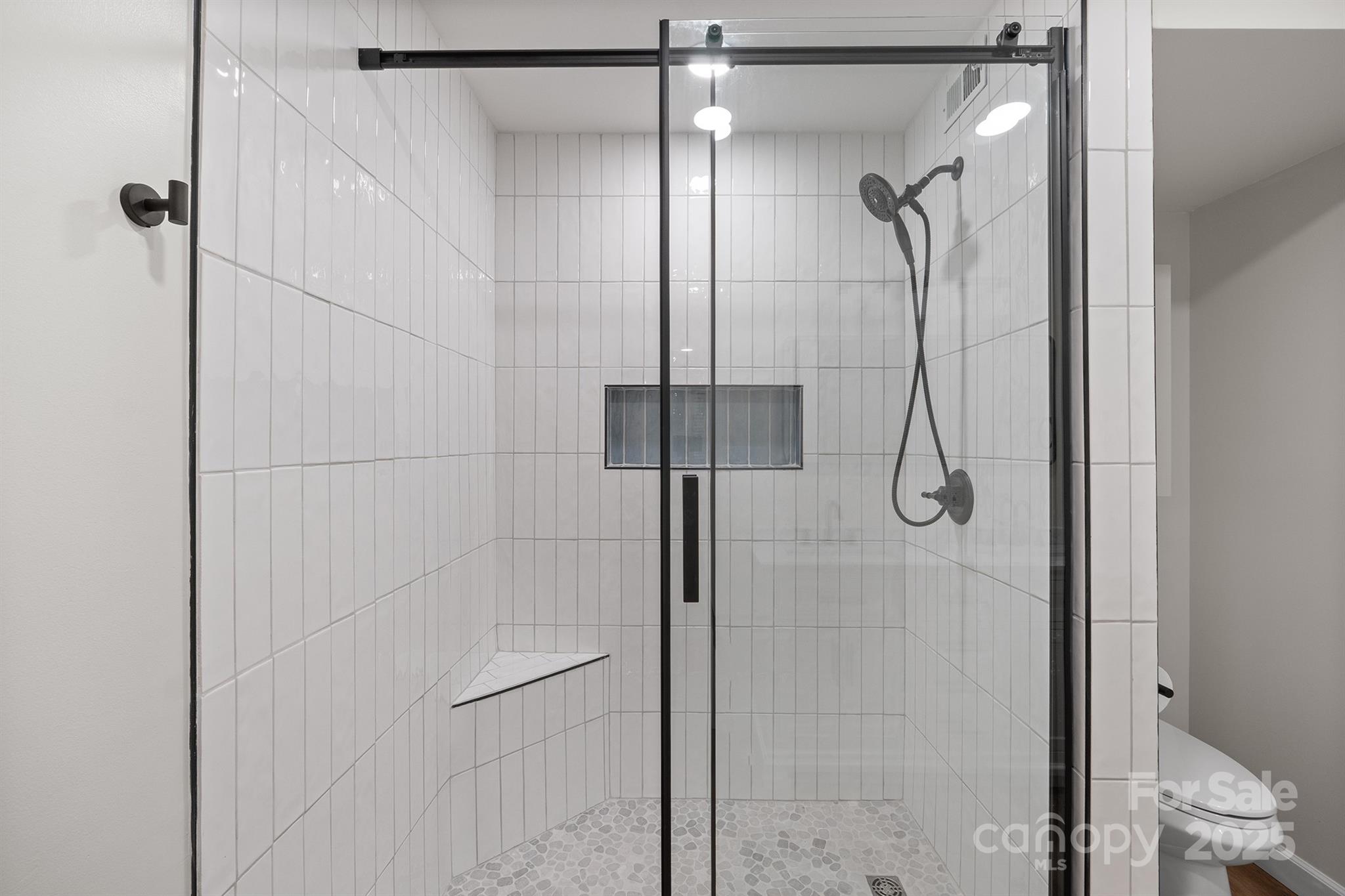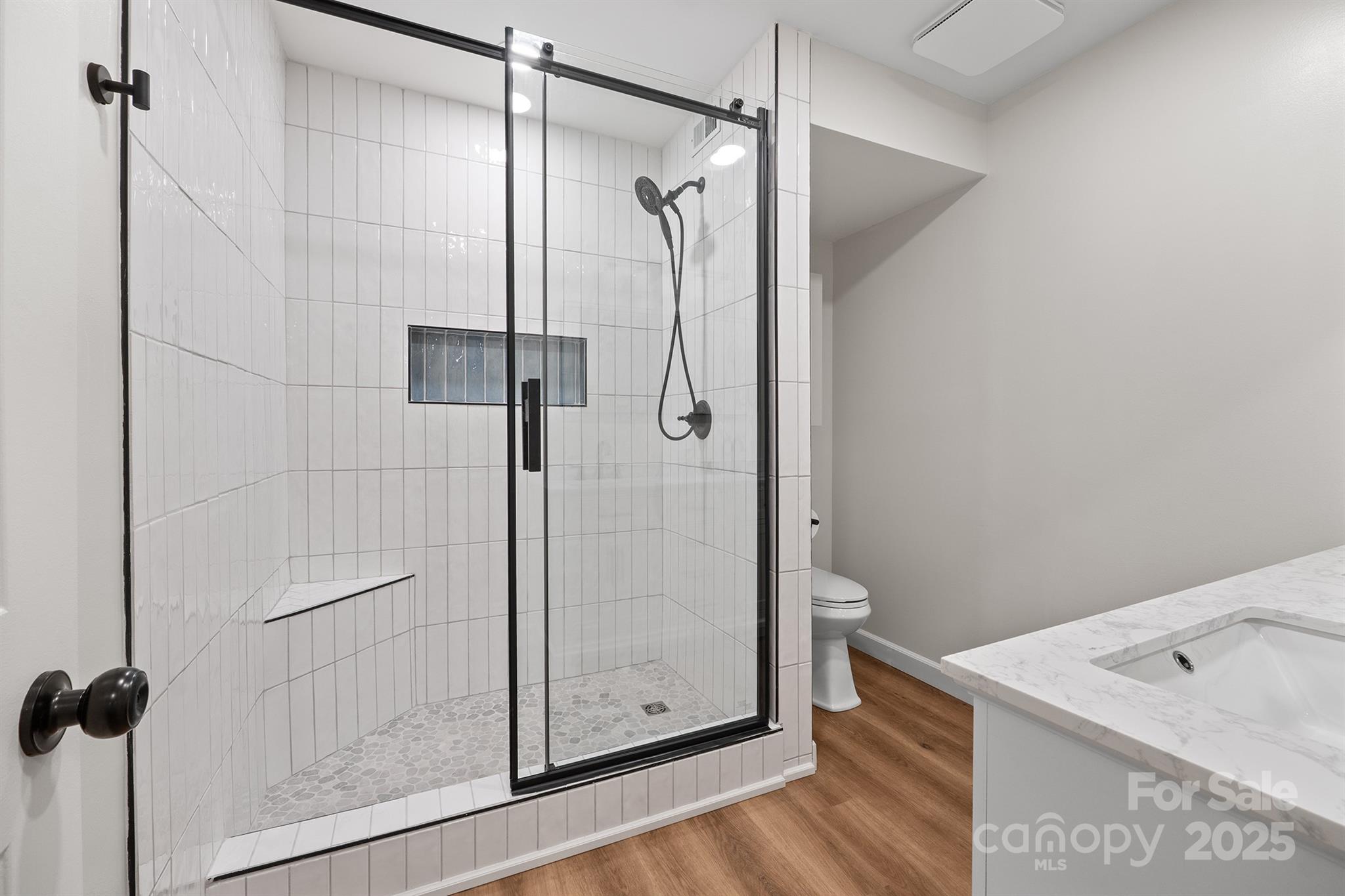 Magnificent make-over in the heart of Viewmont! Walk to Lenoir Rhyne University! You will love the open floor plan with new flooring throughout, large family room with stone fireplace, gorgeous primary suite with double closets, custom large tiled shower with pebble flooring, built in niche and corner seat , quartz vanity with two sinks and new lighting. Galley style eat-in kitchen offers newly painted cabinets, white quartz tops with tiled back splash, and new appliances. Nice, walk-in pantry w extra shelving and utility closet. This adorable, modern kitchen offers oversized glass doors for lots of natural lighting. The doors open to a brick patio overlooking a large, level, private back yard. There is also an outside storage closet off the patio. Upstairs offers two spacious bedrooms, an updated full bath, linen closet and an extra large walk in closet or storage space w attic access. Enjoy the last days of summer at the pool!