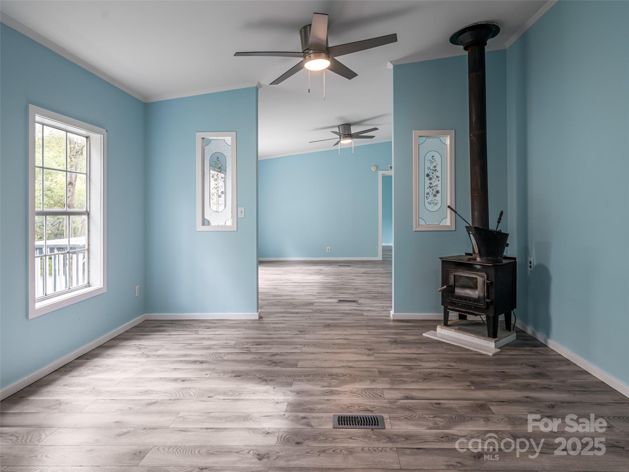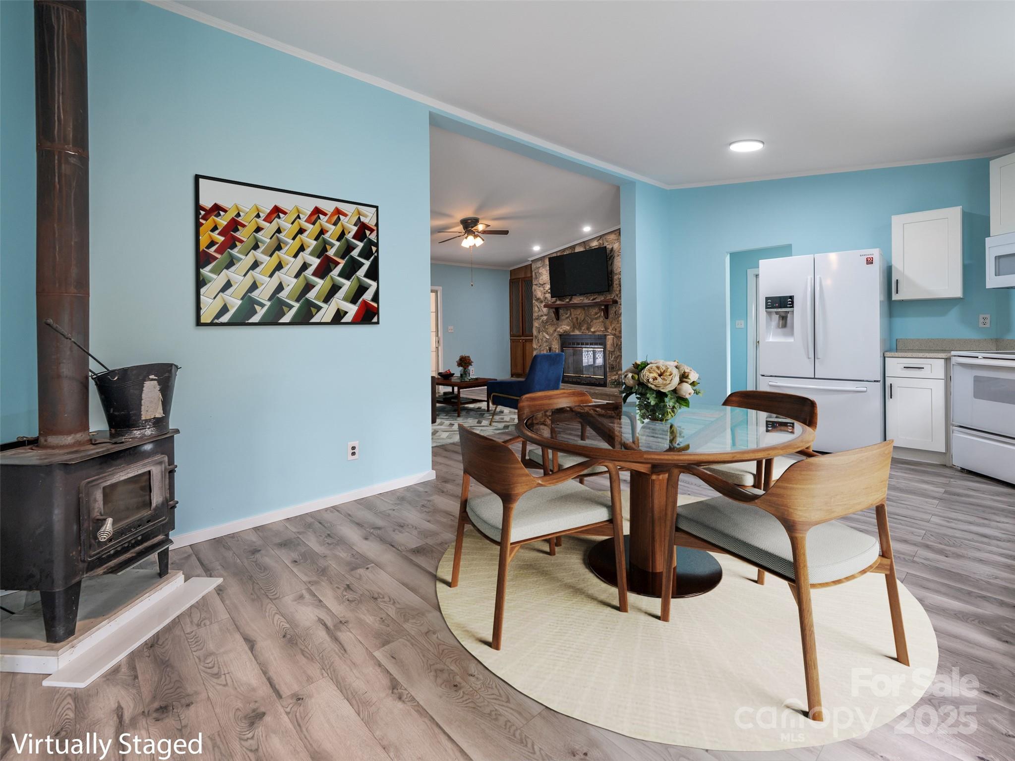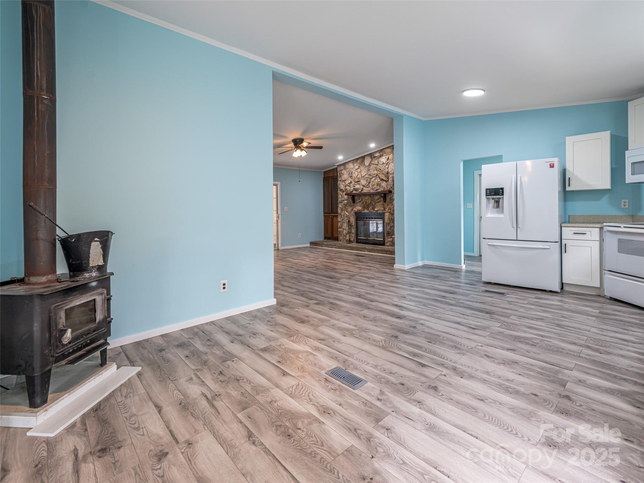 Move-in ready comfort awaits! Peaceful corner lot with mature trees and a spacious backyard, perfect for relaxing or entertaining under the shaded picnic area. This 3-bed, 2-bath home offers 1,540 sq. ft. and sits above the road with a level driveway and ramp entry. Inside, enjoy updated flooring, a refreshed kitchen with newer appliances, and a cozy wood-burning stove. The large primary suite includes a newly updated bath with a walk-in shower and walk-in closet. Guest bath is also updated, and walls are freshly painted throughout. Outdoor living features a newly decked side porch, while a large storage shed doubles as a workshop. Metal roof provides lasting durability and 2022 Heat Pump add to the appeal.