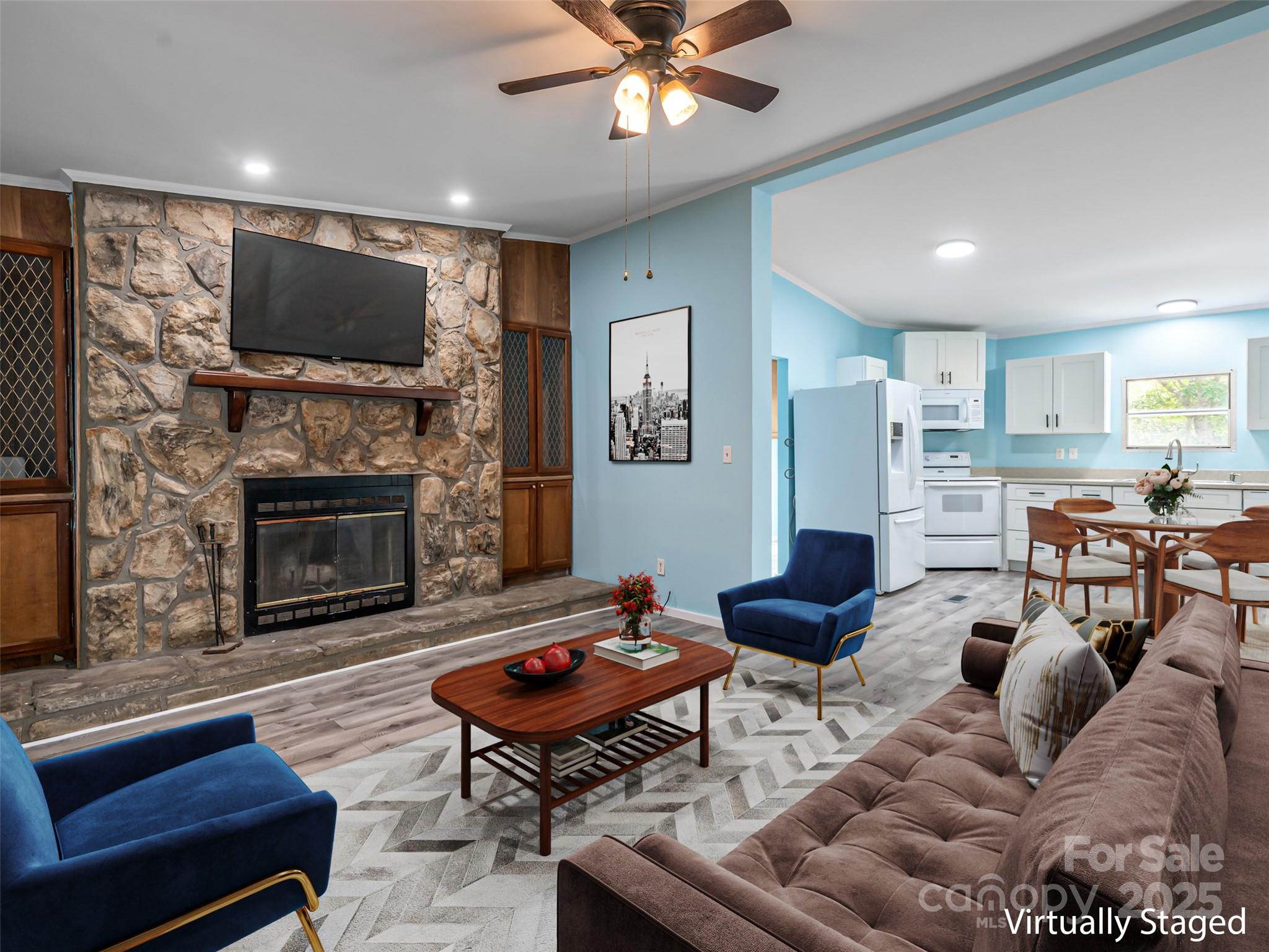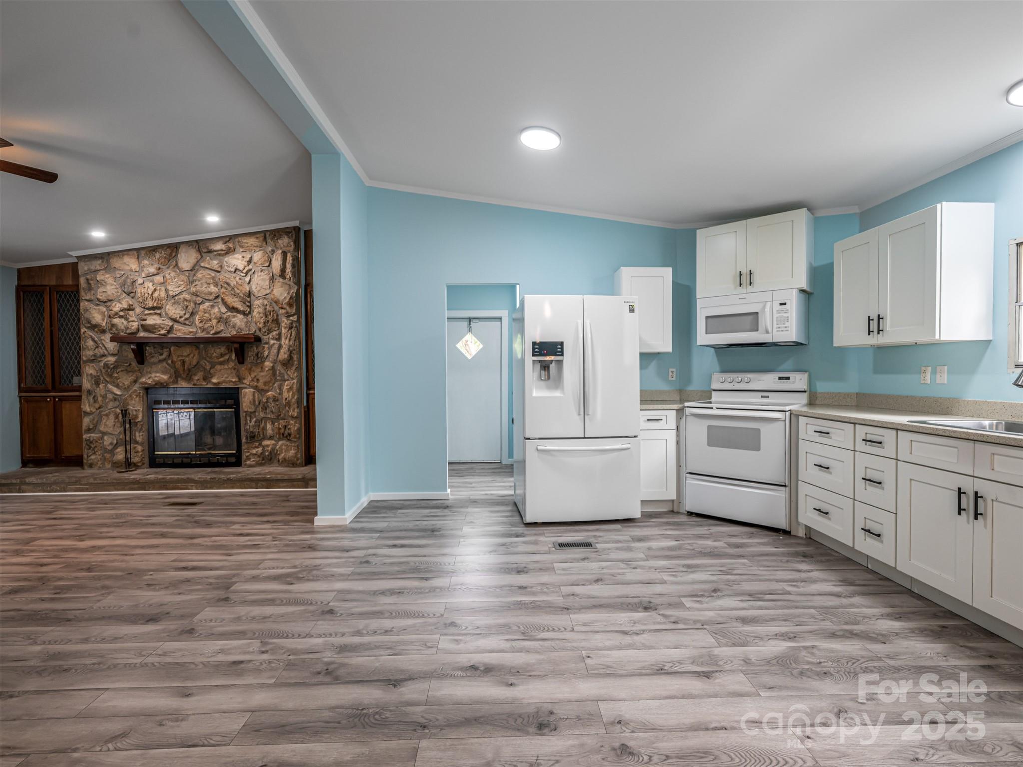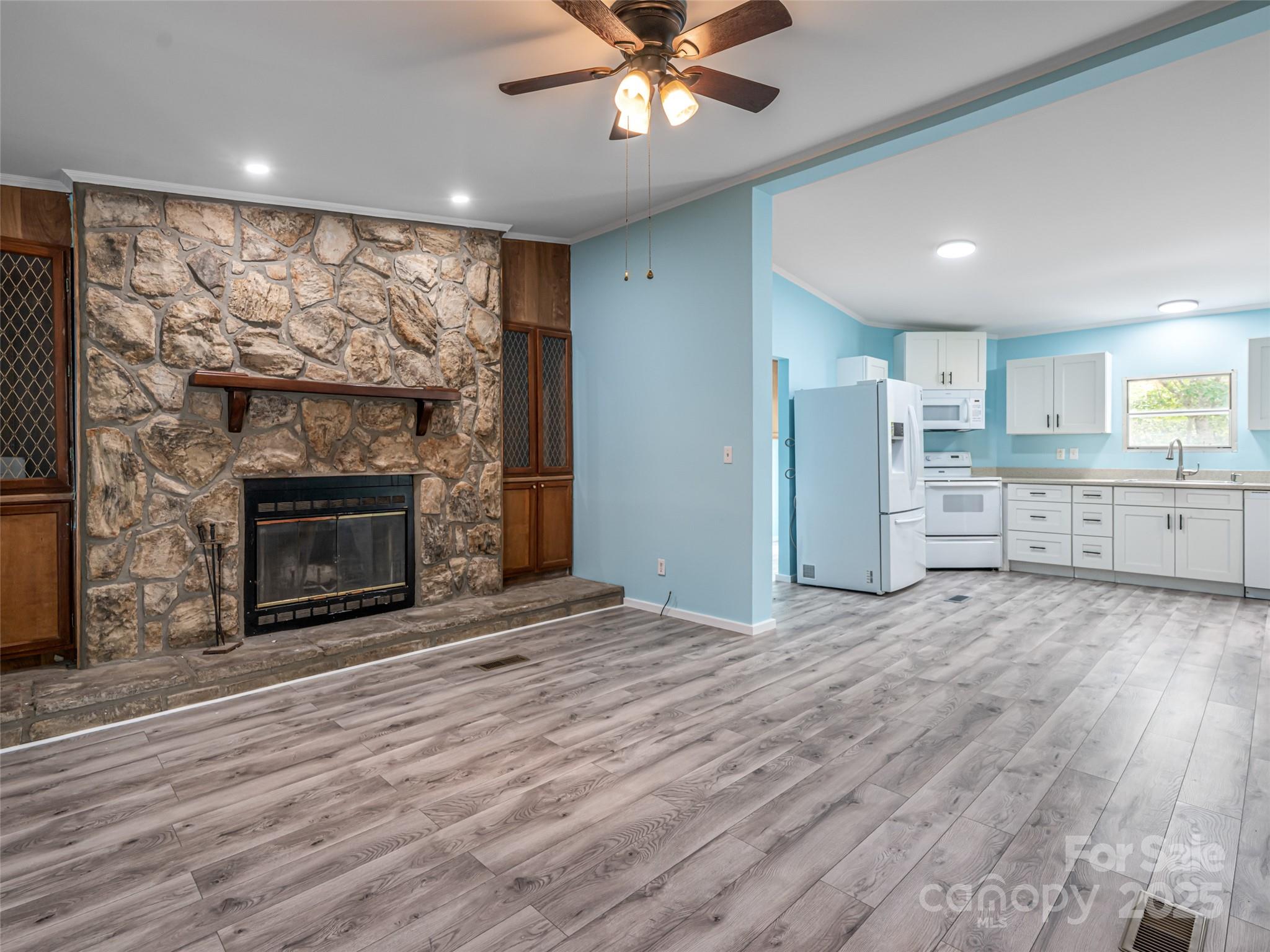Move-in ready comfort awaits! Peaceful corner lot with mature trees and a spacious backyard, perfect for relaxing or entertaining under the shaded picnic area. This 3-bed, 2-bath home offers 1,540 sq. ft. and sits above the road with a level driveway and ramp entry. Inside, enjoy updated flooring, a refreshed kitchen with newer appliances, and a cozy wood-burning stove. The large primary suite includes a newly updated bath with a walk-in shower and walk-in closet. Guest bath is also updated, and walls are freshly painted throughout. Outdoor living features a newly decked side porch, while a large storage shed doubles as a workshop. Metal roof provides lasting durability and 2022 Heat Pump add to the appeal.