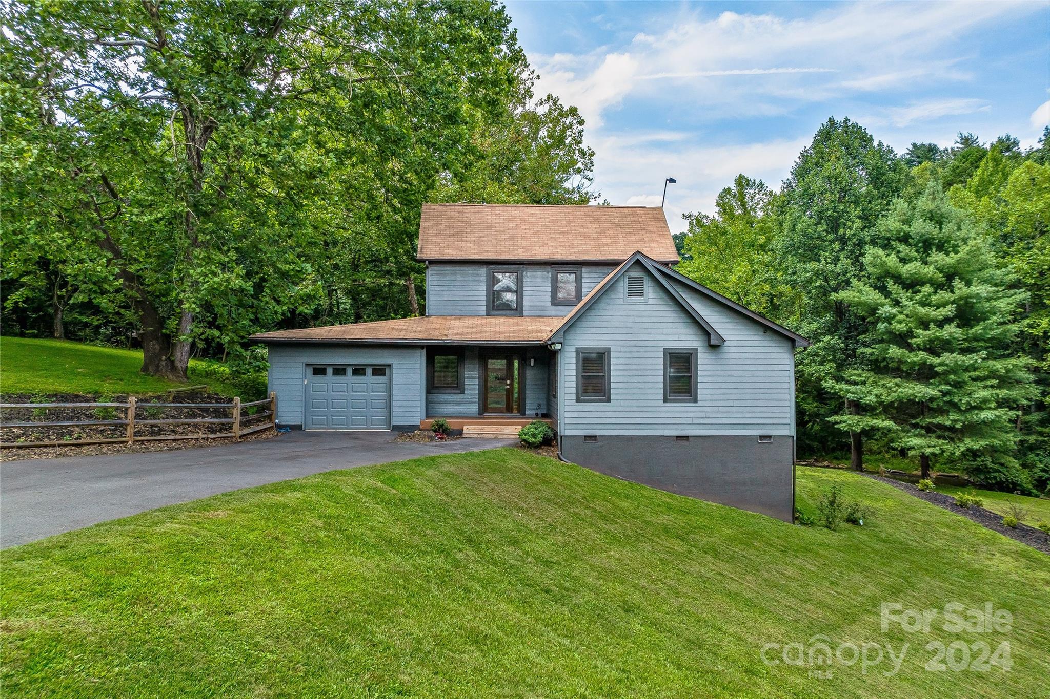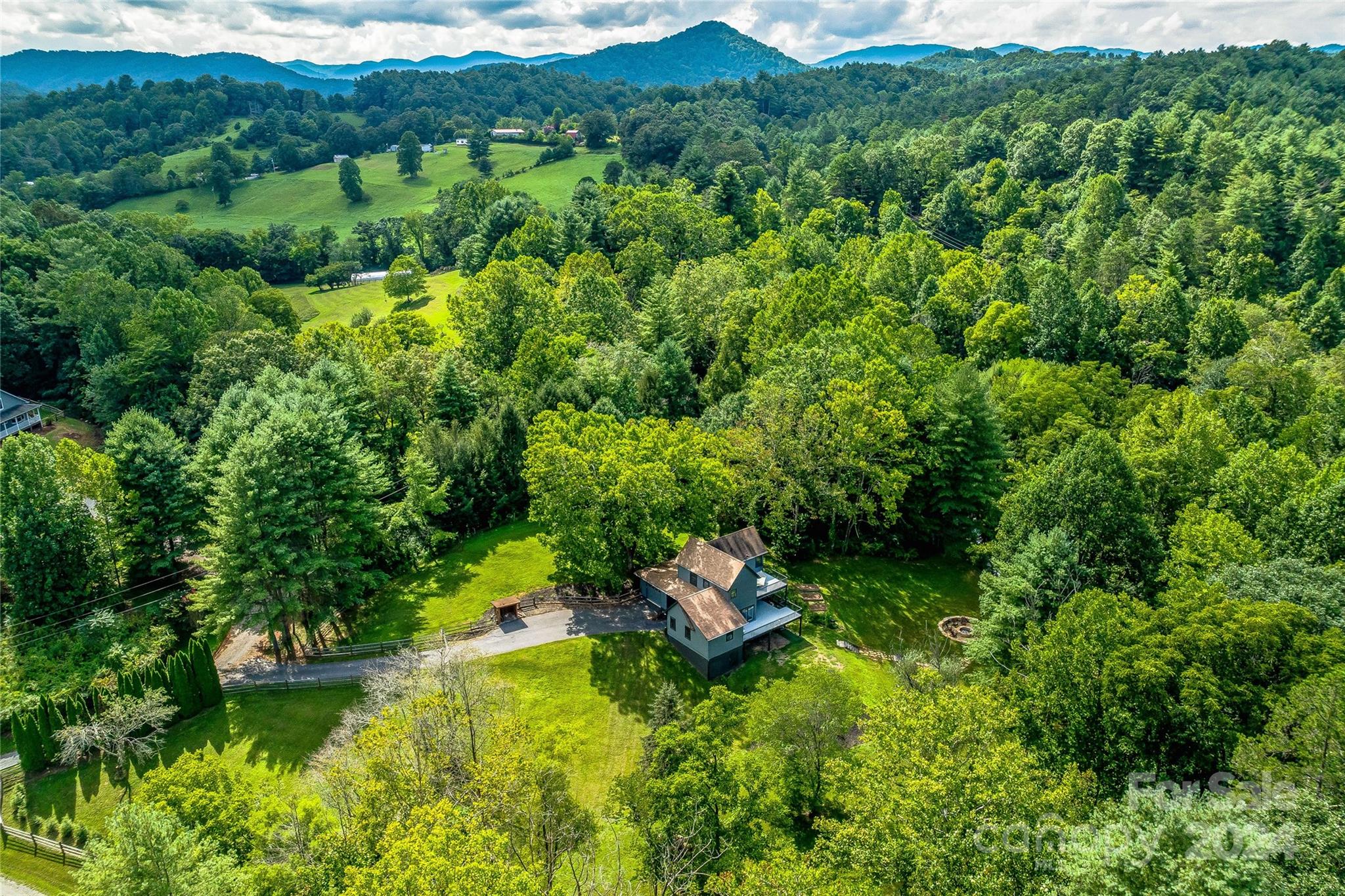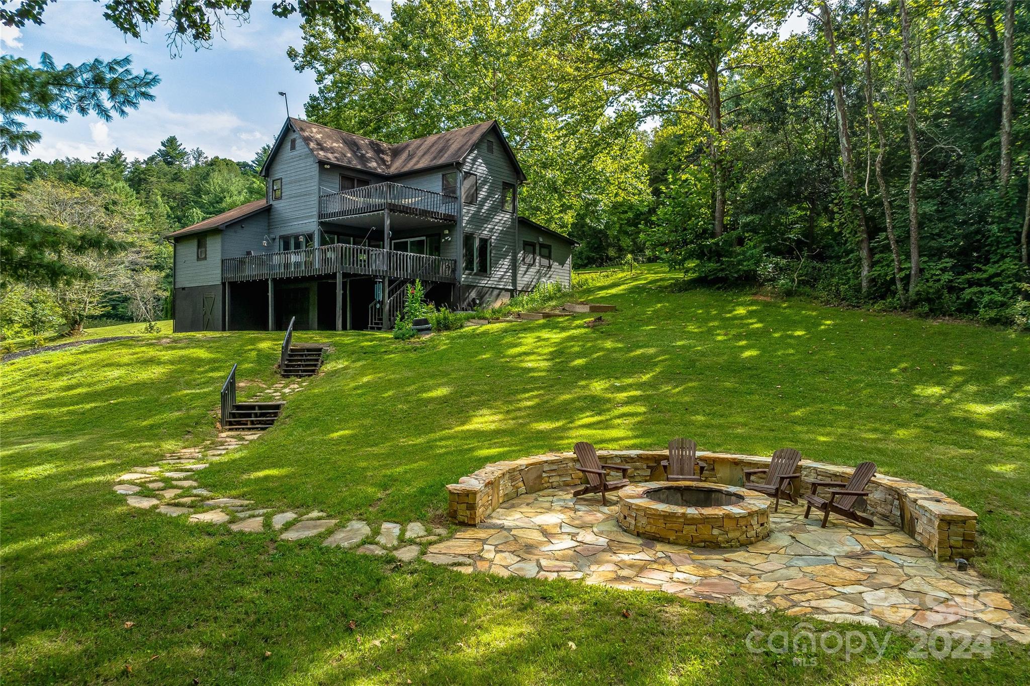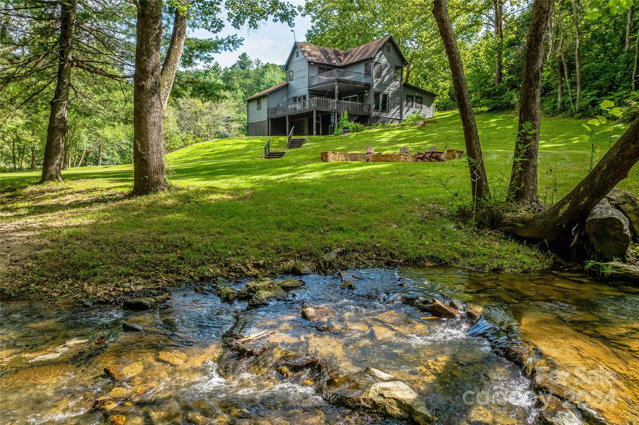 Escape to 48 Merrell Road, a serene home offering comfort and convenience in picturesque Leicester, NC. This inviting property features 3 bedrooms and 3.5 baths, with bright, open living spaces and and a large modern kitchen for entertaining. Primary bedroom is on main. Large windows invite scenic nature into the kitchen with you. Expansive large back deck perfect for entertainment and enjoying the sound of the flowing creek and waterfall. The primary bedroom is on the first floor with laundry in primary closet. Workspace in the basement with a garage door for easy outside access. The outdoor space includes a hand built stone fire pit and seating area, a flowing creek with a built-in waterfall, and gorgeous grassy knolls. The lot is slightly over five and a half acres, with plenty of room to build separate structures or build a main house and have this one as a guest home. Privacy, opportunity, and serenity. This home is part modular and part stick built. See Agent remarks for roof.