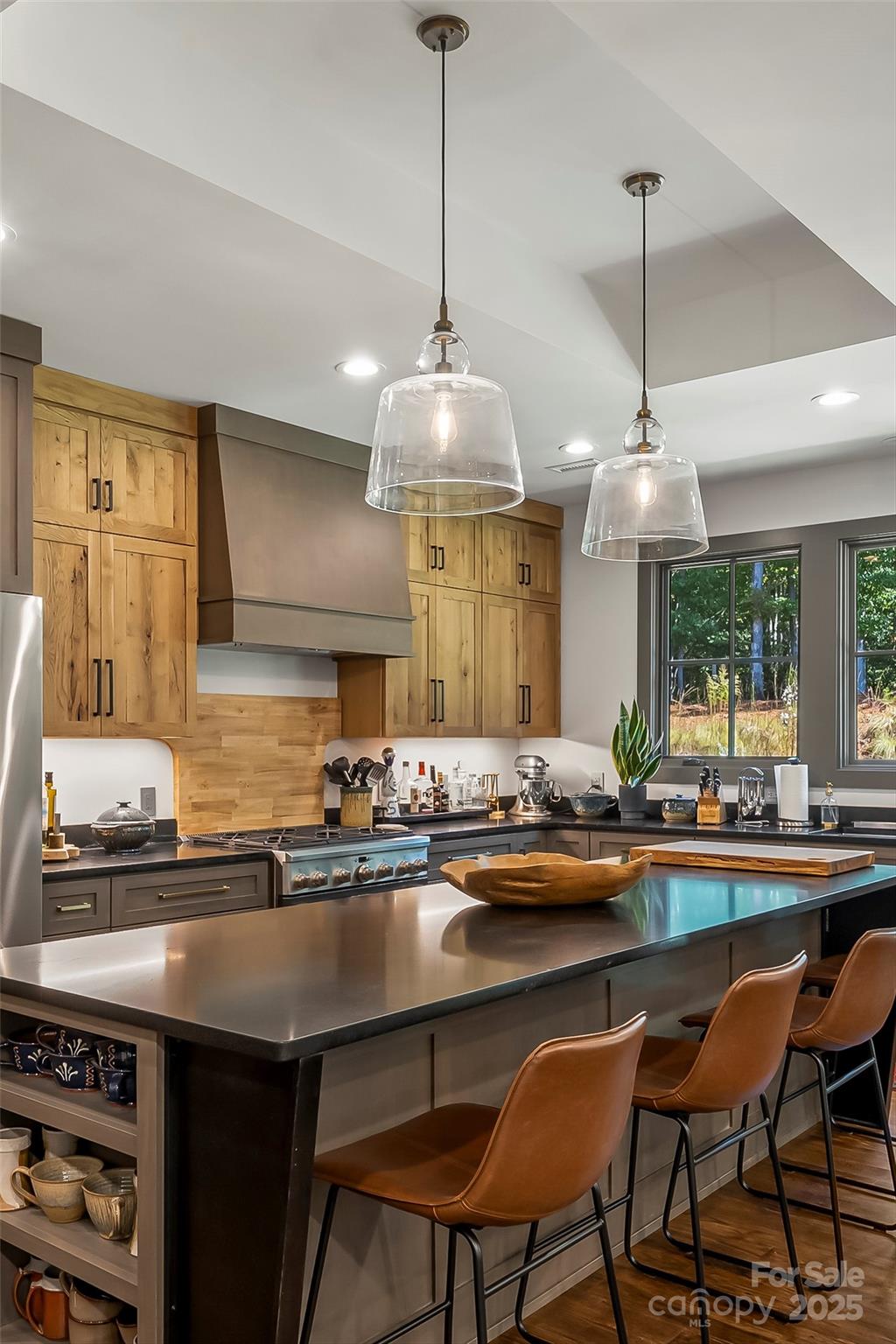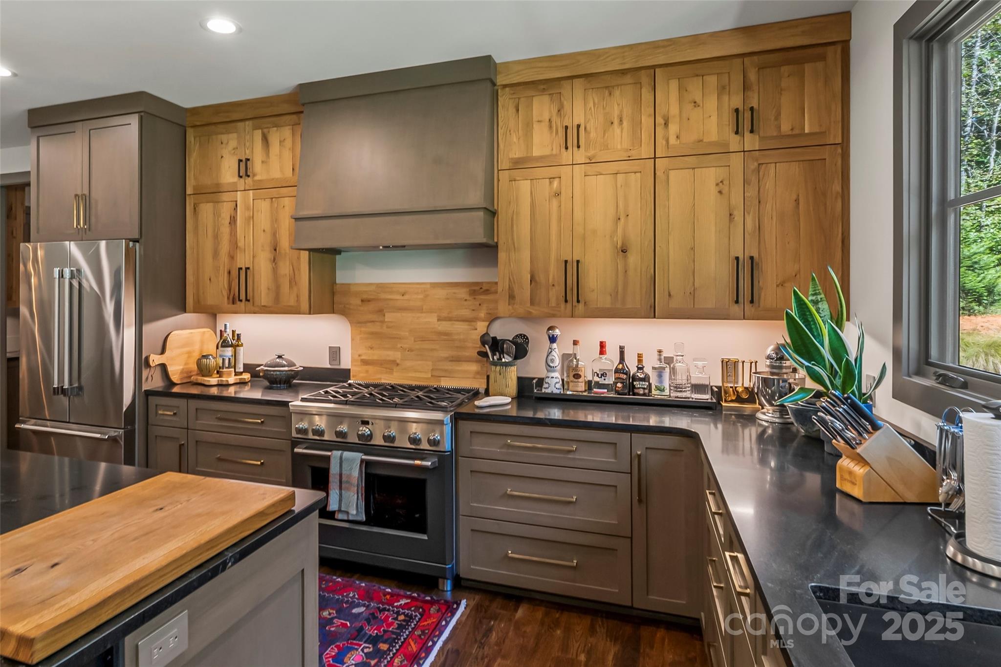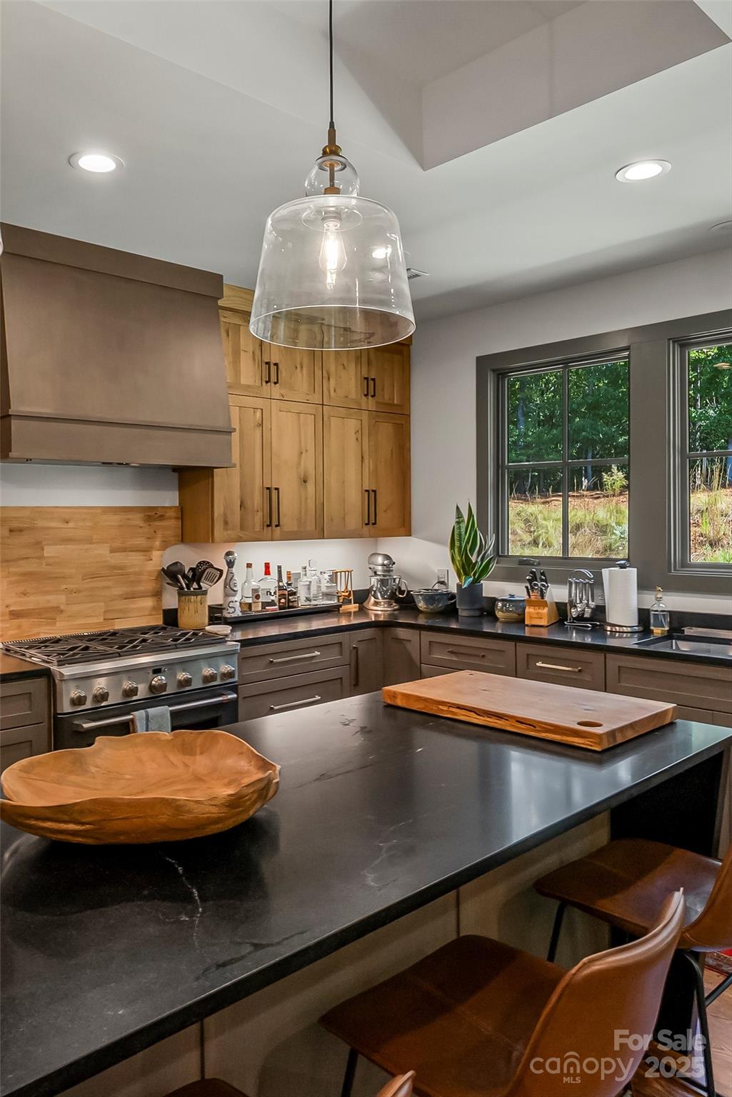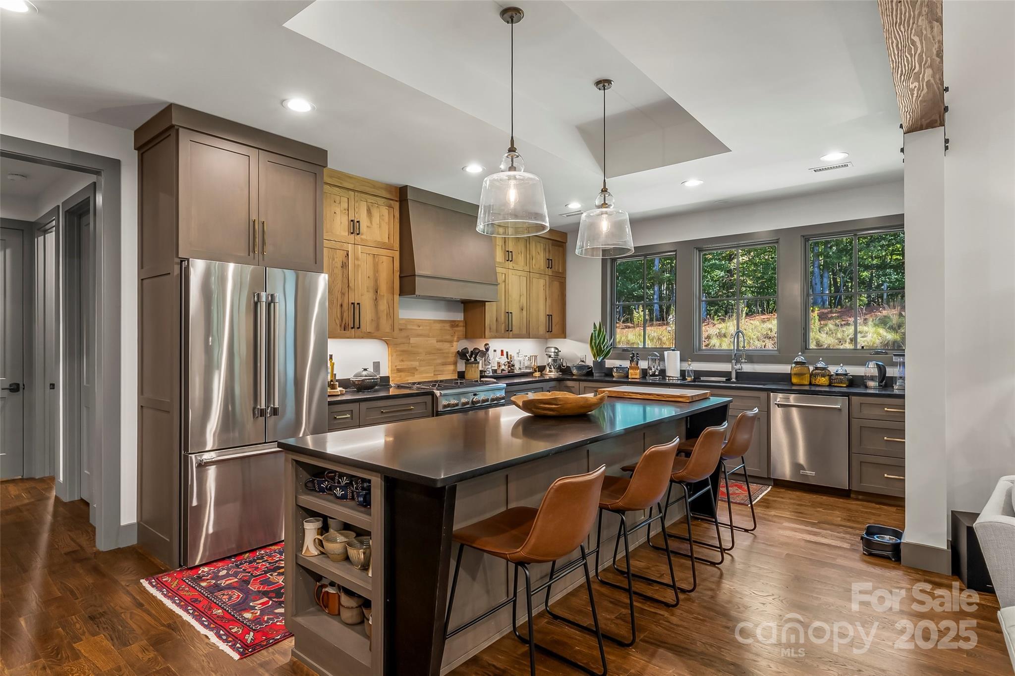 Tucked away on a peaceful acre in one of Morganton’s most desirable small developments, this 2022 custom-built modern ranch is a true showcase of craftsmanship and comfort. Designed to embrace its natural setting, the home features stone and cement siding accented with cypress posts, 42 Jeld-Wen windows, and 3/4" tongue-and-groove hardwood floors throughout. Inside, the open-concept layout welcomes you with a chef’s kitchen boasting high-end appliances, oversized gas range, a 10’ island, walk-in pantry, and custom cabinetry topped with granite surfaces. The dining area—with its striking custom granite banquette table for 10—flows into a spacious family room and out to a large covered patio for effortless indoor-outdoor living. A separate den with vaulted ceiling and fireplace leads to a charming side porch, perfect for morning coffee or unwinding at day’s end. Each of the 3 bedrooms enjoys a private ensuite bath and walk-in closet, with the main-level primary retreat offering vaulted ceilings, patio access, and a spa-like bath filled with natural light, custom cabinetry, and direct access to the laundry suite. Additional highlights include custom metalwork throughout, extensive storage, a 2-car garage with a drop zone entry right off the kitchen, and timeless details that make this home truly one of a kind. Convenient to downtown Morganton and I-40, this home blends modern luxury with peaceful living in a setting that feels both private and connected.