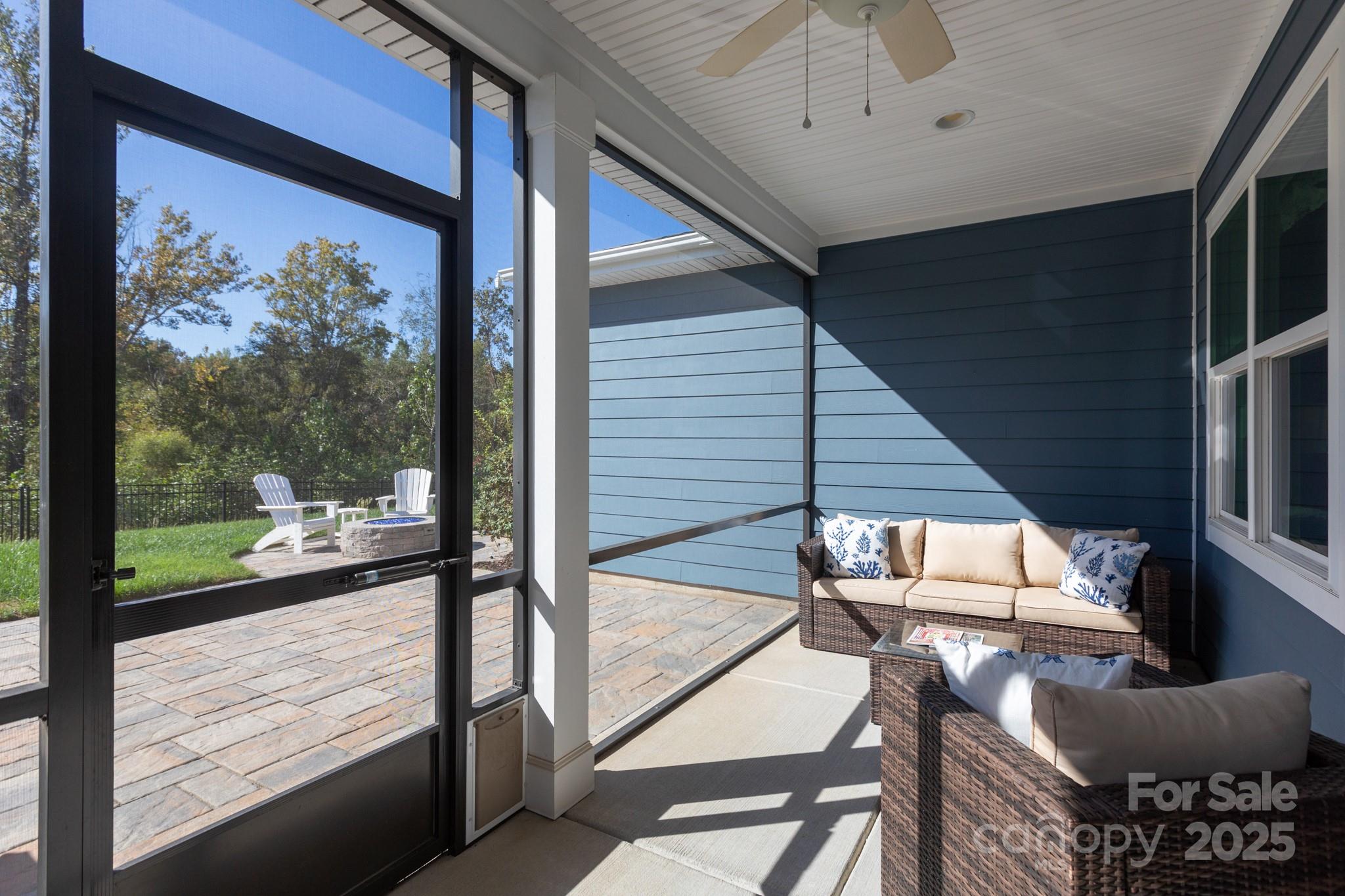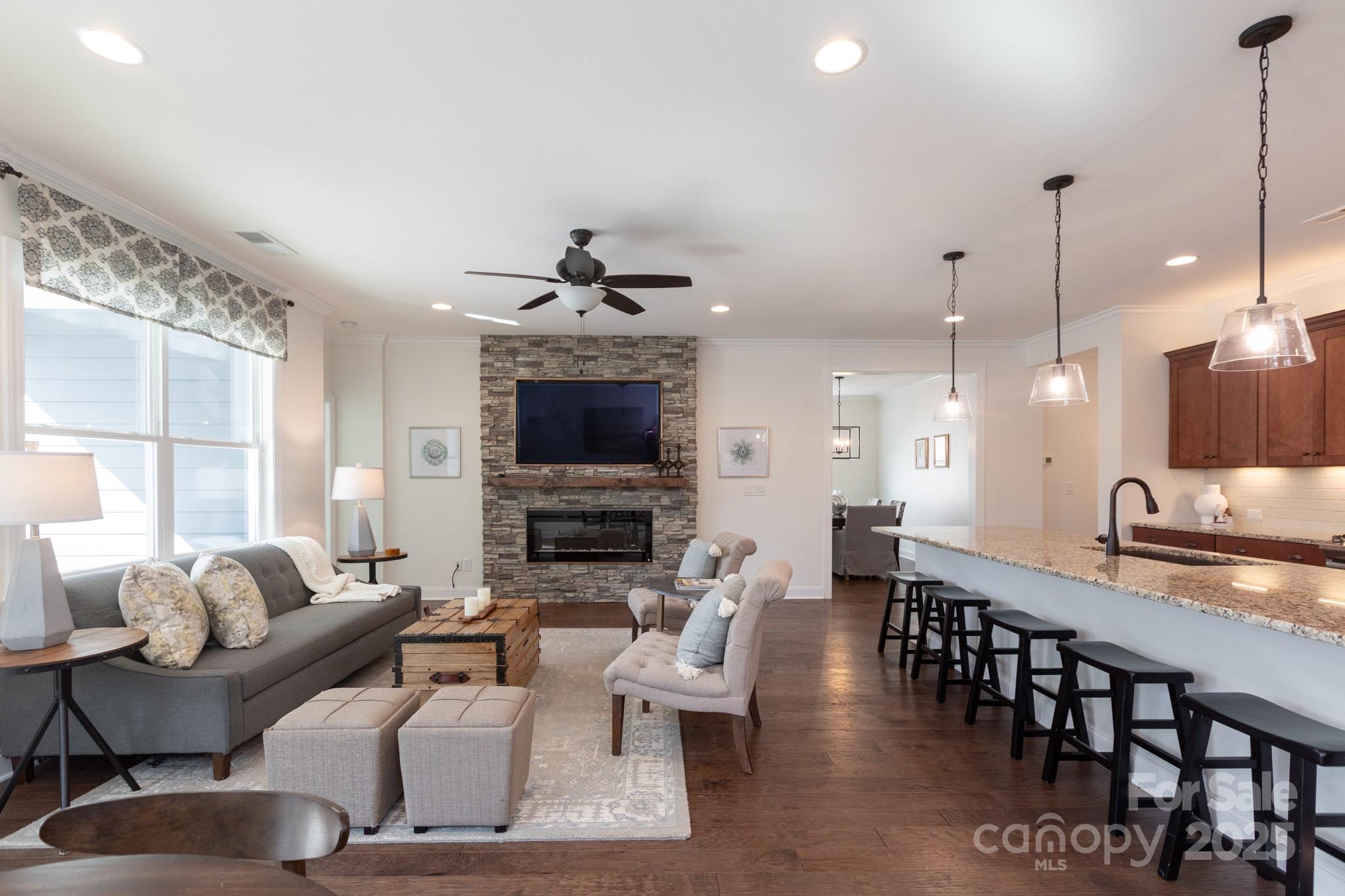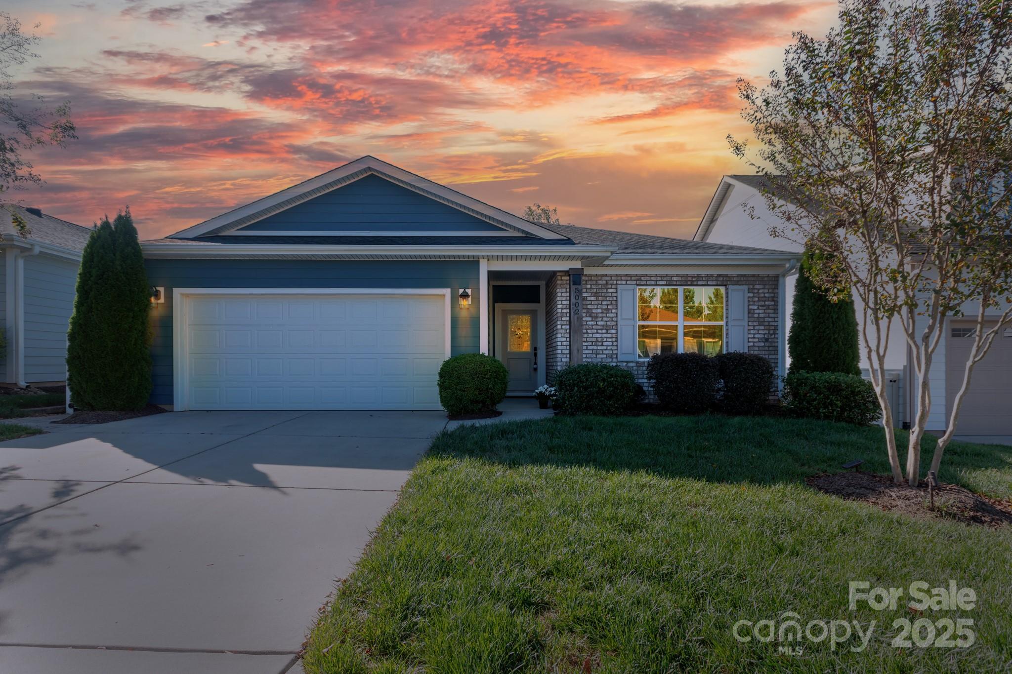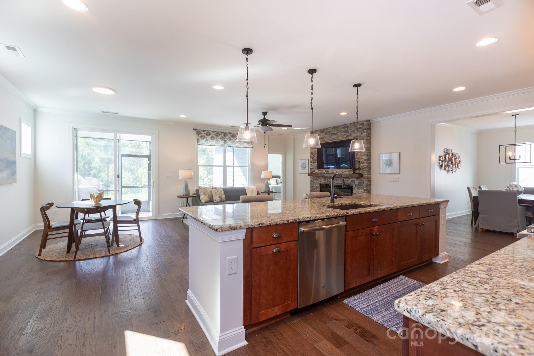 Lightly lived-in and beautifully upgraded, this home is in Trilogy Lake Norman, a premier gated 55-plus community. 5002 Looking Glass Trail sits on a premium lot backing to a wooded common area, offering privacy from your screened porch, paver patio with grilling station, and gas fire pit. Inside, you’ll find hardwood floors in the entertaining areas, fresh paint throughout, and a striking stacked-stone electric fireplace (TV above conveys). The kitchen features a gas range, vented microwave, under-cabinet lighting, soft-close cabinetry, and a spacious island with excellent prep space. A flex room, currently used as formal dining, complements a breakfast/lounge area. The light-filled primary suite is located at the back of the home, with a bath that includes a double vanity, shower with seat, separate water closet, and customized walk-in closet. Two additional bedrooms sit at the front with a shared bath. A laundry room with drop zone leads to an expanded two-car garage with storage racks. This residence offers easy living with front and side lawn maintenance covered by the HOA. Life in Trilogy feels like a year-round resort, centered around the Twin Mills Club and its incredible amenities. Welcome home!