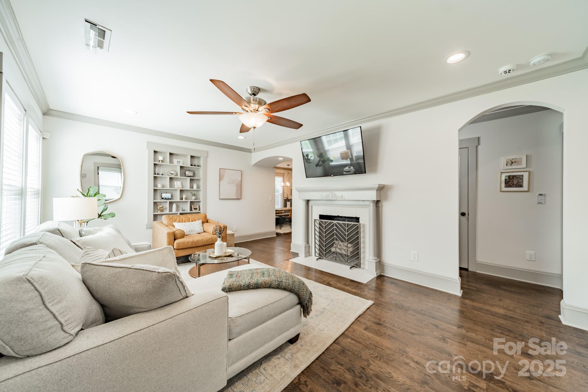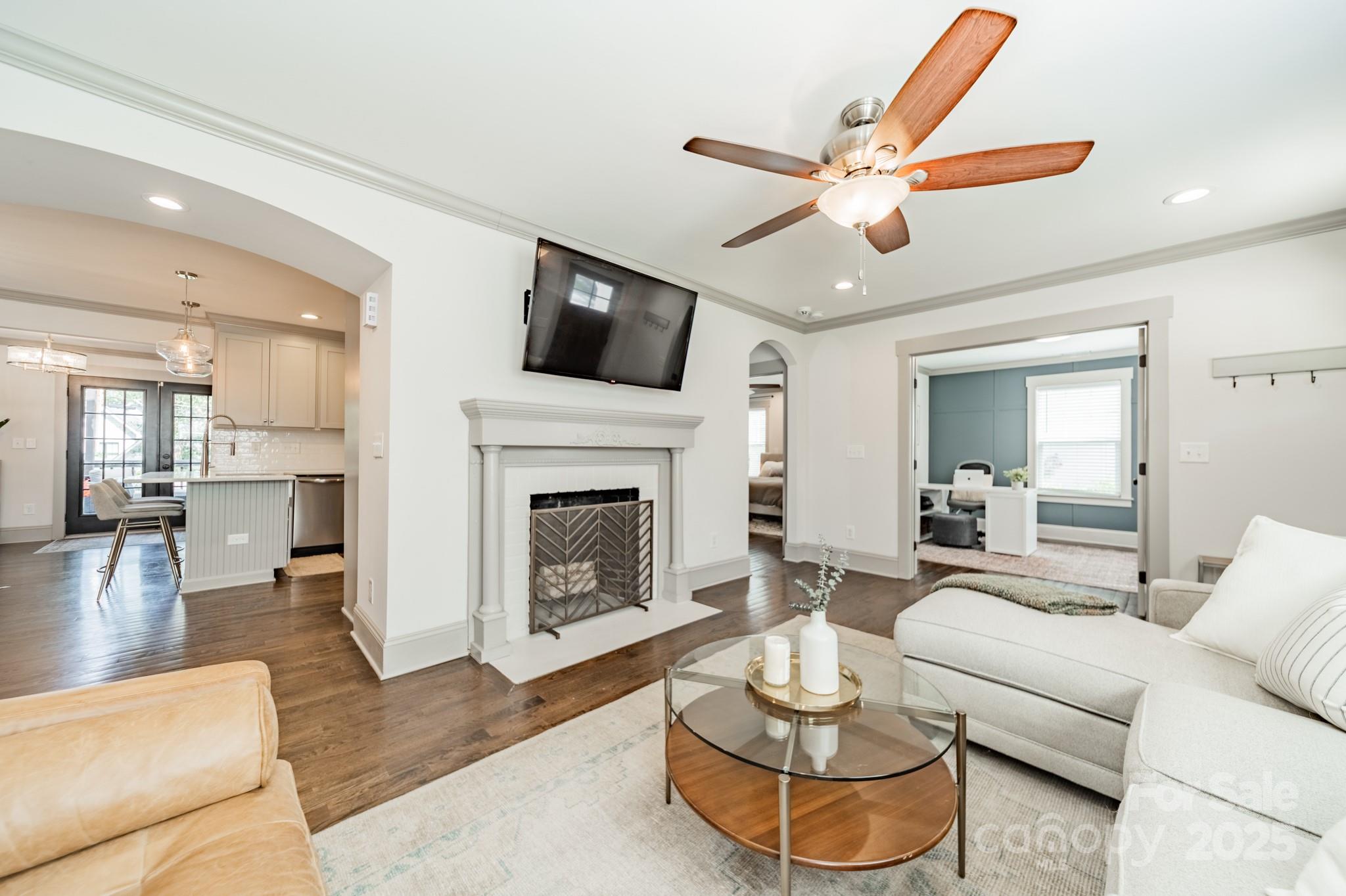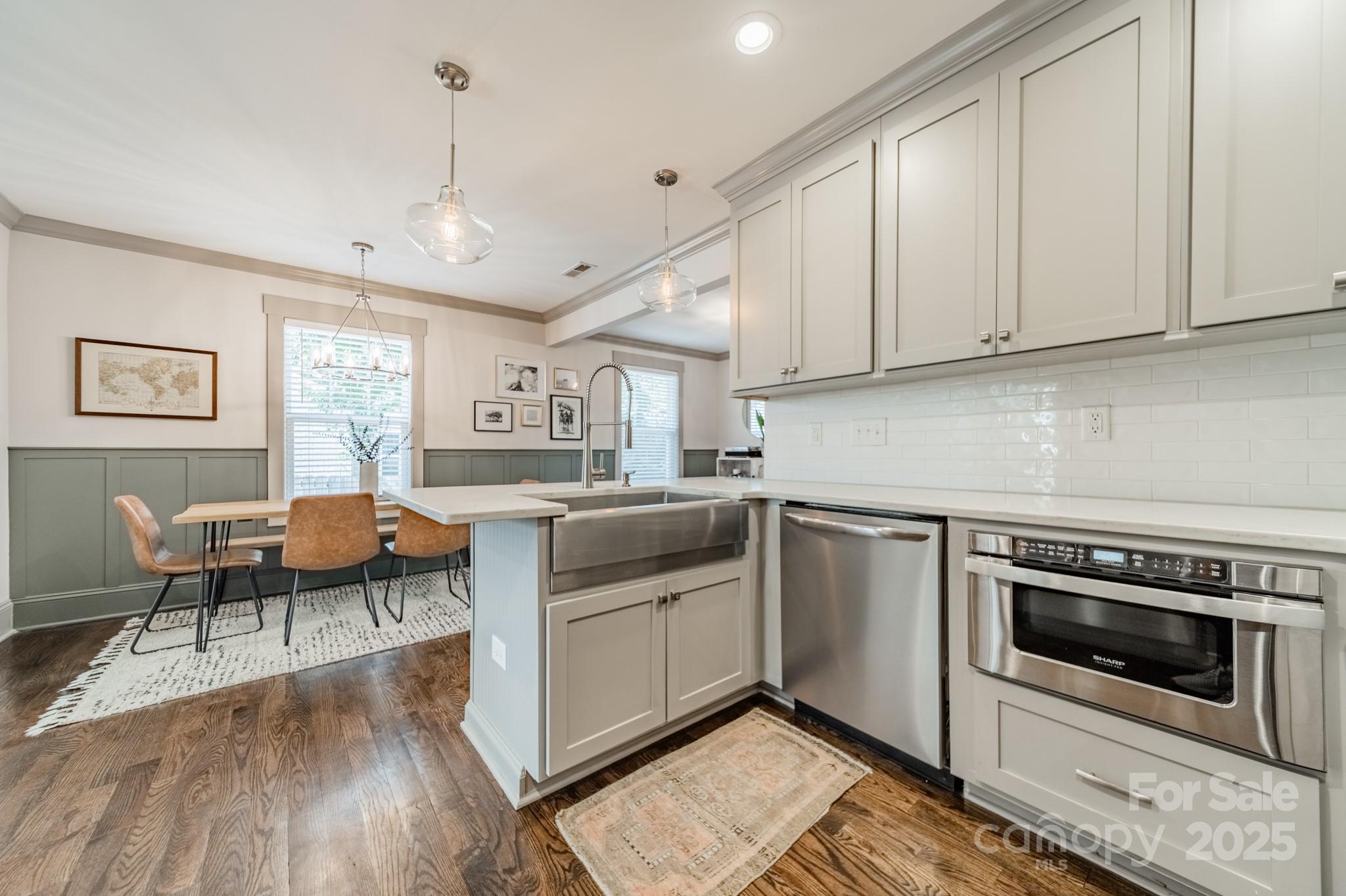 Classic charm meets modern comfort in this fully renovated 1.5-story 1948 bungalow near historic Camp Greene. Hardwood floors, arched doorways & detailed millwork create a warm, inviting feel. The cozy living room flows into a spacious kitchen with elegant finishes, breakfast bar, dining area & sitting room - perfect for day-to-day living or entertaining. A generous walk-through pantry leads to the laundry, offering ample storage and effortless functionality. Two main-level BRs include the primary suite & a 2nd BR ideal for a home office or den. Upstairs, two additional BRs & a full bath provide a quiet retreat. The beautifully manicured lot features a HUGE fenced yard, garden shed & spacious deck for endless outdoor enjoyment. Set in a well-established neighborhood undergoing thoughtful revitalization, with local favorites like Legion Brewing, Pinky’s, Noble Smoke & Rhino Market nearby. Commuting is a breeze as this home is less than 10 minutes to Uptown Charlotte.