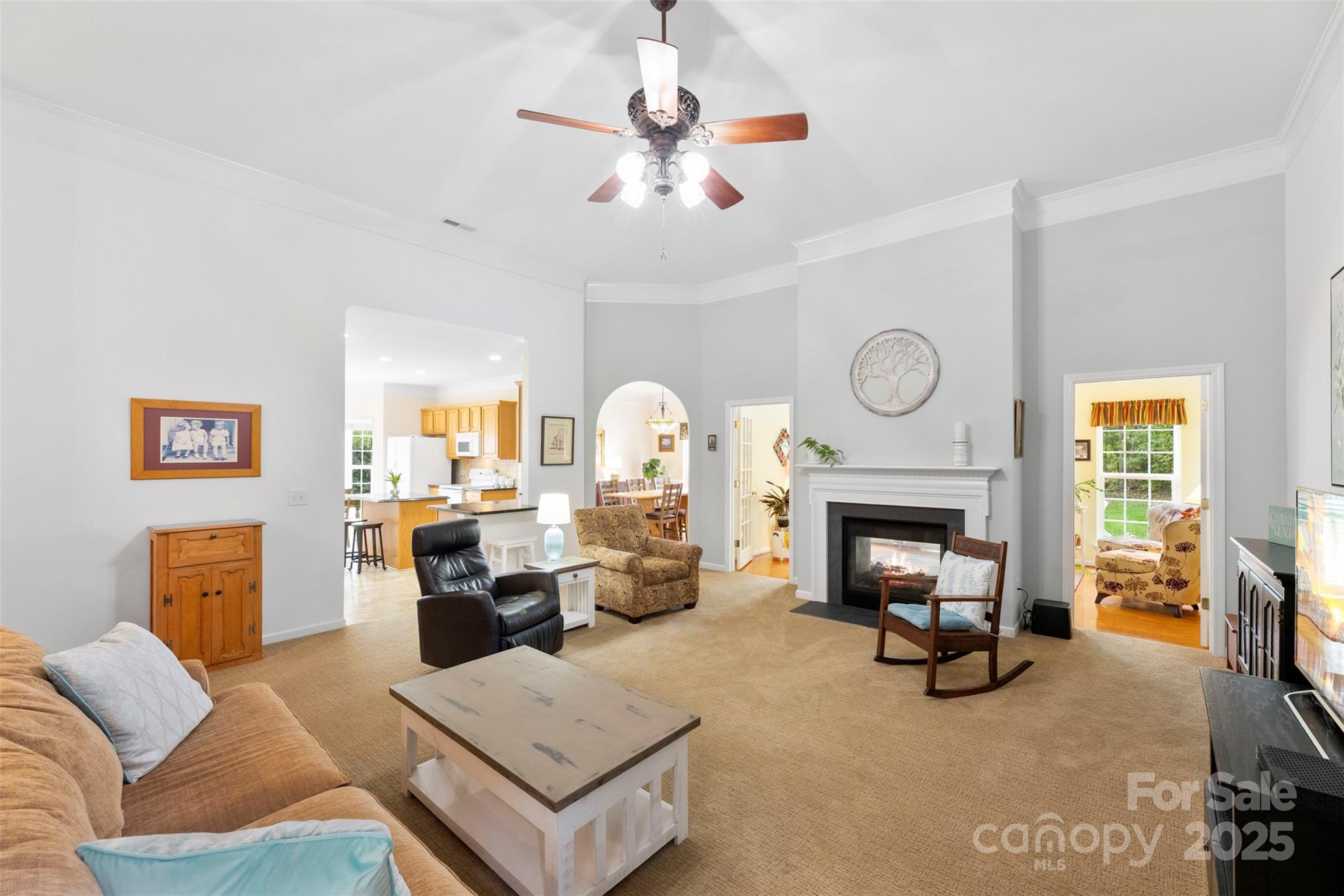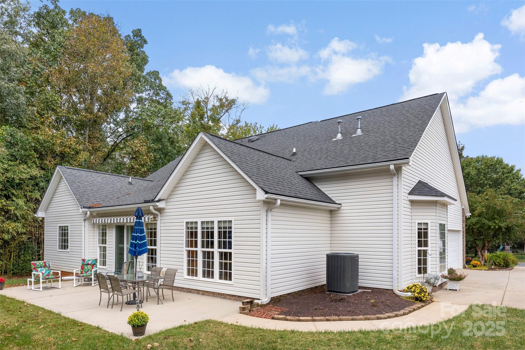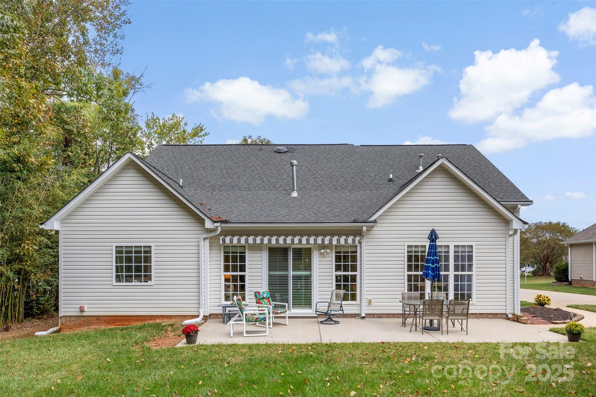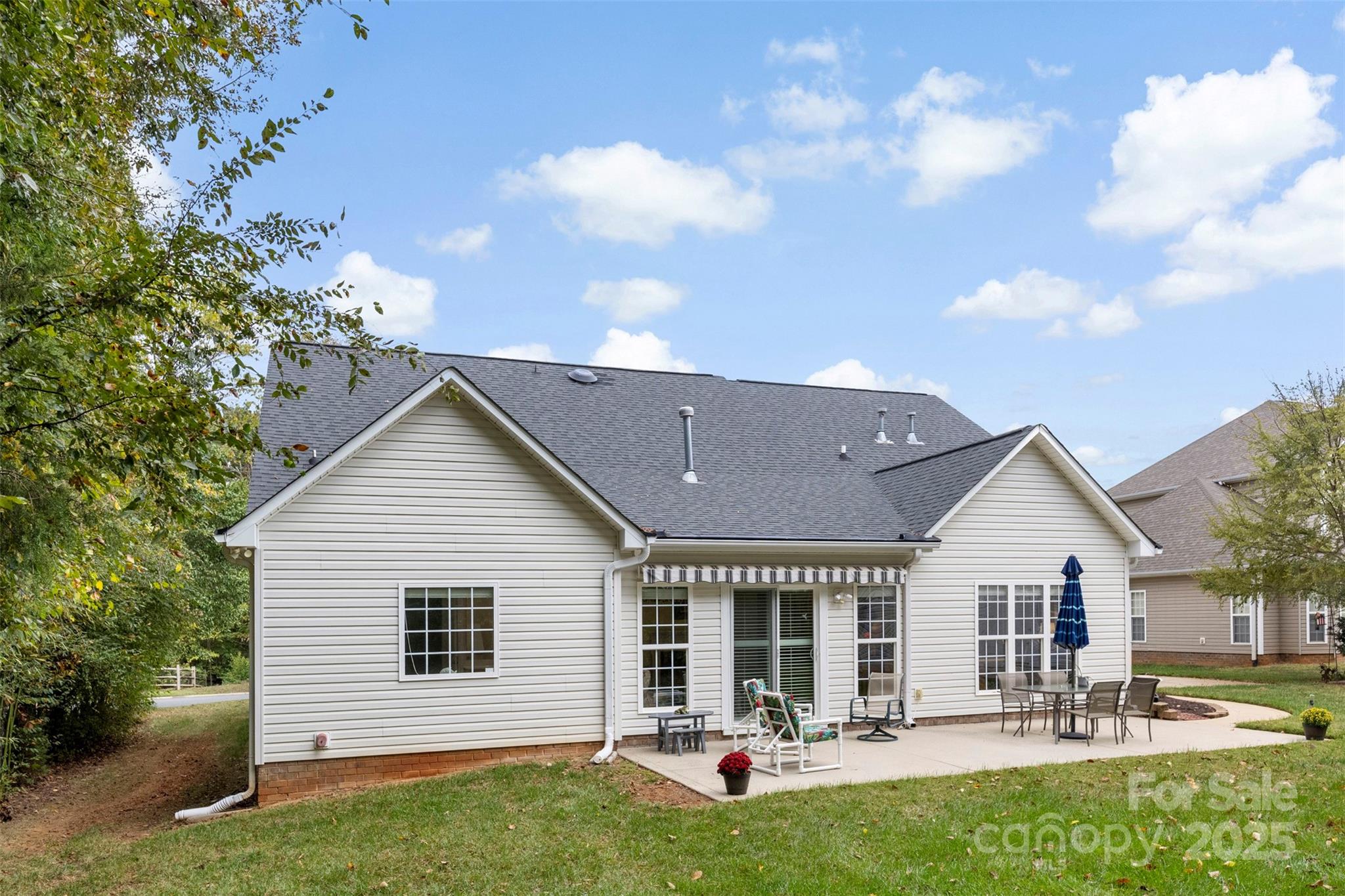 Welcome home to this charming 3-bedroom, 2-bath ranch in desirable Porters Landing! Enjoy one-level living with an open layout, a see-through gas fireplace between the living room and sunroom, and large windows that fill the space with natural light. Step outside to a spacious patio with retractable awning, perfect for relaxing or entertaining in your peaceful, private backyard. The primary suite features a beautifully updated bath, and the home has been freshly painted throughout. A storage shed is included with the sale, offering extra space for tools or hobbies. This home combines comfort, convenience, and community, complete with a neighborhood pool, clubhouse, playground, and walking trails.