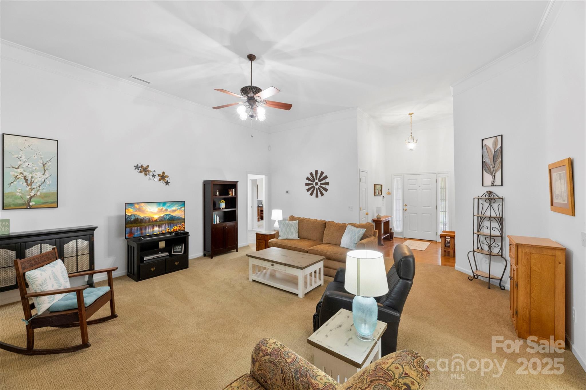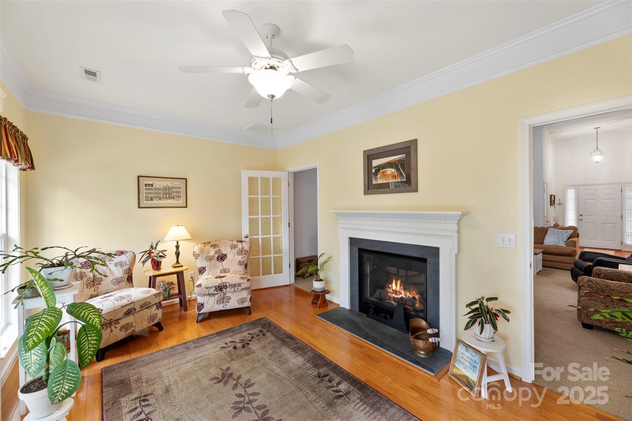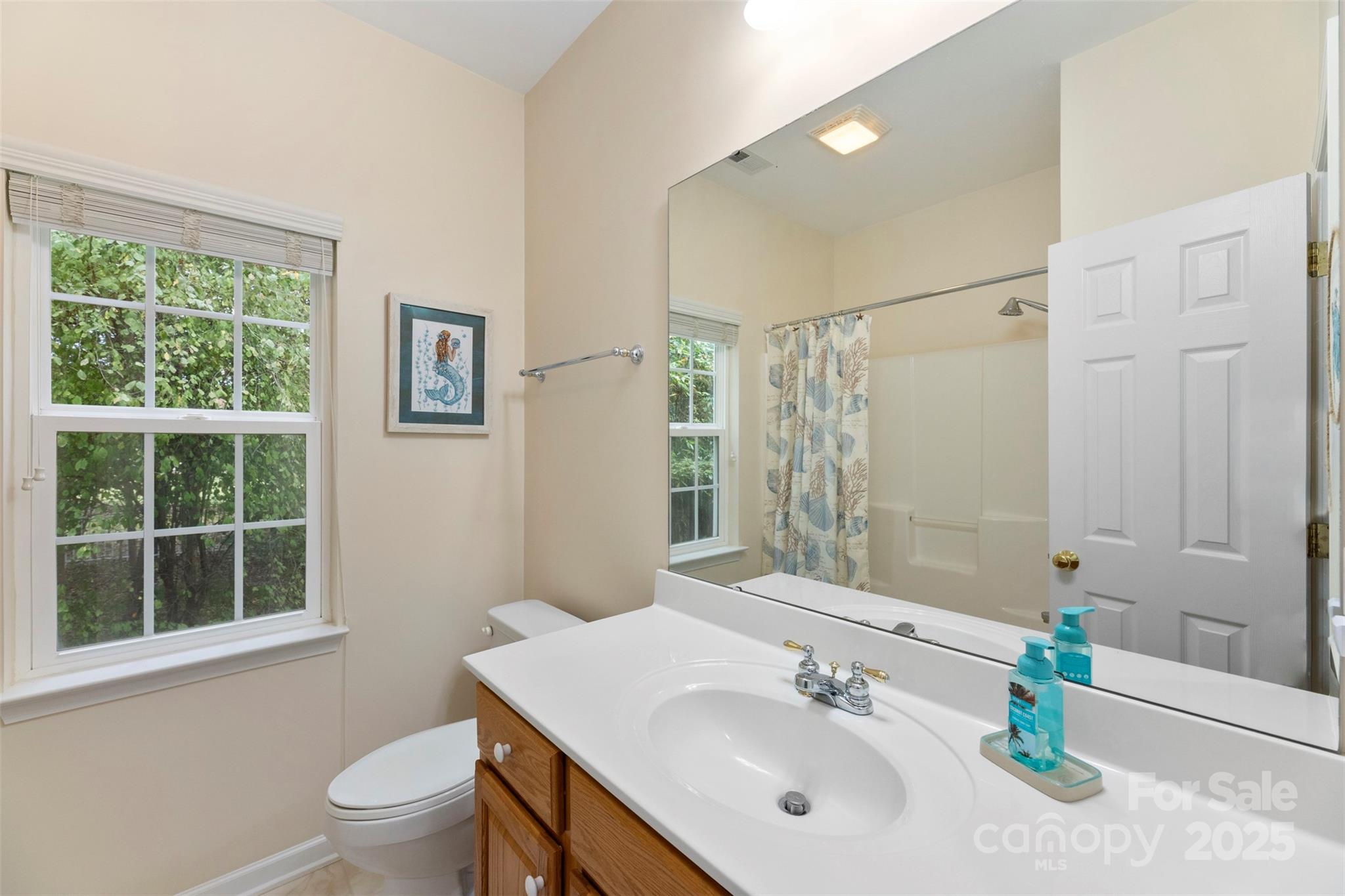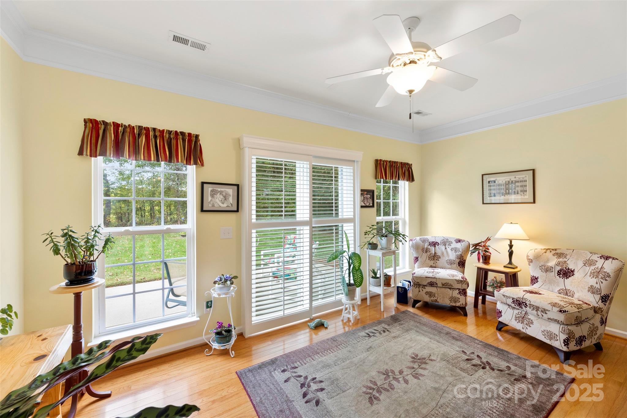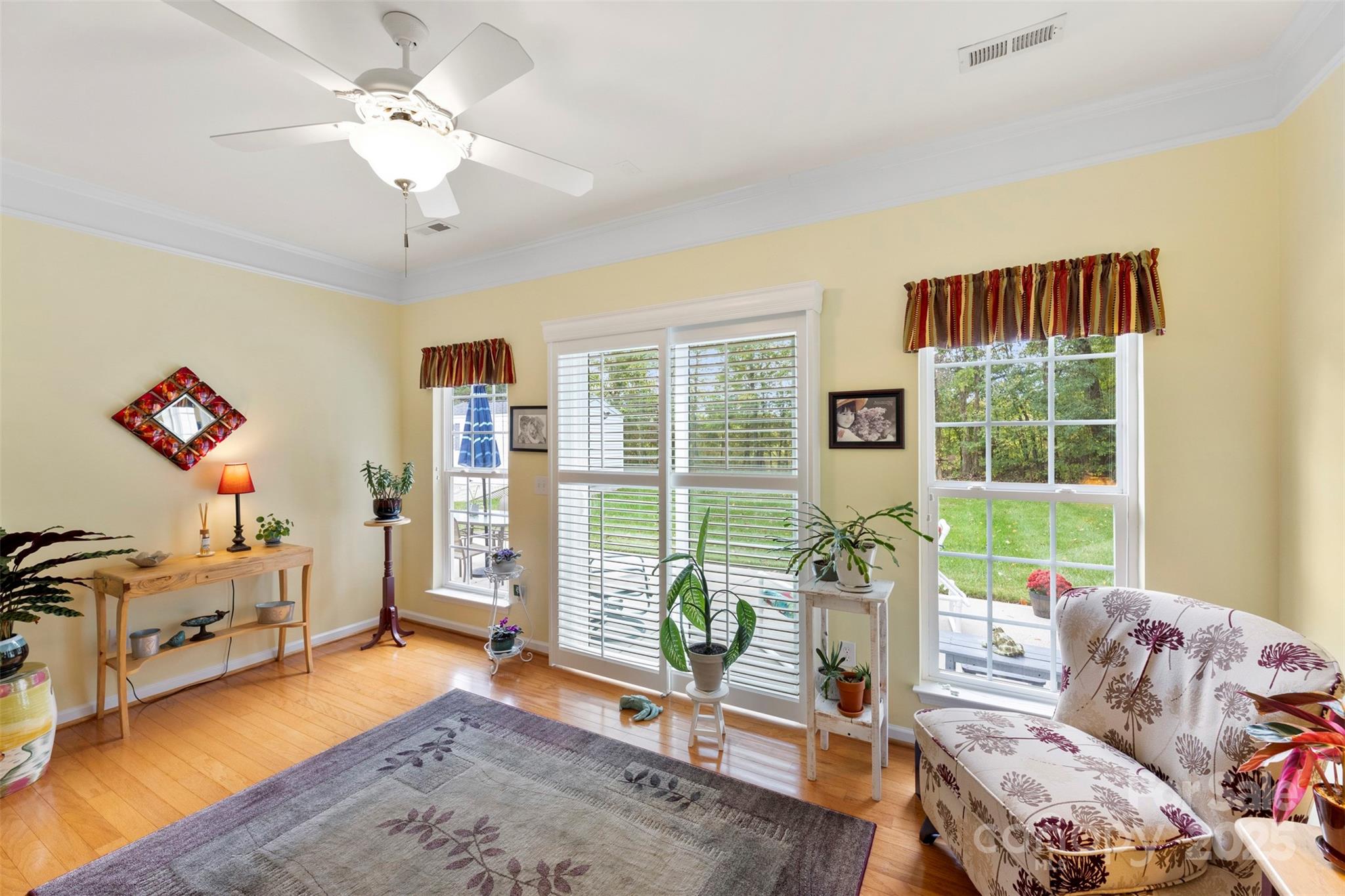 Welcome home to this charming 3-bedroom, 2-bath ranch in desirable Porters Landing! Enjoy one-level living with an open layout, a see-through gas fireplace between the living room and sunroom, and large windows that fill the space with natural light. Step outside to a spacious patio with retractable awning, perfect for relaxing or entertaining in your peaceful, private backyard. The primary suite features a beautifully updated bath, and the home has been freshly painted throughout. A storage shed is included with the sale, offering extra space for tools or hobbies. This home combines comfort, convenience, and community, complete with a neighborhood pool, clubhouse, playground, and walking trails.