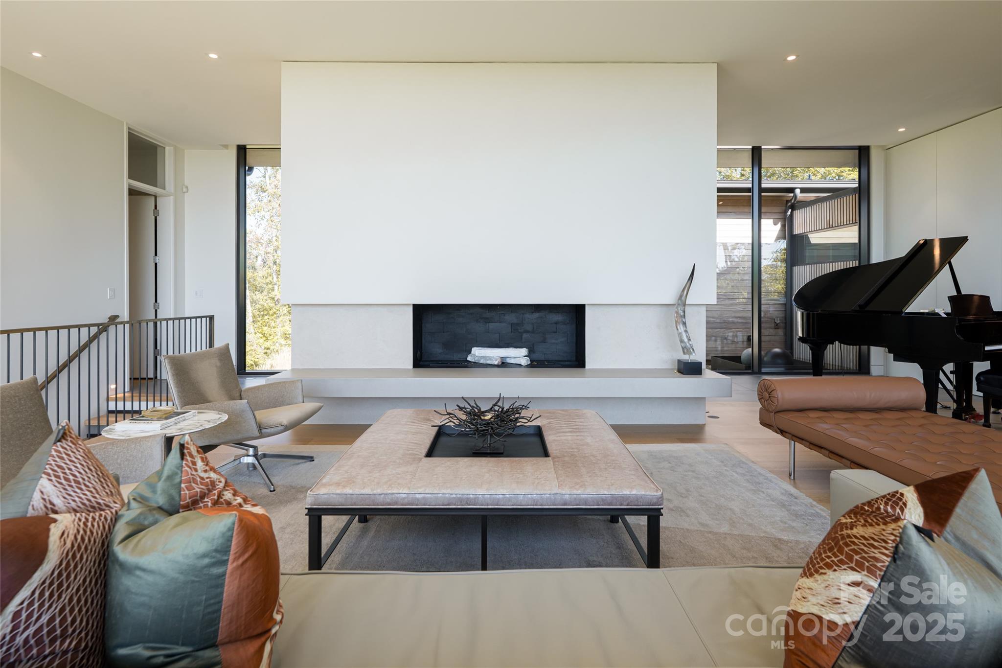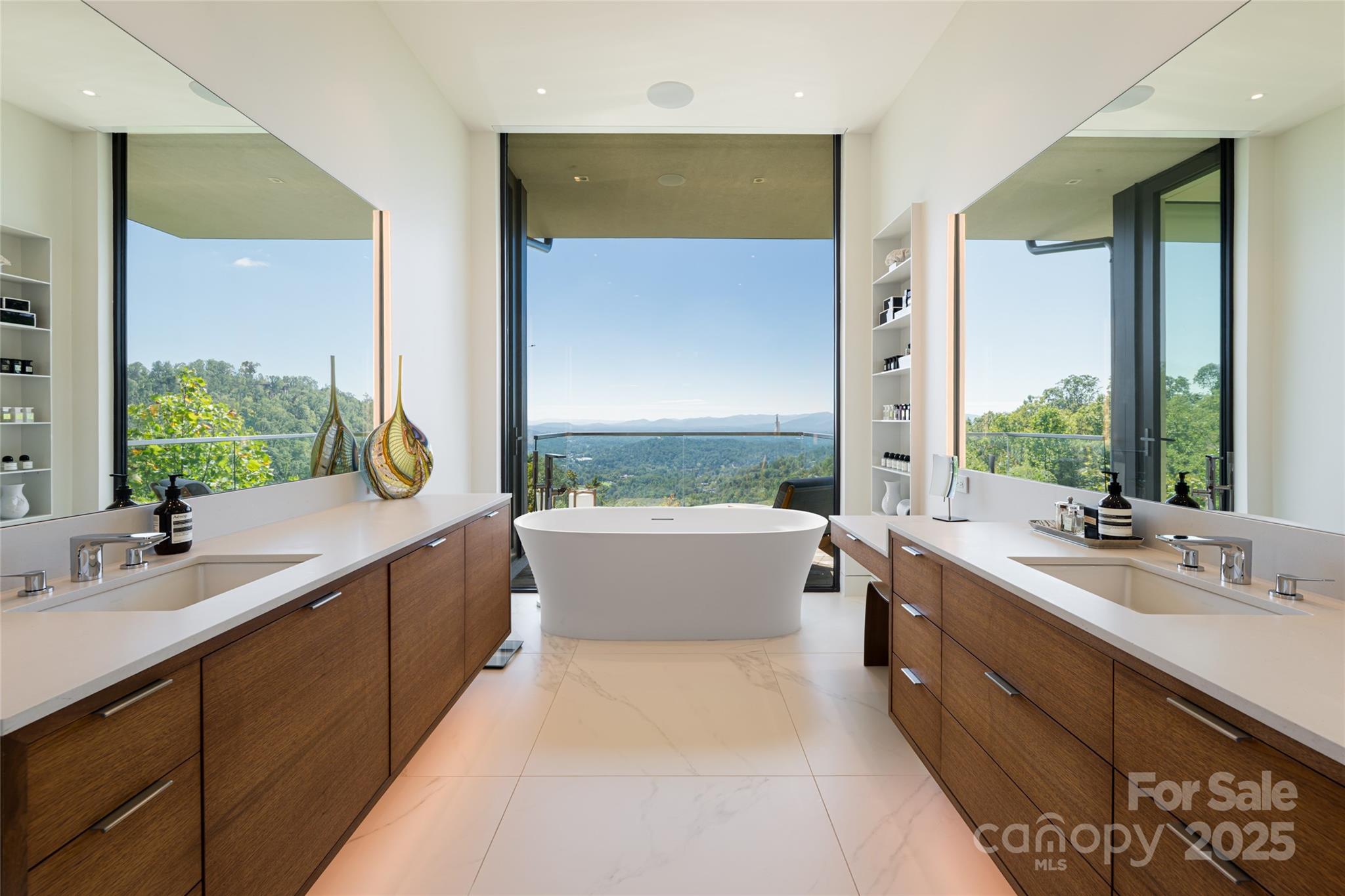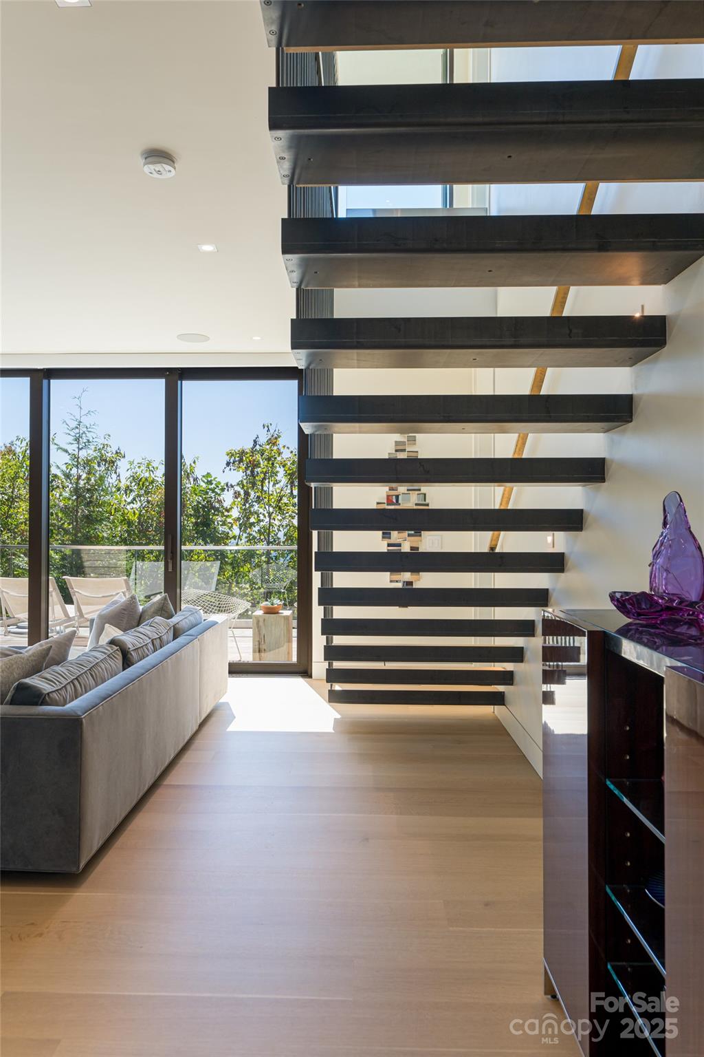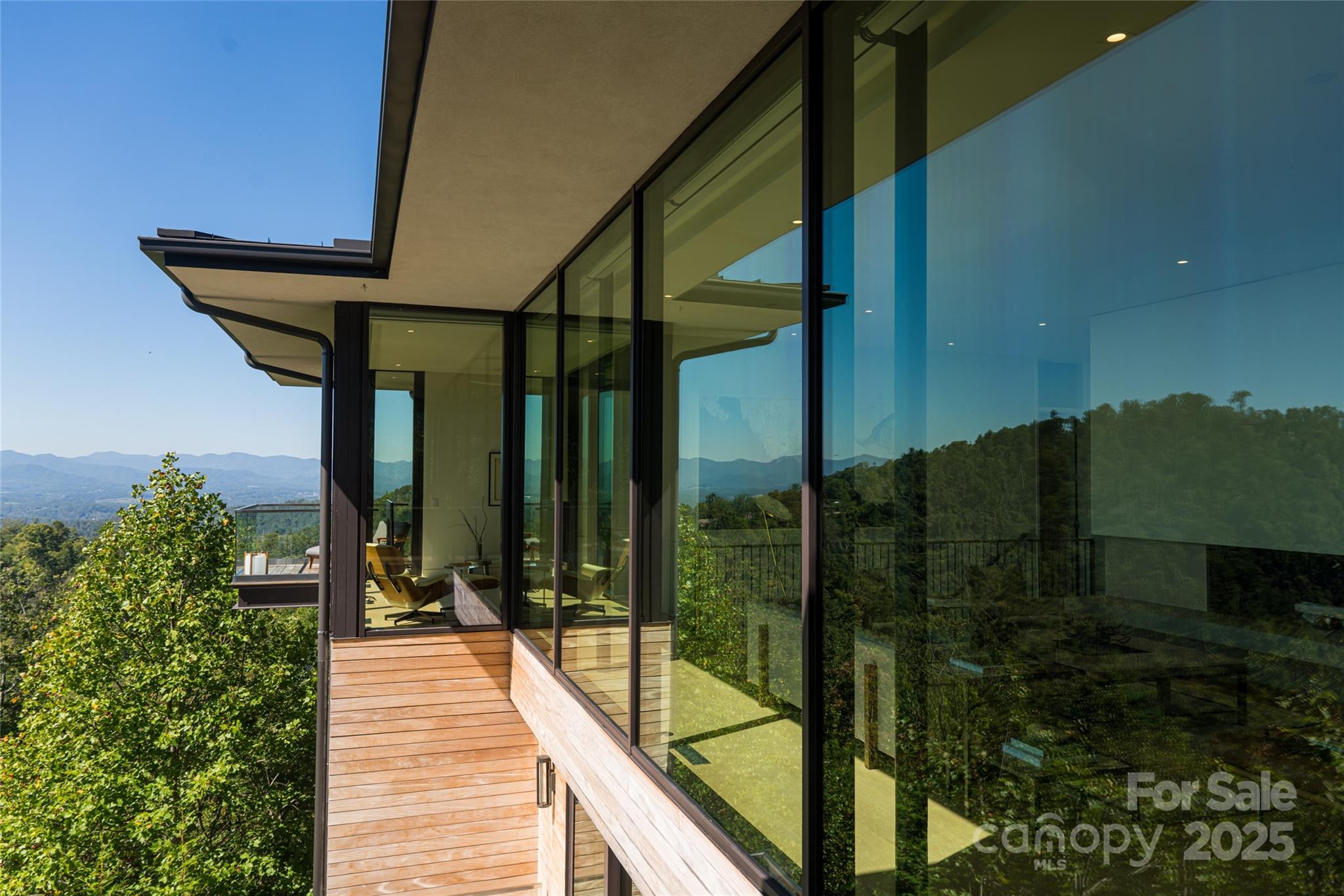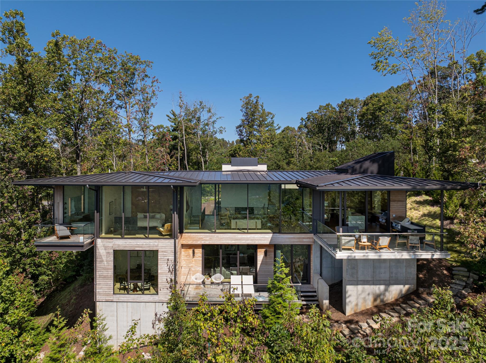 Perched along a dramatic ridge north of Asheville, this breathtaking modern residence captures the essence of mountain serenity and architectural brilliance. As clouds drift past and the sun sets behind the Blue Ridge Mountains, floor-to-ceiling glass reveals an ever-changing panorama of sky, weather, and the twinkling lights of downtown Asheville. Designed by Scott Huebner of Harding Huebner Architects, the home stands as a refined union of strength, transparency, and timeless design. Conceived around the architectural principle of a single sweeping roof and floor plane suspending an all-glass core, the residence appears to hover effortlessly above its rugged terrain. Steel and concrete provide both structural integrity and visual balance, anchoring the home to the mountain while heightening the illusion of weightlessness. Set on a compact half-acre lot, the 3,330-square-foot design achieves a remarkable sense of openness through intelligent orientation and masterful engineering. A cantilevered terrace extends over the sloping landscape, offering panoramic views of layered mountain ridges and downtown Asheville. The exterior’s natural wood siding is left unstained to weather gracefully into a silvery gray, harmonizing with locally quarried stone and sand drawn from nearby waterways—materials chosen to create a seamless connection between architecture and landscape. Inside, the design continues its dialogue with nature. Expansive windows flood the interiors with light, while eleven-foot ceilings enhance the sense of volume and air. Custom walnut cabinetry, crafted from a single tree for visual continuity, showcases an artisan level of precision. Polished marble surfaces bring timeless elegance to the kitchen and baths, complemented by a fireplace surround of lime plaster and stone. Blonde oak floors and neutral-toned finishes infuse the home with understated sophistication, balancing warmth and modern minimalism. Recipient of multiple design honors—including the AIA Asheville Honor Award and national recognition from the Best in American Living Awards—this residence exemplifies architectural excellence and craftsmanship of the highest order. Every line, material, and proportion has been thoughtfully considered to harmonize modern design with the beauty of its natural surroundings. Evenings unfold on the expansive terrace, where the horizon glows and the lights of Asheville shimmer in the valley below. The residence represents an evolution of the mountain home—where contemporary architecture meets the elemental rhythms of sky, stone, and light.
