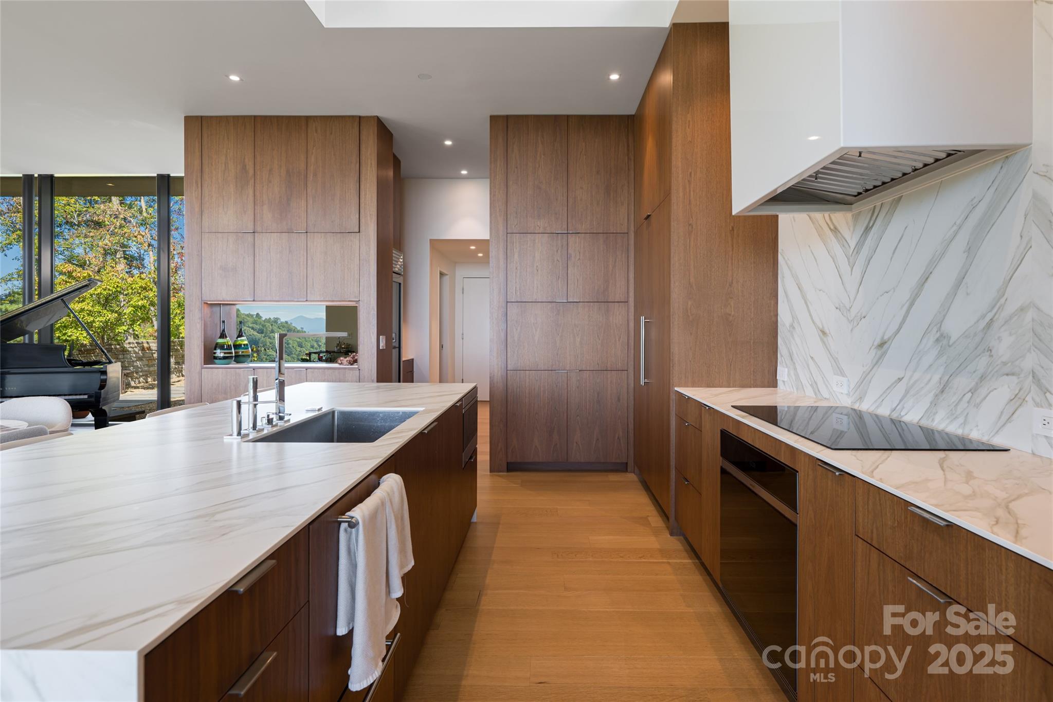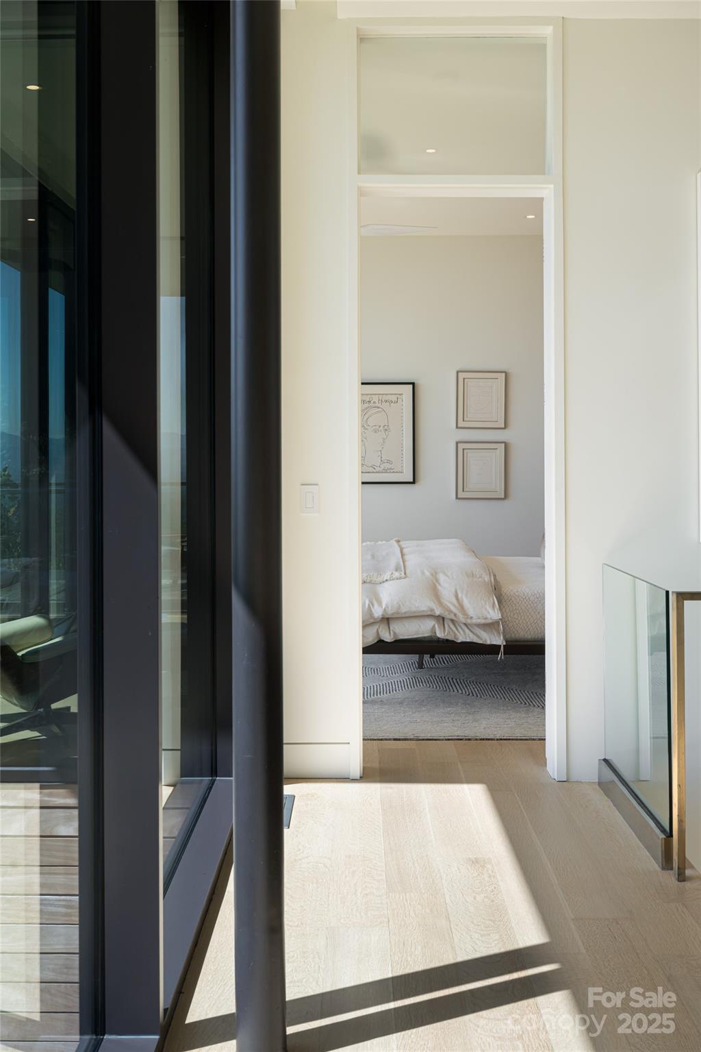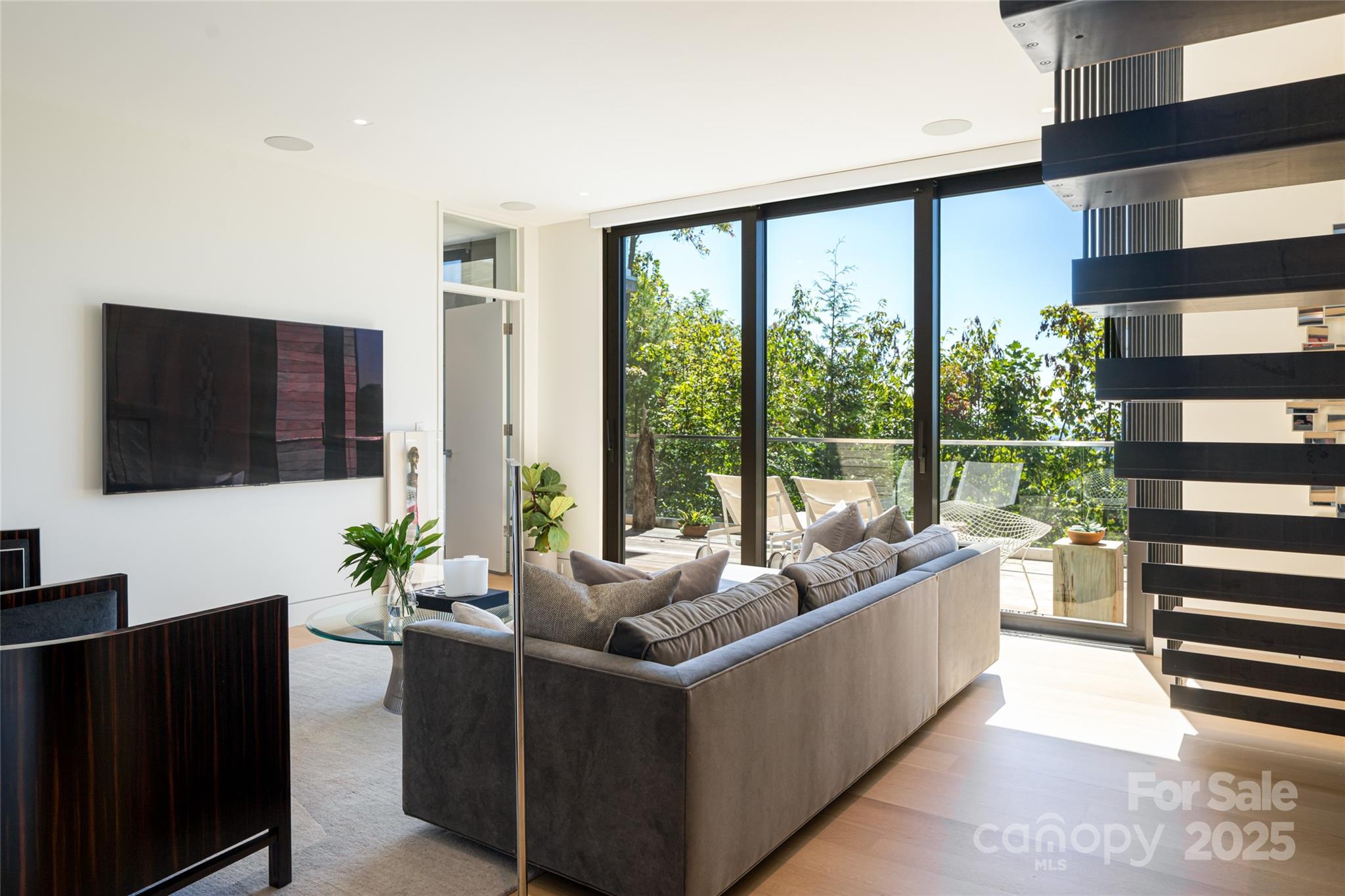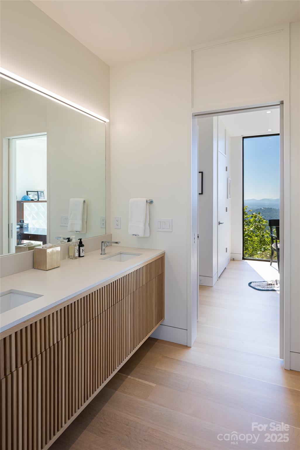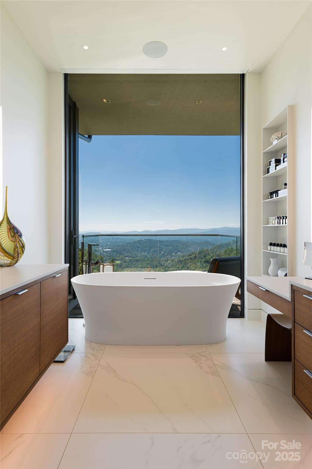 Perched along a dramatic ridge north of Asheville, this breathtaking modern residence captures the essence of mountain serenity and architectural brilliance. As clouds drift past and the sun sets behind the Blue Ridge Mountains, floor-to-ceiling glass reveals an ever-changing panorama of sky, weather, and the twinkling lights of downtown Asheville. Designed by Scott Huebner of Harding Huebner Architects, the home stands as a refined union of strength, transparency, and timeless design. Conceived around the architectural principle of a single sweeping roof and floor plane suspending an all-glass core, the residence appears to hover effortlessly above its rugged terrain. Steel and concrete provide both structural integrity and visual balance, anchoring the home to the mountain while heightening the illusion of weightlessness. Set on a compact half-acre lot, the 3,330-square-foot design achieves a remarkable sense of openness through intelligent orientation and masterful engineering. A cantilevered terrace extends over the sloping landscape, offering panoramic views of layered mountain ridges and downtown Asheville. The exterior’s natural wood siding is left unstained to weather gracefully into a silvery gray, harmonizing with locally quarried stone and sand drawn from nearby waterways—materials chosen to create a seamless connection between architecture and landscape. Inside, the design continues its dialogue with nature. Expansive windows flood the interiors with light, while eleven-foot ceilings enhance the sense of volume and air. Custom walnut cabinetry, crafted from a single tree for visual continuity, showcases an artisan level of precision. Polished marble surfaces bring timeless elegance to the kitchen and baths, complemented by a fireplace surround of lime plaster and stone. Blonde oak floors and neutral-toned finishes infuse the home with understated sophistication, balancing warmth and modern minimalism. Recipient of multiple design honors—including the AIA Asheville Honor Award and national recognition from the Best in American Living Awards—this residence exemplifies architectural excellence and craftsmanship of the highest order. Every line, material, and proportion has been thoughtfully considered to harmonize modern design with the beauty of its natural surroundings. Evenings unfold on the expansive terrace, where the horizon glows and the lights of Asheville shimmer in the valley below. The residence represents an evolution of the mountain home—where contemporary architecture meets the elemental rhythms of sky, stone, and light.