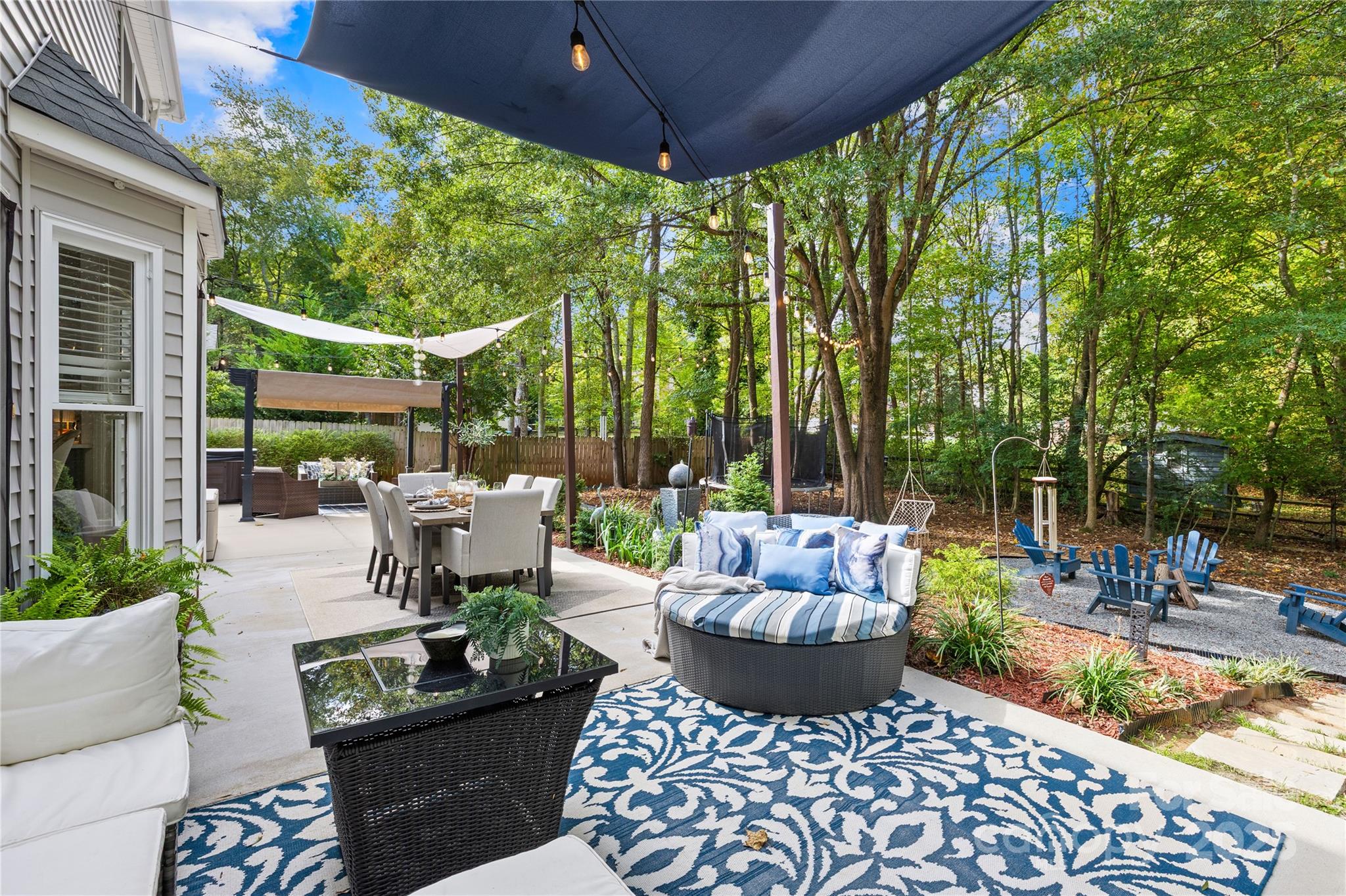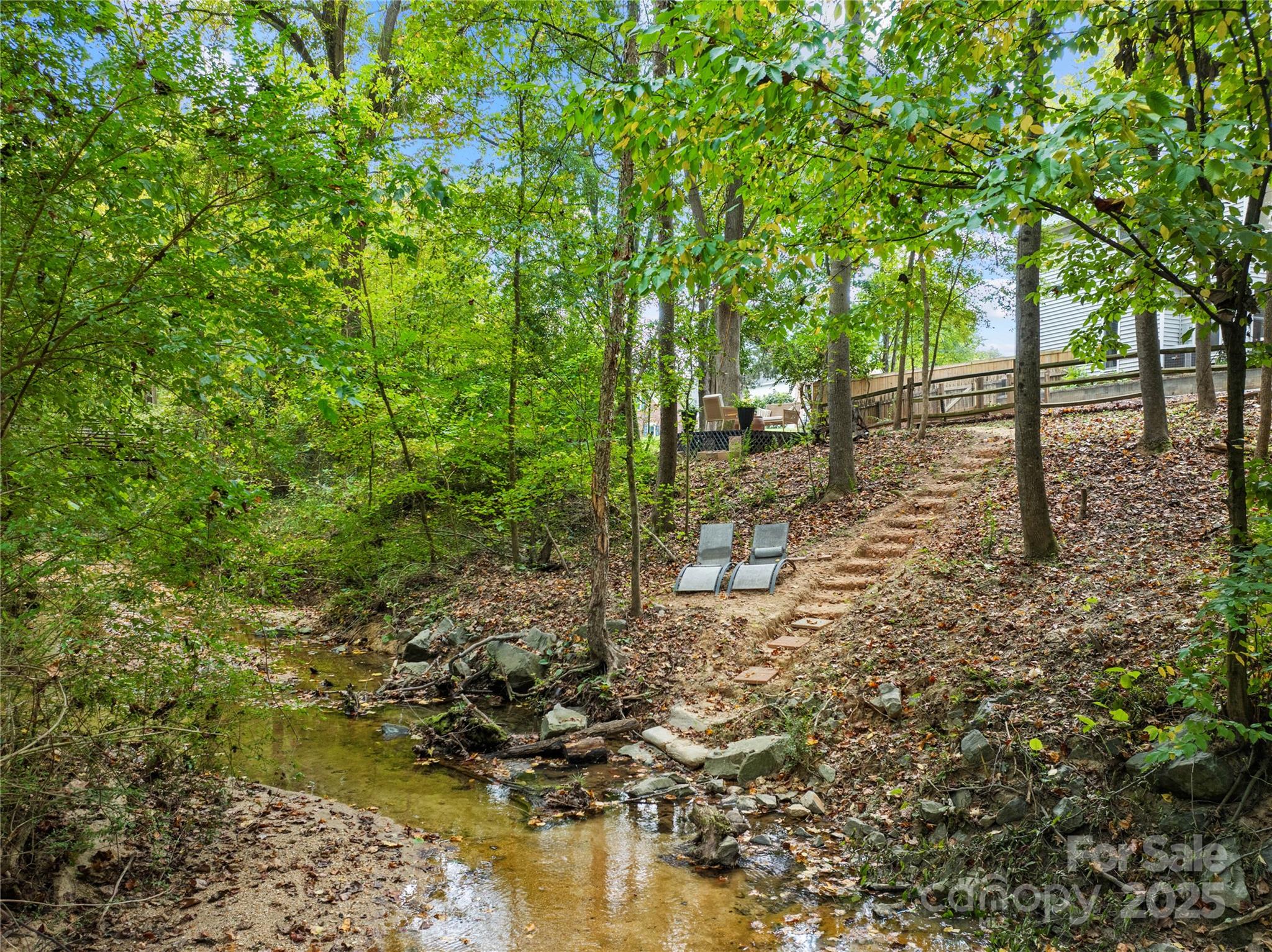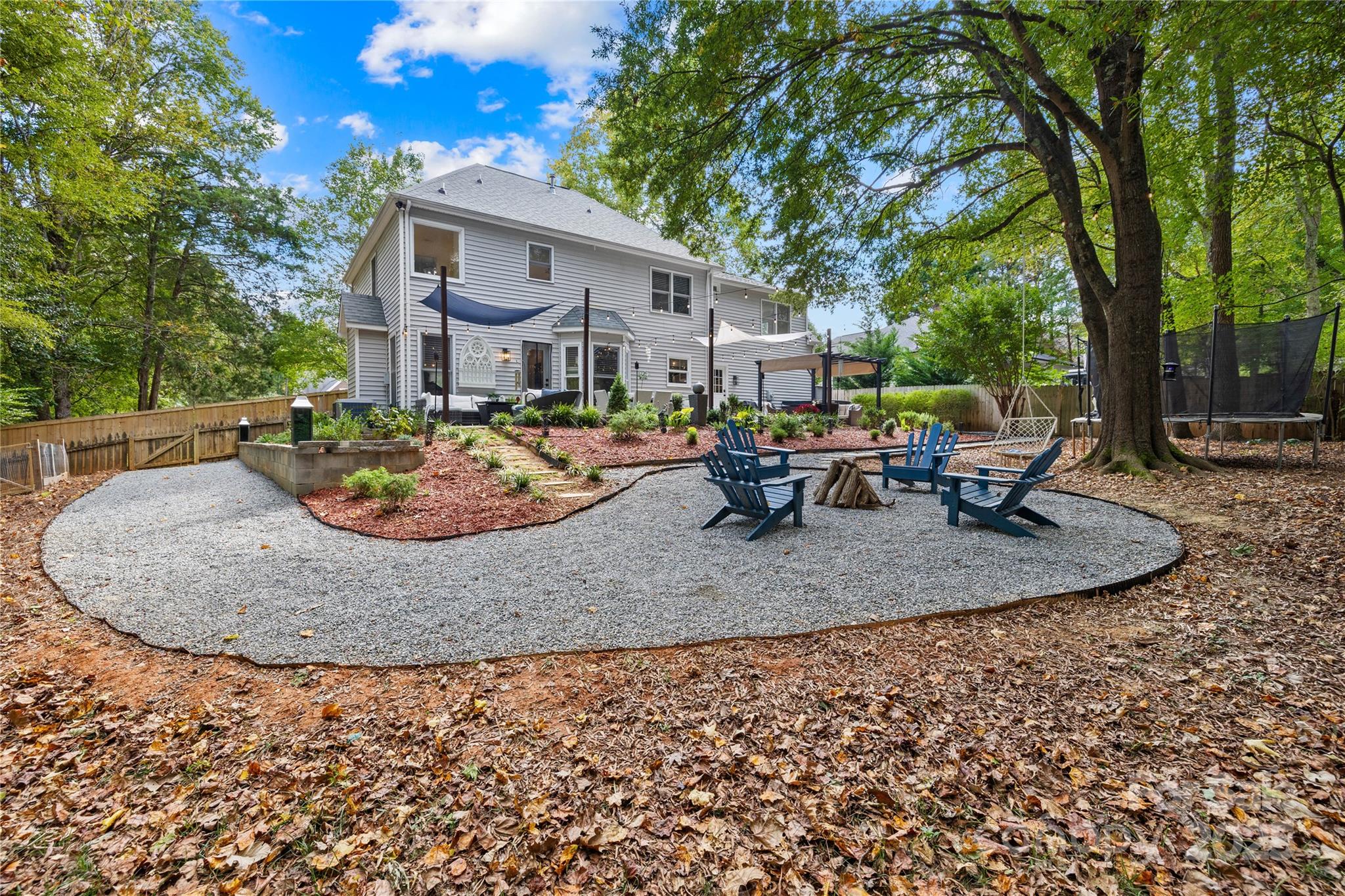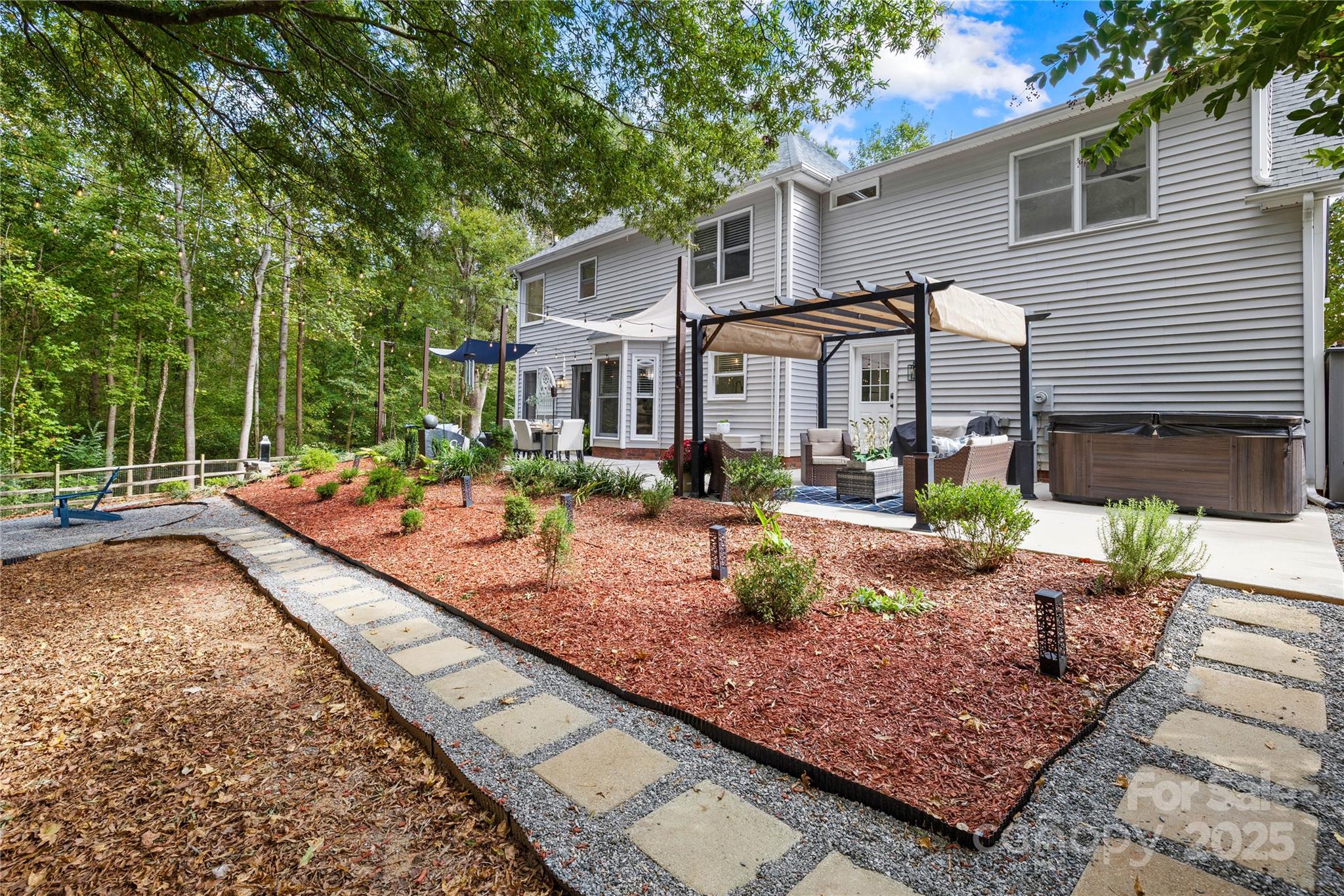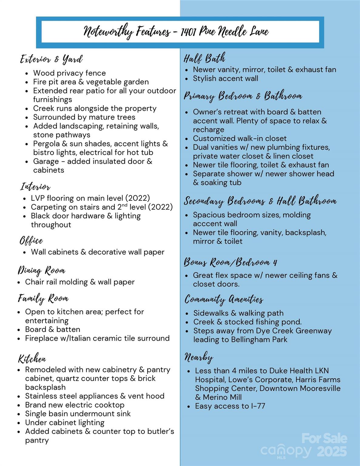 Welcome to your own private retreat in Franklin Grove! Nestled on a quiet cul-de-sac street in a picturesque community with a pond for fishing and steps from Dye Creek Greenway to Bellingham Park, this beautifully updated home offers the perfect blend of serenity, outdoor living, and modern design. The over 1/3 acre homesite is a nature lover’s dream—surrounded by mature trees and a peaceful creek that flows alongside the property. Follow the charming blue stone path to the water’s edge, unwind by the fire pit, or relax under the pergola and canopies while listening to the sounds of the creek. Entertain or dine alfresco on the extended patio accented by stone pathways, retaining walls, and bistro string lights that create an inviting evening glow. A wooden privacy fenced backyard, vegetable garden, and lush landscaping complete this tranquil outdoor escape. Inside, the home is equally impressive with thoughtful updates throughout. LVP flooring, designer light fixtures, and sleek black door hardware create a modern, cohesive look. A new back door and updated blinds on most windows complete the home’s refreshed aesthetic. In the family room, a gas fireplace with Italian ceramic tile surround serves as a striking focal point, while the living room/office showcases built-in cabinetry. The dining room features elegant chair rail and decorative wallpaper, adding warmth and sophistication to the space. A fully renovated kitchen steals the show with quartz countertops, a brick backsplash, new cabinetry and pantry cabinet, electric cooktop with vent hood, double wall ovens, under-cabinet lighting, and a walk-in butler’s pantry. Completing the main level, the half bath impresses with a new vanity, mirror, lighting, and accent wall. Upstairs, the primary suite feels like a sanctuary with a dramatic tray ceiling, custom board & batten feature wall, and a large walk-in closet with custom shelving and designer wallpaper. The primary bath offers dual vanities, a soaking tub with views of the wooded backyard, separate shower, and updated tile flooring, faucets, and fixtures. Secondary bedrooms are generous in size, including one with a custom accent wall and another oversized bedroom/bonus with a new closet door and ceiling fans. The hall bath was also remodeled with a new vanity, backsplash, mirror and tile flooring. Even the garage has been upgraded with an insulated door and abundant cabinetry for organized storage. The home is served by coveted Mooresville Graded Schools and offers unbeatable convenience— under 4 miles to Lowe’s Corporate, Duke Health Lake Norman Hospital, Harris Farms Shopping Center, Merino Mill and Downtown Mooresville with quick access to I-77. Every inch of this property has been enhanced with care and creativity. From the curated landscaping to the designer interiors, this home is more than move-in ready—it’s a lifestyle. Come experience the peace, charm, and character that make this property truly one of a kind.