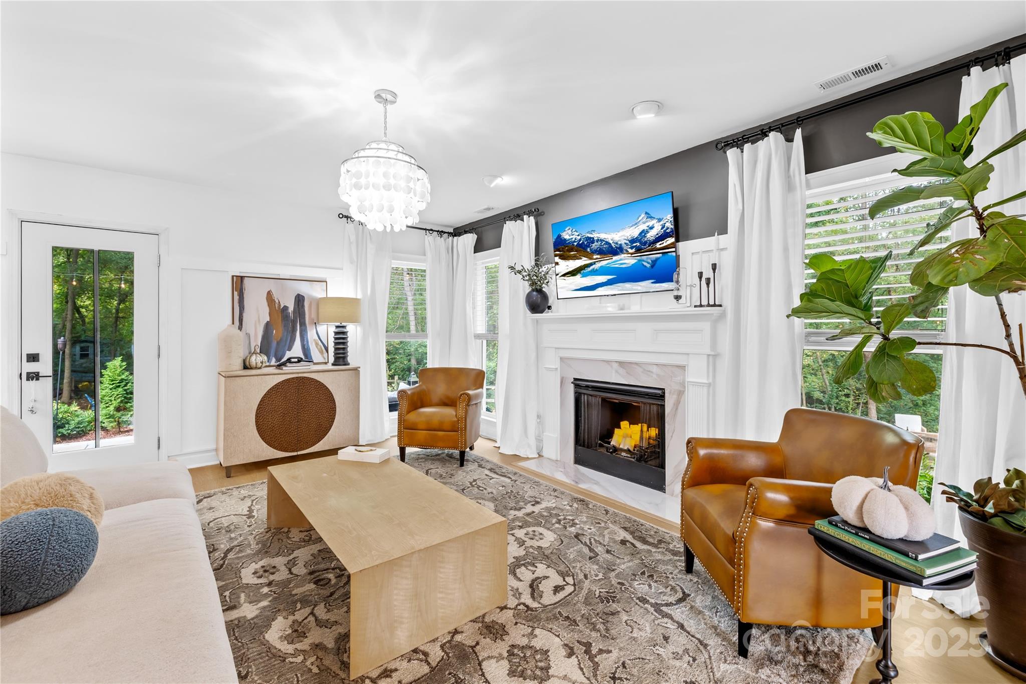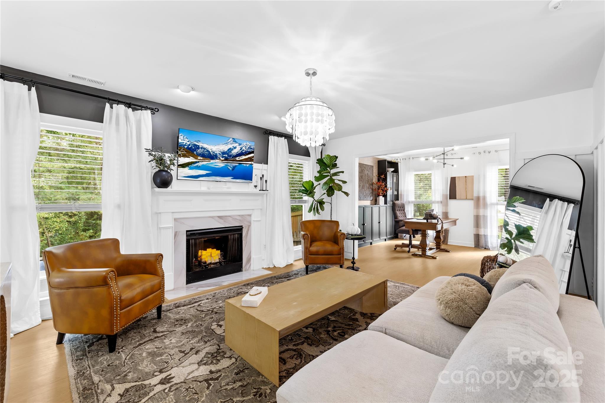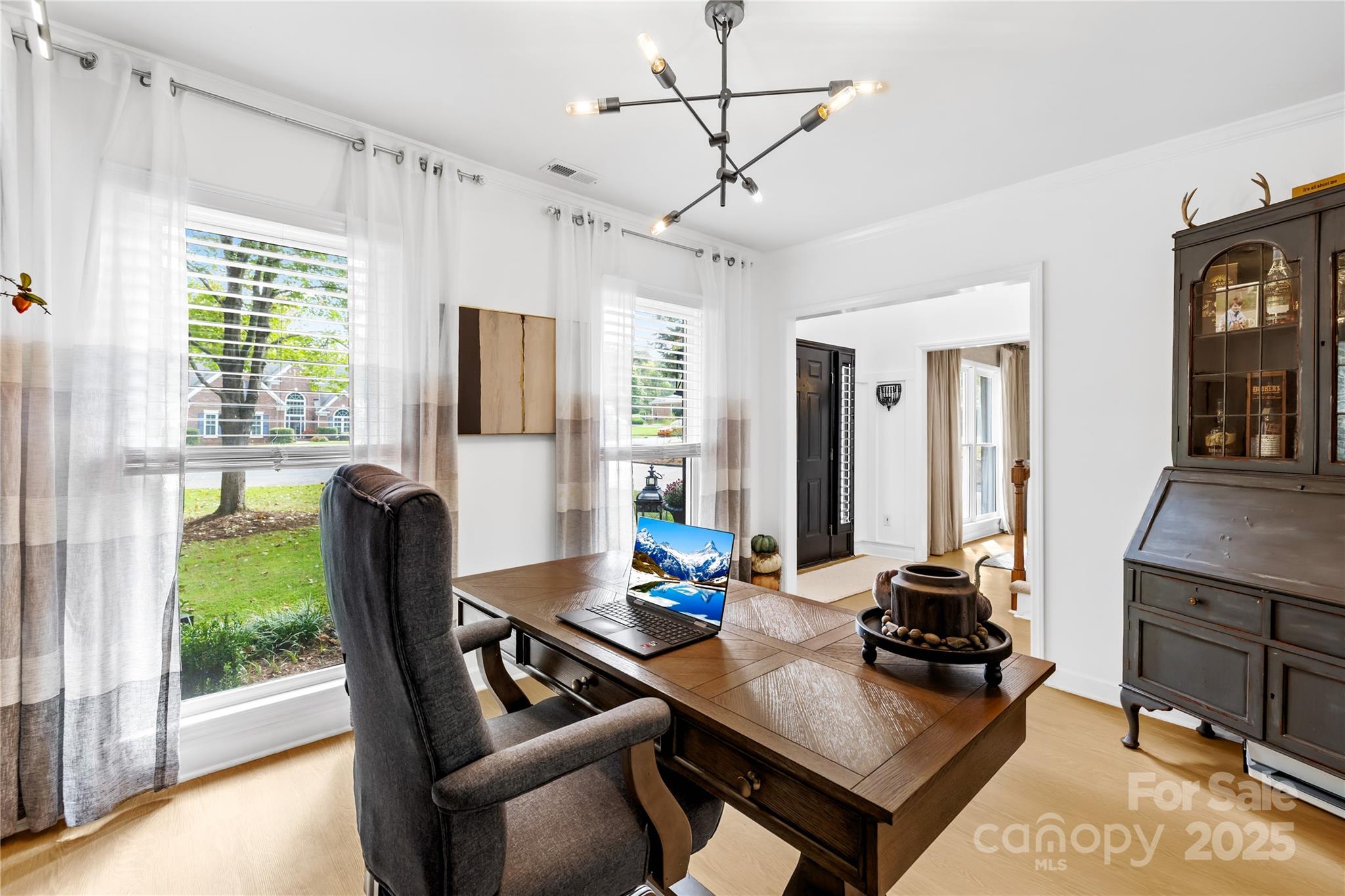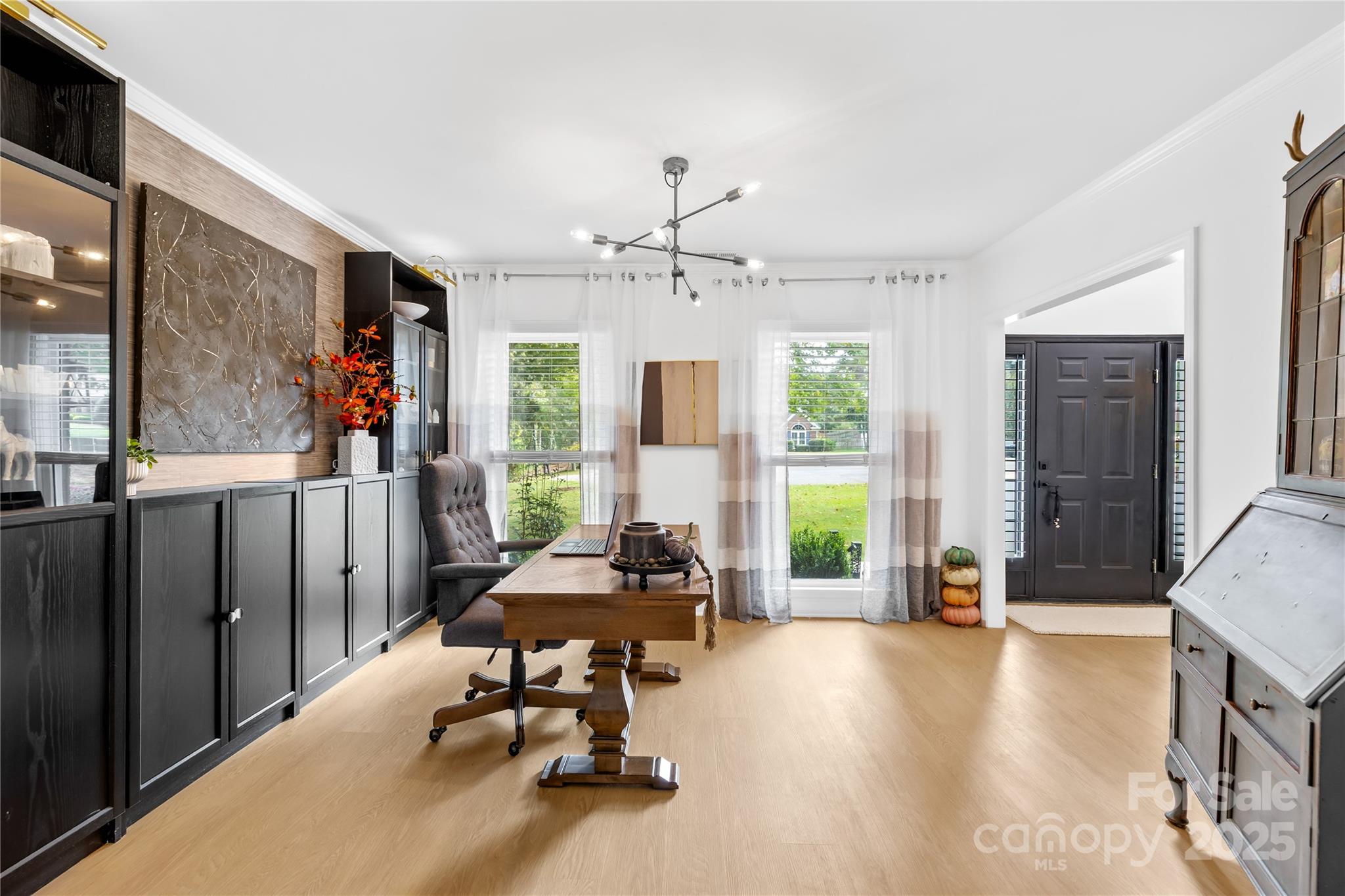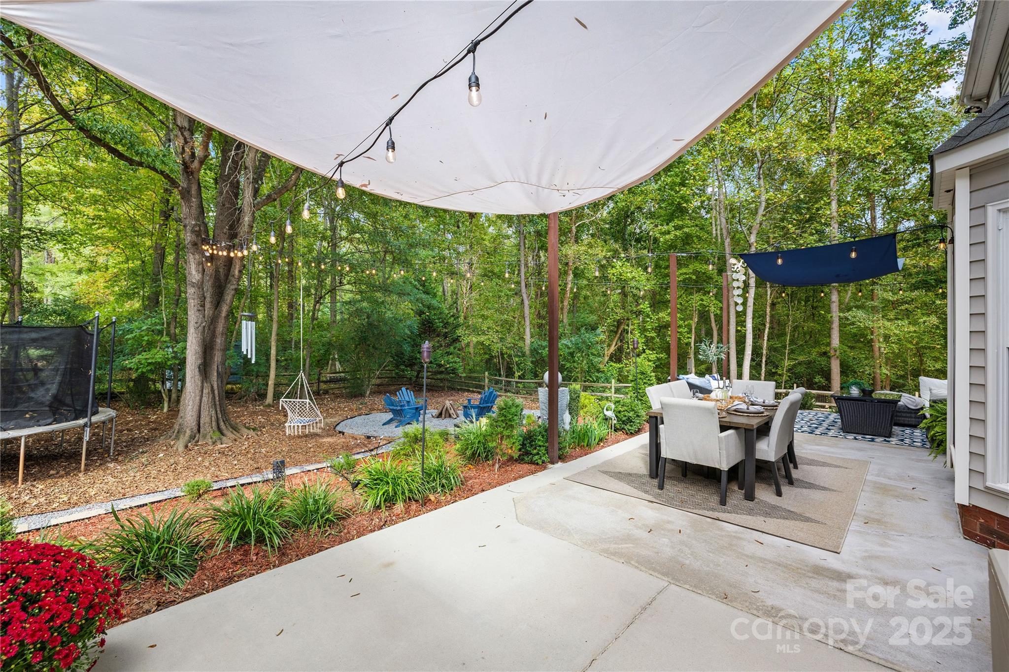 Welcome to your own private retreat in Franklin Grove! Nestled on a quiet cul-de-sac street in a picturesque community with a pond for fishing and steps from Dye Creek Greenway to Bellingham Park, this beautifully updated home offers the perfect blend of serenity, outdoor living, and modern design. The over 1/3 acre homesite is a nature lover’s dream—surrounded by mature trees and a peaceful creek that flows alongside the property. Follow the charming blue stone path to the water’s edge, unwind by the fire pit, or relax under the pergola and canopies while listening to the sounds of the creek. Entertain or dine alfresco on the extended patio accented by stone pathways, retaining walls, and bistro string lights that create an inviting evening glow. A wooden privacy fenced backyard, vegetable garden, and lush landscaping complete this tranquil outdoor escape. Inside, the home is equally impressive with thoughtful updates throughout. LVP flooring, designer light fixtures, and sleek black door hardware create a modern, cohesive look. A new back door and updated blinds on most windows complete the home’s refreshed aesthetic. In the family room, a gas fireplace with Italian ceramic tile surround serves as a striking focal point, while the living room/office showcases built-in cabinetry. The dining room features elegant chair rail and decorative wallpaper, adding warmth and sophistication to the space. A fully renovated kitchen steals the show with quartz countertops, a brick backsplash, new cabinetry and pantry cabinet, electric cooktop with vent hood, double wall ovens, under-cabinet lighting, and a walk-in butler’s pantry. Completing the main level, the half bath impresses with a new vanity, mirror, lighting, and accent wall. Upstairs, the primary suite feels like a sanctuary with a dramatic tray ceiling, custom board & batten feature wall, and a large walk-in closet with custom shelving and designer wallpaper. The primary bath offers dual vanities, a soaking tub with views of the wooded backyard, separate shower, and updated tile flooring, faucets, and fixtures. Secondary bedrooms are generous in size, including one with a custom accent wall and another oversized bedroom/bonus with a new closet door and ceiling fans. The hall bath was also remodeled with a new vanity, backsplash, mirror and tile flooring. Even the garage has been upgraded with an insulated door and abundant cabinetry for organized storage. The home is served by coveted Mooresville Graded Schools and offers unbeatable convenience— under 4 miles to Lowe’s Corporate, Duke Health Lake Norman Hospital, Harris Farms Shopping Center, Merino Mill and Downtown Mooresville with quick access to I-77. Every inch of this property has been enhanced with care and creativity. From the curated landscaping to the designer interiors, this home is more than move-in ready—it’s a lifestyle. Come experience the peace, charm, and character that make this property truly one of a kind.