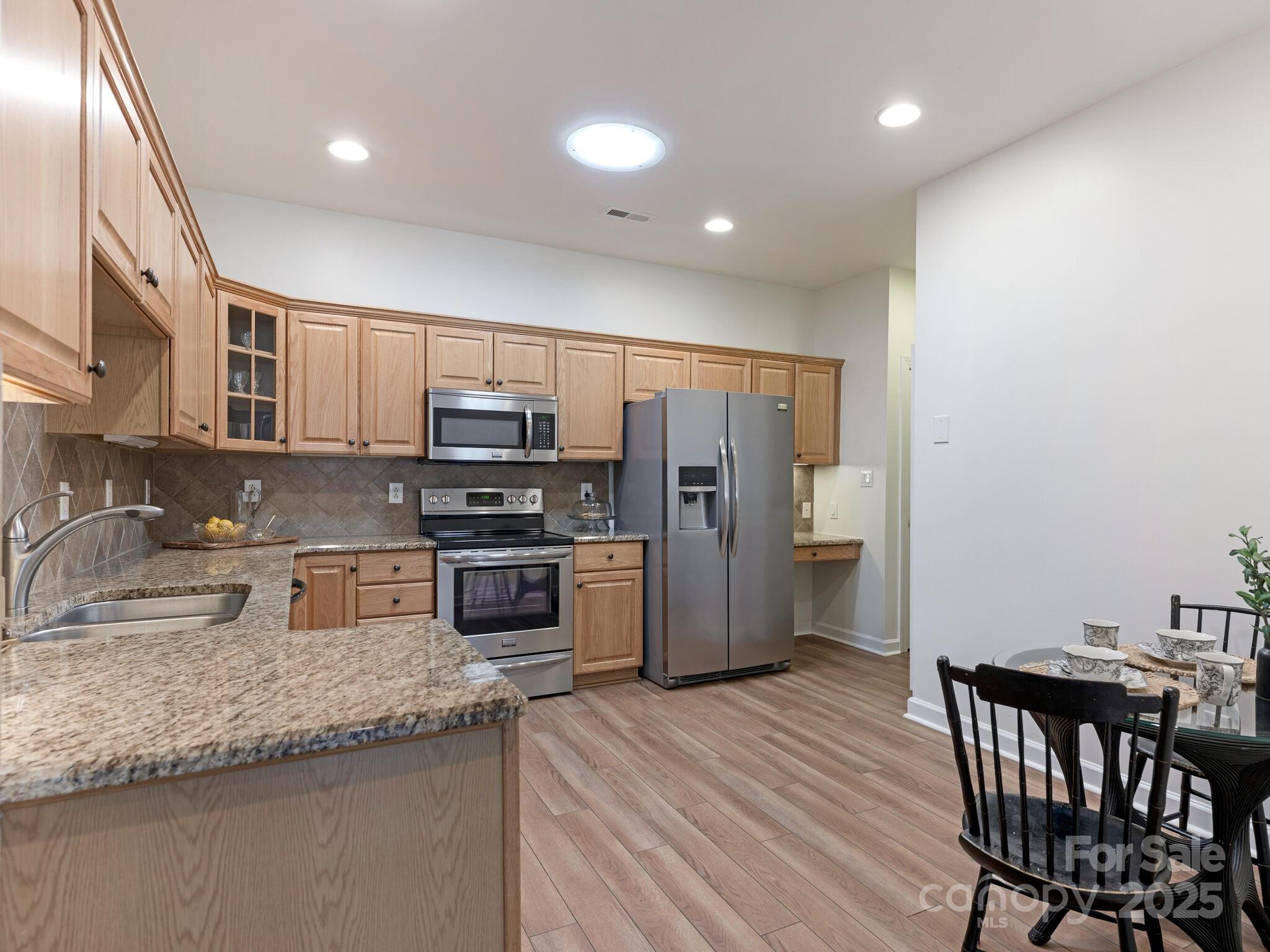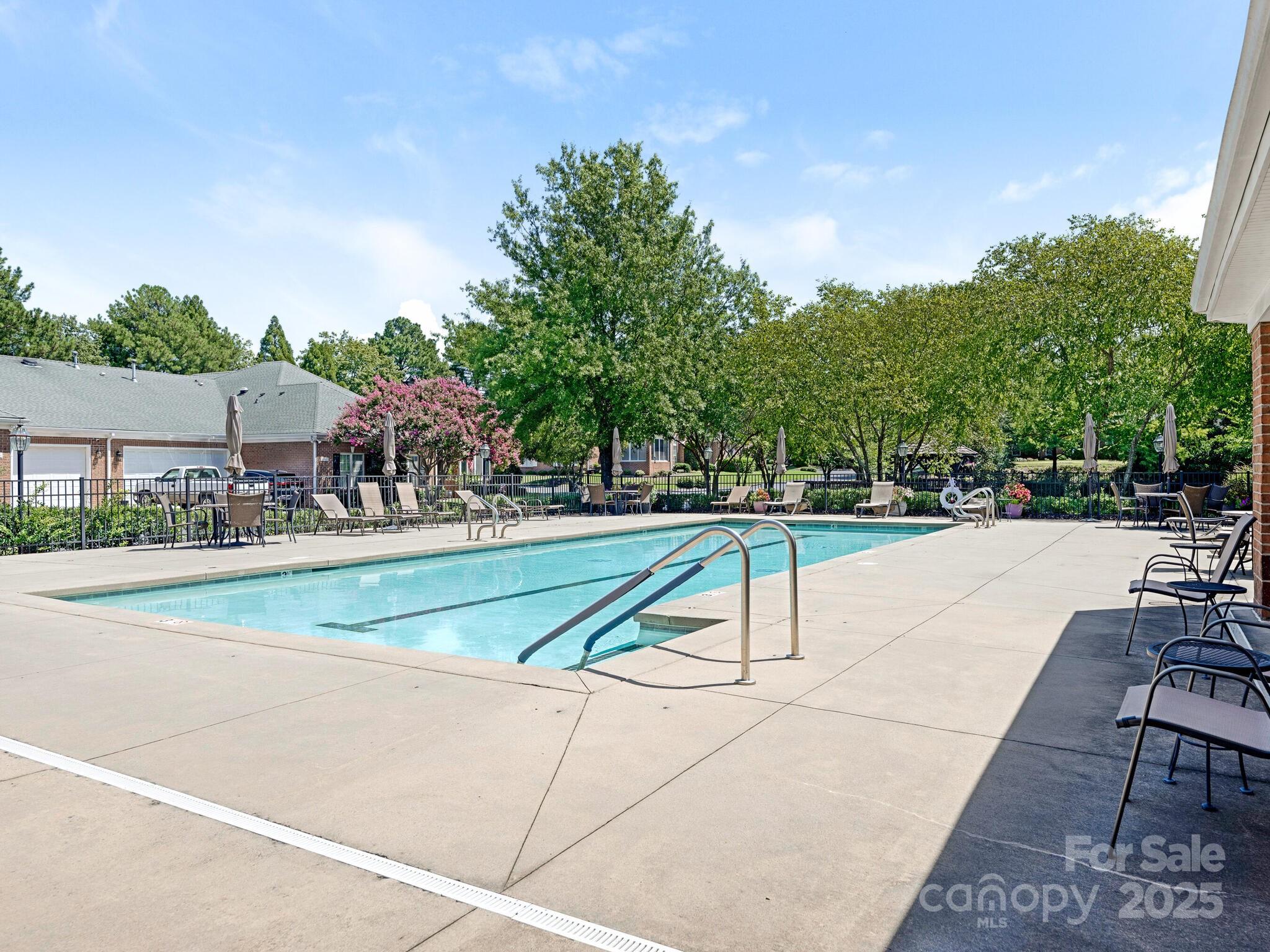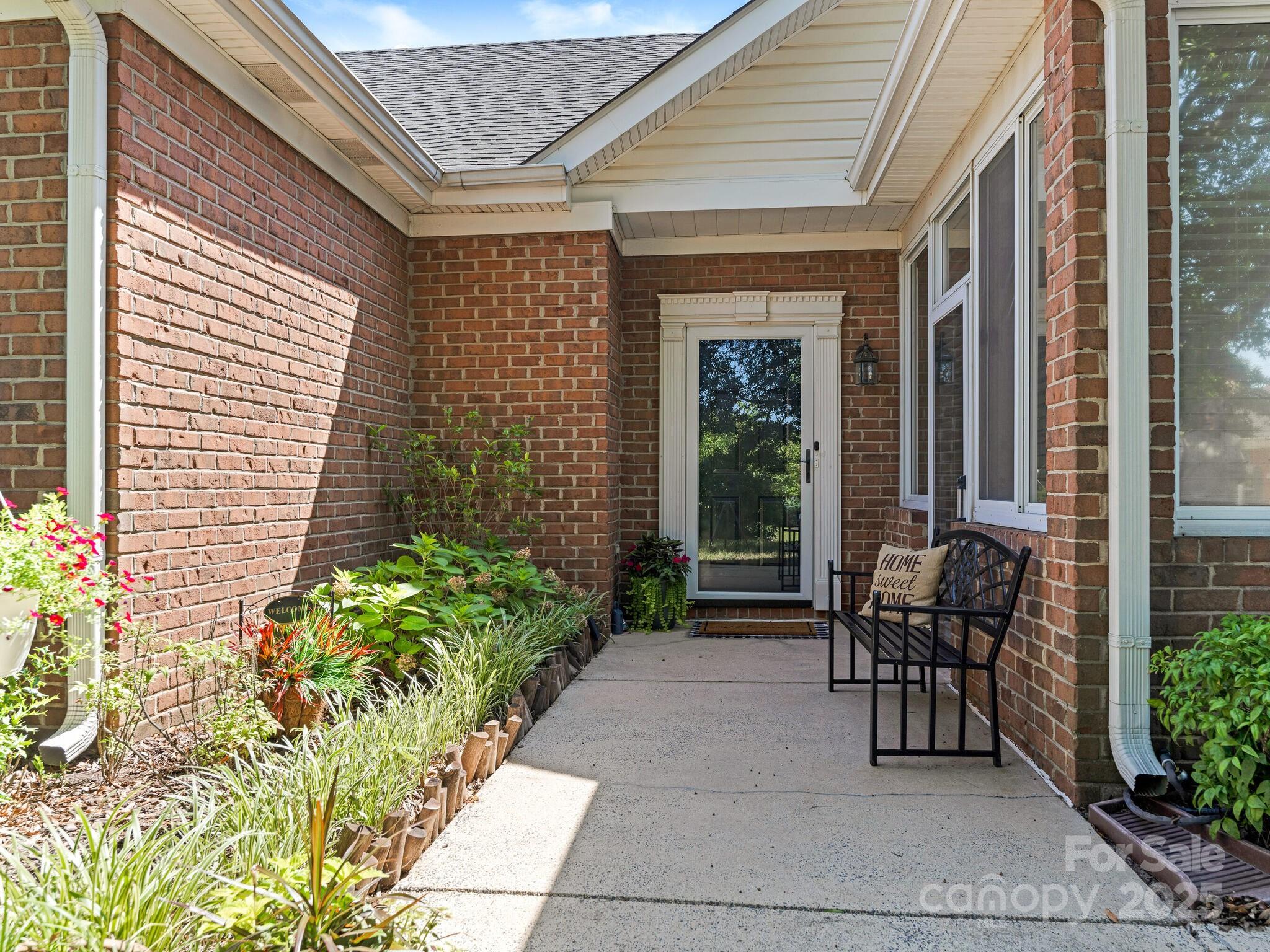 Welcome to one-level living in South Charlotte! Come on back and take a look! We are back on market and ready to sell! This beautifully maintained home in the Villages of Troon offers an open floor plan with cathedral ceilings, custom fireplace surround, and fresh paint throughout. No carpet—new luxury vinyl plank flooring throughout! The spacious kitchen features granite counters, stone backsplash, stainless appliances, recessed lighting, skylight, built-in desk, and pantry. Both bedrooms are en-suites with walk-in closets. The primary bath has dual vanities and a shower enclosure with bench; the second bath offers a soaking tub. Enjoy a sunroom with new flooring and serene pond views. Oversized 2-car garage with custom storage. HVAC and furnace (2013) with Morris-Jenkins Platinum Warranty, water heater (2011). Community includes clubhouse and pool. HOA covers exterior termite, water, base internet. Ideally located near Stonecrest, Blakeney, and Ballantyne! We are back on market-NO FAULT of buyers or sellers. Just didn't work out. No inspections were performed, no financing was initiated.