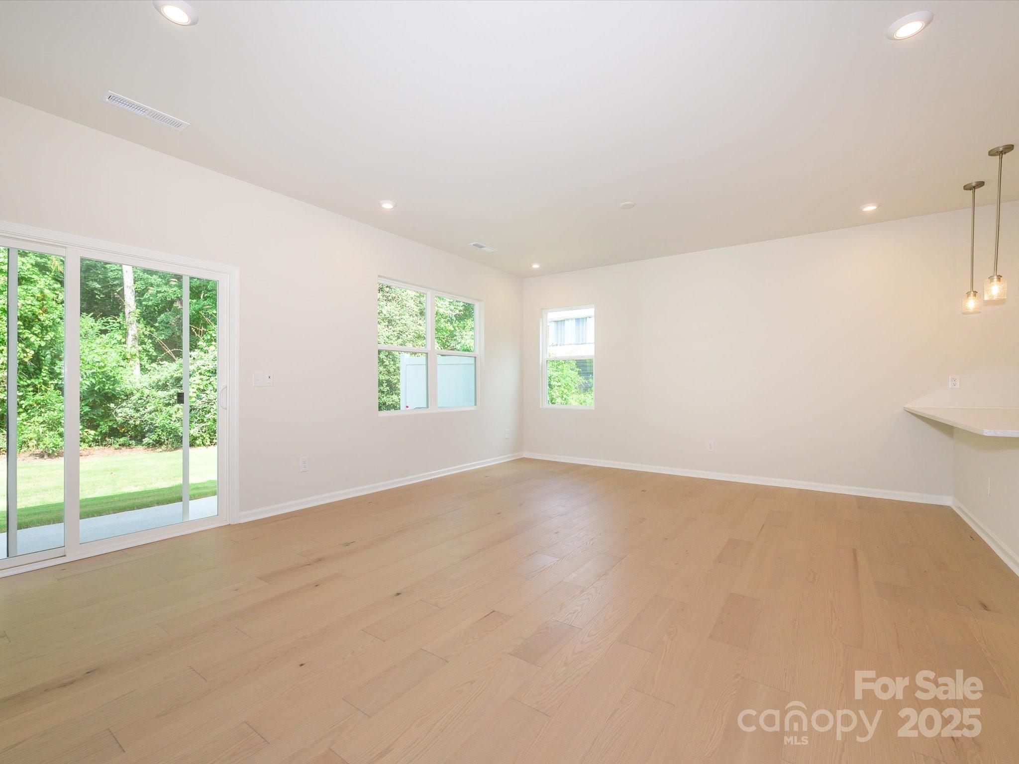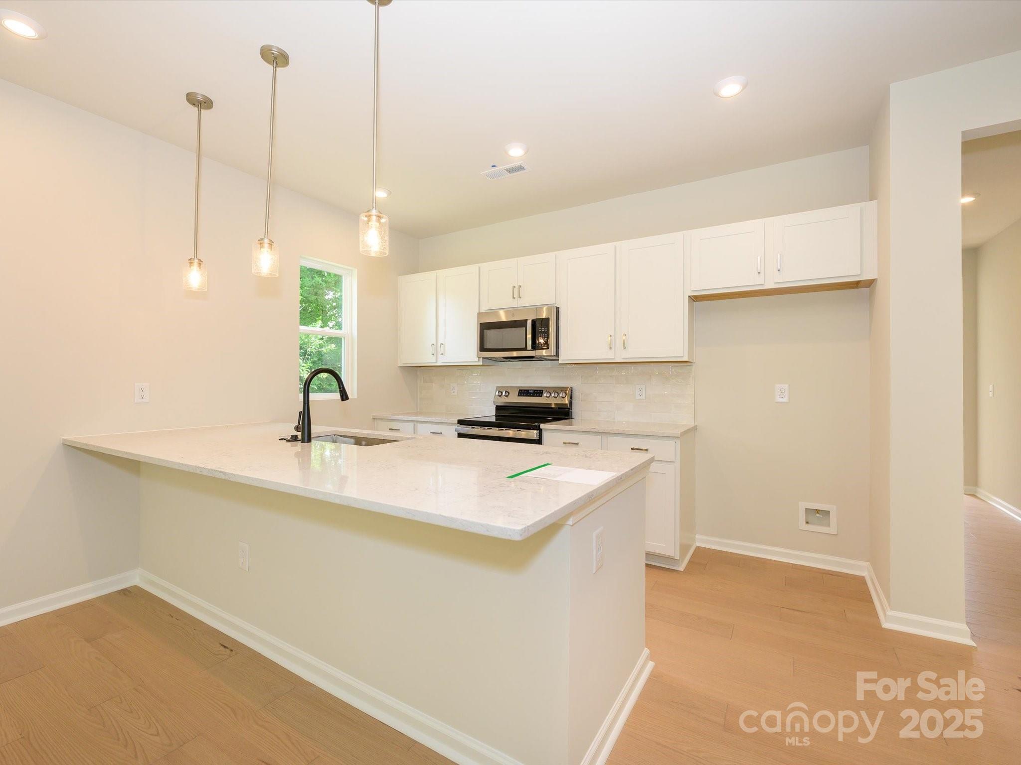 The Conrad | Homesite 123 One of the most private homesites at the glowing Fifteen 15 Cannon community. This end unit Conrad is tucked in a quiet corner with a treelined backyard, no direct neighbors and no through streets! Inside the home find a connected and open layout with 9' ceilings opening up the space to natural flow and loads of natural light. The designer-selected kitchen with white cabinets, quartz counters, large peninsula island, tile backsplash, and single bowl stainless steel sink is sure to impress. Durable wood-look stairs elevate lead up to the second story carrying premium style with them. The luxe primary retreat with 8' doorways, large windows and en suite bath round out the space. In the en suite bath, the dual vanity and expansive marble-look tile shower creates a modern yet timeless look.