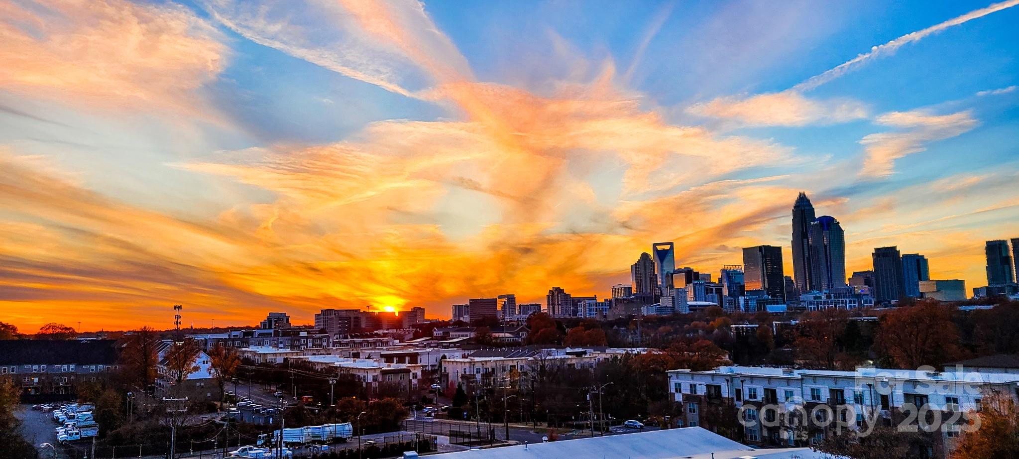 Enjoy INCREDIBLE CITY SKYLINE VIEWS and stunning sunsets from every floor of this modern townhome in Charlotte’s Belmont neighborhood, perfectly located between NoDa and Plaza Midwood and just steps from the light rail, greenways, parks, and top dining. The open floor plan features hardwoods throughout, a chef’s kitchen with oversized waterfall island, gas range, built-in microwave, quartz counters, tile backsplash, and plenty of storage. The living room offers floor-to-ceiling urban views, plus a separate dining area. Upstairs, the primary suite includes dual closets, a walk-in shower, and a double vanity with quartz counters. The laundry closet is conveniently located between both bedrooms. The spacious guest room features a Murphy bed and custom storage with hall bath. First-floor access via covered porch or one-car garage with overhead shelving leads to a flexible room for a home office, workout space, or TV room. Enjoy outdoor living on the turf-covered rooftop terrace or the fenced main-level yard. Designer lighting, triple zoned heat/AC with programmable thermostats and remote-controlled blinds in the living room and primary bedroom add modern convenience to this painted brick and fiber cement home. Incredible opportunity to enjoy urban living with some of the best views in Charlotte. The townhome backs to a lightly used rail line with minimal activity, just a couple of quiet trains a day offering both privacy and an open view with no immediate rear neighbors and a subtle reminder of the city's vibrant energy. Don't wait another minute to enjoy the sun setting over the city skyline from this fabulous townhome!