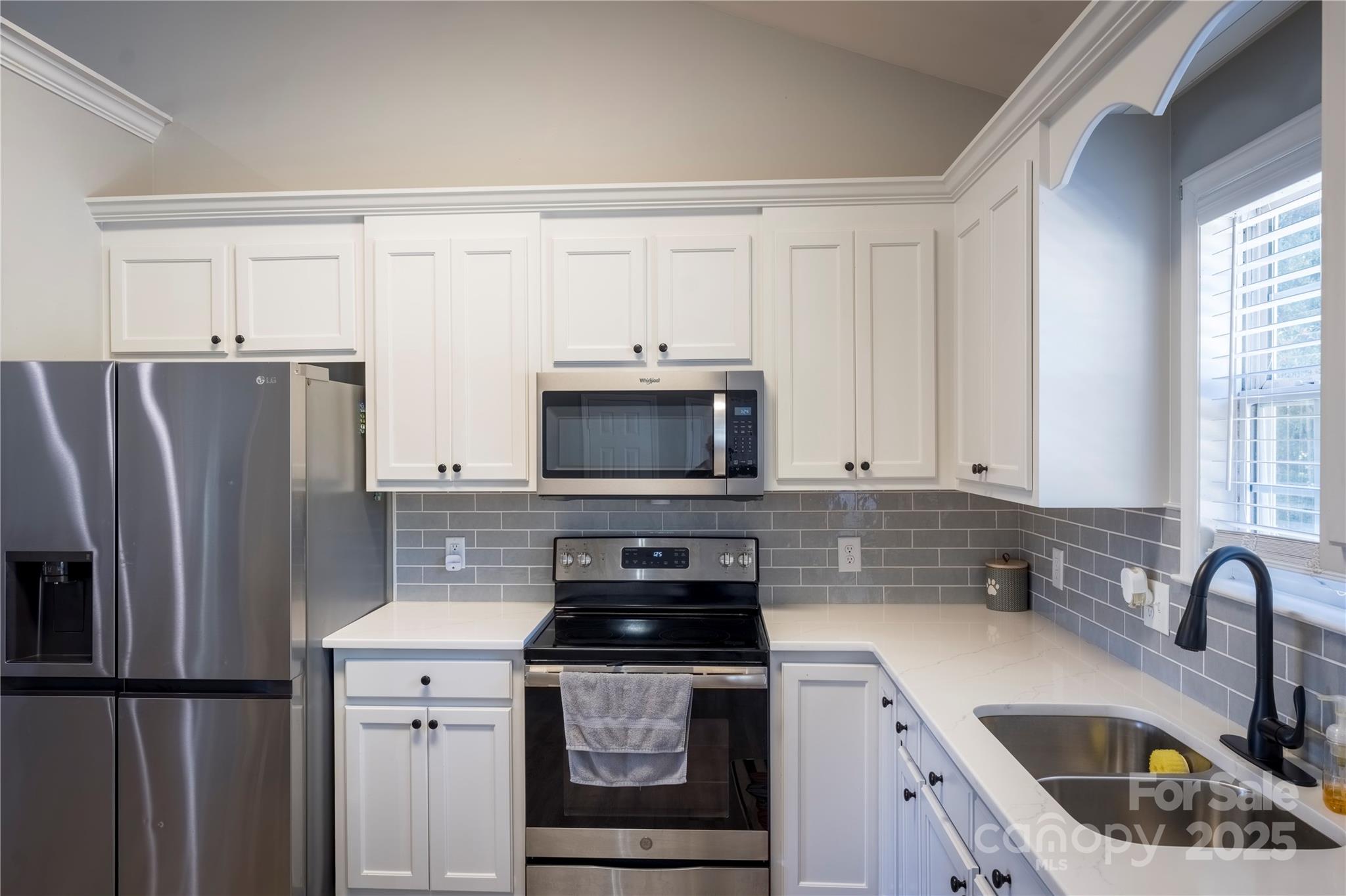 Welcome to your beautifully updated and meticulously maintained home! Step inside to find a fresh, neutral color palette that creates a bright and inviting atmosphere throughout. The open-concept living space seamlessly connects the kitchen and living room, highlighted by vaulted ceilings that add a sense of space and elegance. The kitchen has been thoughtfully upgraded with brand-new quartz countertops, a modern sink, and freshly painted cabinets adorned with stylish new hardware perfect for both everyday living and entertaining guests. The split floor plan offers privacy and comfort, ideal for families or guests, while crown molding adds a refined finishing touch to the home’s aesthetic. This home offers a serene lifestyle with quiet surroundings, making it the perfect retreat after a busy day.