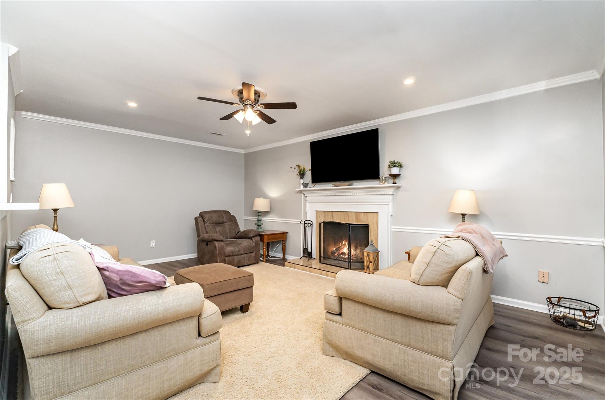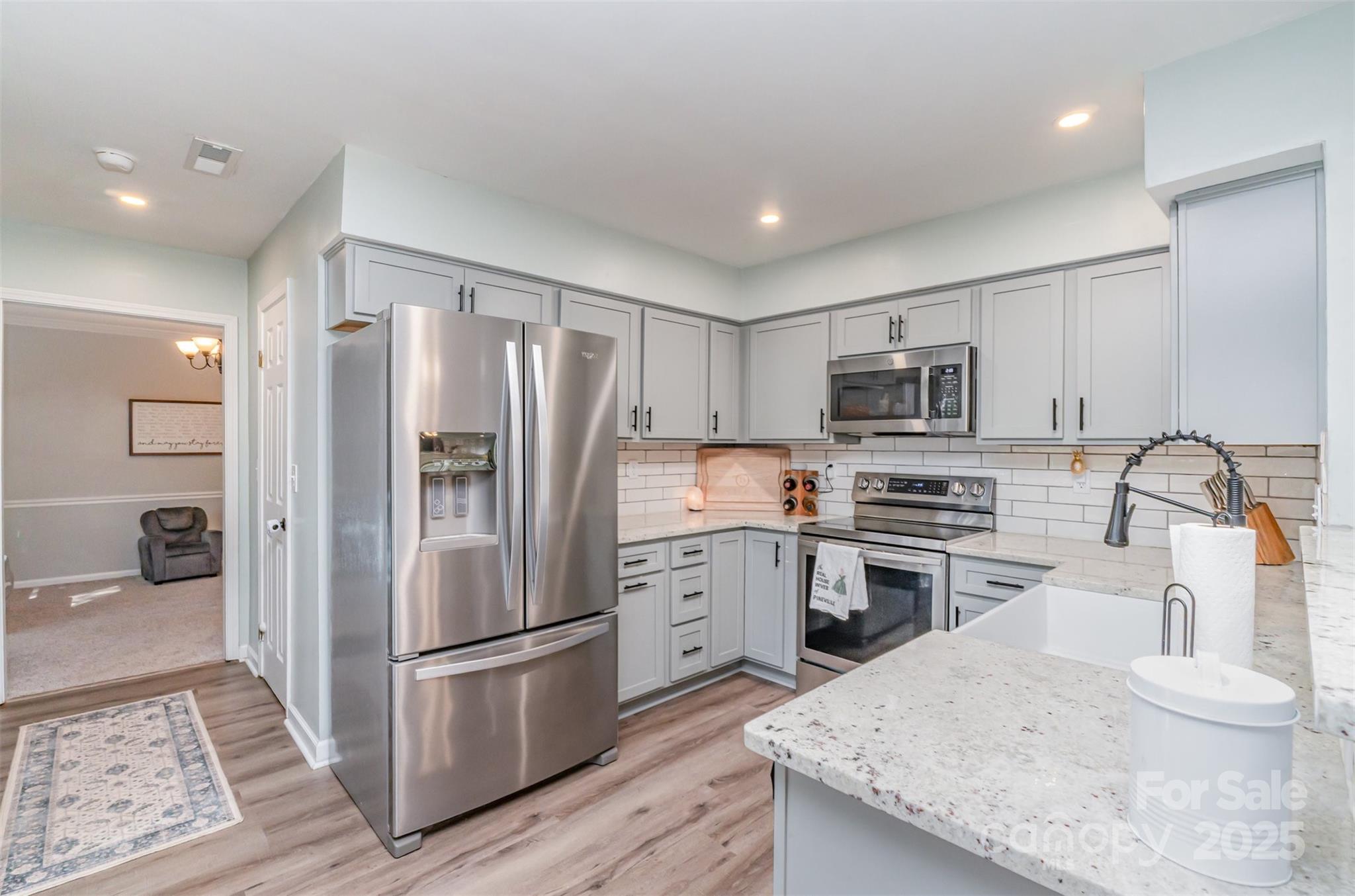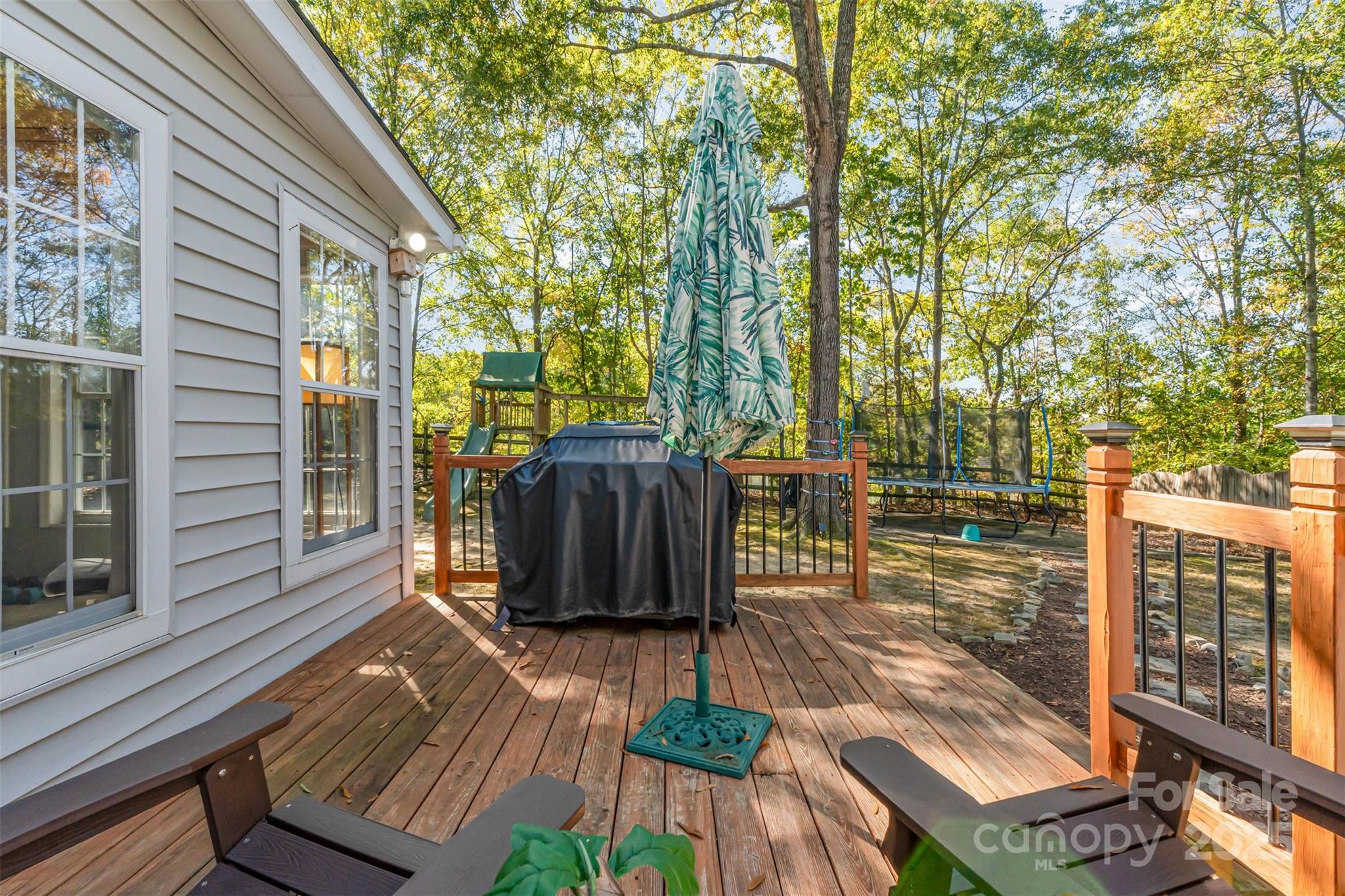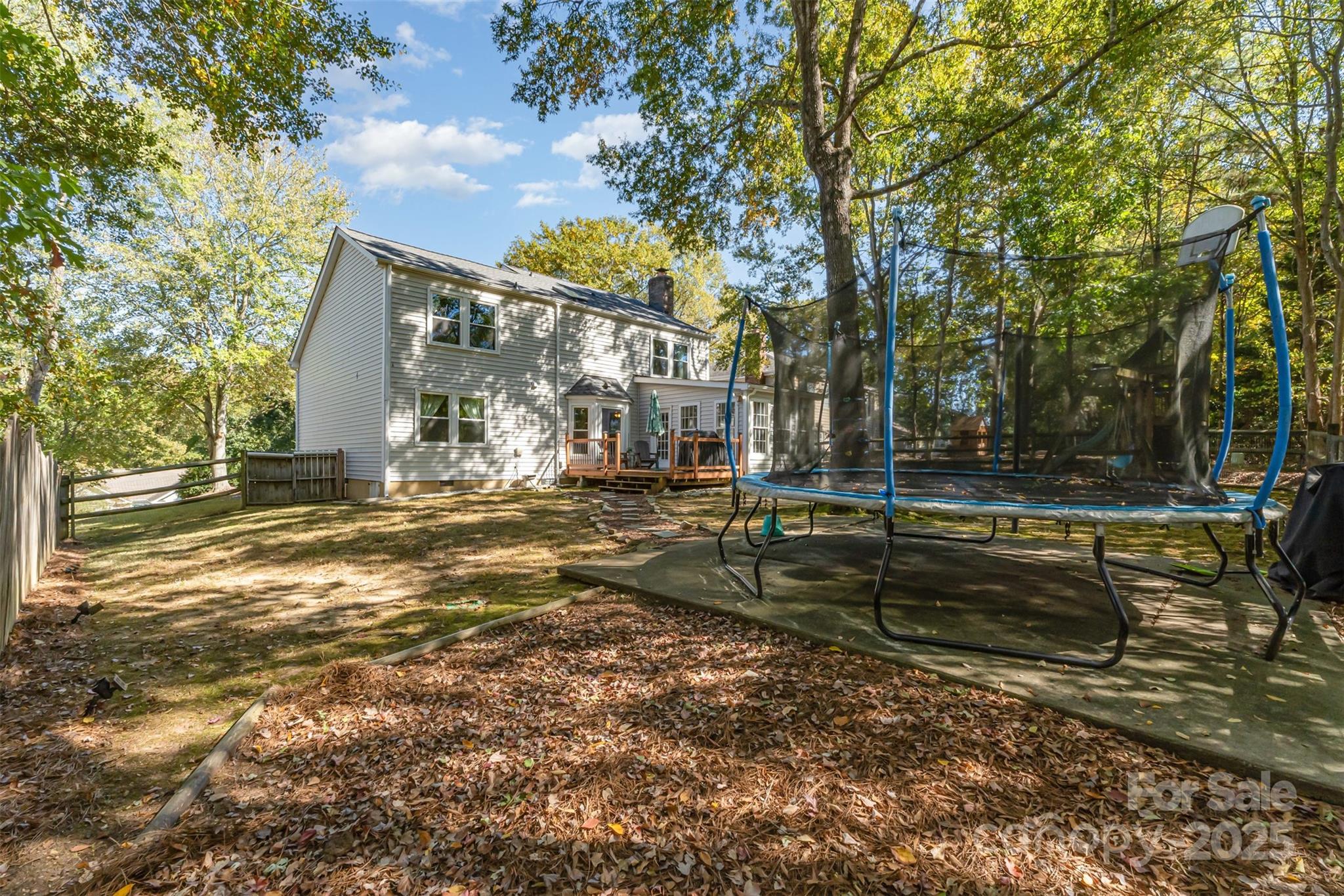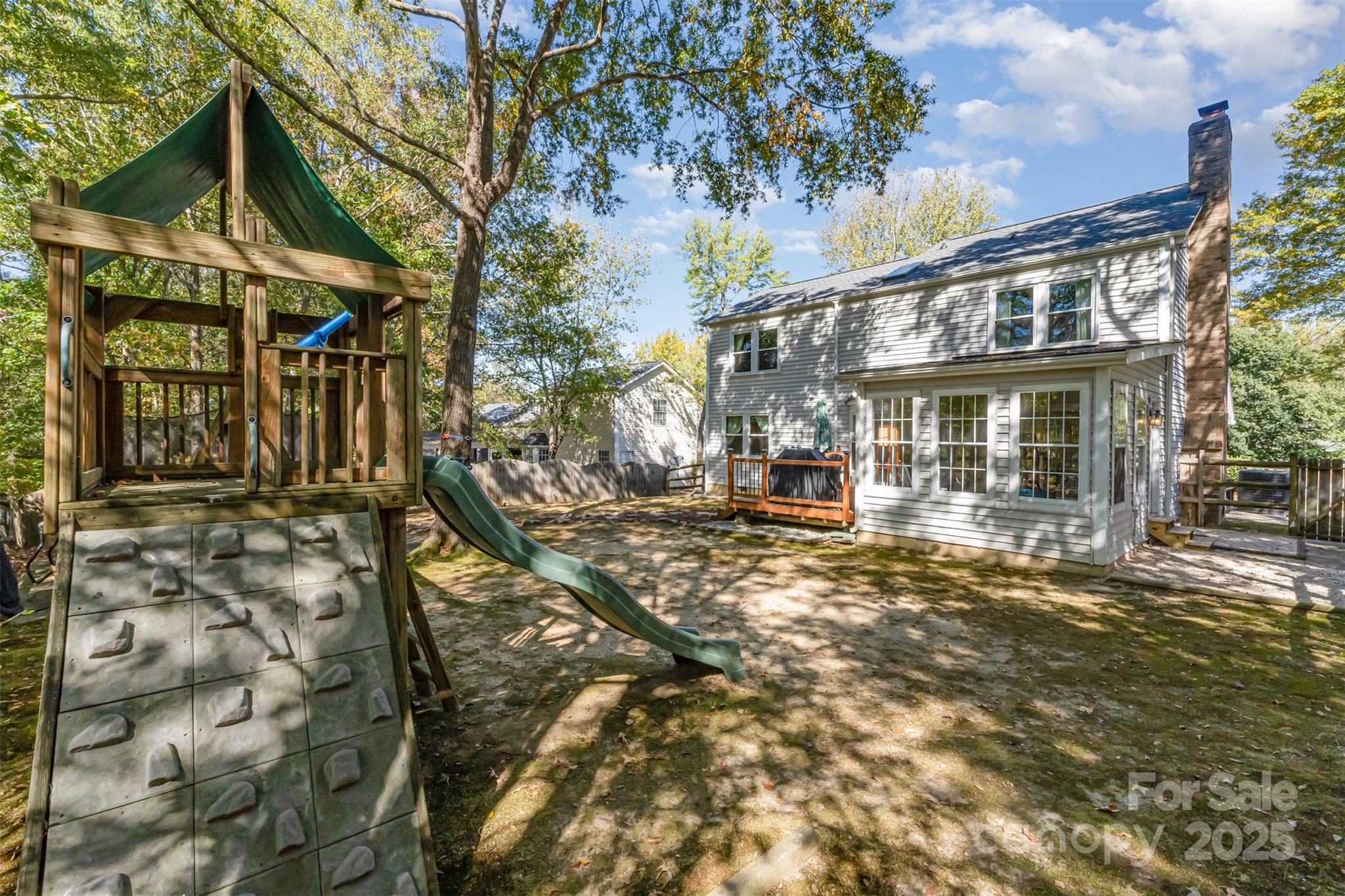 Wonderful 4 bed 2.5 bath home in sought after Woodside Falls. Updated kitchen with shaker cabinets, granite countertops and stainless appliances. Gorgeous farm style sink and tiled backsplash. Floorplan flows beautifully from the entry with its soaring 2 story ceilings to the Living room and open to the dining room. Large Family room with a fireplace to enjoy the cooler weather. Kitchen and Family room along with a breakfast nook flow together seamlessly for a more modern lifestyle. Beautiful finished sunroom with a fantastic pine ceiling overlooking the wooded, fenced, private, level backyard. Wonderful deck off the back of the home for grilling and enjoying the back yard. Upstairs are 4 generously sized bedrooms. Primary bedroom has a ensuite bath with a garden tub, shower and updated fixtures. Walk in closet to round out the Primary. Home has been tastefully decorated and is in move in ready condition. Woodside Falls is in one of the best locations in Mecklenburg County. Walking distance to Ballantyne. Minutes to the new "Bowl in Ballantyne" with the outdoor Amphitheatre for live music. 30 minutes to the airport, minutes to I-485 and access to the entire City. Woodside Falls has a pool, playground, sports court, walking trails all around a beautiful neighborhood pond. Extremely low HOA fees and no City Taxes. Throw in the fact the neighborhood has been zoned for the new high school at Ballantyne Ridge. Don't miss this home.