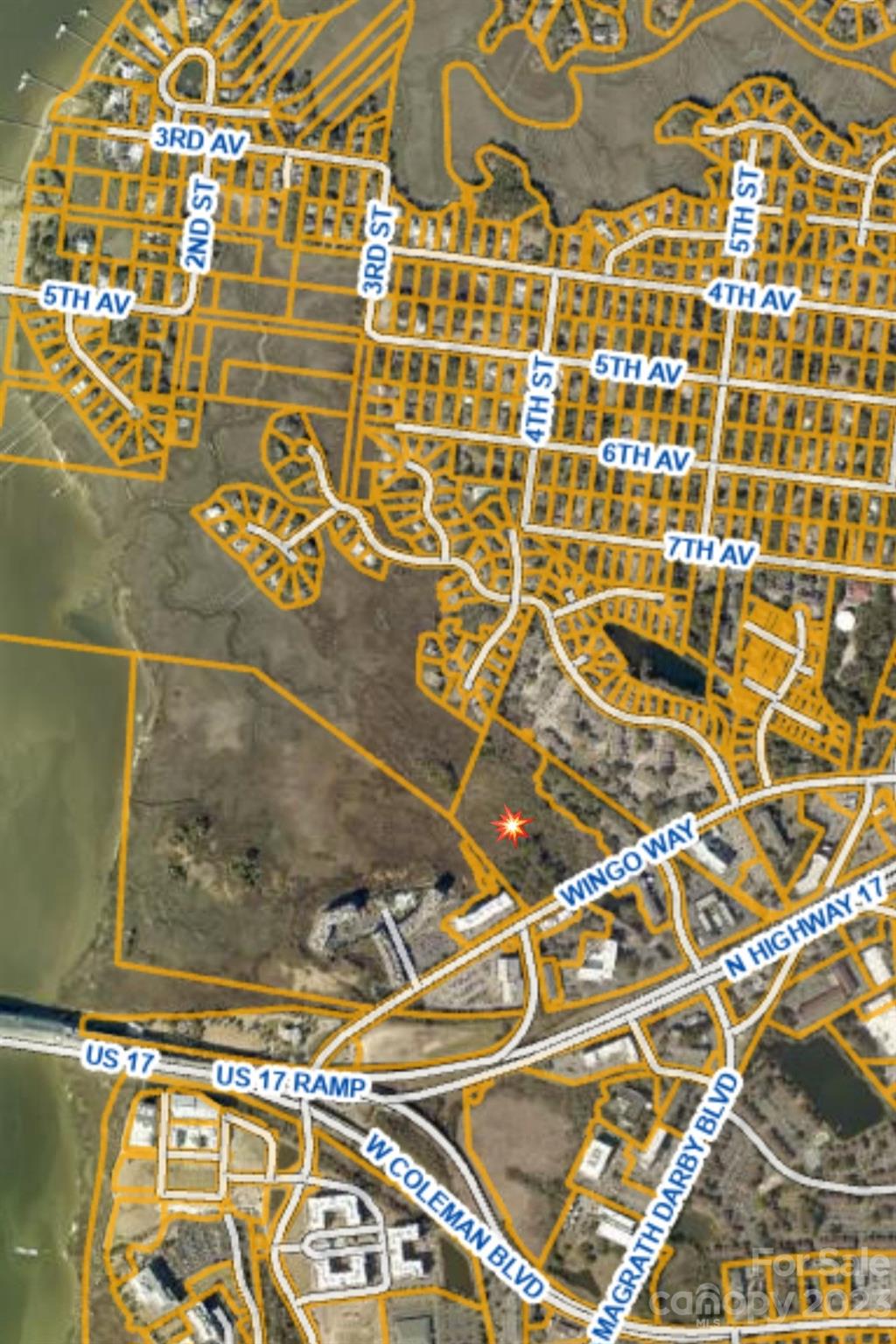 Incredible Location - Property is a Very Scenic Marsh-Front 10-acre parcel located near the base of the Arthur Ravenel, Jr. Bridge, on Wingo Way. This is one of the last available parcels in this high-traffic area of Mount Pleasant. It is zoned mixed commercial and could possibly work for retail, dining, lodging, an office building, or a scenic park. The acreage is in-between The Tides Condominium Complex and Sleep Inn, on Wingo Way. Surrounded by other hotels and local businesses, this parcel is well positioned to capitalize on future growth and development. It is believed that the buildable portion of the property is somewhere between 1/3 to 1/2 acre. There is a 2nd area f high ground by the Sleep Inn, but most likely inaccessible without permission from the adjacent neighbor. The 2 proposed buildable areas are identified by the 2 circles in a couple of the images. All major utilities available. The wetlands are made up of both freshwater and saltwater.