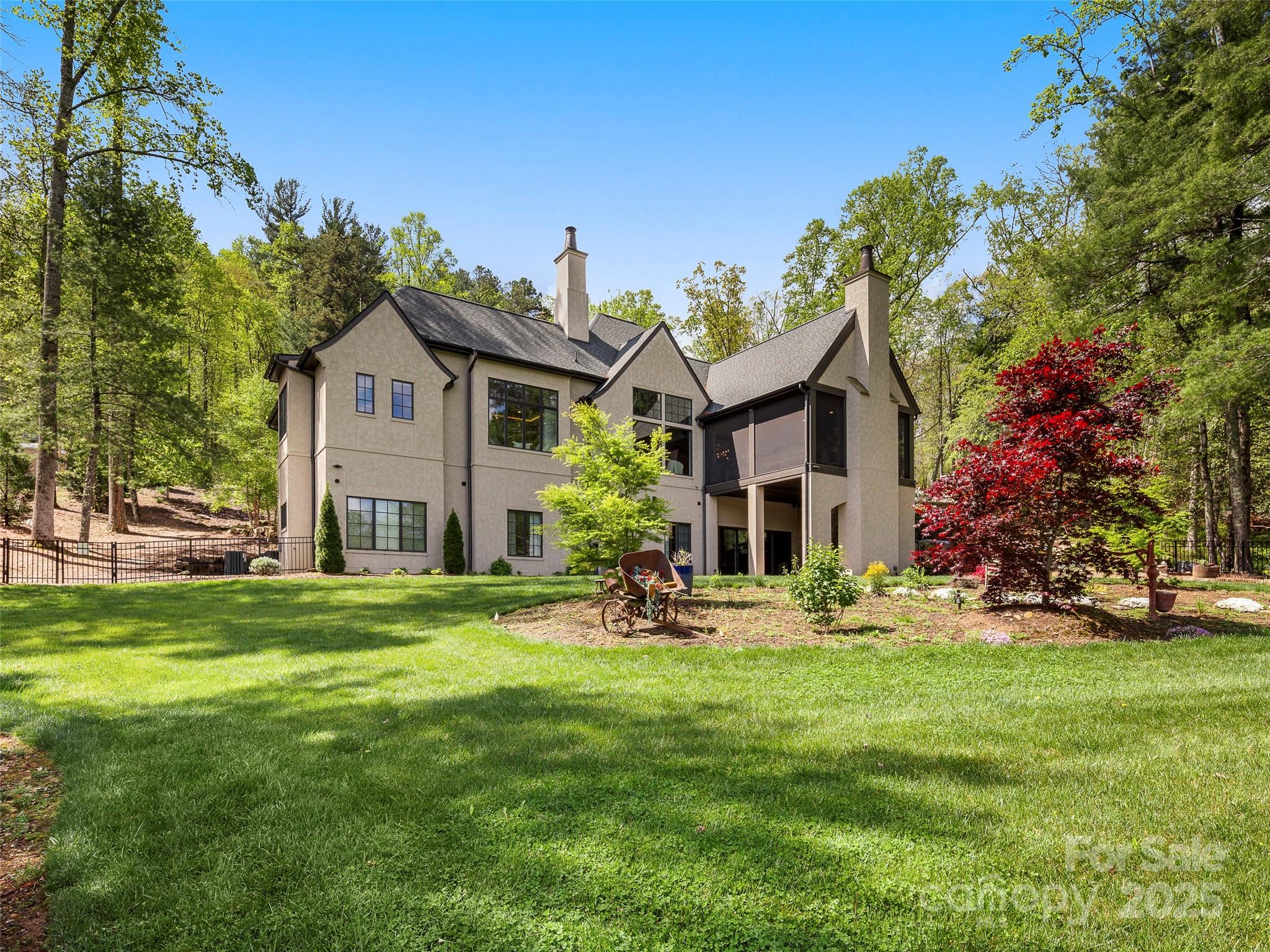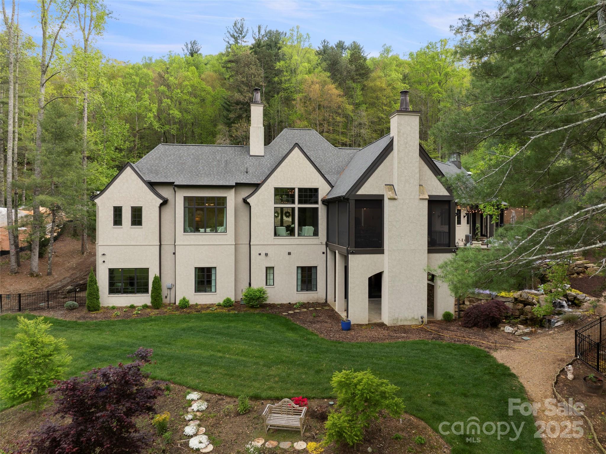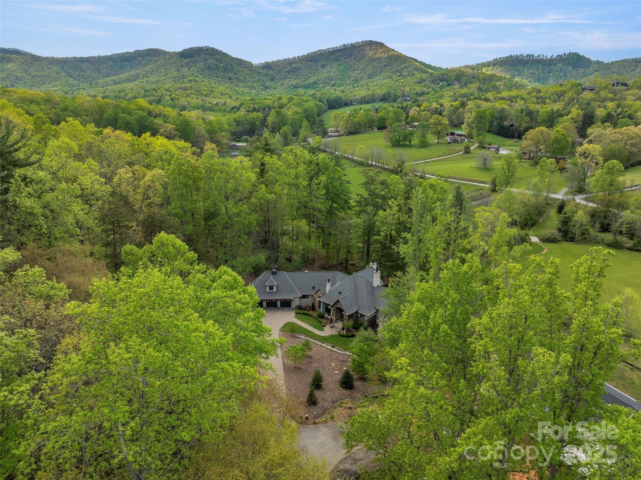 Private French Country Estate in The Cliffs at Walnut Cove, offering timeless architecture, panoramic meadow and mountain views, and exceptional privacy. Built by a premier custom builder with uncompromising craftsmanship, the home features a sunlit great room with soaring ceilings, a gourmet kitchen with premium appliances, and an expansive patio with a wood-burning fireplace—ideal for entertaining or quiet evenings surrounded by nature. Designed for wellness and comfort, it includes upgraded air and water quality, natural materials, energy-efficient systems, and smart features thoughtfully integrated for convenience. Highlights include a luxurious primary suite, main-level executive office, screened-porch overlooking a tranquil water feature, elevator, generator, walk-in vault, ample storage, and an attached garage w/workshop. Set on 1.5 serene acres, with adjoining 1.73-acre parcel available, the property offers both exceptional privacy and easy access to amenities.