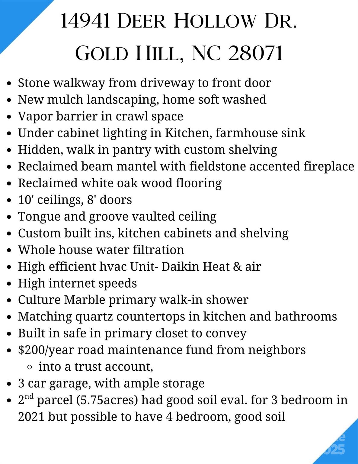 Welcome to 14941 Deer Hollow Dr, a stunning custom-built home on 11.5 wooded acres in Gold Hill, North Carolina. Built in 2021 with 2x6 construction, this home was designed for strength, style, and privacy. Nestled outside city limits, you’ll enjoy no city taxes, no HOA, and no restrictions — giving you the freedom to live your way. The property includes two separate 5.75-acre parcels, offering endless opportunity. The second parcel is raw land that was previously soil-tested and approved for a 3-bedroom home, with potential for a 4-bedroom pending evaluation — perfect for a multi-generational homestead, guest house, or investment build. A brand-new stone walkway leads to the welcoming front porch overlooking peaceful, wooded views. Inside, thoughtful craftsmanship is evident in every detail — from the vaulted, tongue-and-groove ceilings to the reclaimed white oak floors and custom mantel. The great room features a stone-accented electric fireplace with built-ins, creating a cozy, elevated space for gathering. The open-concept kitchen is a showstopper with quartz countertops, large island, hidden pantry, custom cabinetry, under-cabinet lighting, and an electric cooktop with designer range hood. Ten-foot ceilings and eight-foot doors throughout add to the home’s bright, airy feel. All bedrooms are conveniently located on the main level, including a primary suite that’s both simple and sophisticated. Enjoy a spa-style bath with a cultured-marble walk-in shower, soaking tub, and a custom walk-in closet with a built-in safe. Upstairs offers a versatile flex room with a half bath, ideal for an office, playroom, or guest suite, along with a walk-in attic for ample storage. The three-car garage provides plenty of space for vehicles, equipment, or hobbies. Outside, relax on the covered back porch surrounded by nature — the perfect spot for morning coffee or evening sunsets. Located in Cabarrus County, this home blends country living with nearby convenience: -9 miles to Rockwell, NC for small-town charm, local restaurants, Grocery Stores and Charlie’s Ice Cream Shop -6 miles to Richfield, or 9 miles to Mt. Pleasant for grocery stores and daily essentials -17 miles to Concord, where you’ll find shopping, dining, and date nights in a vibrant downtown setting This property offers endless potential, ultimate privacy, and timeless craftsmanship — all for under $950,000. Schedule your showing today!