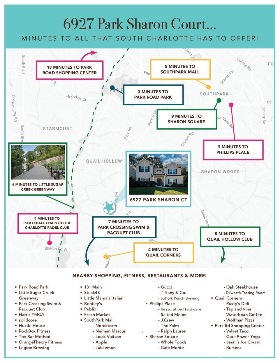 Step into The Park at Sharon — A HIGHLY SOUGHT-AFTER COMMUNITY IN ONE OF CHARLOTTE'S MOST DESIRABLE NEIGHBORHOODS! Located just MINUTES TO ALL THAT SOUTH CHARLOTTE HAS TO OFFER — from the upscale shopping and dining of SouthPark Mall, Phillips Place, and Park Road Park to Little Sugar Creek Greenway and Quail Hollow Club. Tucked away on a peaceful CUL-DE-SAC, this beautifully maintained home perfectly blends MODERN DESIGN WITH TIMELESS TRADITIONAL CHARM. This home features TWO OWNER’S SUITES — one on the main level and one upstairs — along with an open main-level floor plan that makes it easy to entertain or enjoy everyday living. On the main level, you’ll find the main-level owner’s suite with an oversized, walk-in shower, a main-level office or formal dining room, and a CHEF'S KITCHEN showcasing a 36” Bertazzoni Master Series gas range, granite countertops, an island, and an 11.5 ft breakfast bar. Upstairs, there’s a SECOND OWNER'S SUITE, three additional bedrooms and a spacious bonus room, ideal for a media room, playroom, or home gym. Additional features include plantation shutters throughout, a fenced-in backyard, and two attached garages — one two-car and one single-car. Located just MINUTES TO Park Crossing Swim & Racquet, Pickleball Charlotte, and Charlotte Padel Club, this home offers the perfect balance of convenience and community. You'll also appreciate the quick access to Uptown Charlotte, I-77, and the airport, with top-rated private and public schools nearby. Thoughtfully designed and in an unbeatable South Charlotte location — THIS IS TRULY CHARLOTTE LIVING AT ITS BEST. Qualified buyers will receive $4,000 in lender-paid credits when using the sellers' preferred lender.