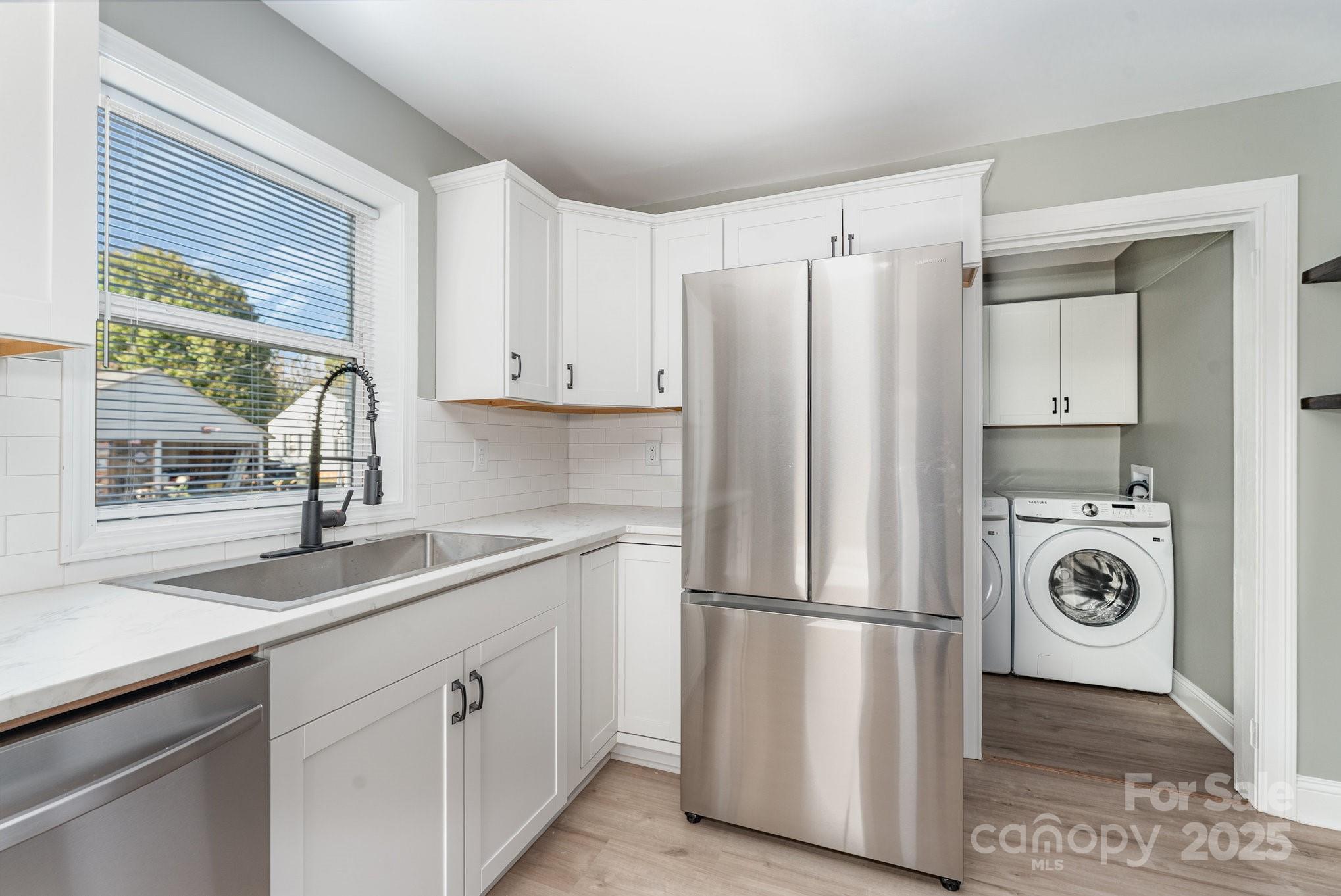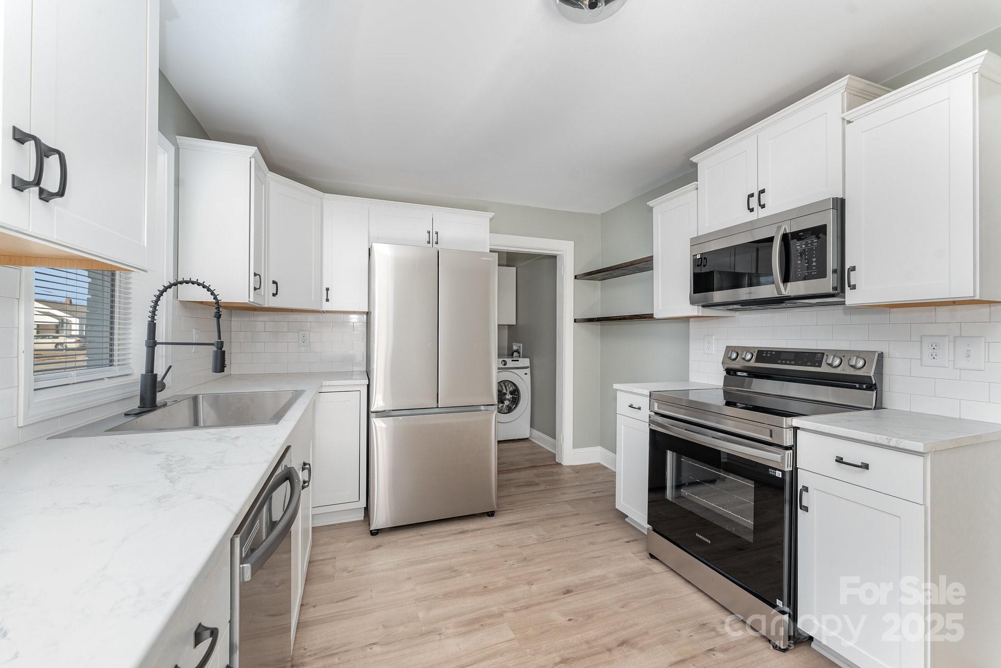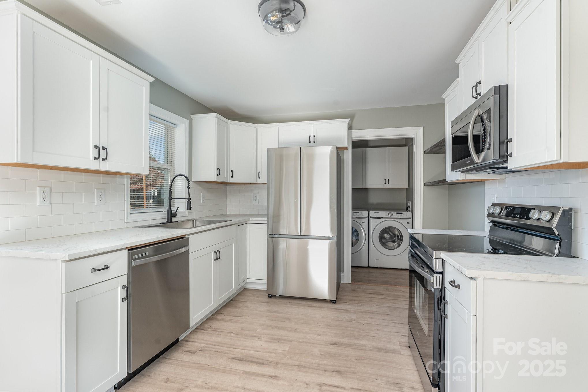 Beautifully renovated 2BR/1BA home in the heart of Lexington featuring a stunning kitchen with new cabinets, countertops, subway tile backsplash, custom shelving, pull-down faucet sprayer, and all-new stainless steel Samsung appliances—including dishwasher, smooth-top stove, microwave, and front-load washer & dryer. Bathroom features new vanity, toilet, and linen pantry. Enjoy new HVAC, updated electrical and plumbing, and luxury vinyl plank flooring throughout. Fresh paint, modern lighting, ceiling fans, and new hardware complete the look. A bonus room offers space for an office, gym, or walk-in closet. Exterior updates include new vinyl siding, black gutters, porch railings, painted brick, and new front door for great curb appeal. Corner lot with concrete pad ideal for parking or patio. Seller is a licensed NC Broker & General Contractor offering $2,000 closing cost credit by Nov 8 and 1-year home warranty. Excellent Airbnb or rental potential recent comps show strong investor value!