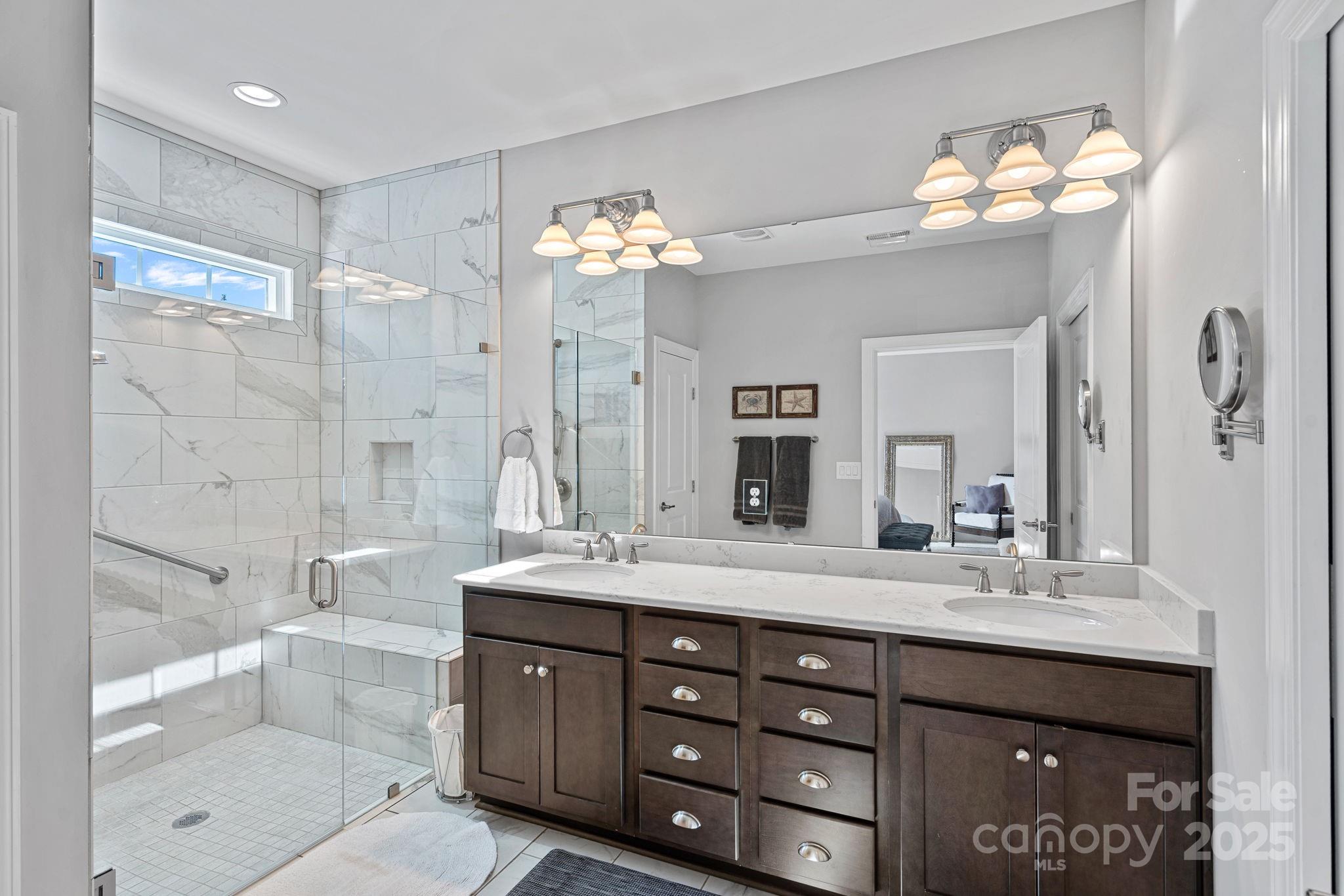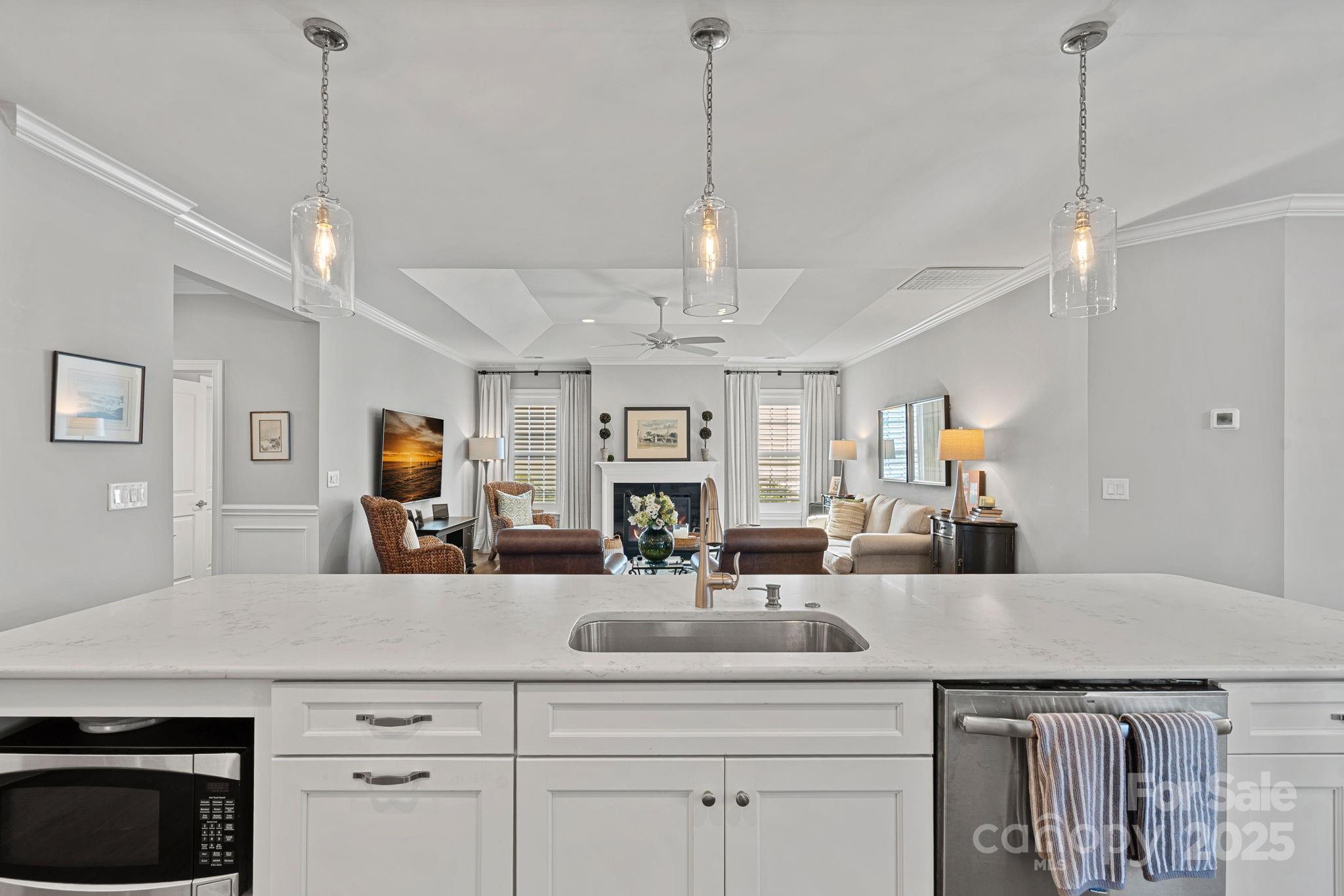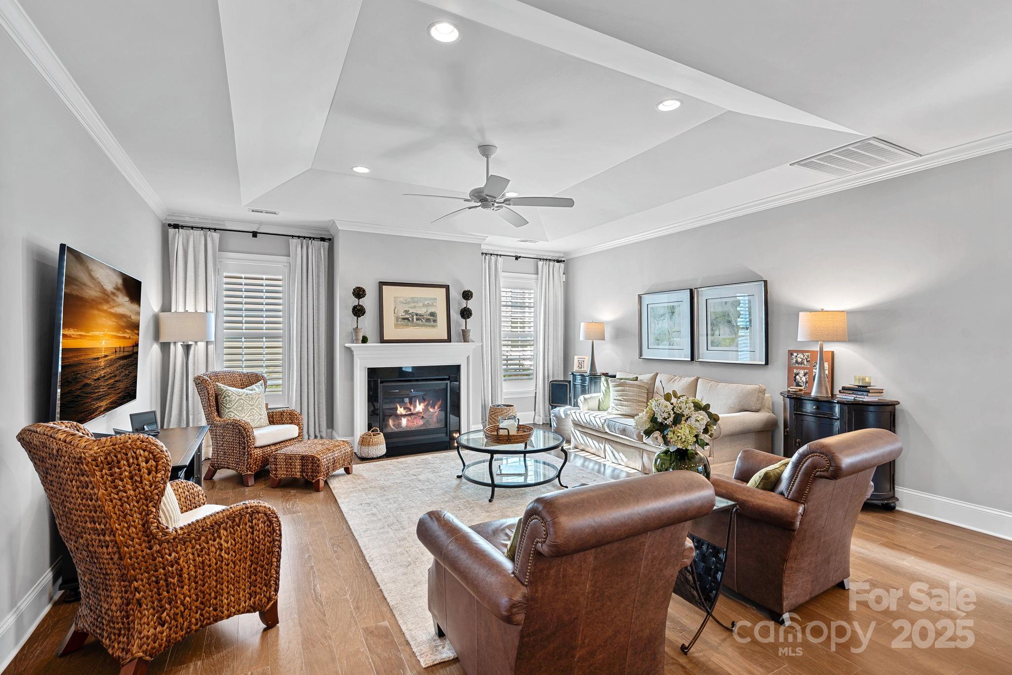 Welcome to this beautiful custom home in the highly sought-after community of Baileys Glen! This one of a kind expanded Hunter model offers a spacious and thoughtfully designed floor plan with numerous upgrades throughout. The home was stretched front to back 4+ feet creating a massive and open-concept great room and kitchen, perfect for entertaining. The redesigned kitchen features a huge center island, abundant cabinetry, stainless steel appliances, beautiful pendant lighting, and plenty of counter space—truly an entertainer’s dream. The foyer was expanded to flatten the front of the house which allowed for a larger front porch, providing enhanced curb appeal and a welcoming entry. Interior highlights include solid wood doors, 7¼" baseboards, engineered hardwood flooring, plantation shutters, a cozy gas fireplace, and a stylish chandelier in the dining area. The primary suite offers a relaxing retreat with a spacious layout, walk-in closet, and a luxurious en-suite bath featuring dual vanities and a zero-threshold shower. Additional features include a guest bedroom, study/bedroom with glass french doors, and a bright sunroom that opens to an added screened-in porch overlooking a private wooded area—perfect for enjoying your morning coffee or unwinding in the evening. Located in the active adult community of Baileys Glen, residents enjoy resort-style amenities including a clubhouse, pool, fitness center, pickleball and tennis courts, walking trails, and a vibrant calendar of social events. This move-in ready home combines comfort, style, and an ideal location. Schedule your showing today!