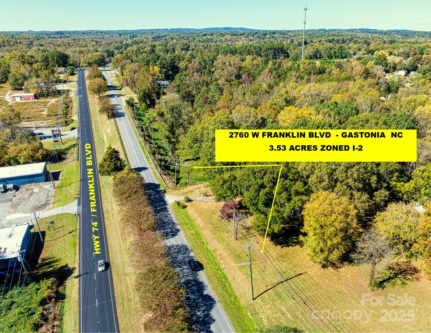 Prime 3.5± Acres of I-2 Zoned Land – West Gastonia / Franklin Blvd-Hwy 74 Corridor located in the rapidly developing Franklin Blvd / Hwy 74 corridor of West Gastonia, near the base of scenic Crowders Mountain. The property offers outstanding accessibility with three nearby I-85 exits within 1–2 miles and direct Hwy 74 connector access to I-85 within approximately 5 miles. Featuring approximately 375 feet of frontage on Hwy 74, the site has a commanding elevation and very favorable topography, making it highly suitable for development. City utilities available. The existing structure appears to be in excellent condition and could serve as a temporary or permanent office space for new owner. Location is ideal for self-storage development, business/flex space, warehouse, or General industrial applications. Refer to the attached UDO for allowable uses under the current I-2 zoning. Seller notes that the existing homestead is currently served by a shared well with city sewer connection.