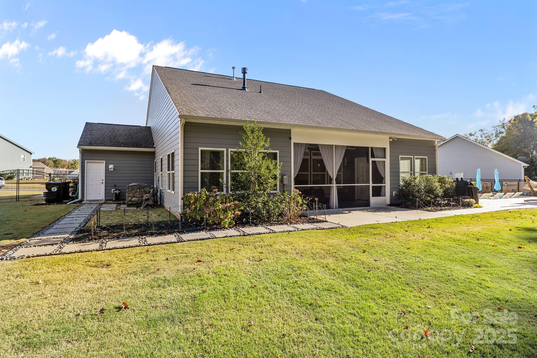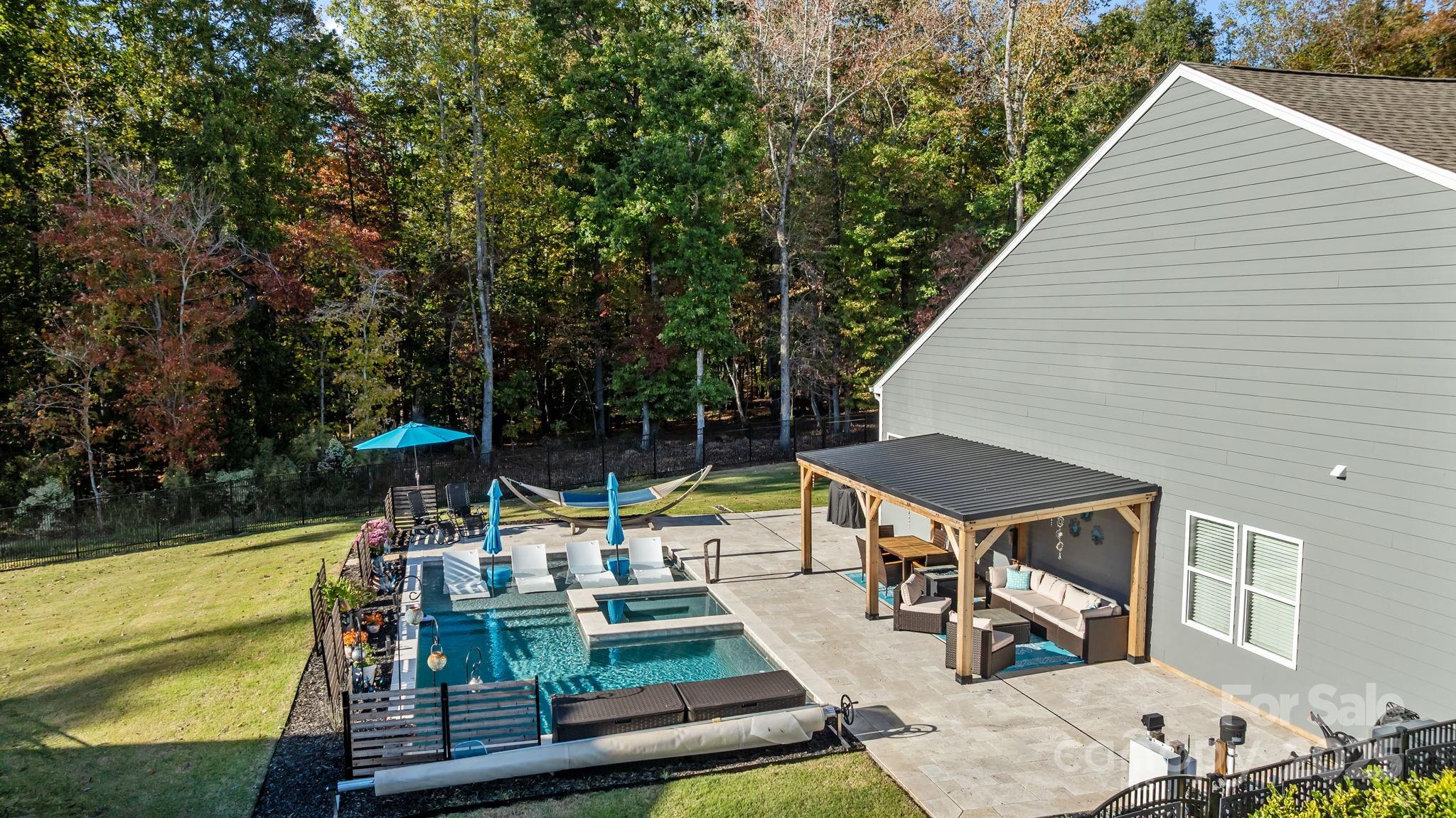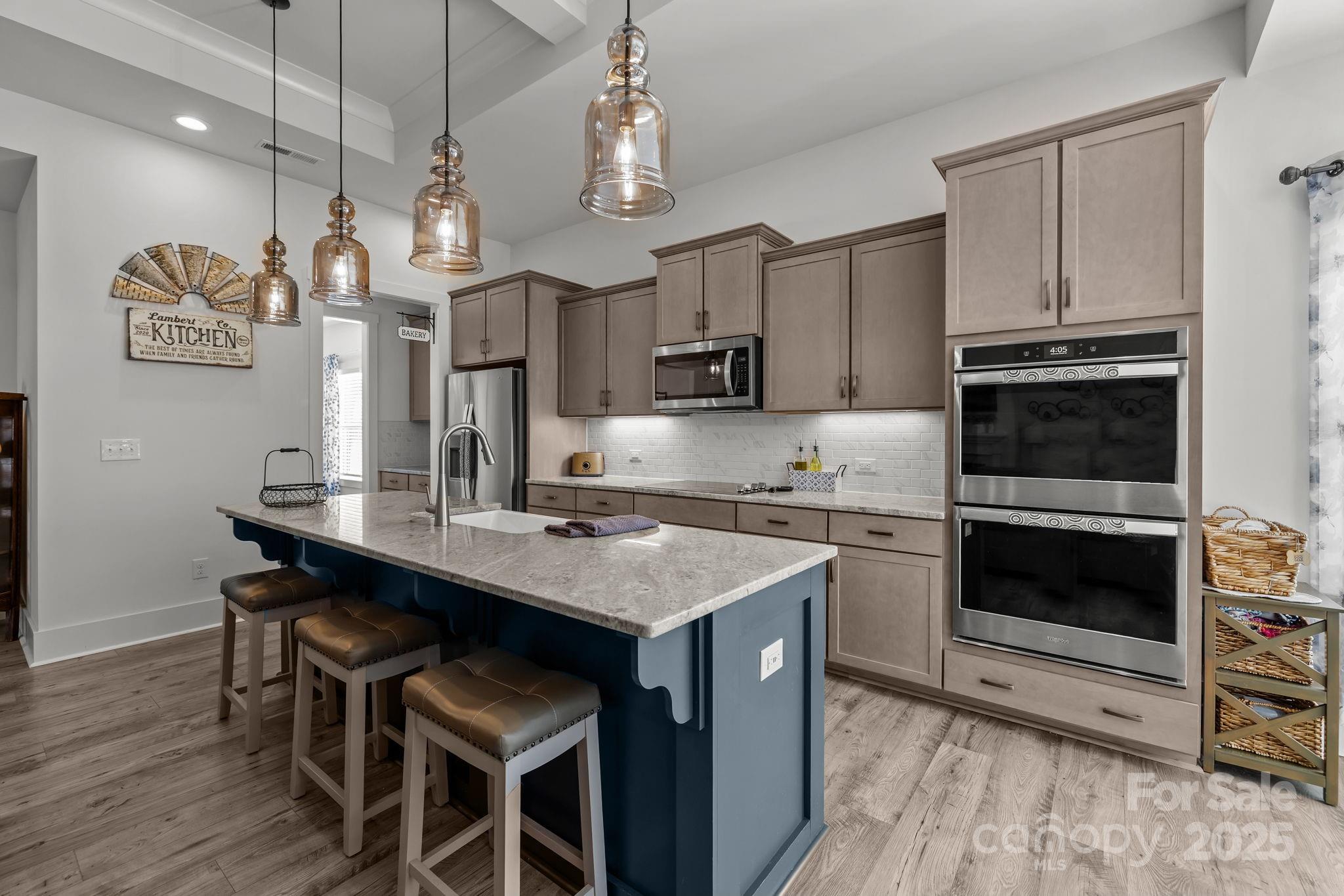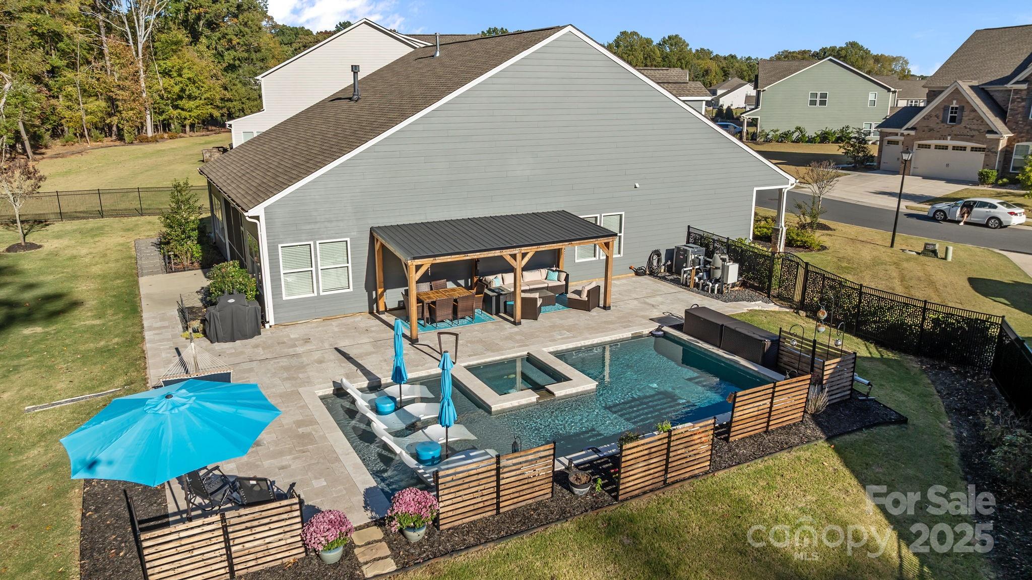 Set on a quiet cul-de-sac street, this custom Arts and Crafts–style home combines timeless architecture with modern livability. Stacked stone accents and fiber cement siding create lasting beauty and low maintenance, while the inviting front porch sets the stage for what’s inside—a home designed with care, comfort, and craftsmanship in every detail. Inside, the open concept unfolds with beautiful LVP flooring, detailed wainscoting, and elegant millwork throughout. The family room impresses with a coffered ceiling, gas fireplace, and transom-topped windows that fill the space with natural light. The kitchen makes a statement with its bold blue island, stainless steel appliances, tile backsplash, and pendant lighting. A butler’s pantry with walk-in storage, double wall ovens, and a separate cooktop makes entertaining effortless. The formal dining room offers the perfect setting for both intimate dinners and lively gatherings. The primary suite on the main level feels like a private retreat. A light-filled sitting area opens to the screened porch, while the ensuite bath showcases dual vanities, an oversized tile shower, and direct access to the walk-in closet and laundry room for thoughtful convenience. A second bedroom and full bath complete the main level. Upstairs, a third bedroom and full bath create the ideal guest or flex space, with every bedroom enjoying its own private bath access. Step outside, and the home truly shines. The screened porch overlooks a fenced backyard bordered by trees. The heated pool and spa take center stage—featuring color-changing LED lighting, a sun shelf for lounging, and full Aqualink remote control. An expansive patio with pergola-covered grilling, dining, and seating areas invites hours of outdoor living, while still leaving plenty of yard space for play, gardening, or pets. Every detail of this home has been designed to balance sophistication and comfort—creating a space that feels both refined and welcoming.