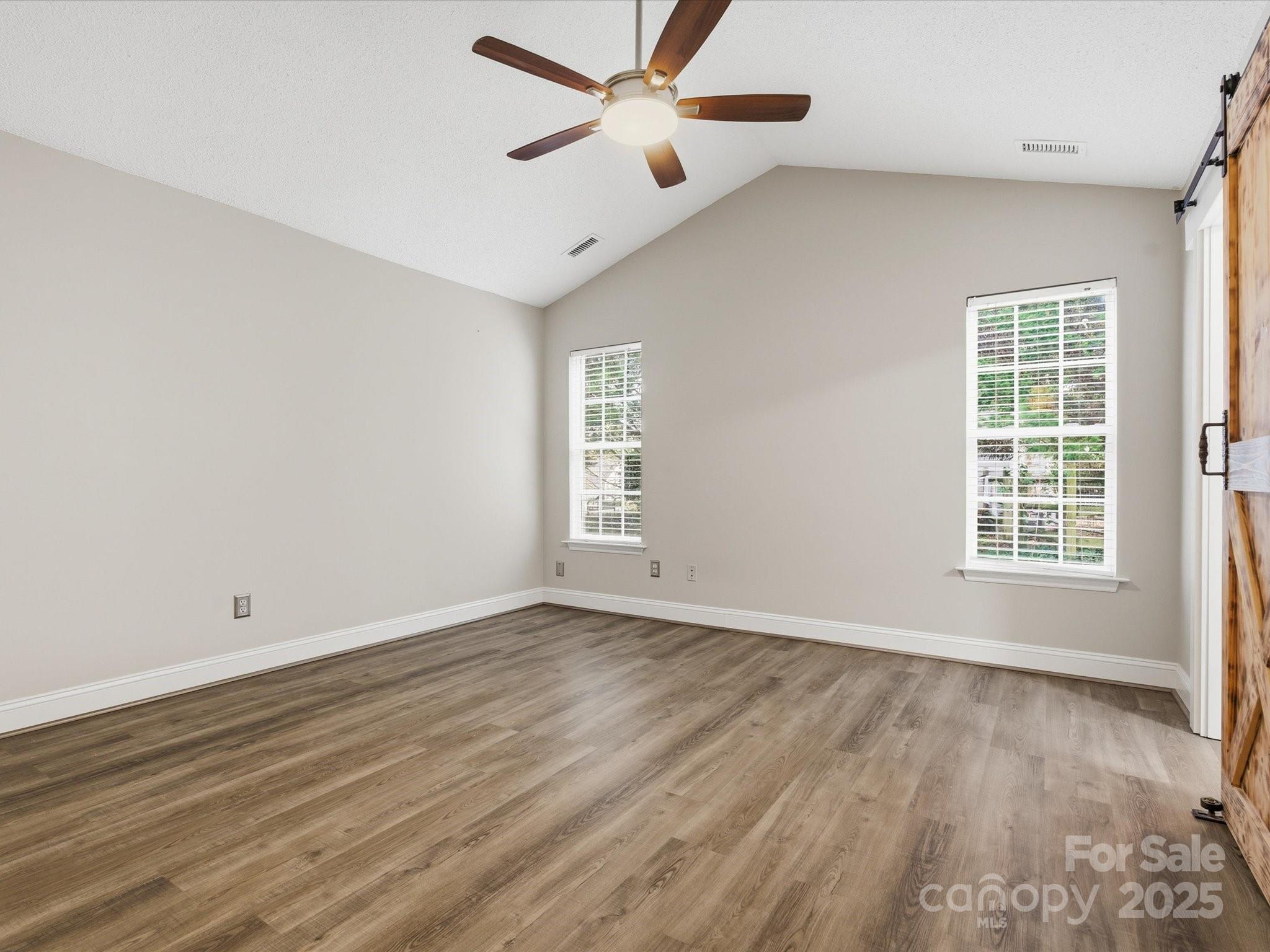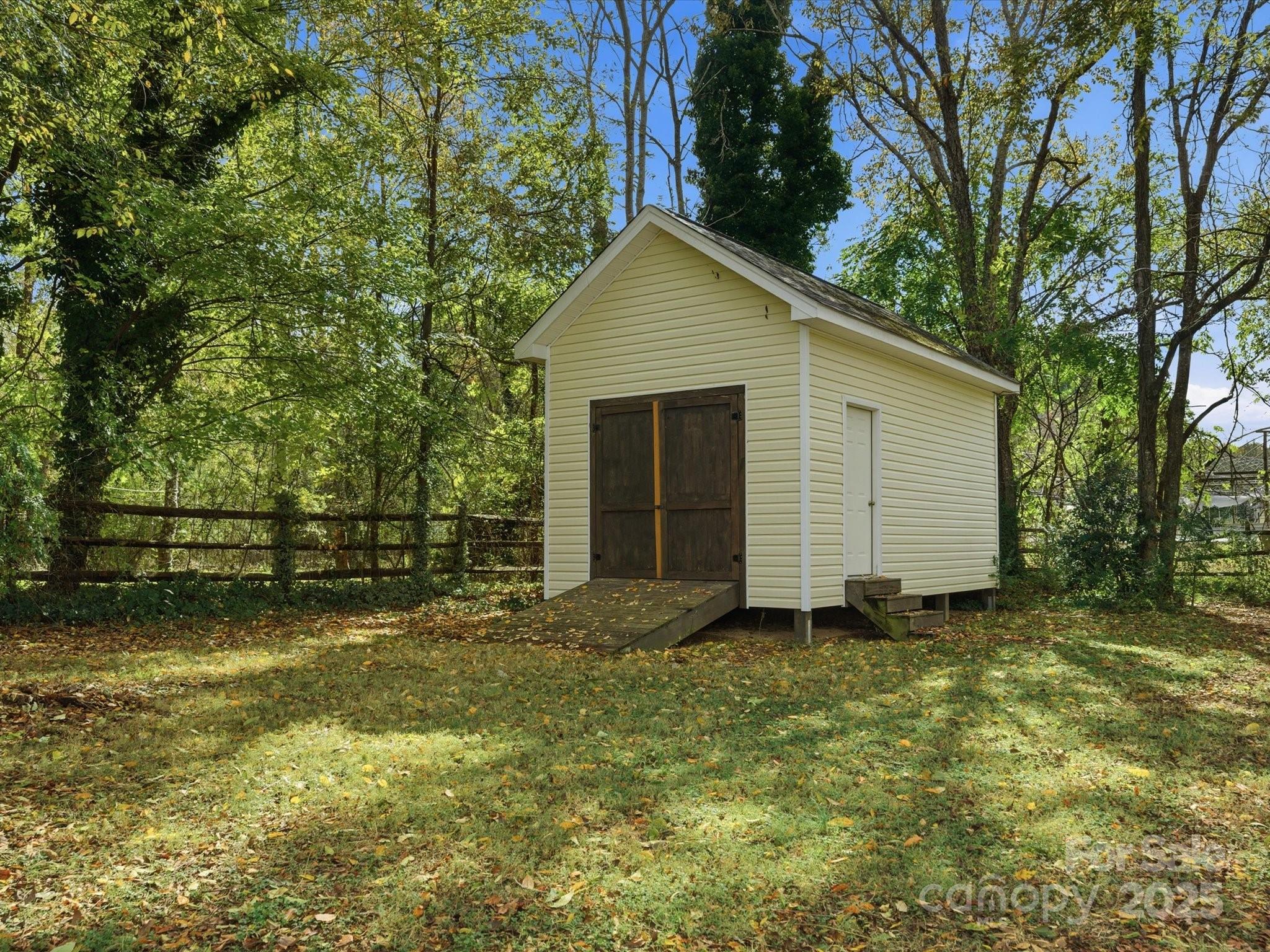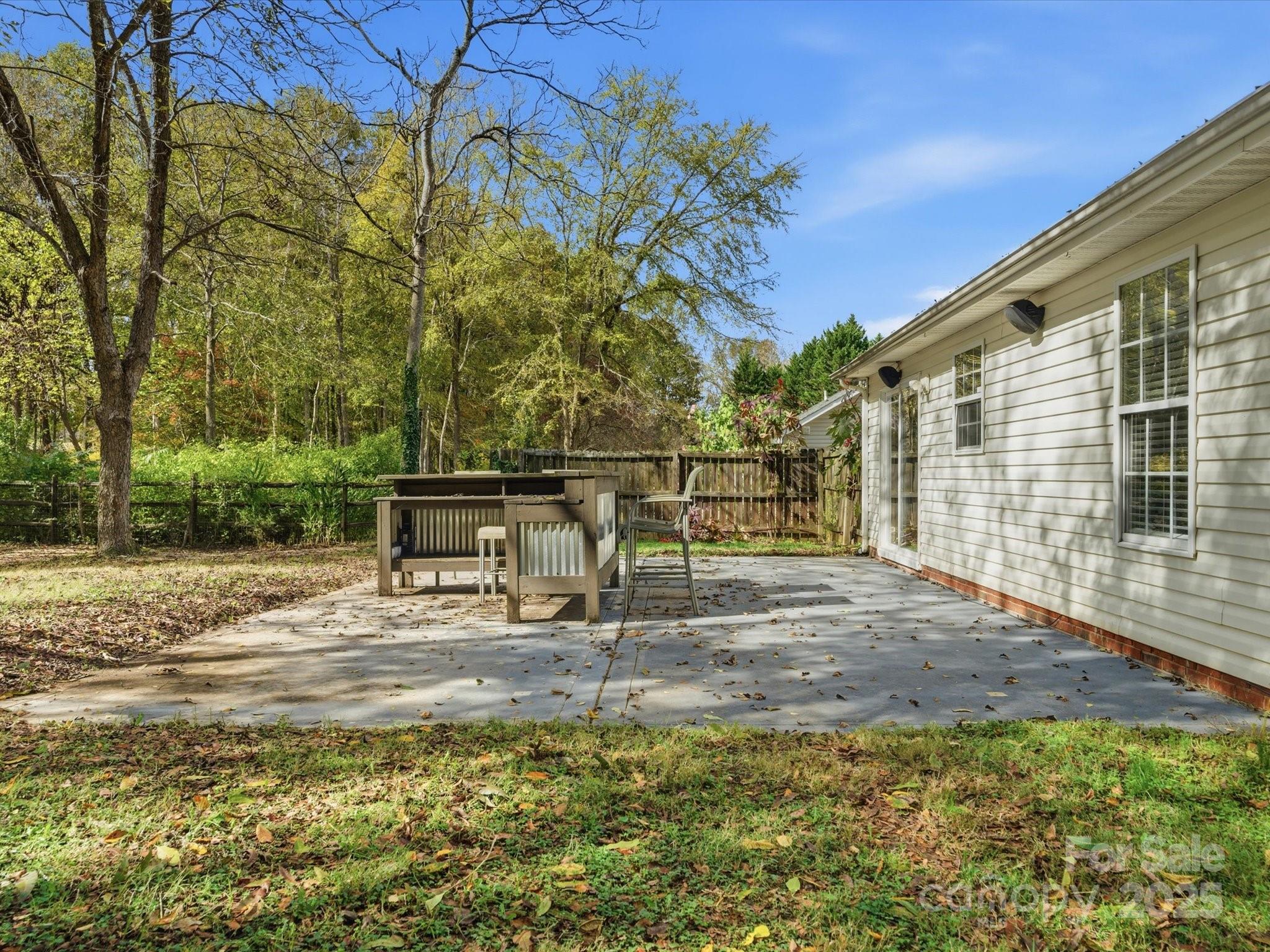 Welcome to this beautiful 3 bedroom, 2 bath ranch home! Enjoy the open living room with vaulted ceilings and a cozy fireplace, perfect for relaxing or entertaining. The kitchen overlooks the private backyard, offering a great view while cooking. The primary suite features rustic barn doors, a cathedral ceiling, a walk-in closet, and a gorgeous bath with a large tiled shower. Step outside to a spacious patio surrounded by shade trees ideal for outdoor gatherings or quiet evenings. The large backyard also includes a storage shed with a ramp, perfect for tools, lawn equipment, or a workshop. Move in ready. Schedule your showing today!