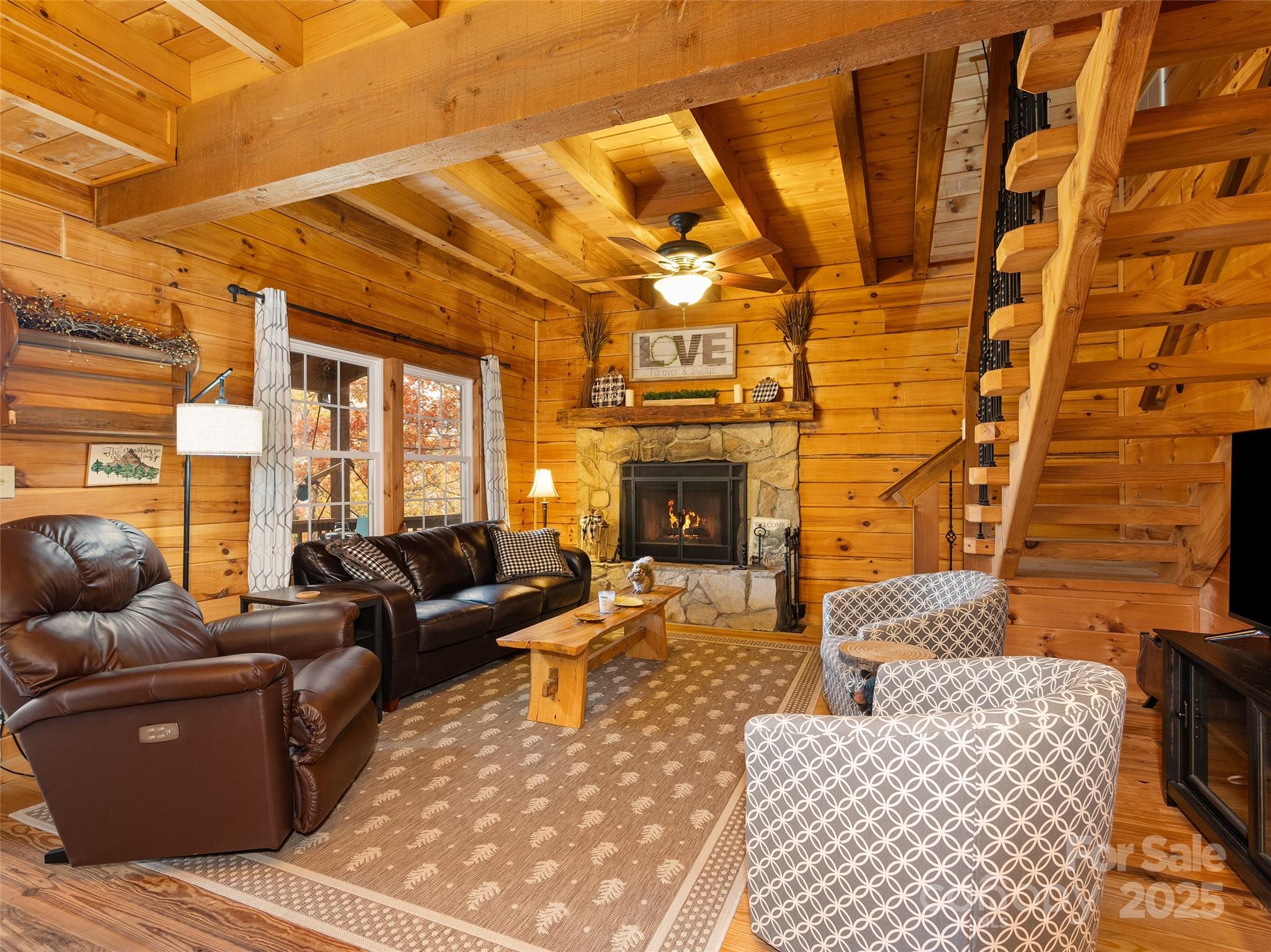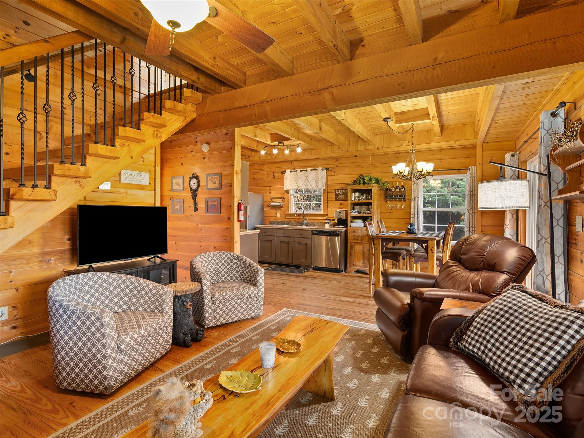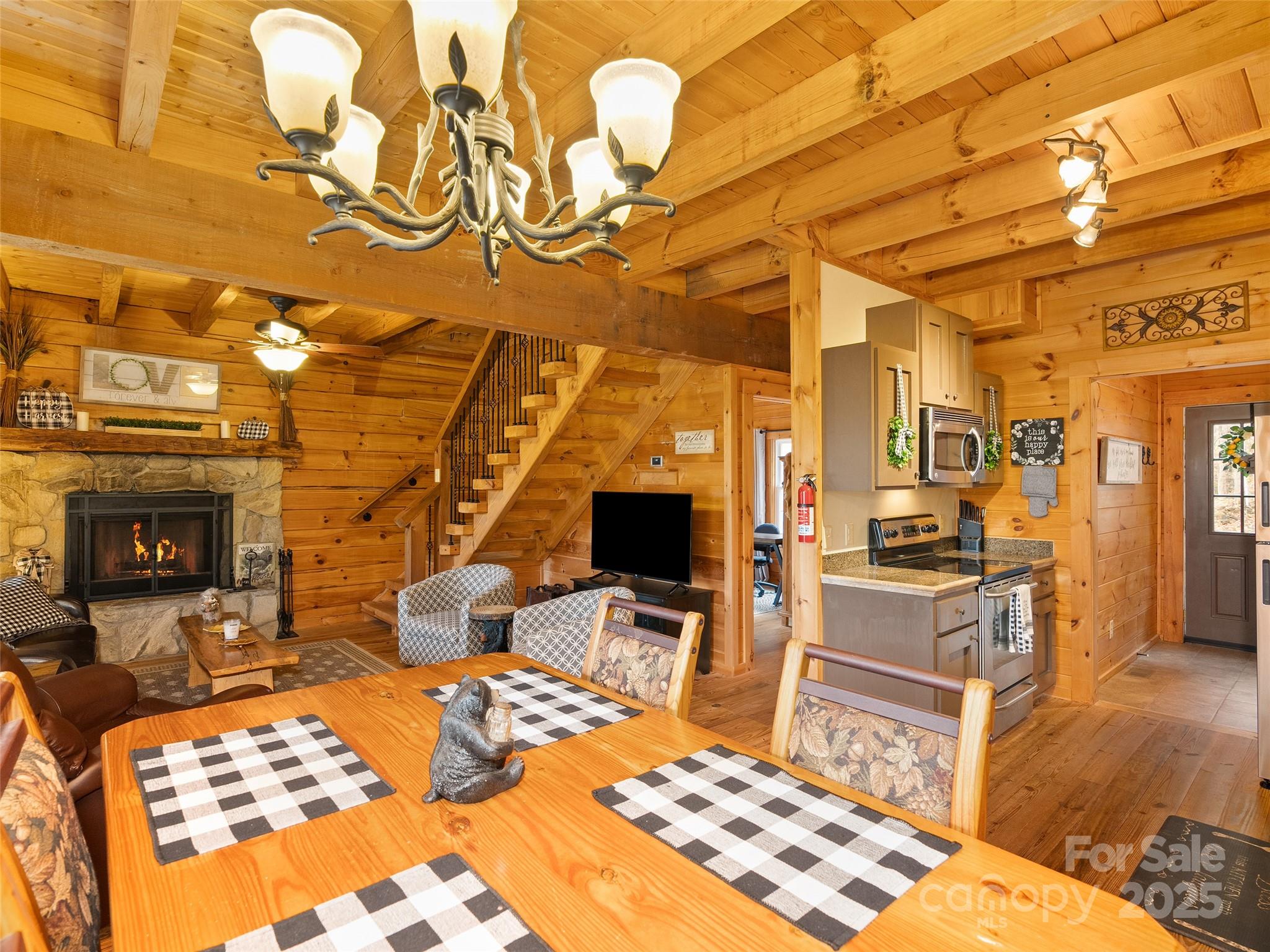 Welcome to your ultimate mountain getaway! This incredibly well-maintained log cabin, just minutes from the Maggie Valley Country Club, is the picture of rustic luxury and is offered completely turn-key, sold furnished (excluding artwork/personal items). This retreat features 2 bedrooms and 3 full baths, including a main suite sanctuary with a deep soaking tub, custom closet built-ins, and a heated tile floor. The second upstairs bedroom offers a unique touch with its hidden loft and has and full bath ensuite. The kitchen is equipped with stainless steel appliances and is open to the dining area overlooking the view and family room with stone fireplace. The main level office can be also be used as a third sleeping area by just adding a futon. Conveniently, a full hall bath is located right outside the office door. Major recent updates ensure peace of mind: a new roof (Sept 2025), a heat pump replaced approximately 2 years ago, and a just serviced wood burning fireplace (July 2025) with new venting, firebox, flashing and sealant. The value here is truly unbeatable as the purchase includes an adjoining 0.66-acre lot—offering the option to trim select trees to open up the mountain view—and a Polaris Off Road vehicle. Another positive, the exterior was freshly stained approximately 5 years ago. Don't just buy a cabin—buy the complete mountain lifestyle and move right in.