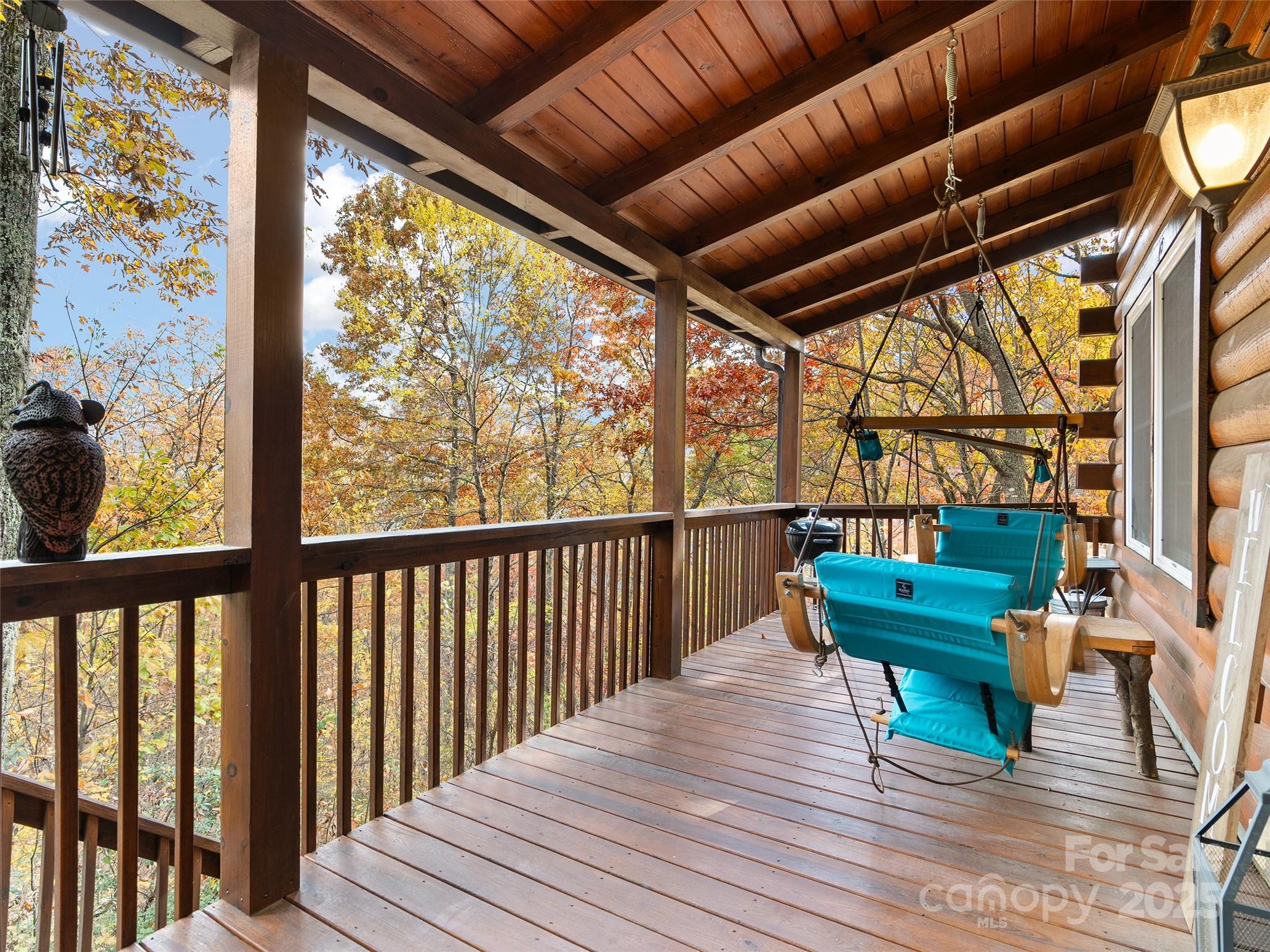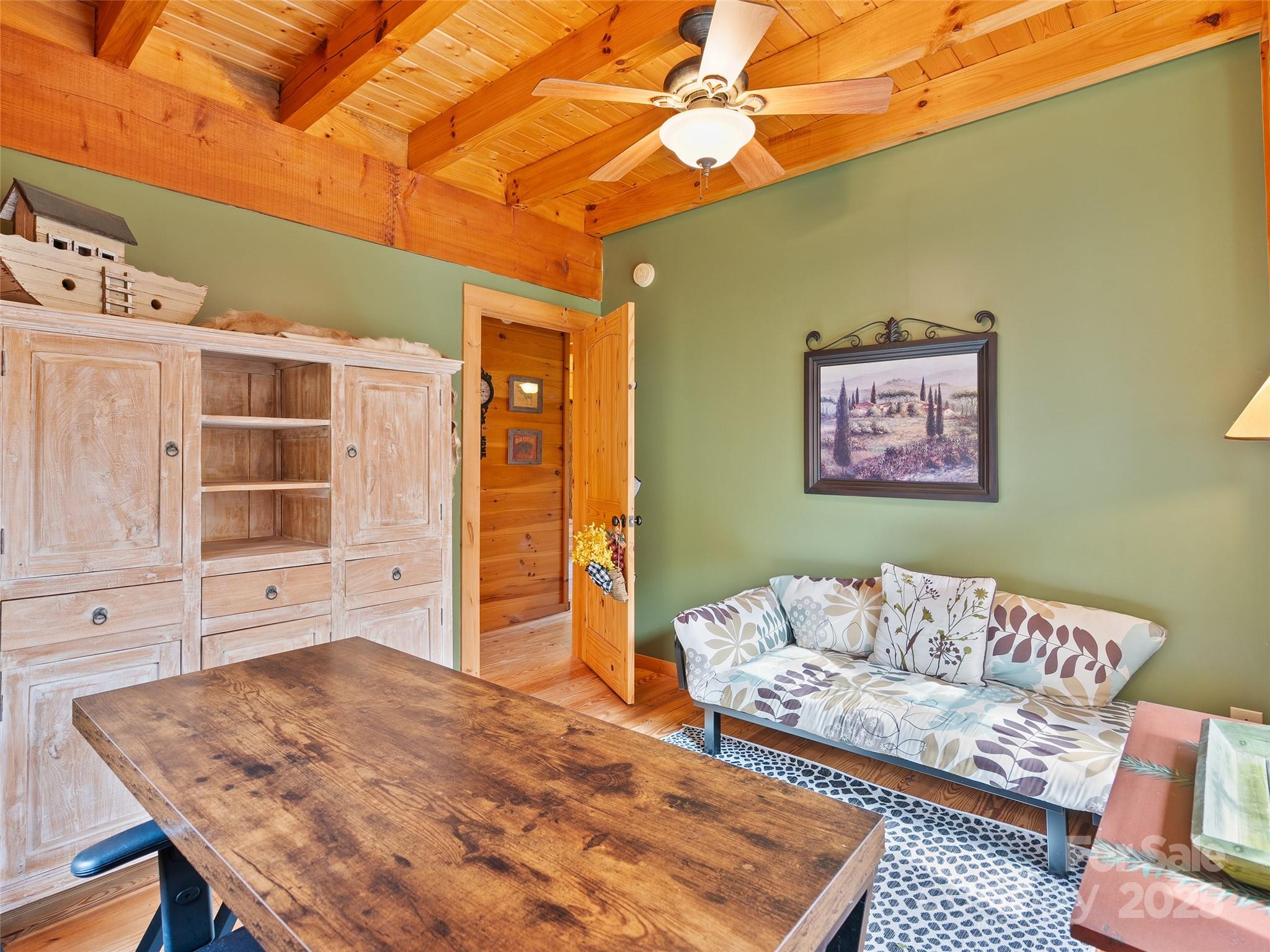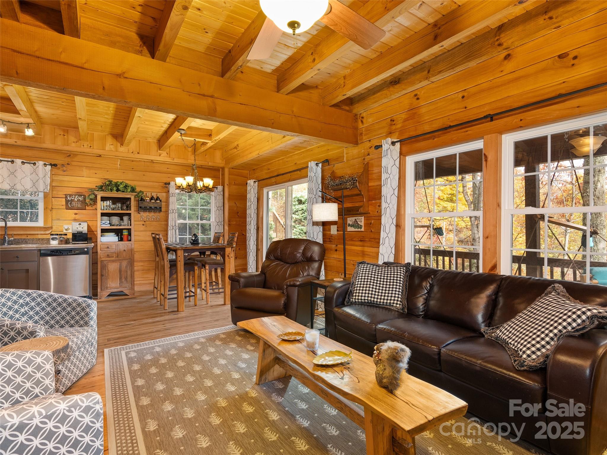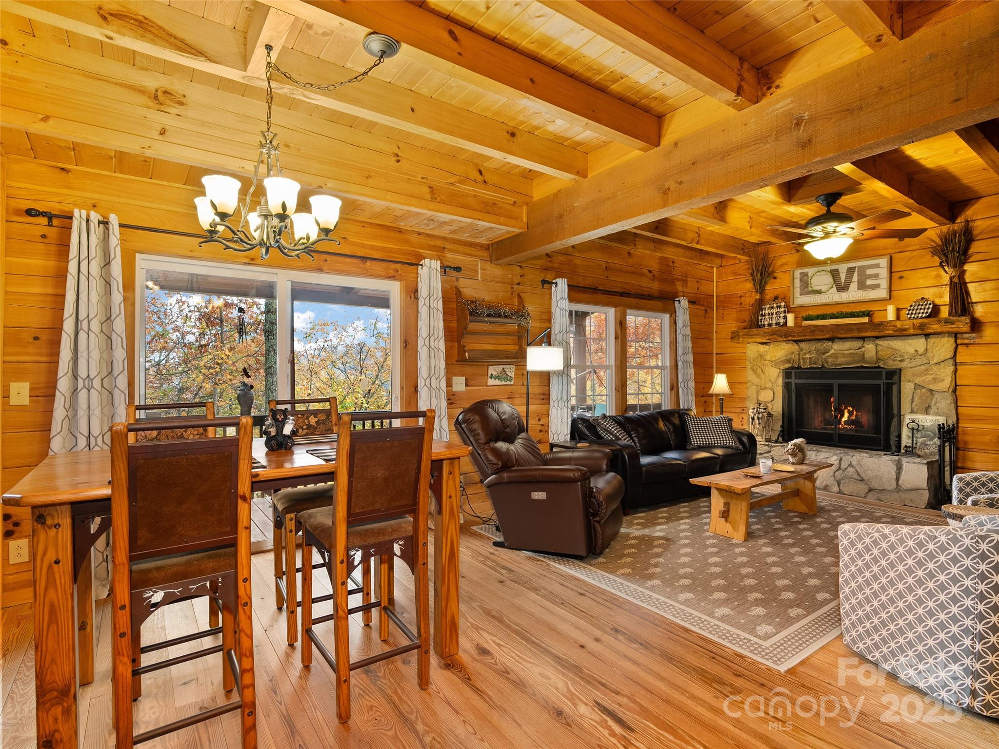 Welcome to your ultimate mountain getaway! This incredibly well-maintained log cabin, just minutes from the Maggie Valley Country Club, is the picture of rustic luxury and is offered completely turn-key, sold furnished (excluding artwork/personal items). This retreat features 2 bedrooms and 3 full baths, including a main suite sanctuary with a deep soaking tub, custom closet built-ins, and a heated tile floor. The second upstairs bedroom offers a unique touch with its hidden loft and has and full bath ensuite. The kitchen is equipped with stainless steel appliances and is open to the dining area overlooking the view and family room with stone fireplace. The main level office can be also be used as a third sleeping area by just adding a futon. Conveniently, a full hall bath is located right outside the office door. Major recent updates ensure peace of mind: a new roof (Sept 2025), a heat pump replaced approximately 2 years ago, and a just serviced wood burning fireplace (July 2025) with new venting, firebox, flashing and sealant. The value here is truly unbeatable as the purchase includes an adjoining 0.66-acre lot—offering the option to trim select trees to open up the mountain view—and a Polaris Off Road vehicle. Another positive, the exterior was freshly stained approximately 5 years ago. Don't just buy a cabin—buy the complete mountain lifestyle and move right in.