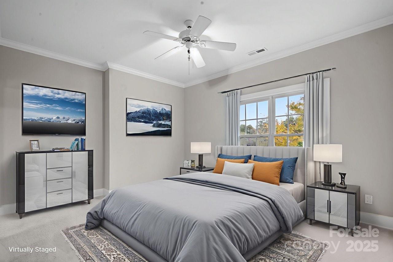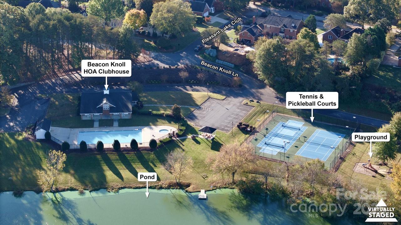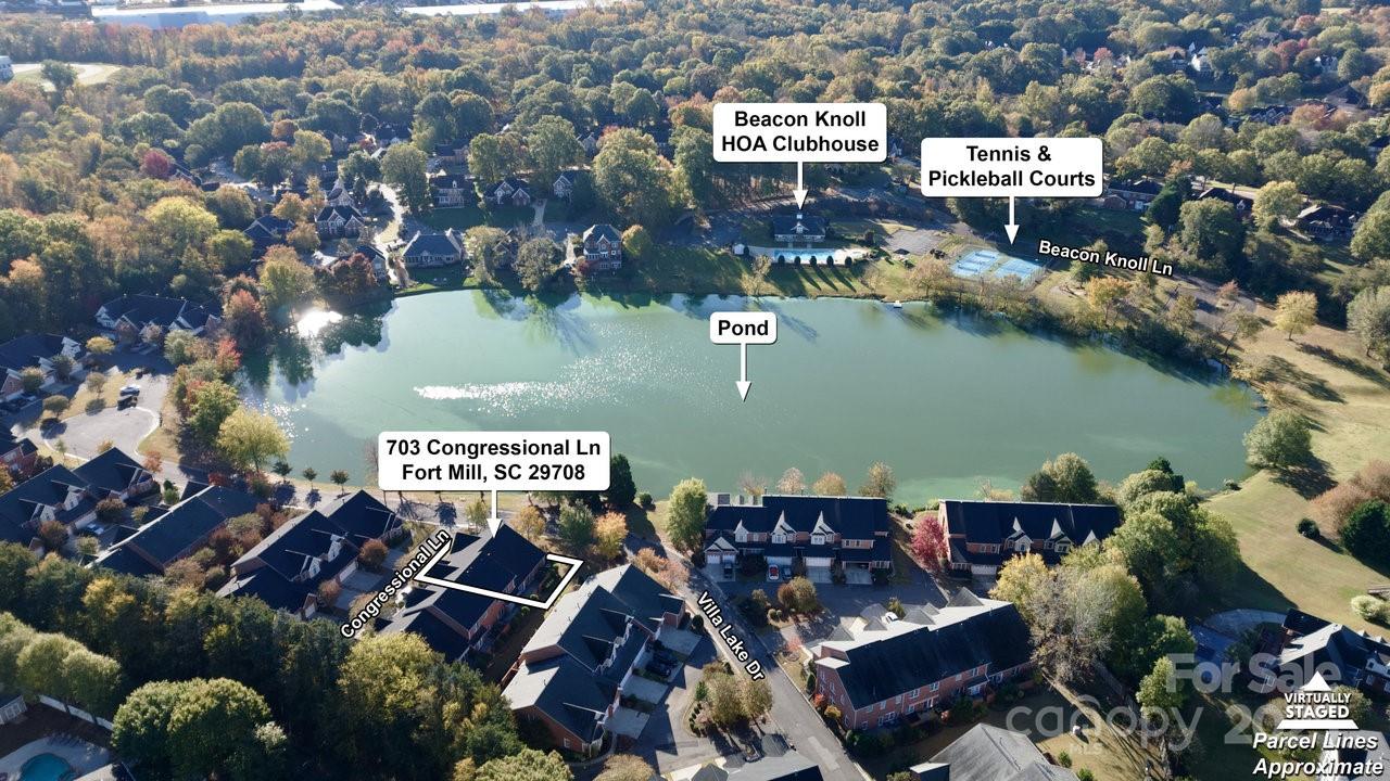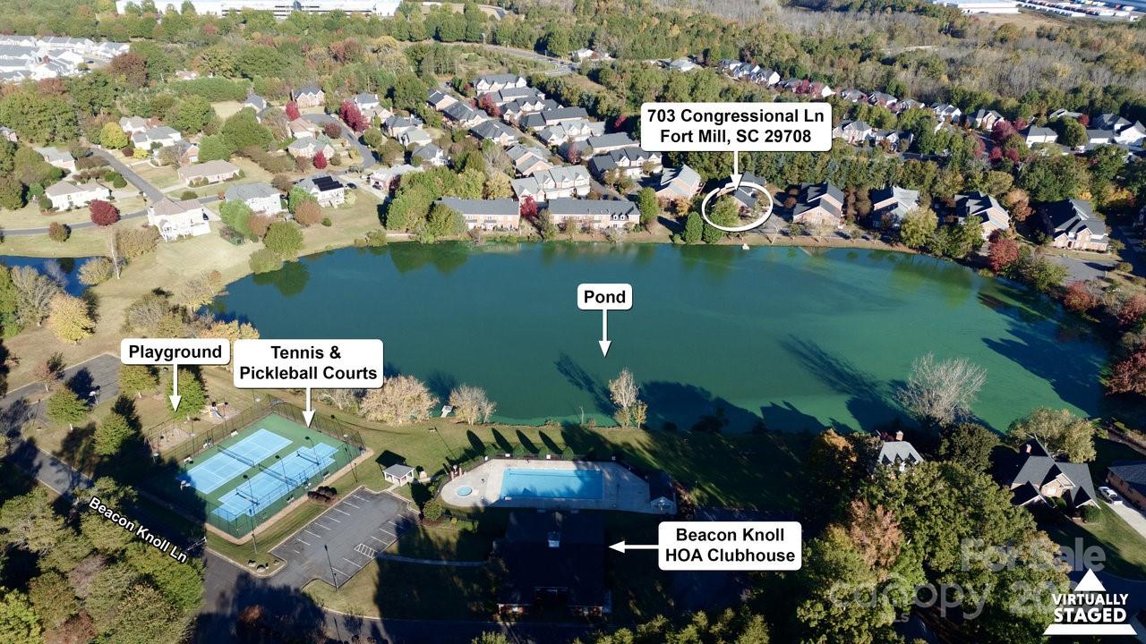 Stunning full brick, end-unit townhome in the gated Beacon Knoll Villas offering spectacular views of the private 10-acre lake! Open floorplan, beautiful moldings, wide hardwood floors, 9' ceilings, fresh paint and new carpeting. Open Kitchen with white cabinetry, granite countertops, brand new appliances! 3 bedrooms, 3 full baths. Large Primary Bedroom on main level, plus Guest Bedroom or Office and Full Bath on the main. Second living quarters option upstairs with spacious Bedroom, Ensuite Bath, plus a separate Living/Office/Media/Flex space w/direct access to Full Bath. 2 Car freshly painted garage w/storage shelves / storage room. Gated community featuring pool, tennis courts, private lake, playground.