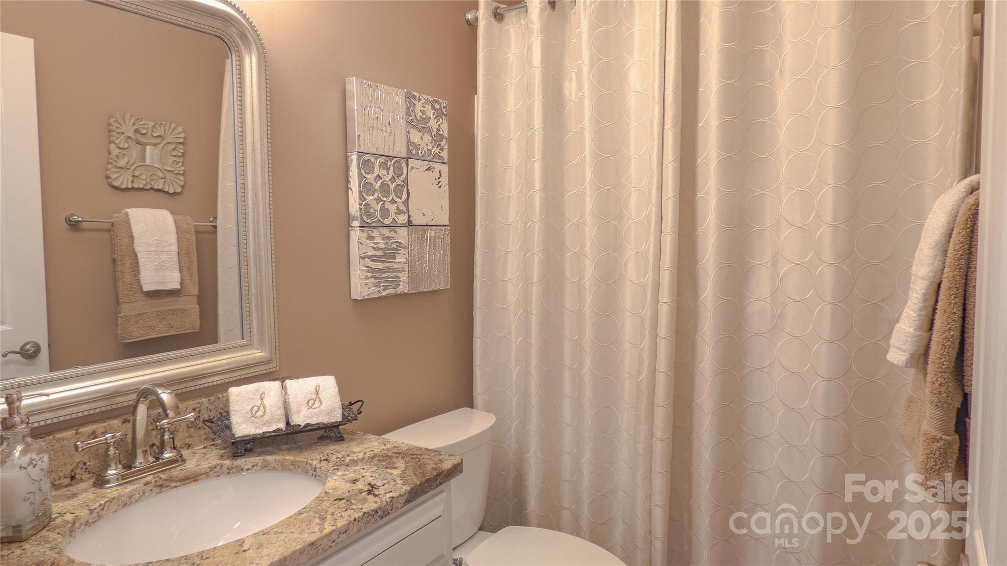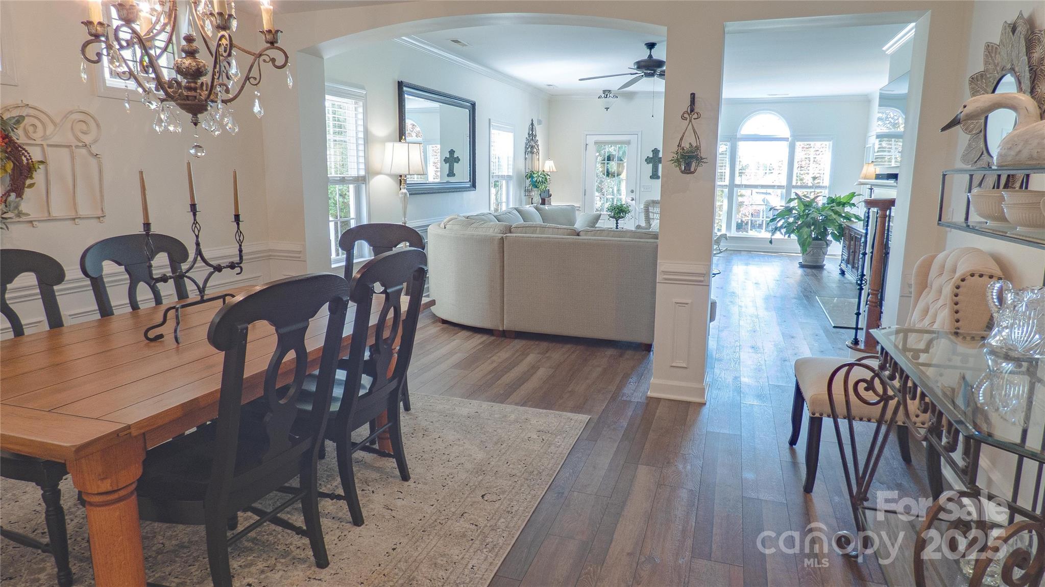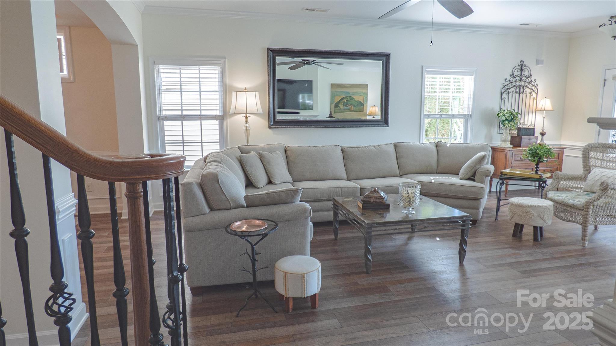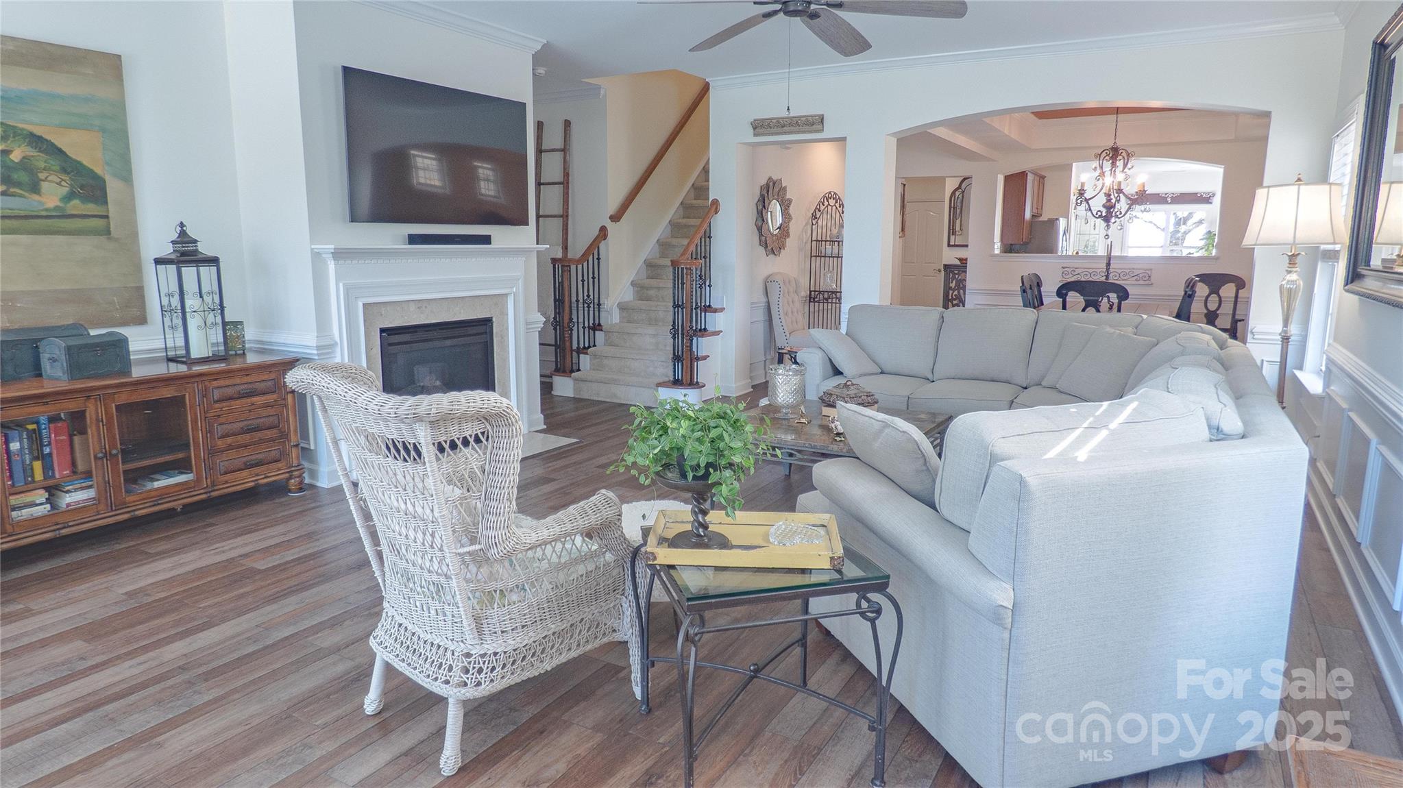 Charming! Meticulously Maintained! This beautiful spacious home offers a thoughtful layout with the Primary Suite and two Secondary Bedrooms on the Main Level, plus an additional Bedroom, full Bath, and Bonus spaces upstairs. The Main Level features crown molding, arched openings, and vinyl plank with wainscoting detail, along with 2" faux wood blinds throughout. The Living Room/Great Room includes a gas-log fireplace and ceiling fan and opens to the Kitchen and Dining areas for easy daily living. The Kitchen is equipped with newer appliances (stove, refrigerator & dishwasher), under and over countertop lighting, quartz countertops, new 2-sided stainless sink, tile backsplash, gas stove, pantry, breakfast area, and a tray ceiling that continues into the Dining Room. The dining room also features crown molding, wainscoting, and a chandelier. The main-level Primary Suite offers a tray ceiling, ceiling fan, walk-in closet, and a private bath with a tiled walk-in shower and dual vanity. Two additional main-level bedrooms have ceiling fans and share a full hall Bath with a tub/shower combination. Both downstairs Baths have granite countertops. Upstairs includes a Bonus Room with ceiling fan, a secondary Bedroom with walk-in closet and direct access to a full hall Bath, plus a carpeted Loft area with a huge walk-in storage area/closet with built-in shelves leading to walk-in Attic storage as well. Additional features include smart thermostats, multiple storage closets with built-in shelving, a Laundry Room on the main level, and a rear-load Two-Car Garage with shelving. Enjoy outdoor living on a covered Back Patio with ceiling fan and a Front Porch Balcony. New HVAC in 2025. Freshly painted inside and out! HOA covers lawn-care and maintenance. This home shows true Pride of Ownership! Bring your fussiest Buyers!