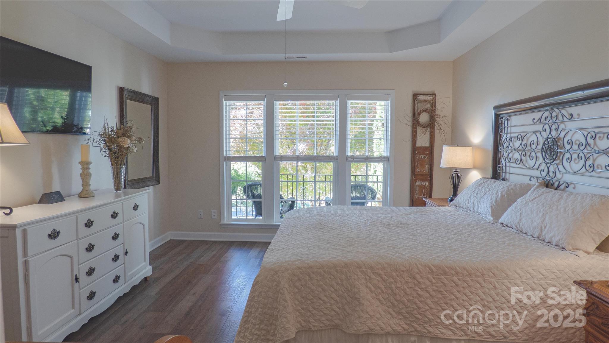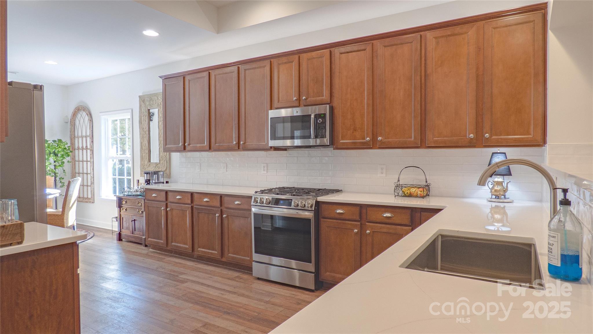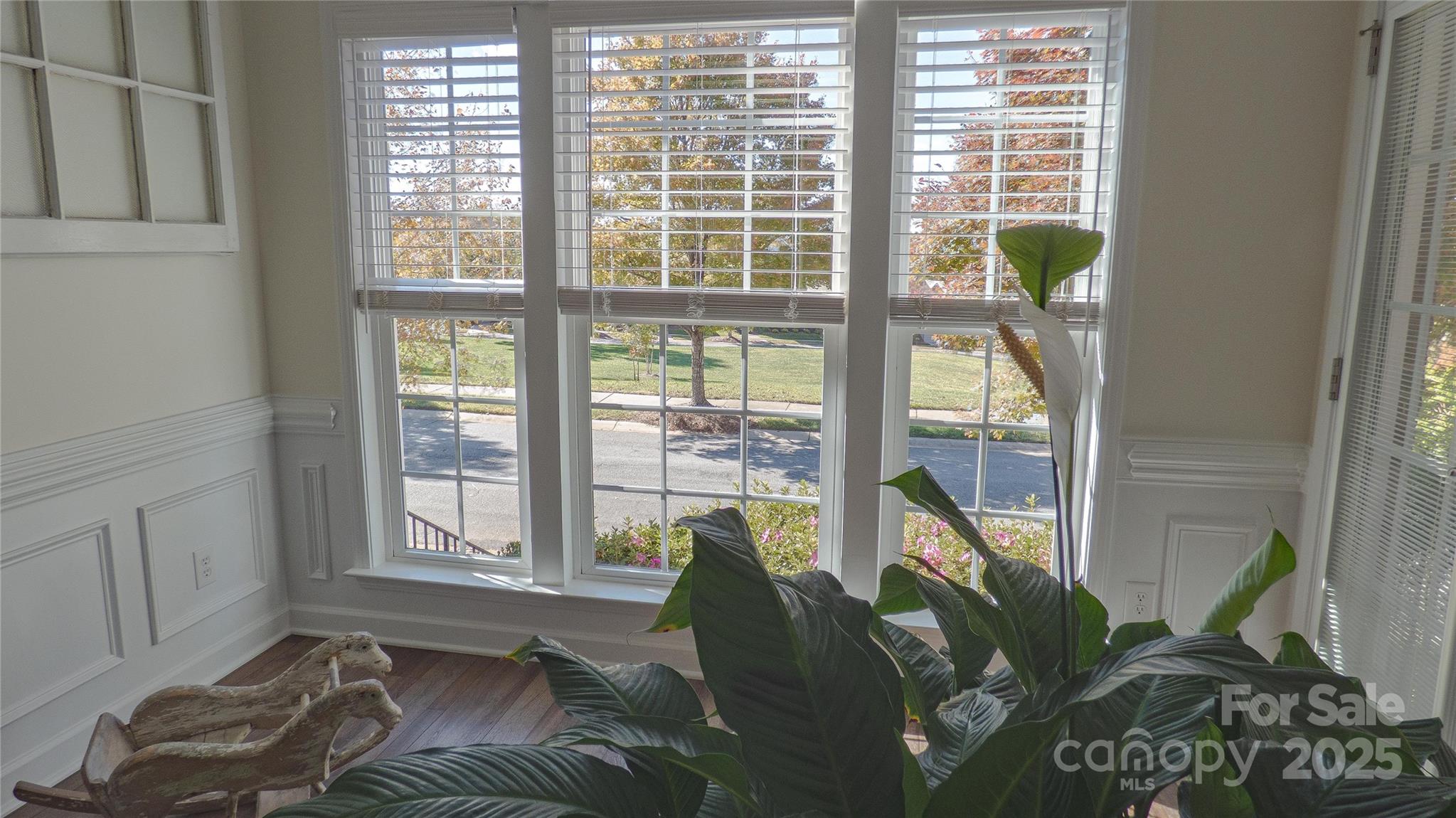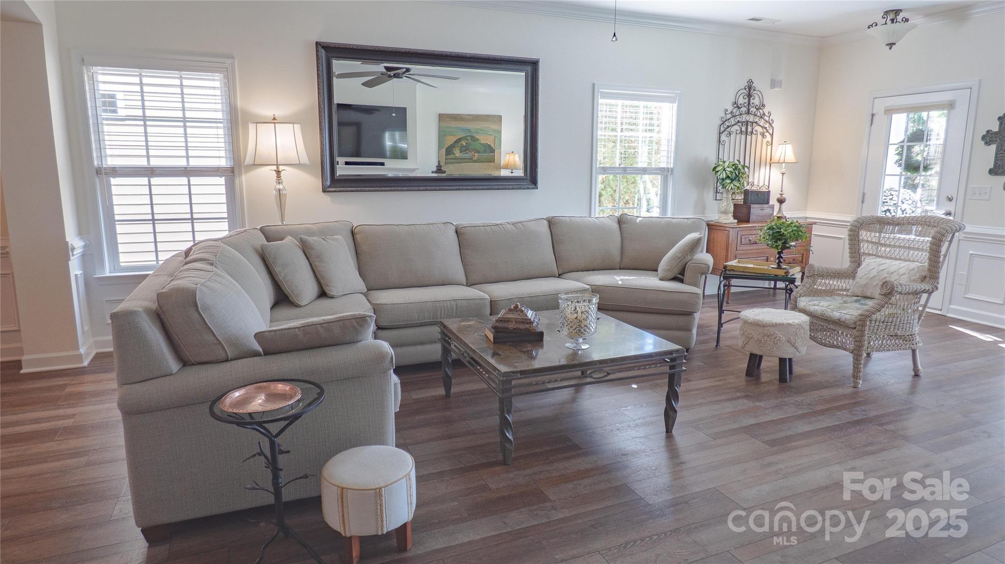Charming! Meticulously Maintained! This beautiful spacious home offers a thoughtful layout with the Primary Suite and two Secondary Bedrooms on the Main Level, plus an additional Bedroom, full Bath, and Bonus spaces upstairs. The Main Level features crown molding, arched openings, and vinyl plank with wainscoting detail, along with 2" faux wood blinds throughout. The Living Room/Great Room includes a gas-log fireplace and ceiling fan and opens to the Kitchen and Dining areas for easy daily living. The Kitchen is equipped with newer appliances (stove, refrigerator & dishwasher), under and over countertop lighting, quartz countertops, new 2-sided stainless sink, tile backsplash, gas stove, pantry, breakfast area, and a tray ceiling that continues into the Dining Room. The dining room also features crown molding, wainscoting, and a chandelier. The main-level Primary Suite offers a tray ceiling, ceiling fan, walk-in closet, and a private bath with a tiled walk-in shower and dual vanity. Two additional main-level bedrooms have ceiling fans and share a full hall Bath with a tub/shower combination. Both downstairs Baths have granite countertops. Upstairs includes a Bonus Room with ceiling fan, a secondary Bedroom with walk-in closet and direct access to a full hall Bath, plus a carpeted Loft area with a huge walk-in storage area/closet with built-in shelves leading to walk-in Attic storage as well. Additional features include smart thermostats, multiple storage closets with built-in shelving, a Laundry Room on the main level, and a rear-load Two-Car Garage with shelving. Enjoy outdoor living on a covered Back Patio with ceiling fan and a Front Porch Balcony. New HVAC in 2025. Freshly painted inside and out! HOA covers lawn-care and maintenance. This home shows true Pride of Ownership! Bring your fussiest Buyers!