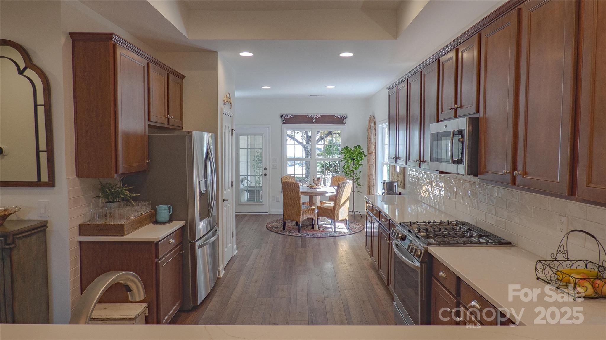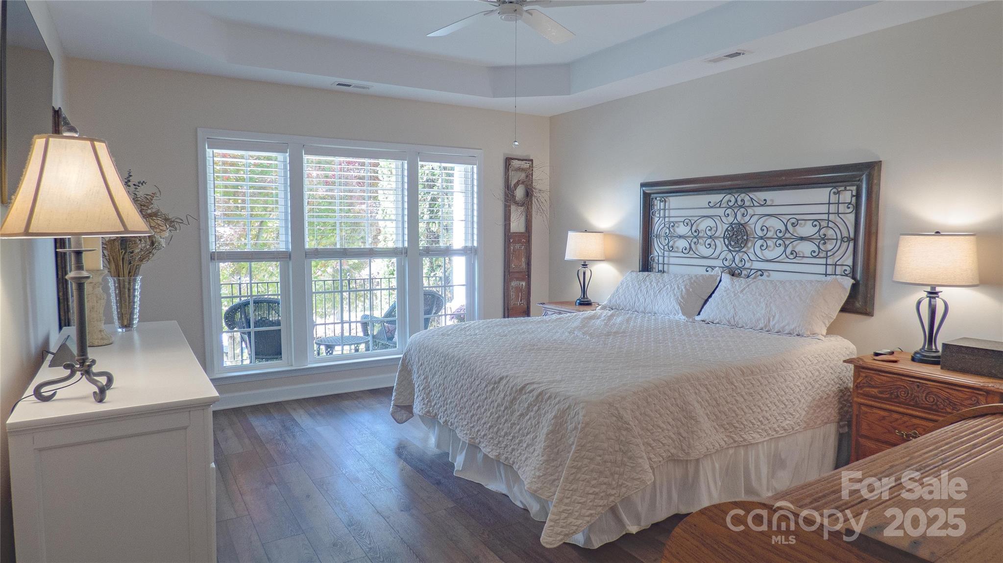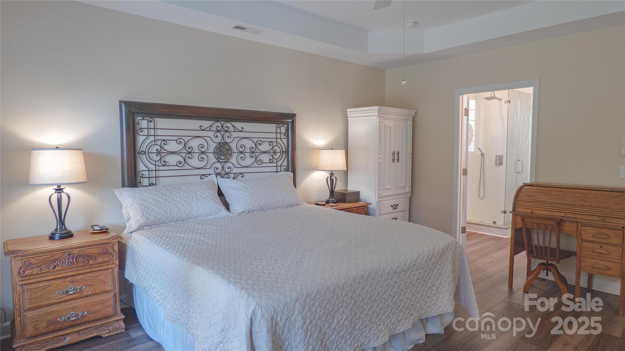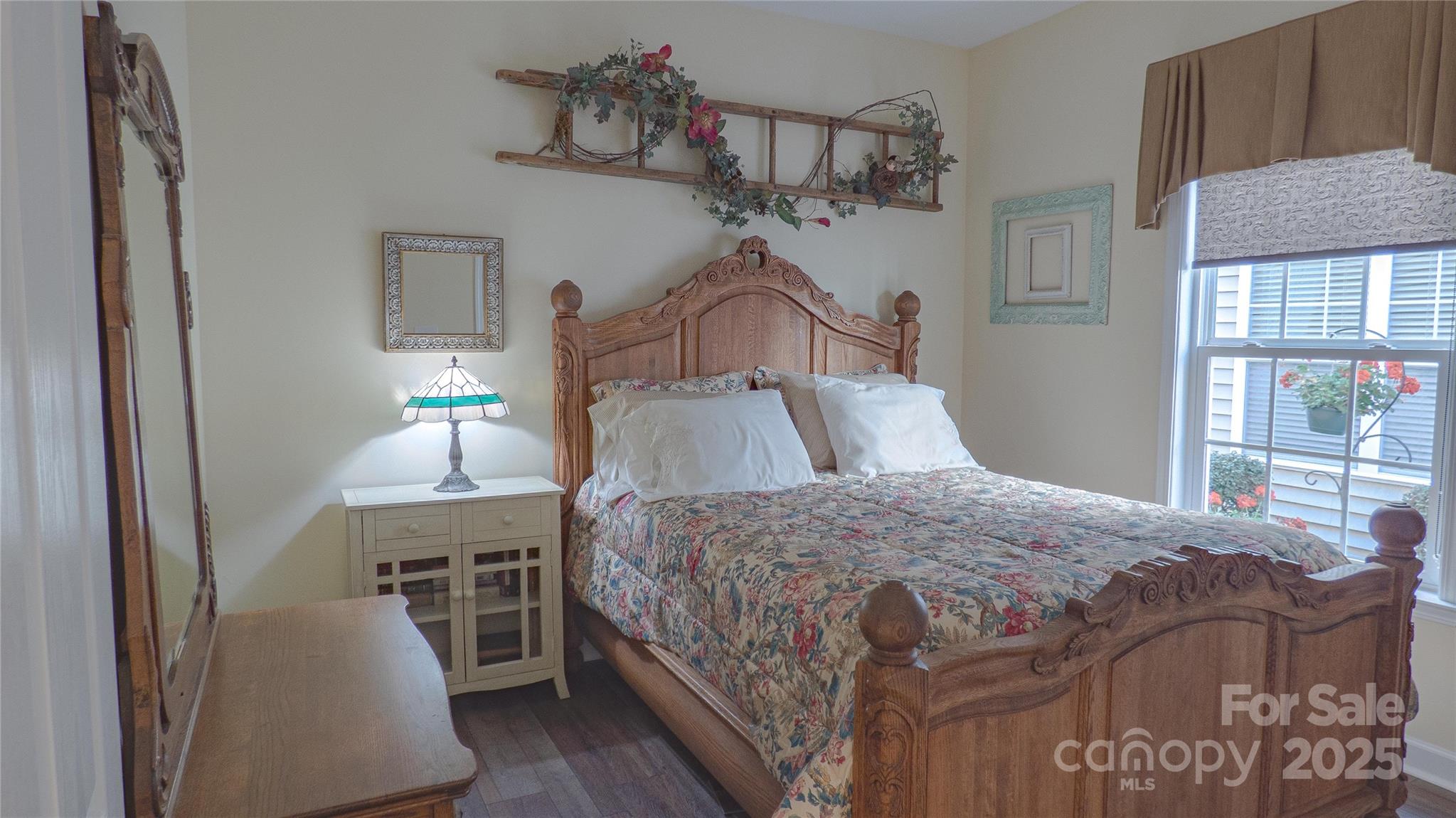 Charming! Meticulously Maintained! This beautiful spacious home offers a thoughtful layout with the Primary Suite and two Secondary Bedrooms on the Main Level, plus an additional Bedroom, full Bath, and Bonus spaces upstairs. The Main Level features crown molding, arched openings, and vinyl plank with wainscoting detail, along with 2" faux wood blinds throughout. The Living Room/Great Room includes a gas-log fireplace and ceiling fan and opens to the Kitchen and Dining areas for easy daily living. The Kitchen is equipped with newer appliances (stove, refrigerator & dishwasher), under and over countertop lighting, quartz countertops, new 2-sided stainless sink, tile backsplash, gas stove, pantry, breakfast area, and a tray ceiling that continues into the Dining Room. The dining room also features crown molding, wainscoting, and a chandelier. The main-level Primary Suite offers a tray ceiling, ceiling fan, walk-in closet, and a private bath with a tiled walk-in shower and dual vanity. Two additional main-level bedrooms have ceiling fans and share a full hall Bath with a tub/shower combination. Both downstairs Baths have granite countertops. Upstairs includes a Bonus Room with ceiling fan, a secondary Bedroom with walk-in closet and direct access to a full hall Bath, plus a carpeted Loft area with a huge walk-in storage area/closet with built-in shelves leading to walk-in Attic storage as well. Additional features include smart thermostats, multiple storage closets with built-in shelving, a Laundry Room on the main level, and a rear-load Two-Car Garage with shelving. Enjoy outdoor living on a covered Back Patio with ceiling fan and a Front Porch Balcony. New HVAC in 2025. Freshly painted inside and out! HOA covers lawn-care and maintenance. This home shows true Pride of Ownership! Bring your fussiest Buyers!