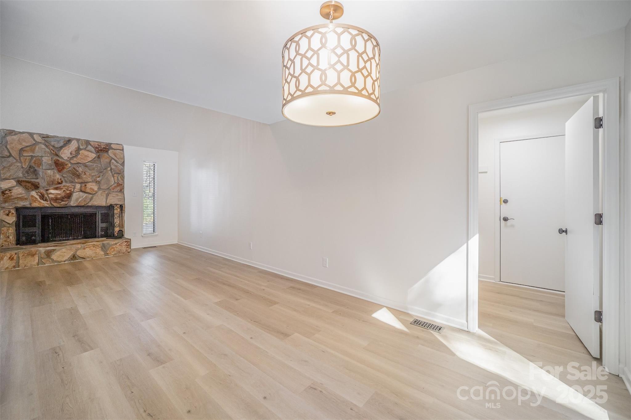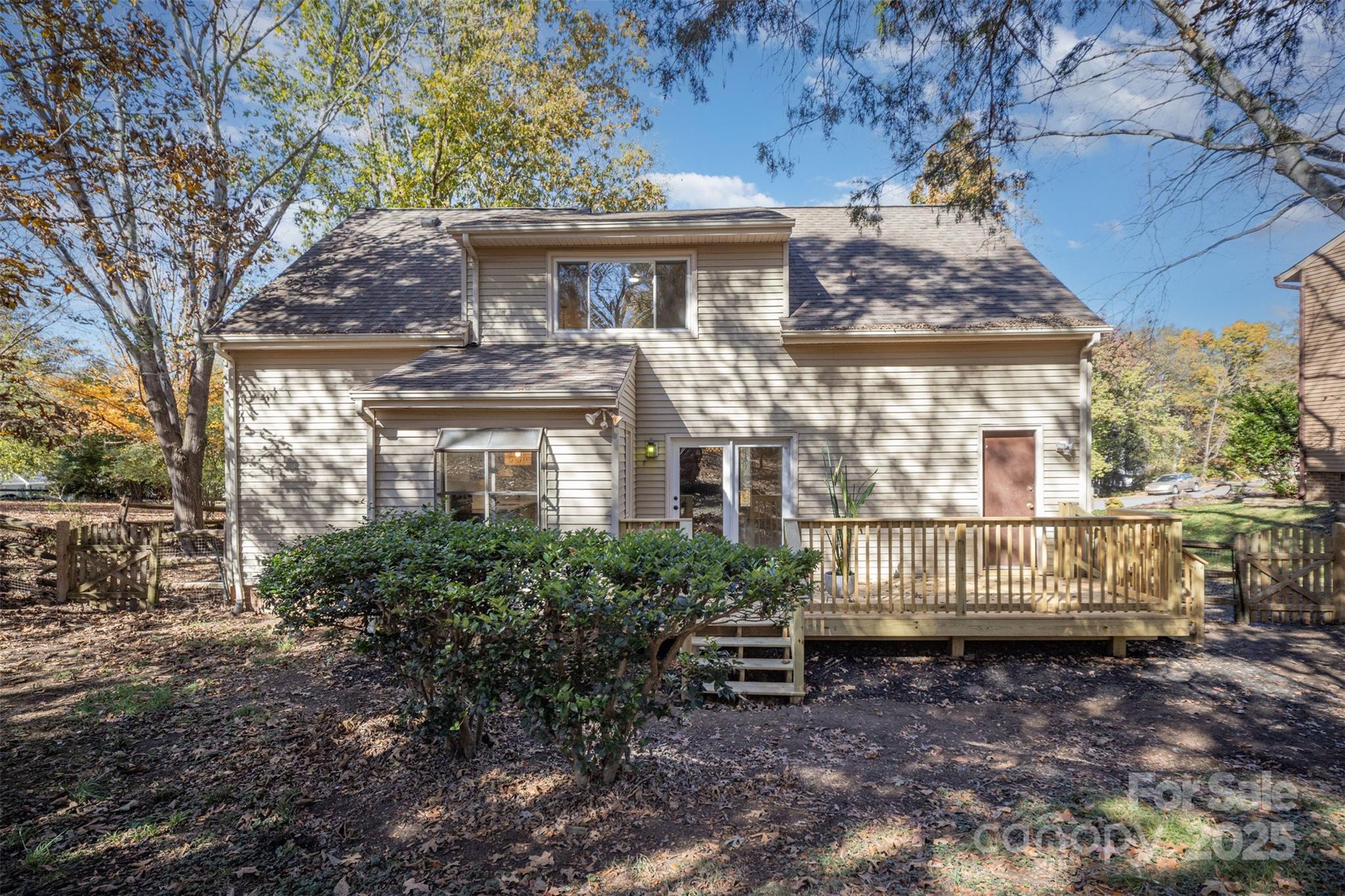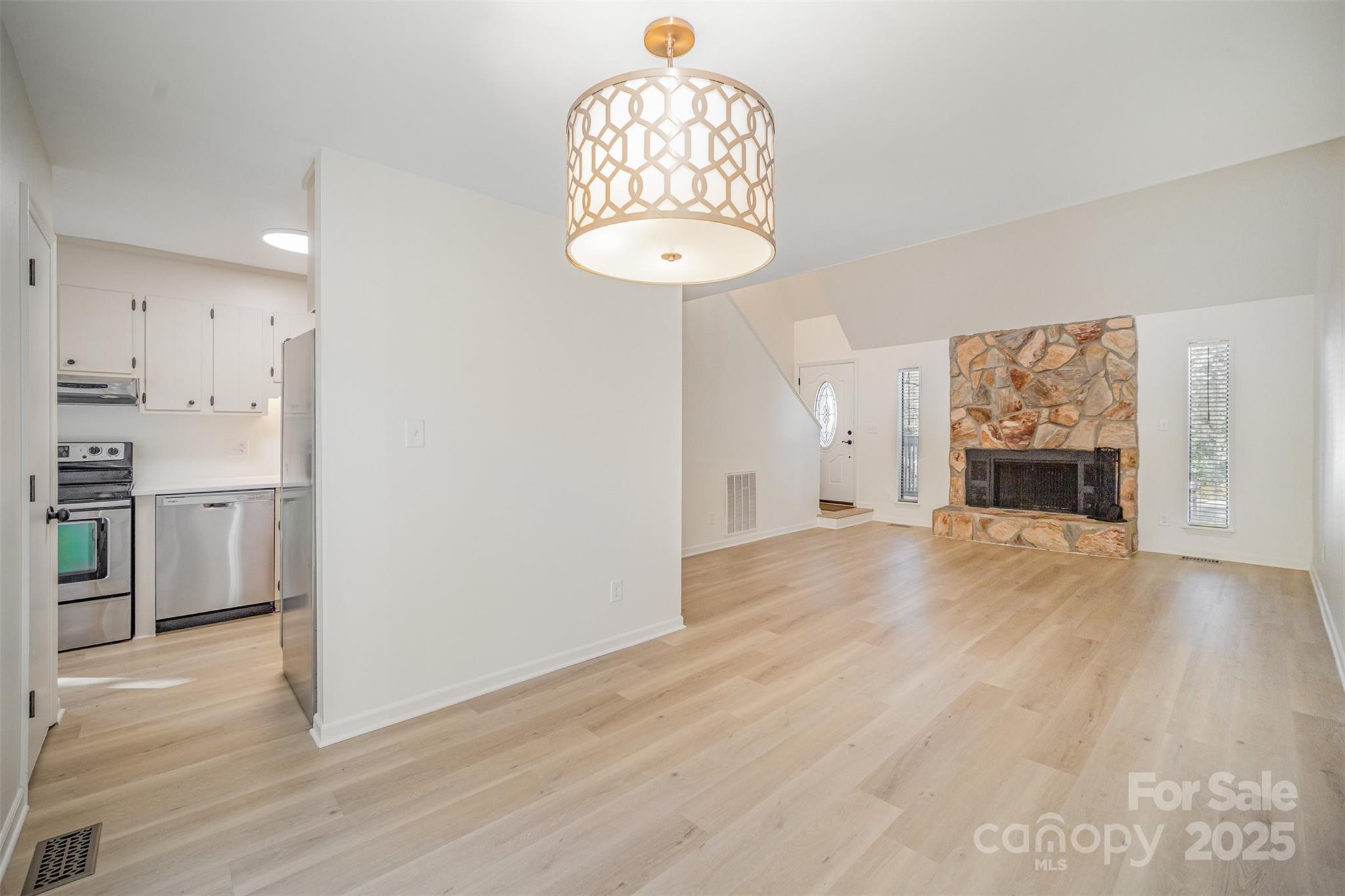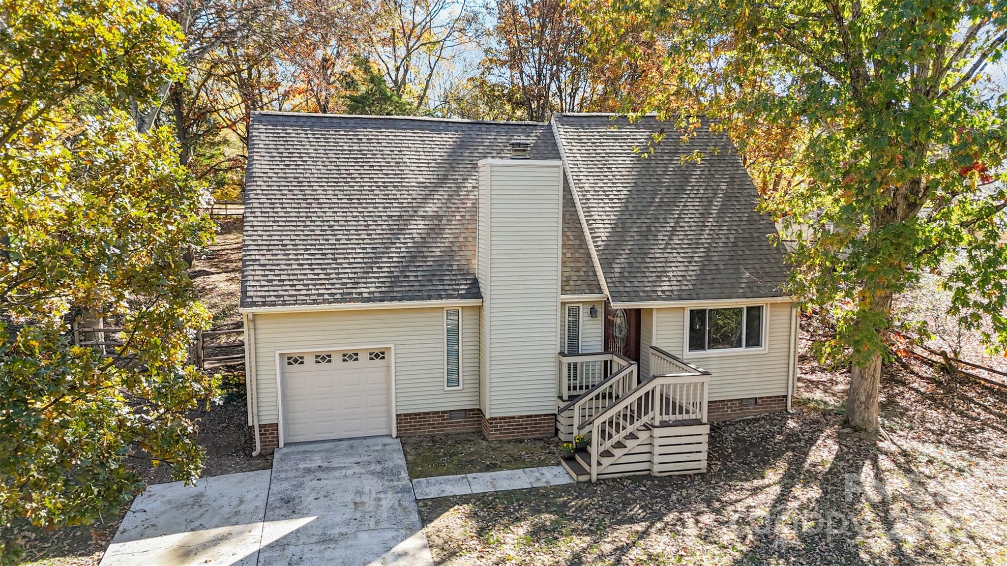 Recently renovated bright & spacious home tucked among the trees near the heart of Ballantyne! Home has a cozy inside feel with a stunning stone focal fireplace in the living room. NEW Wooden plank flooring throughout the main level creates a seamless flow from room to room. Dining area off of the living room has double glass french door leading to back deck. Kitchen is tucked around the corner with matching S.S appliances and crisp white counters with plenty of cabinet space for storage. Breakfast nook surrounded with sunny windows is the perfect place to enjoy your morning coffee. Primary bedroom also located on the main level and has attached full bath with NEW vanity + spacious walk-in closet. Upstairs the loft landing is open to below providing a beautiful view of the fireplace and allows for a second living space, game area, or home office. 2 additional bedrooms + full bath perfect for overnight family or guests. NEW private back deck overlooks the fully wooded yard providing low maintenance and plenty of peace. All located just minutes from I-485 getting you all around the Charlotte area + minutes from The Bowl at Ballantyne with tons of local shops, restaurants, and a concert pavilion!