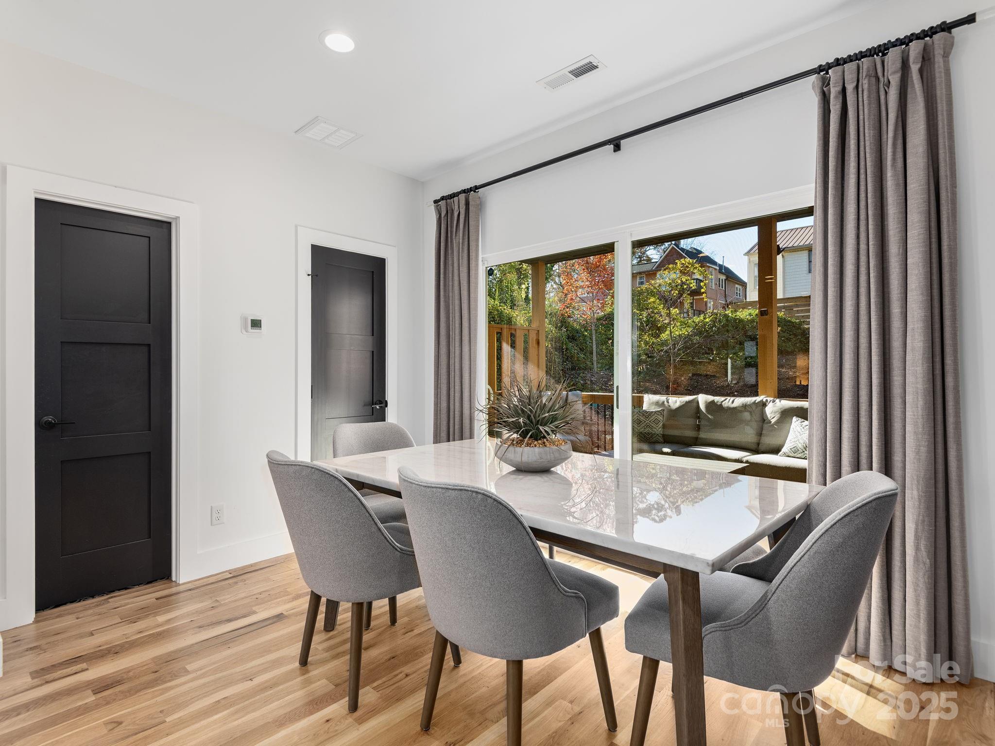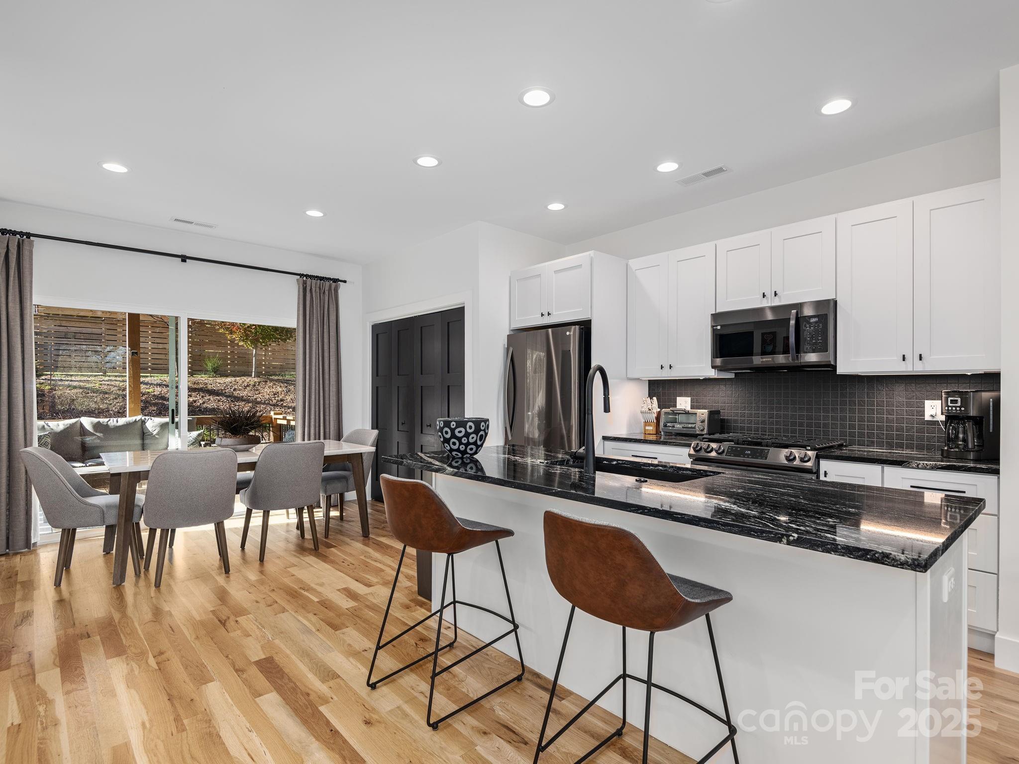 Discover the perfect blend of style, convenience, and modern design in this beautifully crafted home in one of West Asheville’s most desirable newer communities. Just minutes from downtown, the River Arts District, and Haywood Road’s vibrant restaurants and boutiques, this residence offers both serenity and accessibility. The open-concept main level is filled with natural light from expansive windows and features a seamless flow between the living, dining, and kitchen areas, ideal for everyday living or entertaining. The chef’s kitchen boasts granite countertops, striking black stainless steel appliances, and a spacious island with plenty of prep space. Step out onto the covered back deck to relax or enjoy a meal outdoors. Upstairs, you’ll find three inviting bedrooms and two full baths, including a bright primary suite with a walk-in closet and a private ensuite bathroom. Throughout the home, you’ll appreciate the attention to detail, from the gleaming hardwood floors to the custom tile-work and energy-efficient features that ensure comfort and low utility costs. Low-maintenance living is a hallmark of this community, with HOA-maintained landscaping and common areas (including a community garden), plus two deeded parking spaces for each home. Move right in and enjoy the best of modern Asheville living—beautifully finished, thoughtfully designed, and perfectly located.