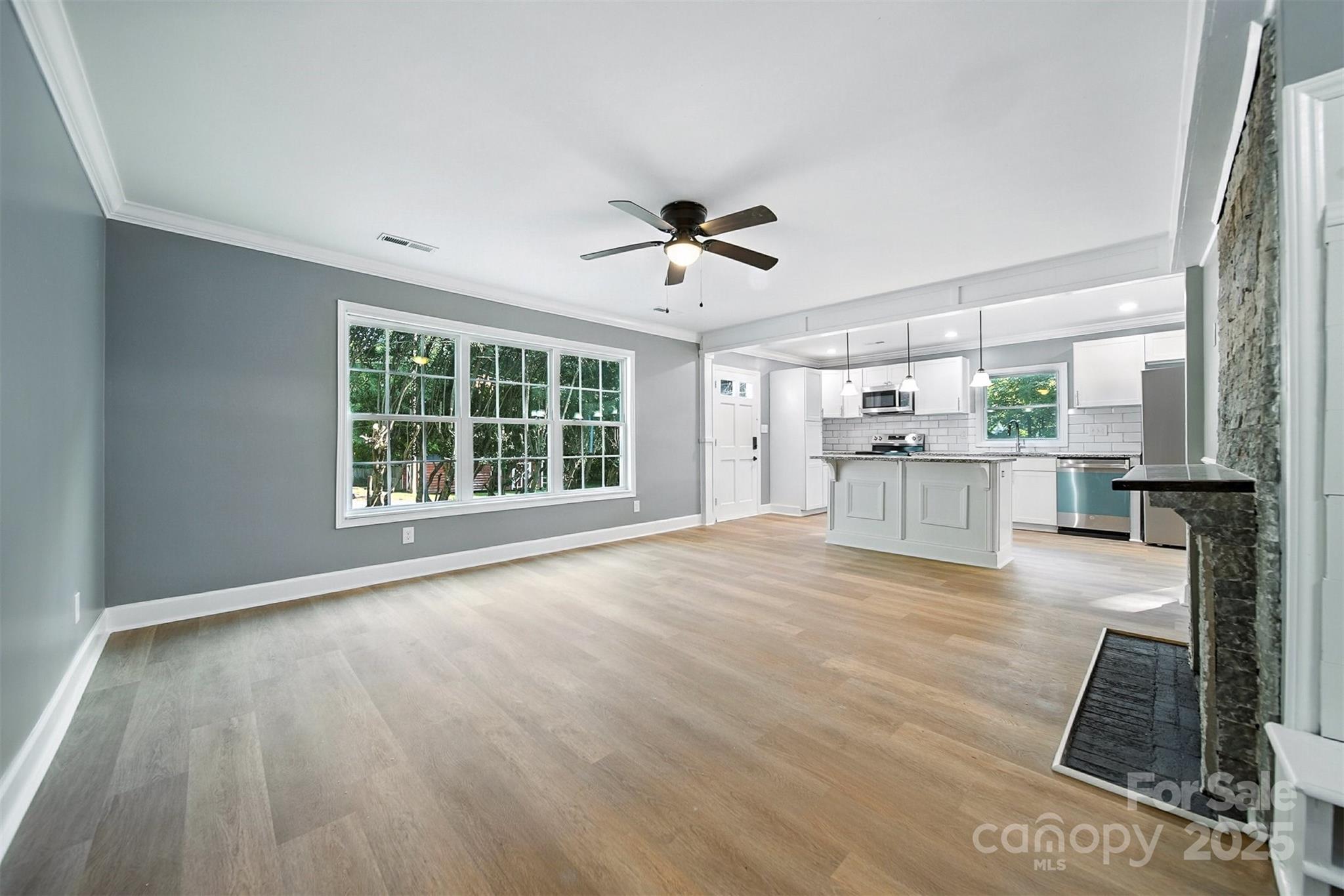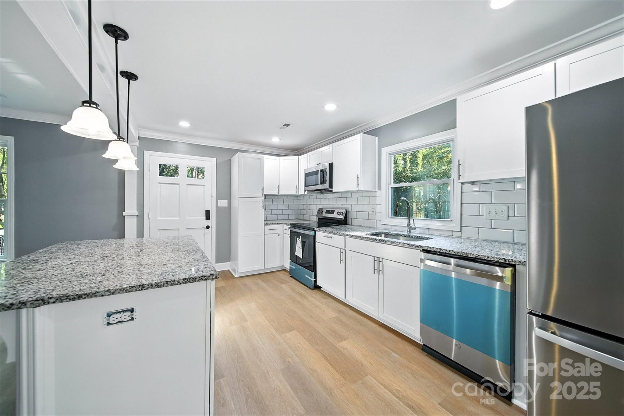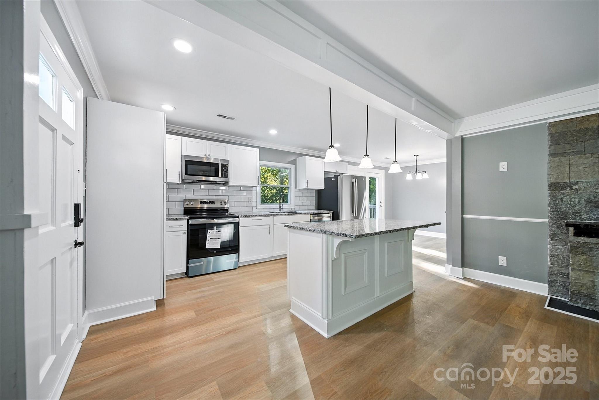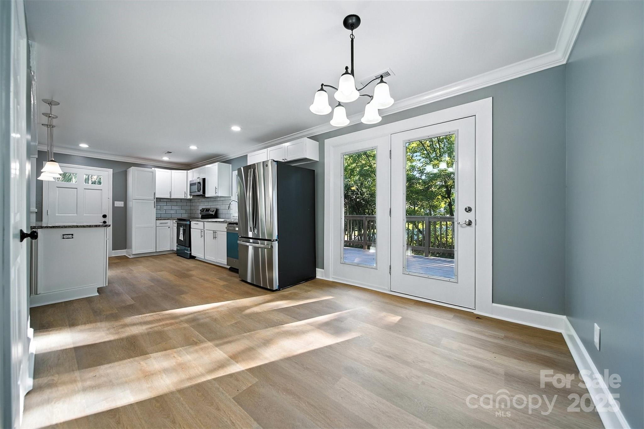 Timeless single-level home on a fenced corner lot in one of Gastonia’s most established neighborhoods. Blending classic charm with modern upgrades, this 3-bedroom, 2-bath beauty offers an open, light-filled layout designed for comfortable living. The inviting living room flows seamlessly into the chef’s kitchen, complete with custom white cabinetry, subway tile backsplash, stainless steel appliances, and a center island with bar seating. The dining area, highlighted by French doors, opens onto a large back deck overlooking a private backyard and creek, perfect for entertaining or relaxing. The spacious primary suite features a sleek ensuite bath with a stunning tiled shower. Hard surface flooring runs throughout for both style and easy maintenance. Curb appeal shines with painted brick, landscaped flowerbeds, and mature surroundings. Conveniently located near shopping, dining, and more! This one is a must-see!