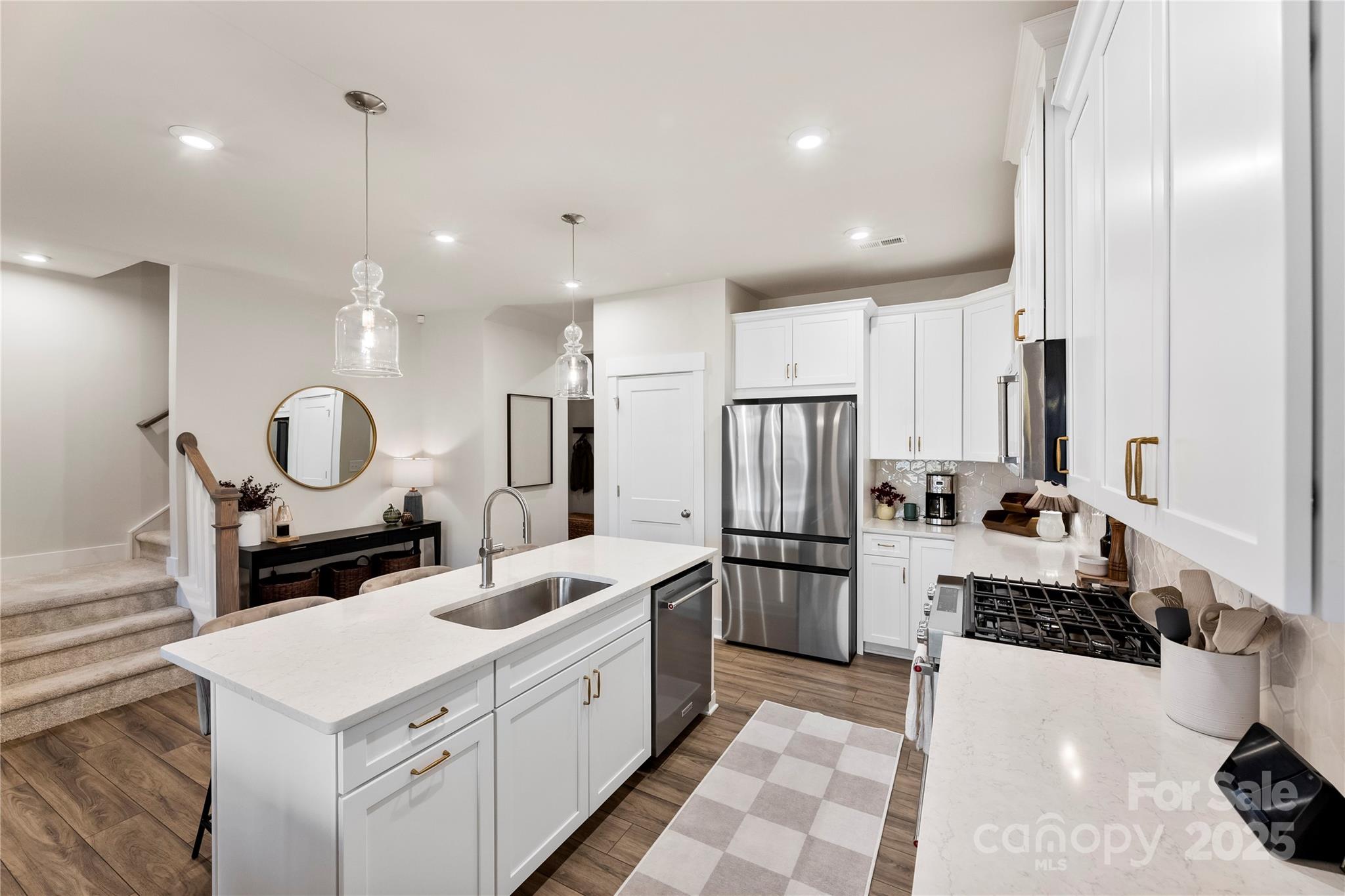 This exceptional Wylie Elite model by Toll Brothers stands out as one of the finest townhomes in the sought-after Griffith Lakes community. Perfectly positioned within the neighborhood with trees lining the back of the home, this combines elevated design, modern comfort, and an unbeatable location. Experience this bright, open-concept floor plan featuring 10-foot ceilings, a chef-inspired kitchen with KitchenAid stainless steel appliances, 30" 5-burner gas range, hexagon tile backsplash, quartz countertops, and a large island ideal for entertaining. The spacious main living area flows seamlessly to the covered patio, offering the perfect indoor-outdoor lifestyle. Upstairs, the primary suite impresses with a luxurious en-suite bathroom and generous oversized closet. Two additional bedrooms, plus full bathroom, and a conveniently located laundry room complete the second level. The third-floor loft adds versatility with a bonus living area, sitting room, and full bathroom—perfect for guests or a private retreat. Enjoy resort-style living with direct lake access, trails, a paddlesport launch site, dog park, and proximity to exciting retail and dining. Just minutes from Uptown Charlotte, UNC Charlotte, Huntersville, and Lake Norman, with easy access to I-77 and I-485.