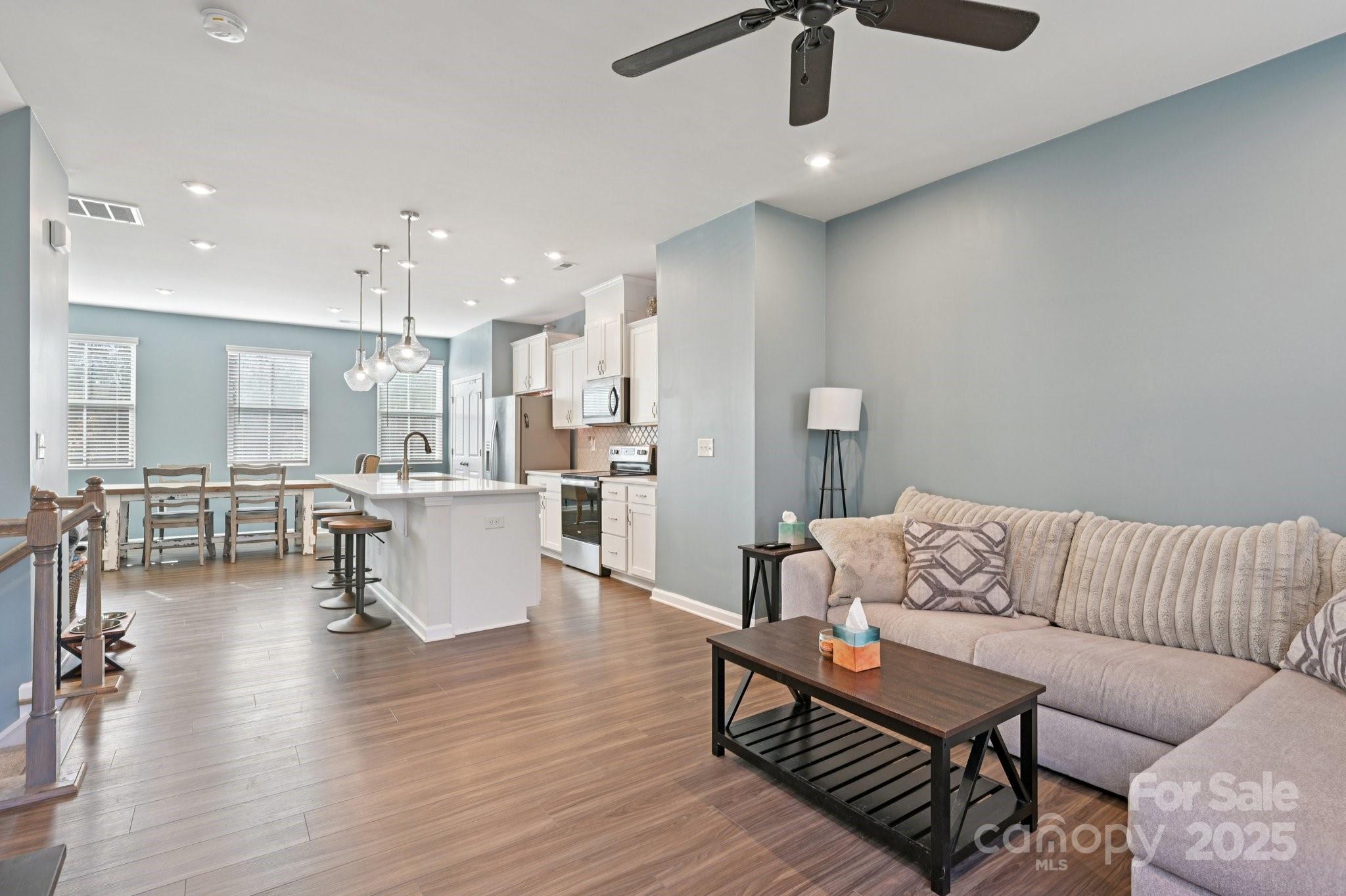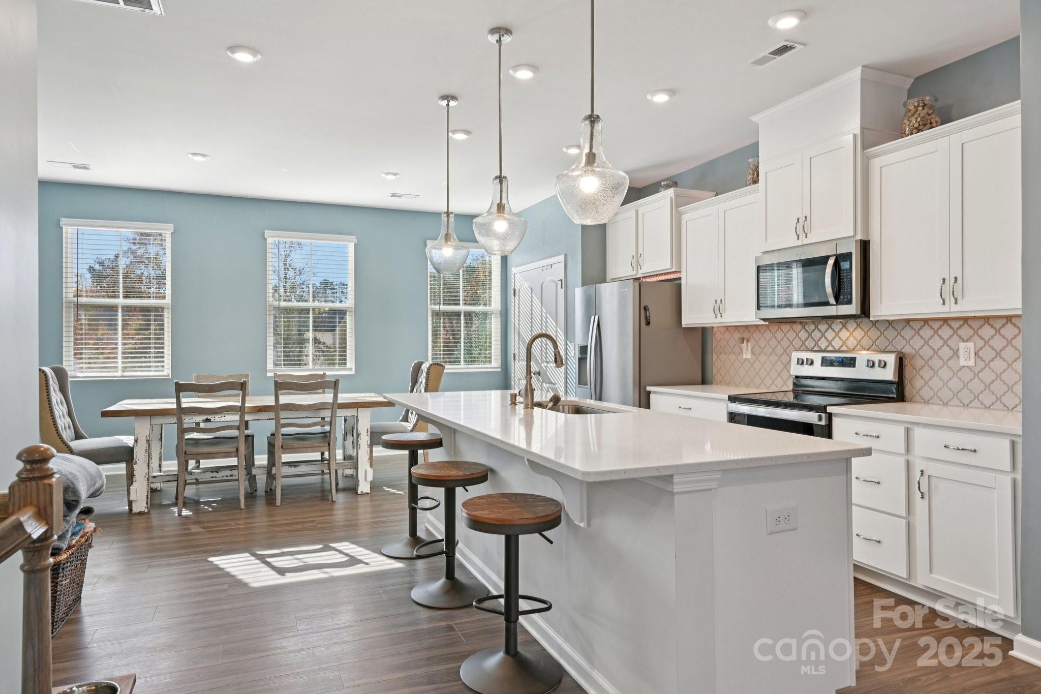 Light-filled end-unit townhome boasting an airy open floorplan. The kitchen, dining, and great room connect seamlessly, extending to a deck-style balcony that makes indoor-to-outdoor entertaining effortless. Featuring two true primary suites, this home delivers comfort and flexibility. Nestled on a private, treed lot with both a balcony and patio, it offers exceptional outdoor living in a prime townhome setting. Additional third bedroom plus full bath main.