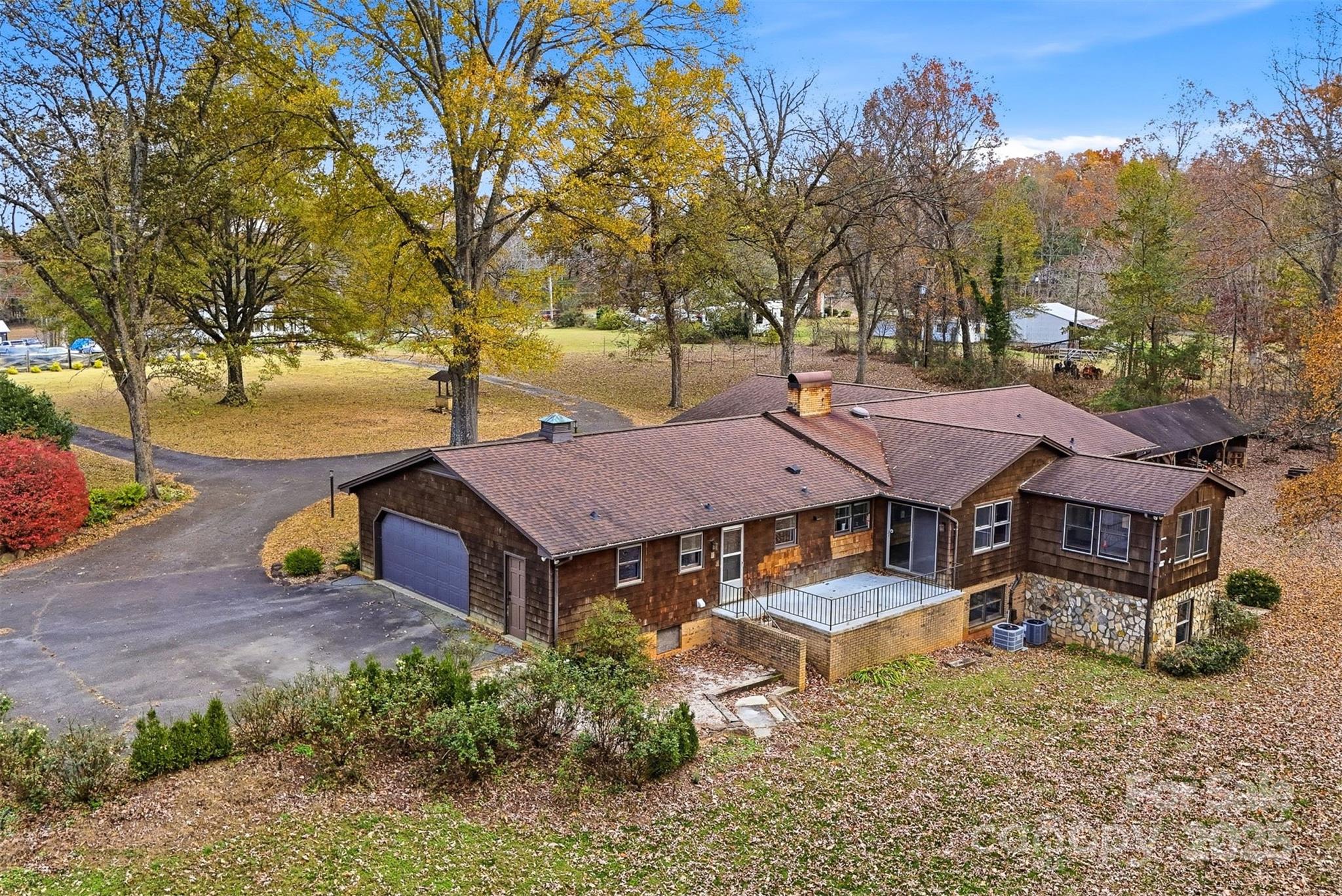 Discover exceptional space and comfort in this beautifully updated home offering 2,886 square feet on the main level, plus a full basement with over 1,400 partially finished square feet and an additional 1,100-square-foot workshop. The woodstove in the basement has been used for heat in addition to the heat pump in the winter. Nestled on nearly 6 stunning acres, the property welcomes you with a charming circle drive, brick column accents at each entrance, thoughtful privacy landscaping along the road, and classic features including a front-yard swing and a picturesque old well house. Inside, the home’s main level showcases several fully remodeled spaces, including the living room, laundry room, half bath, hall bath, and luxurious primary bath. The floorplan places the bedrooms together for comfortable flow, while offering flexible spaces to fit your lifestyle. Enjoy two dining areas—perfect for hosting or for creating a den with the see-through fireplace connecting to the living room. A bright sunroom offers ideal potential for a playroom or homeschool area and sits conveniently adjacent to the study or office. The expansive full basement features finished flooring with painted floor joists for a clean, modern feel, along with a full bath for added convenience—ideal for guests, hobbies, or recreation. The massive workshop area provides endless possibilities for storage, projects, or future expansion. Spacious, updated, and full of character, this home offers room to live, work, and play—both inside and out with room to grow!